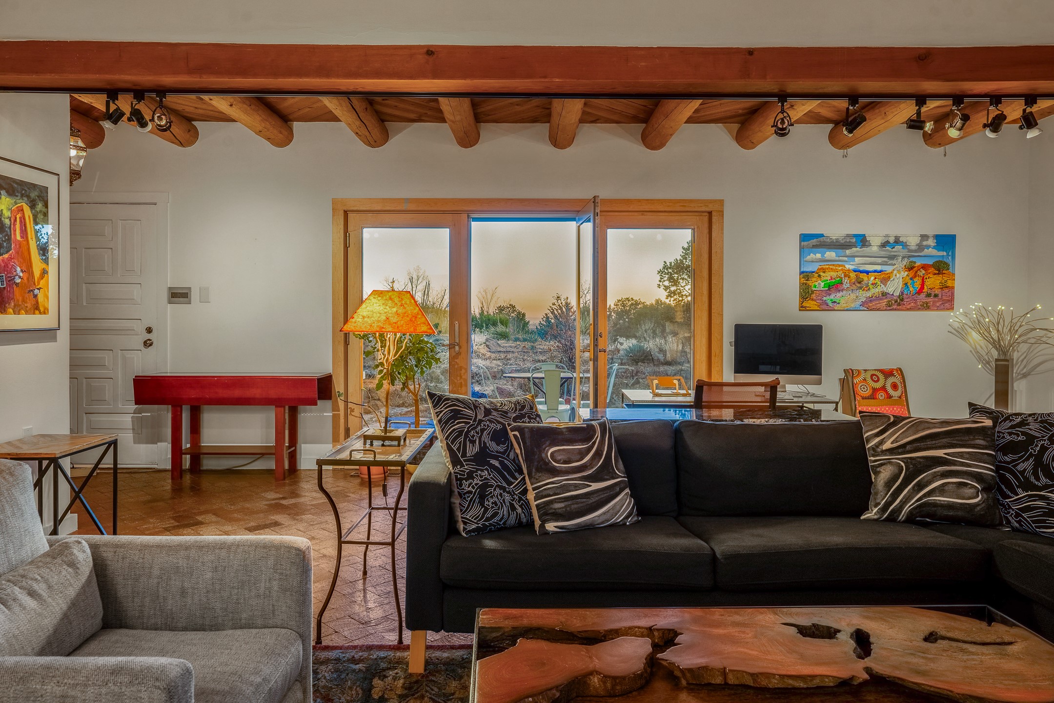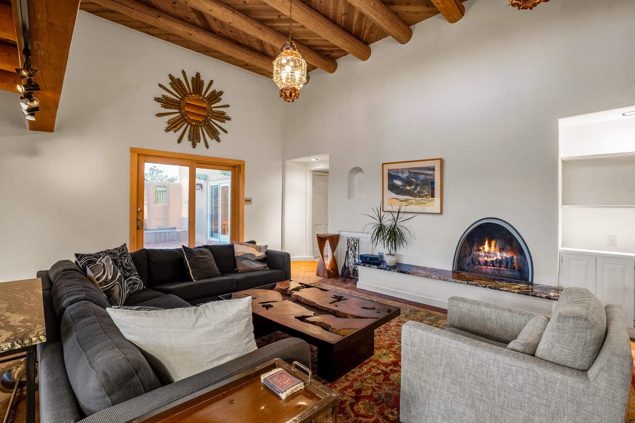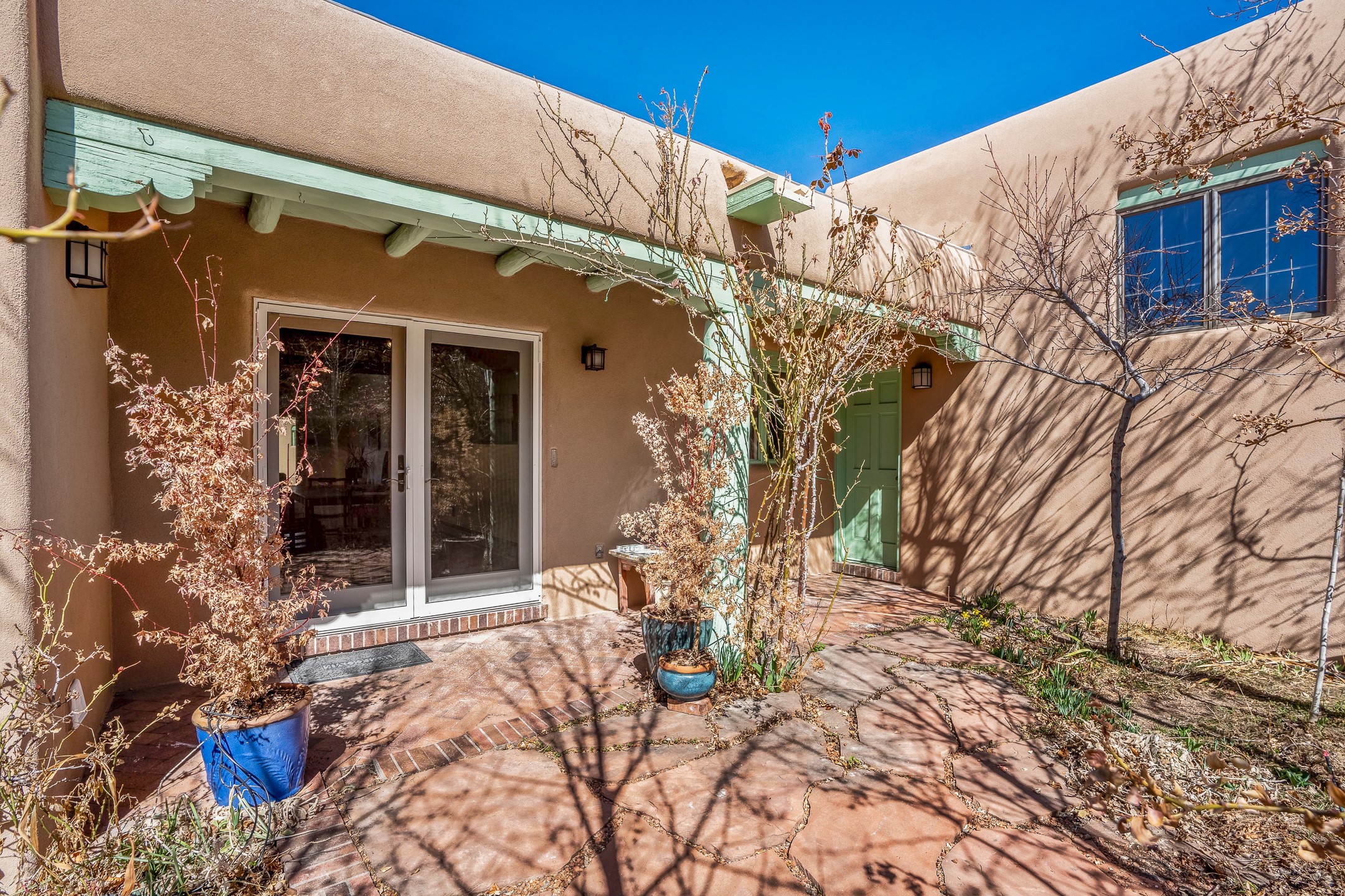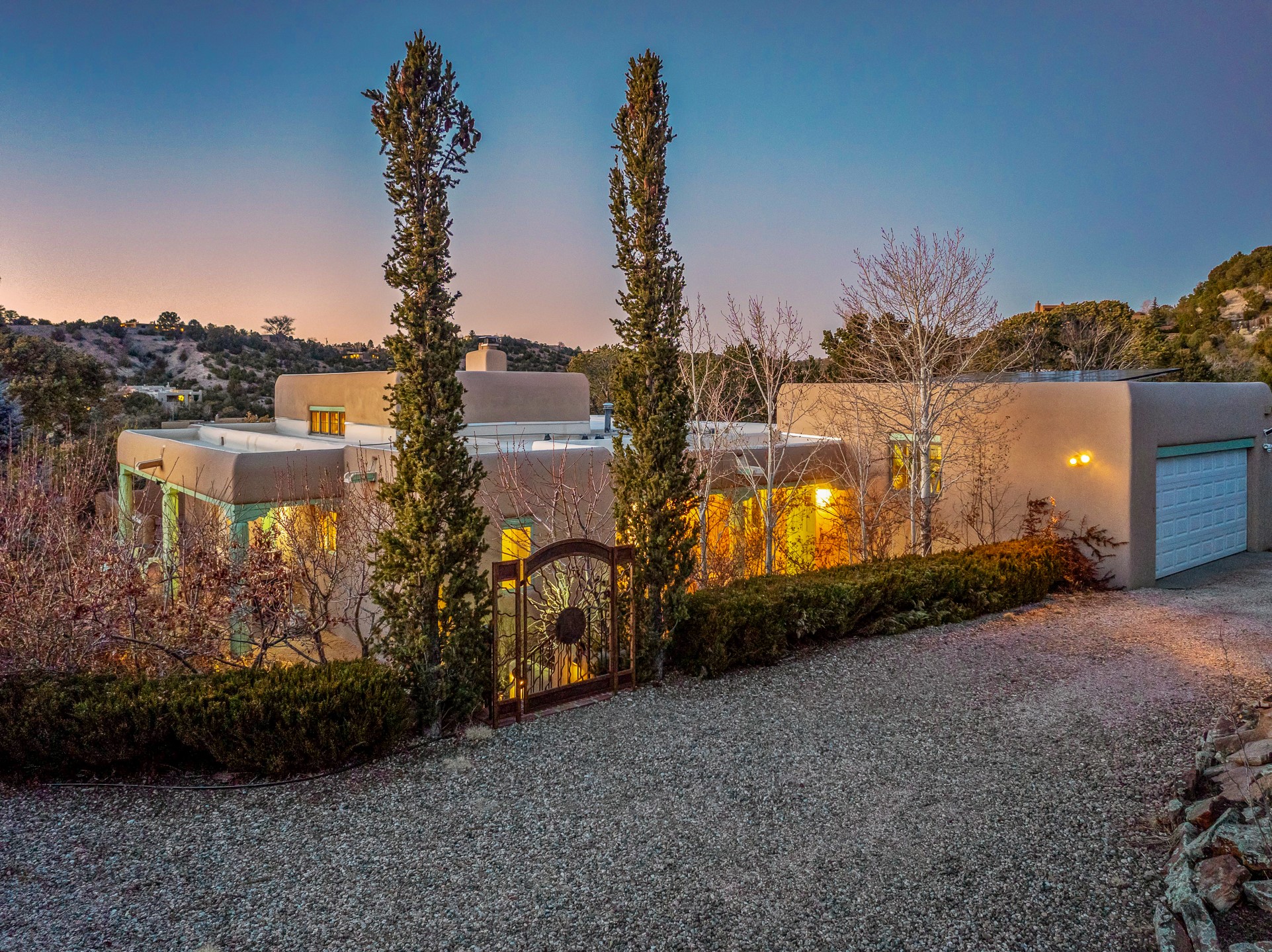 Beauty and elegance abound in this exquisite north east Santa Fe home. Nestled into the rolling hills just minutes from the Plaza, this NE gem has sweeping sunset views of the Sandia Mountains. A lush and tranquil garden with mature fruit trees, roses, aspen, and a towering ponderosa pine surround the house providing privacy. The single level Main house has a flowing open floor plan replete with Southwest charm, including beamed high ceilings, two Kiva fireplaces, a fully remodeled kitchen with granite countertops and breakfast bar seating. The large bedrooms have an abundance of closet space and built in shelving. The primary bedroom includes lovely picture windows, french doors leading out to the patio with outdoor fireplace and an ensuite bathroom with jacuzzi tub. The Main house has Tesla Solar Panels which were purchased in 2016 and have a 20 year warranty, a New Roof and recent stucco, as well as recently added french doors in the living room and Primary bedroom. An income-producing detached Casita with lovely views is privately set away from the Main House, and includes a full kitchen, 3/4 bath, and its own portal.