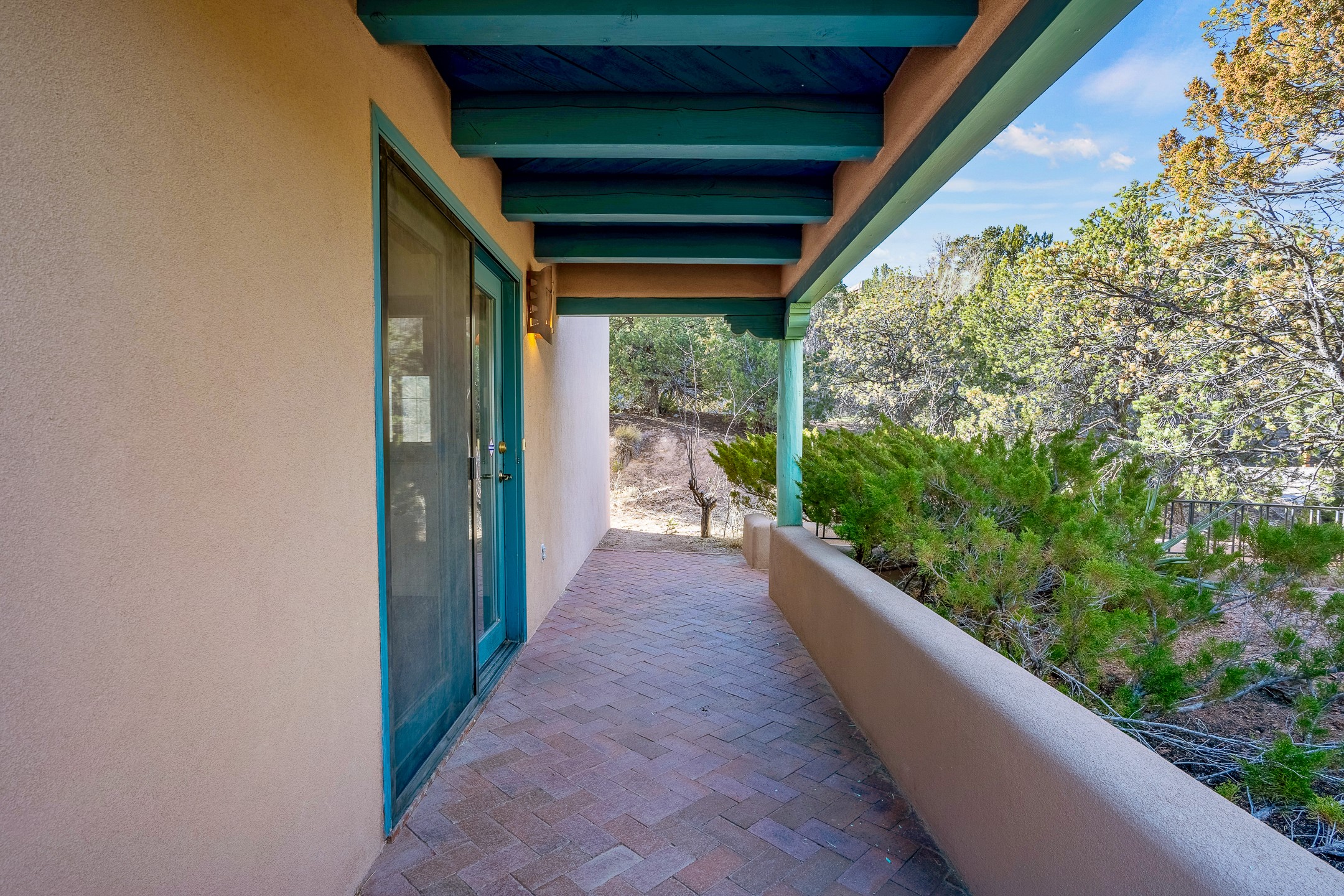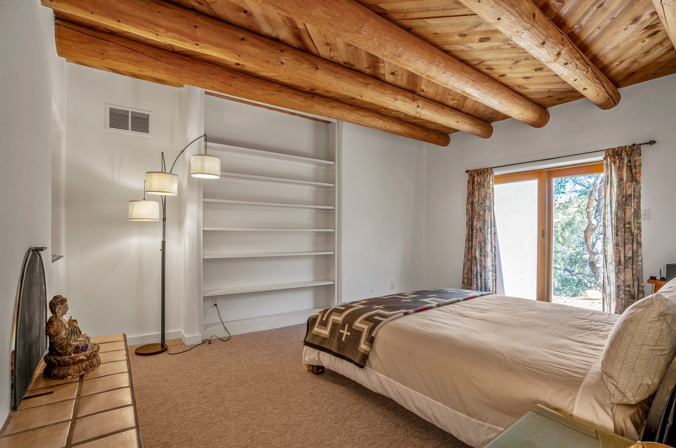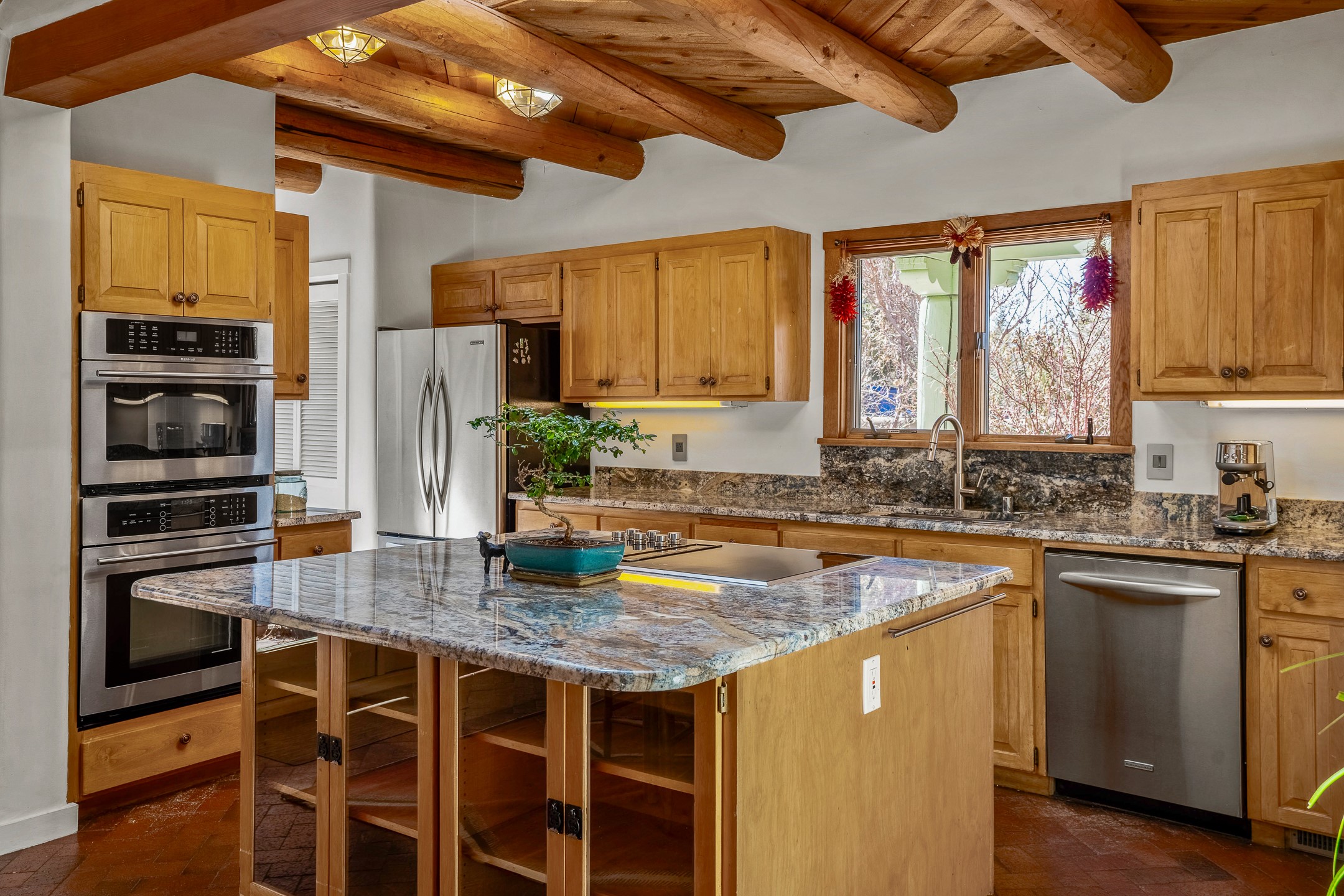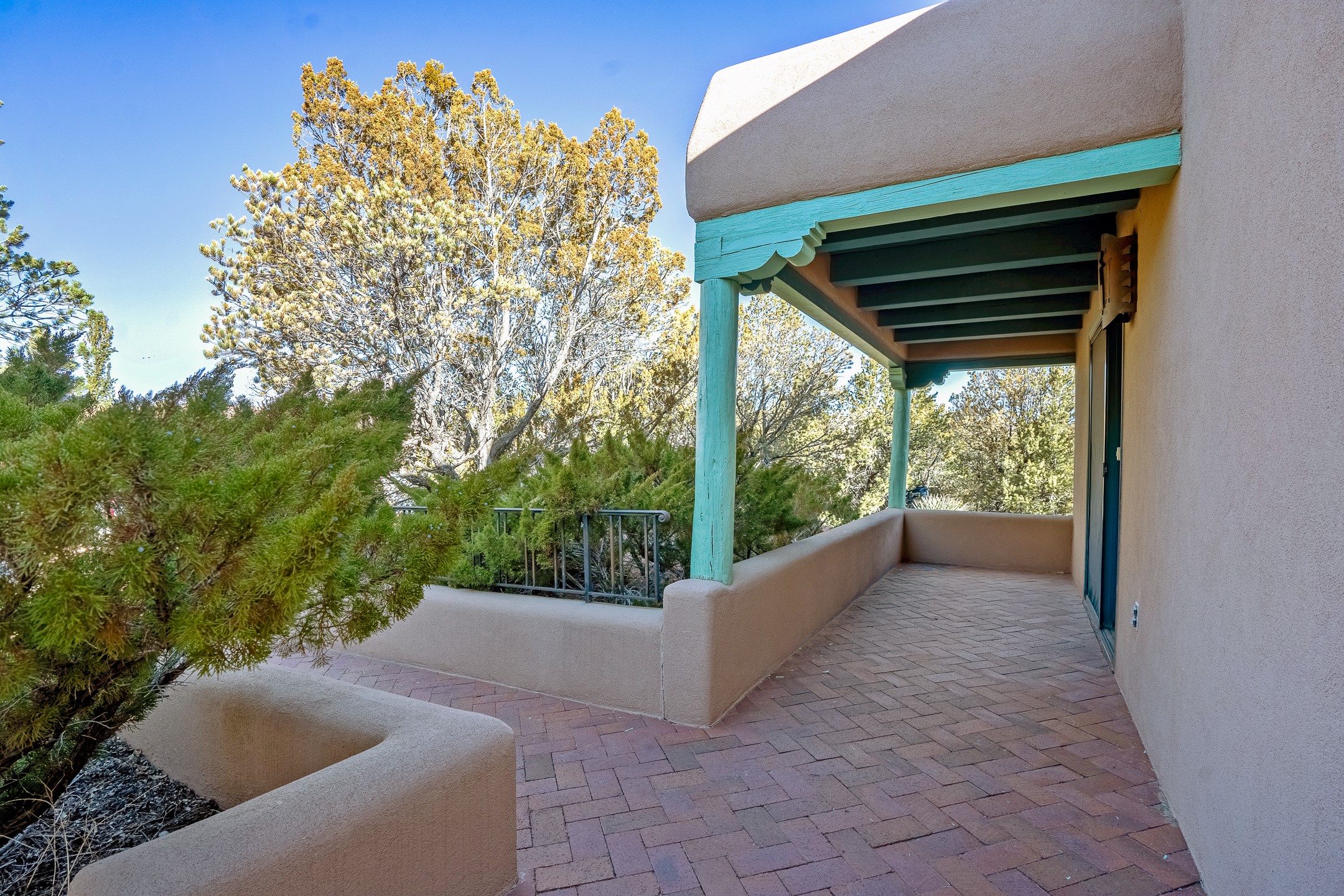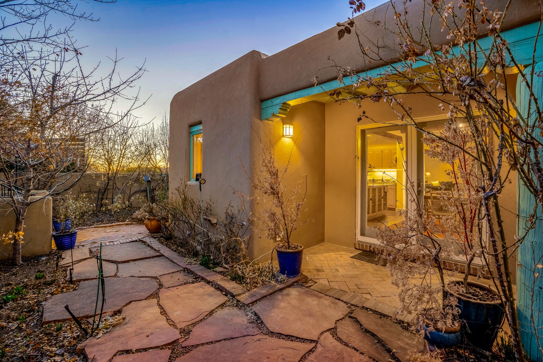 Beauty and elegance abound in this exquisite north east Santa Fe home. Nestled into the rolling hills just minutes from the Plaza, this NE gem has sweeping sunset views of the Sandia Mountains. A lush and tranquil garden with mature fruit trees, roses, aspen, and a towering ponderosa pine surround the house providing privacy. The single level Main house has a flowing open floor plan replete with Southwest charm, including beamed high ceilings, two Kiva fireplaces, a fully remodeled kitchen with granite countertops and breakfast bar seating. The large bedrooms have an abundance of closet space and built in shelving. The primary bedroom includes lovely picture windows, french doors leading out to the patio with outdoor fireplace and an ensuite bathroom with jacuzzi tub. The Main house has Tesla Solar Panels which were purchased in 2016 and have a 20 year warranty, a New Roof and recent stucco, as well as recently added french doors in the living room and Primary bedroom. An income-producing detached Casita with lovely views is privately set away from the Main House, and includes a full kitchen, 3/4 bath, and its own portal.