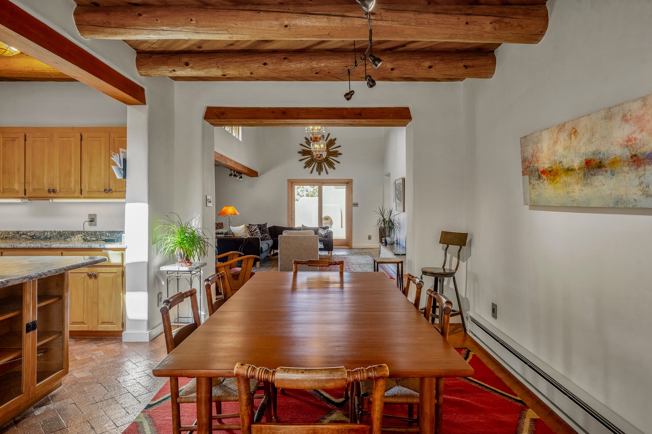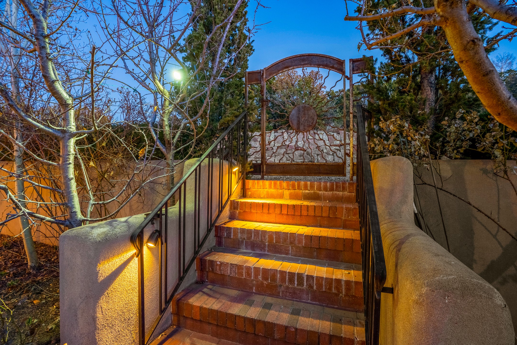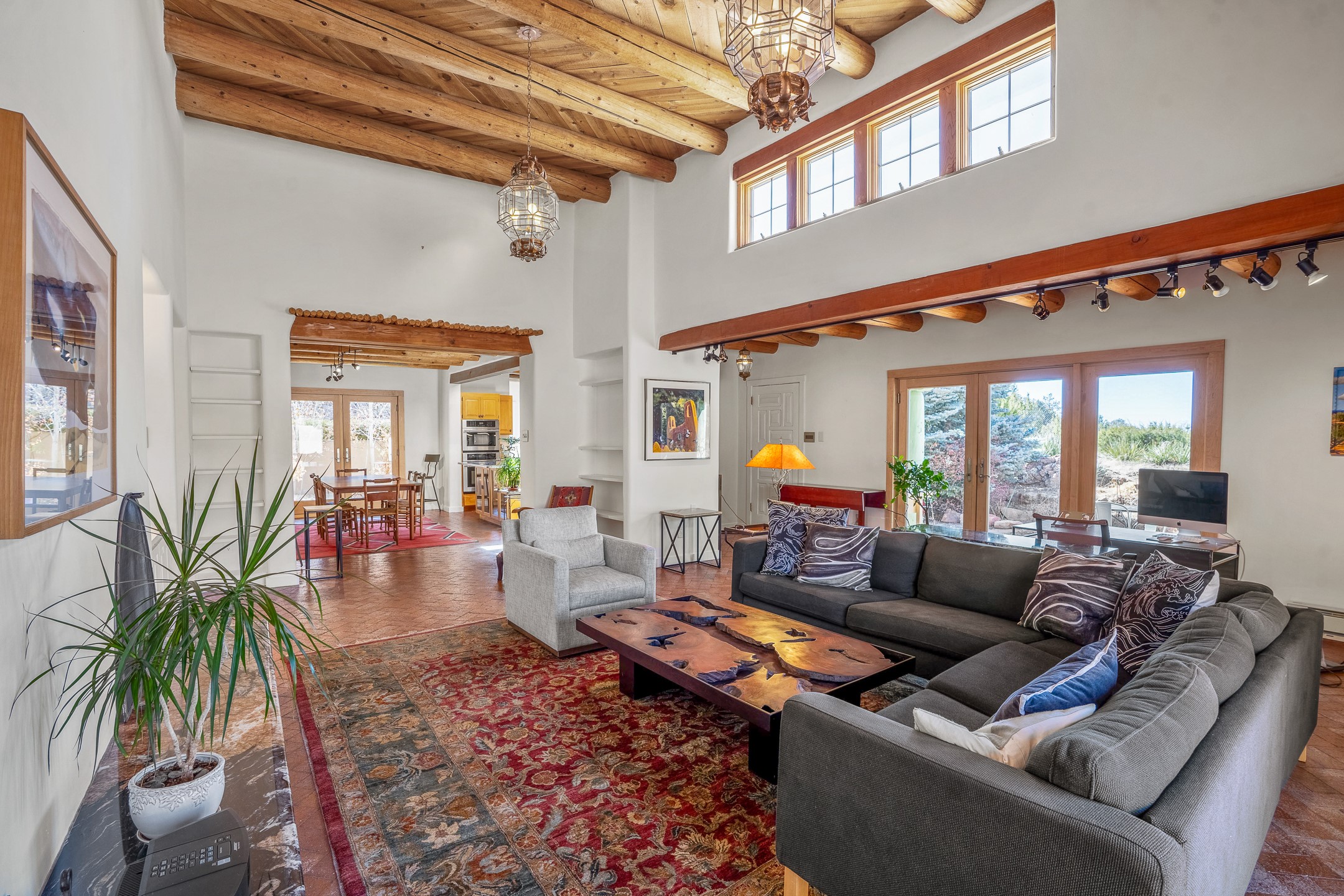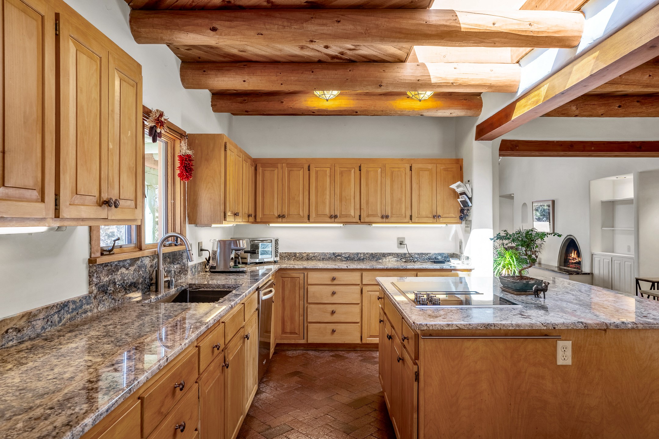 Beauty and elegance abound in this exquisite north east Santa Fe home. Nestled into the rolling hills just minutes from the Plaza, this NE gem has sweeping sunset views of the Sandia Mountains. A lush and tranquil garden with mature fruit trees, roses, aspen, and a towering ponderosa pine surround the house providing privacy. The single level Main house has a flowing open floor plan replete with Southwest charm, including beamed high ceilings, two Kiva fireplaces, a fully remodeled kitchen with granite countertops and breakfast bar seating. The large bedrooms have an abundance of closet space and built in shelving. The primary bedroom includes lovely picture windows, french doors leading out to the patio with outdoor fireplace and an ensuite bathroom with jacuzzi tub. The Main house has Tesla Solar Panels which were purchased in 2016 and have a 20 year warranty, a New Roof and recent stucco, as well as recently added french doors in the living room and Primary bedroom. An income-producing detached Casita with lovely views is privately set away from the Main House, and includes a full kitchen, 3/4 bath, and its own portal.