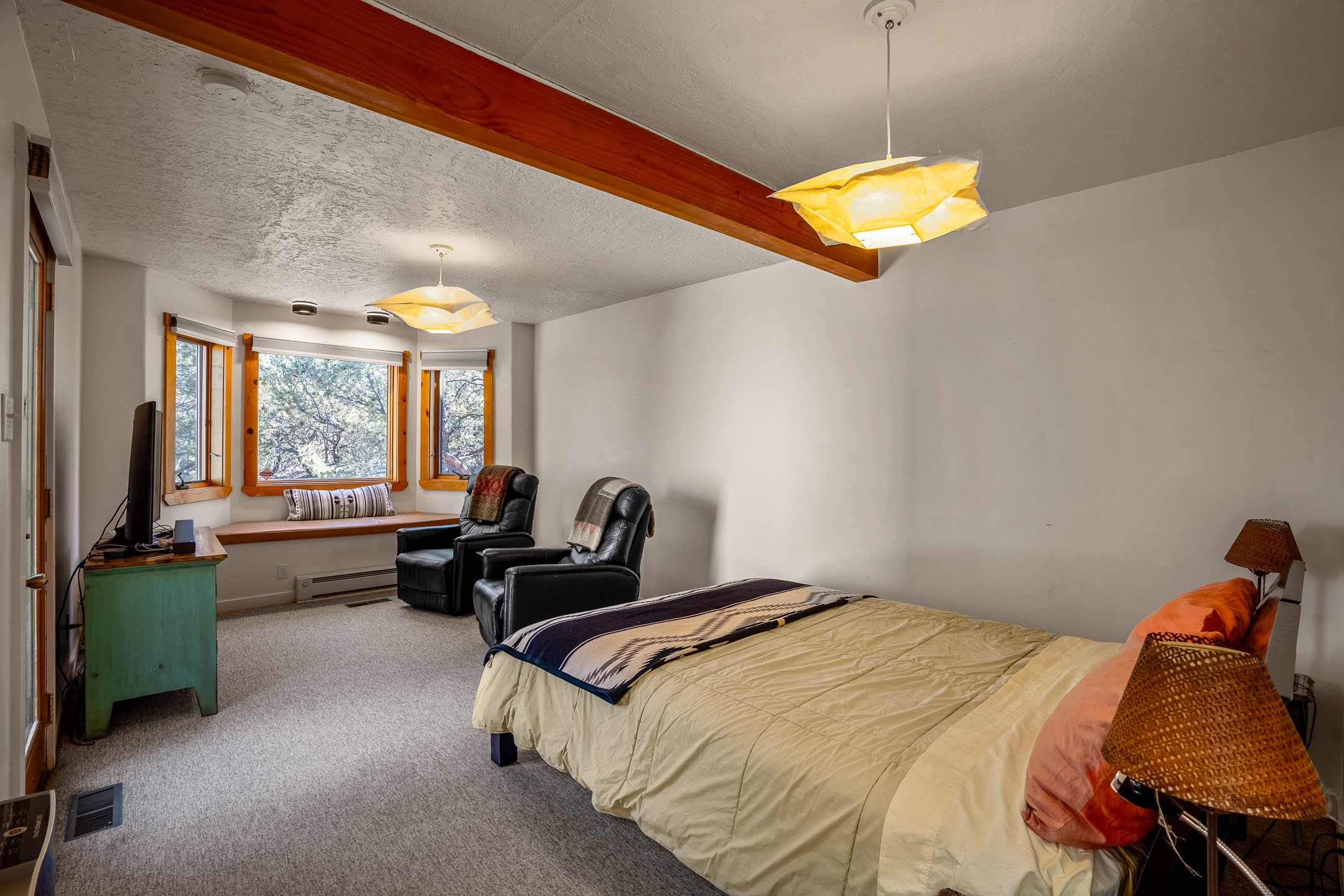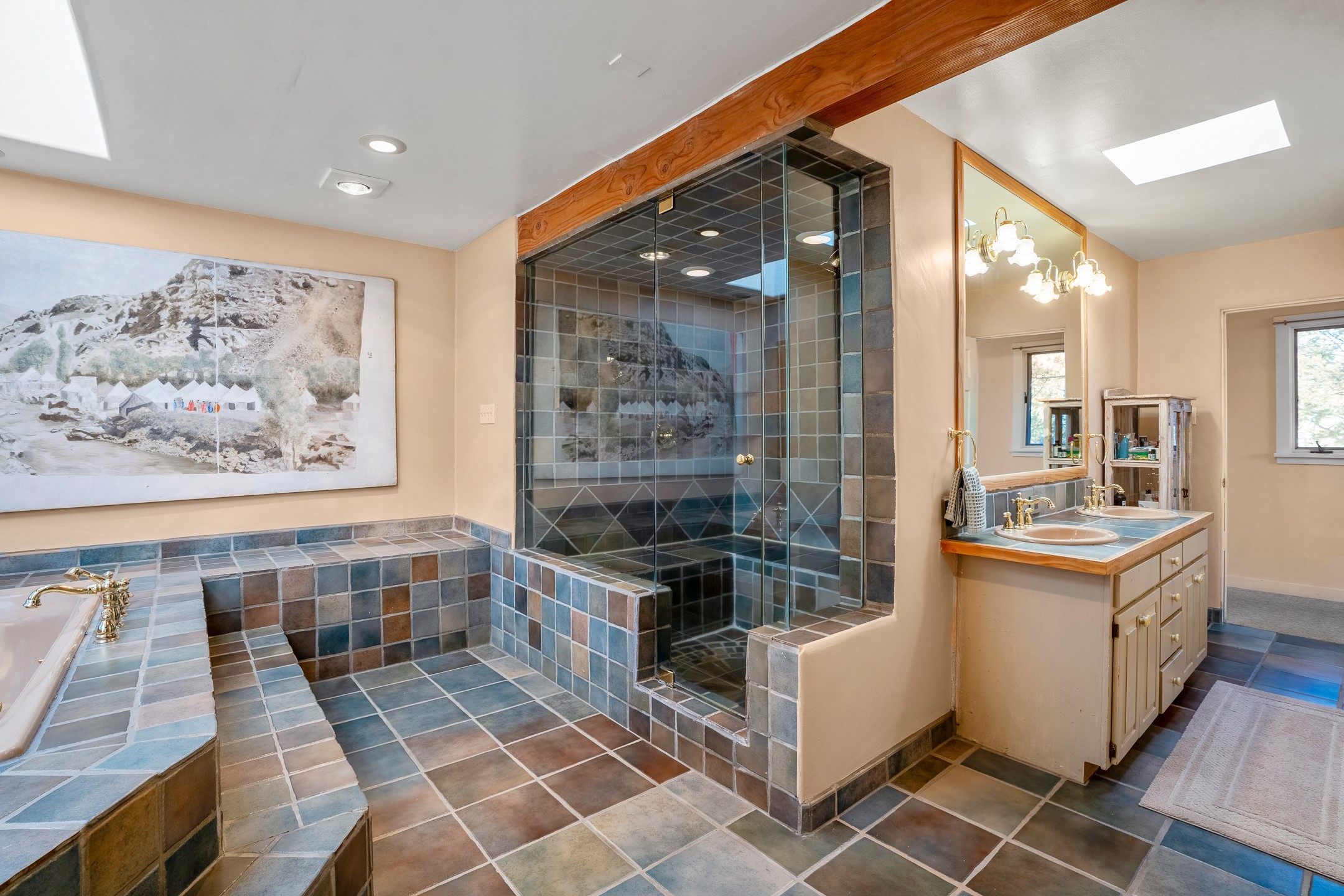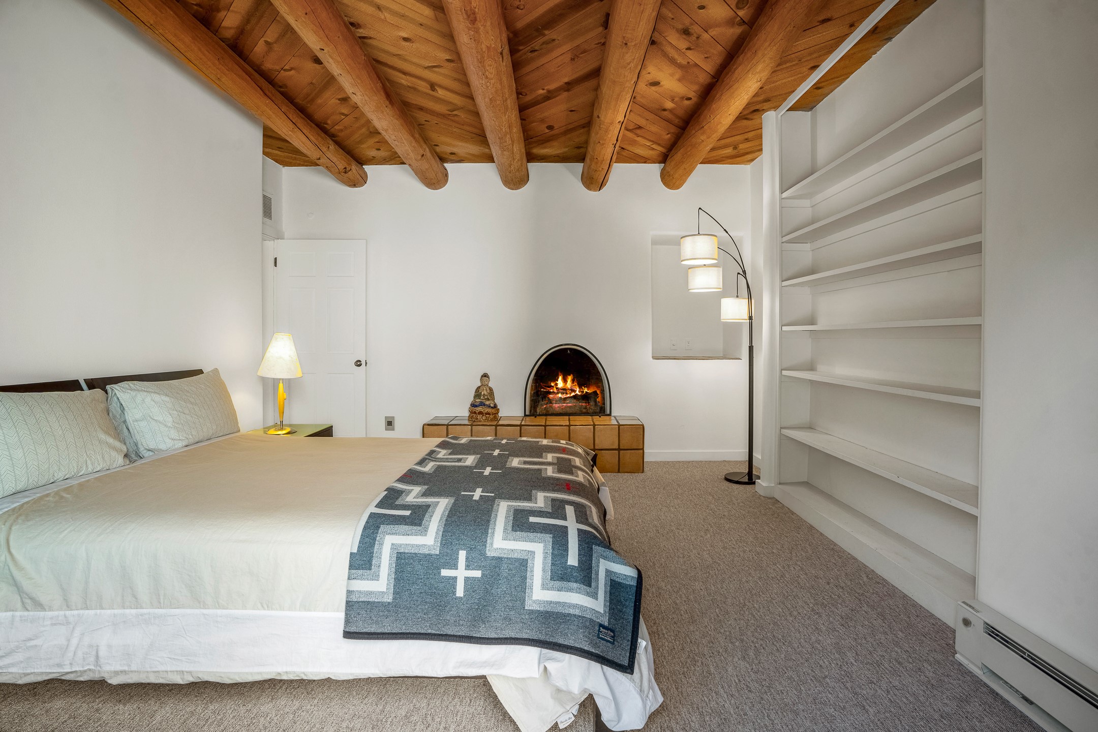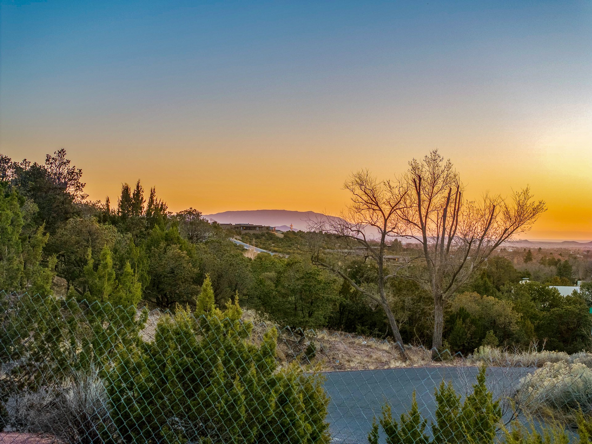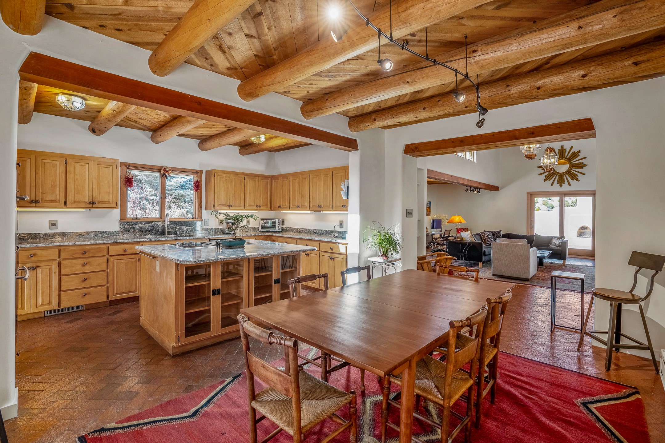 Beauty and elegance abound in this exquisite north east Santa Fe home. Nestled into the rolling hills just minutes from the Plaza, this NE gem has sweeping sunset views of the Sandia Mountains. A lush and tranquil garden with mature fruit trees, roses, aspen, and a towering ponderosa pine surround the house providing privacy. The single level Main house has a flowing open floor plan replete with Southwest charm, including beamed high ceilings, two Kiva fireplaces, a fully remodeled kitchen with granite countertops and breakfast bar seating. The large bedrooms have an abundance of closet space and built in shelving. The primary bedroom includes lovely picture windows, french doors leading out to the patio with outdoor fireplace and an ensuite bathroom with jacuzzi tub. The Main house has Tesla Solar Panels which were purchased in 2016 and have a 20 year warranty, a New Roof and recent stucco, as well as recently added french doors in the living room and Primary bedroom. An income-producing detached Casita with lovely views is privately set away from the Main House, and includes a full kitchen, 3/4 bath, and its own portal.