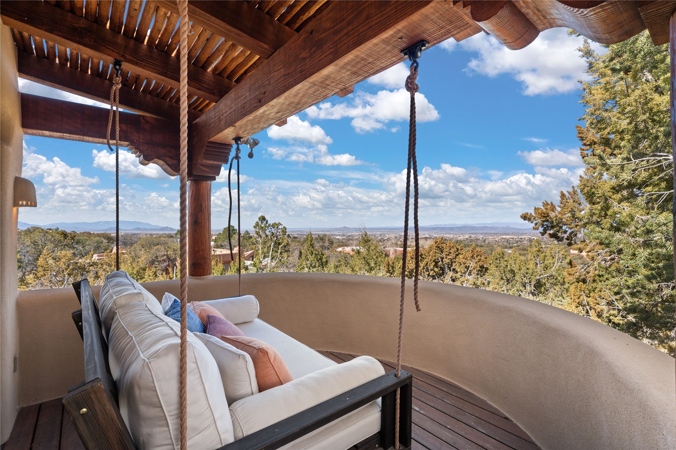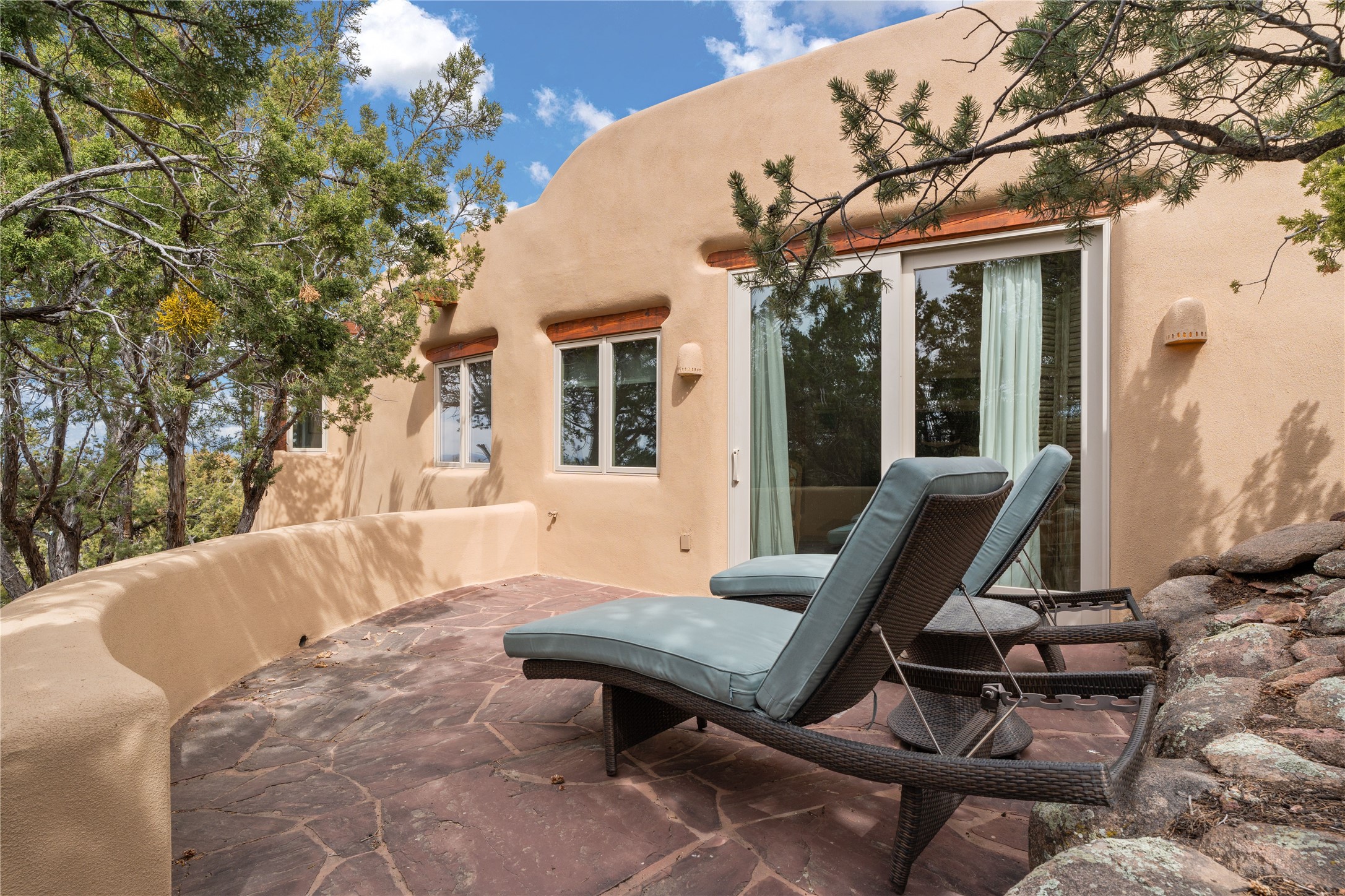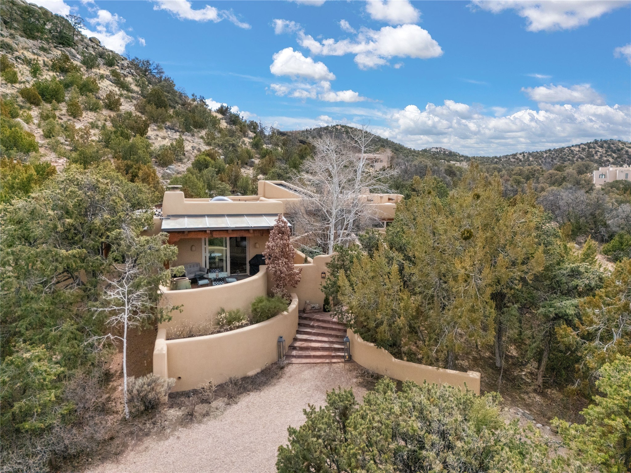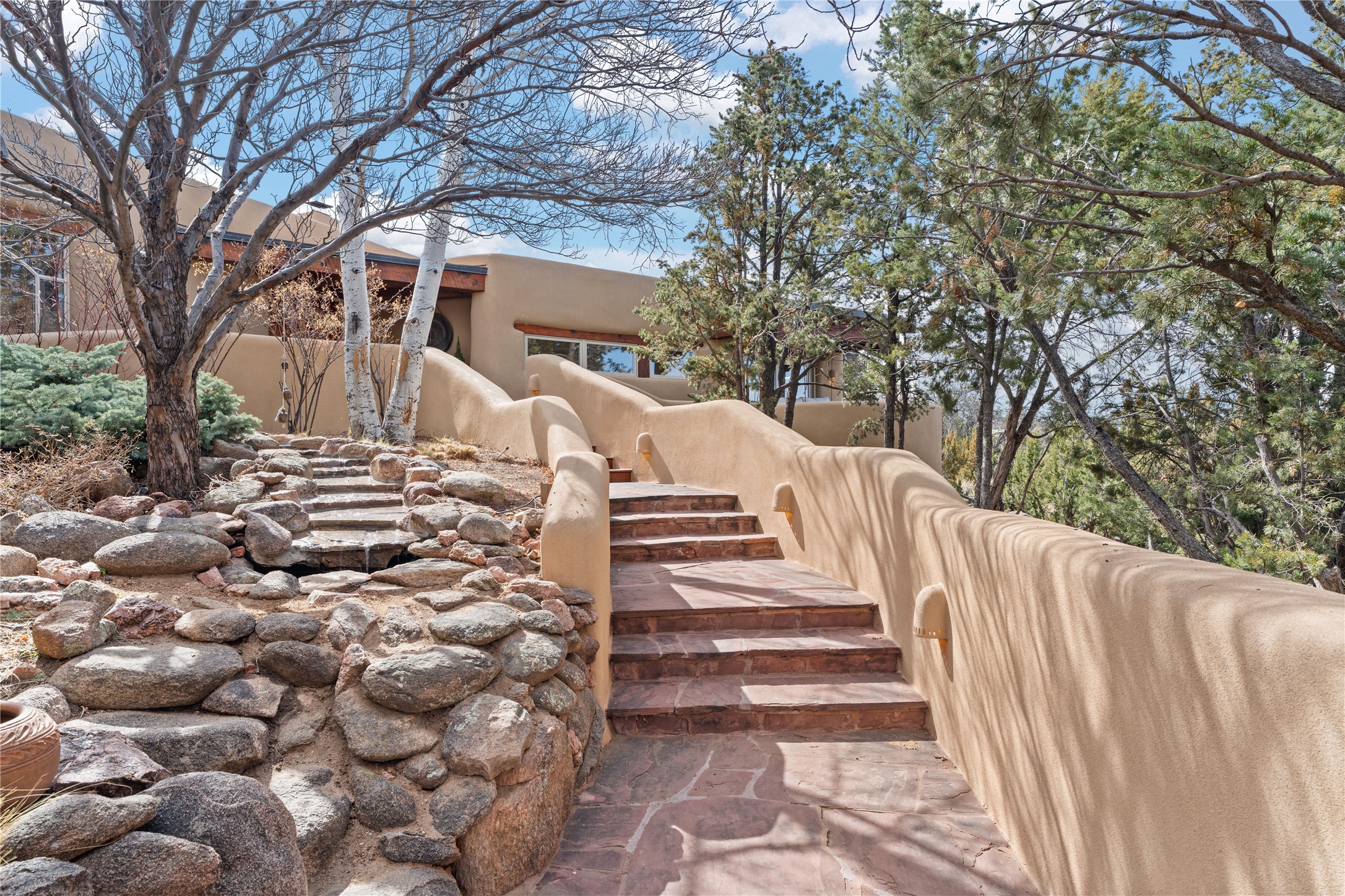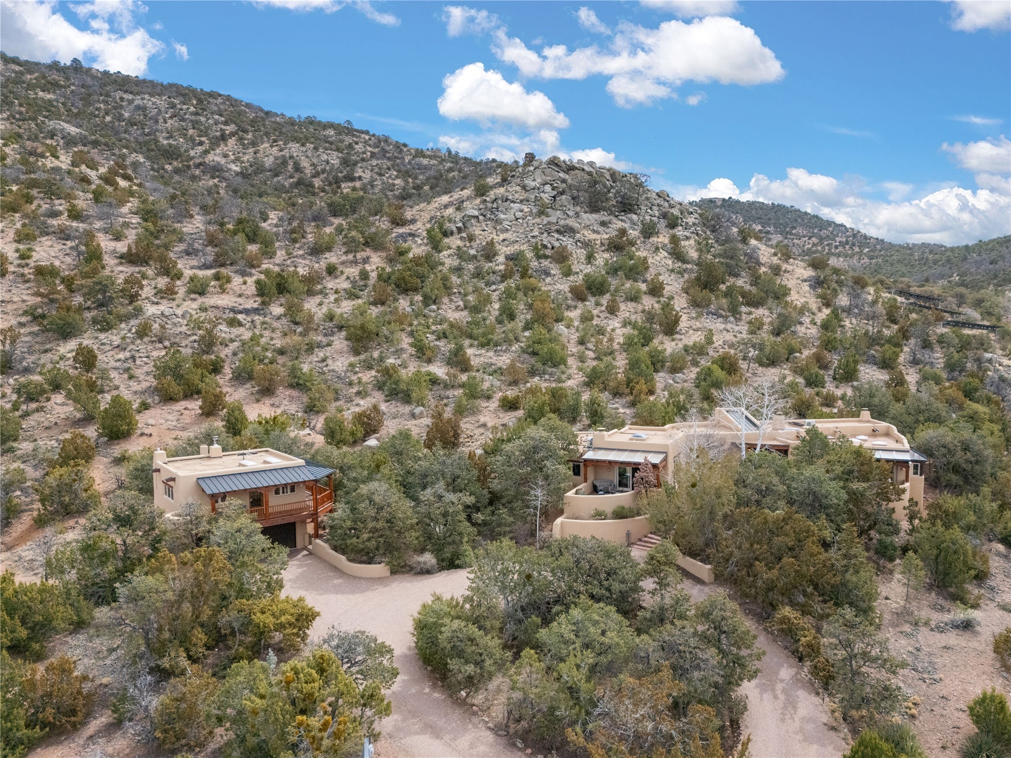Nestled at the base of Sun and Moon Mountains, this exquisite adobe residence designed by Ken Mackenzie, and its charming casita, offer unparalleled views and masterful craftsmanship. Set amidst dramatic rock outcroppings, the home is accessed via a flagstone staircase surrounded by mature landscaping and a cascading water feature.Inside, curvaceous adobe walls create a seamless flow between distinct living areas. The cozy family room, featuring built-in bookshelves, banco seating, and a wood-burning fireplace, opens to a chef's kitchen with generous storage and ample prep-space. Adjacent to the kitchen, an intimate dining room is elevated above the living area, providing both a sense of architectural interest and breathtaking views of the Jemez Mountains and city lights. Two sets of sliding doors open to a mahogany deck, extending the living space and inviting you to enjoy the airy interplay between interior and exterior spaces.The primary suite offers a tranquil retreat with two bedrooms, one of which enjoys a kiva fireplace and a secluded flagstone patio, while the other can serve as a versatile office, den, or exercise space, with access to a private deck and incredible views. Both bedrooms share a spa-inspired bathroom with a double vanity and soaking tub, as well as a half bath. On the opposite side of the home, two additional bedrooms share a stylish 3/4-bath. Coved ceilings, plaster walls, built-ins and nichos enhance the charm and warmth of the home.An elevated 624-square-foot casita captures stunning views from its large windows and west-facing deck. The light-filled floor plan includes a kitchenette and 3/4-bath. An additional 130-square foot studio can be used for a variety of purposes. The exceptional foothill location provides immediate access to hiking trails and nearby Museum Hill. The property is well-maintained with pride of ownership reflected in the newer roof, stucco and mini-splits for cooling. Sited on 4.7 acres, this property is the perfect blend of peaceful living, stunning design, and unmatched views--truly a one-of-a-kind home.