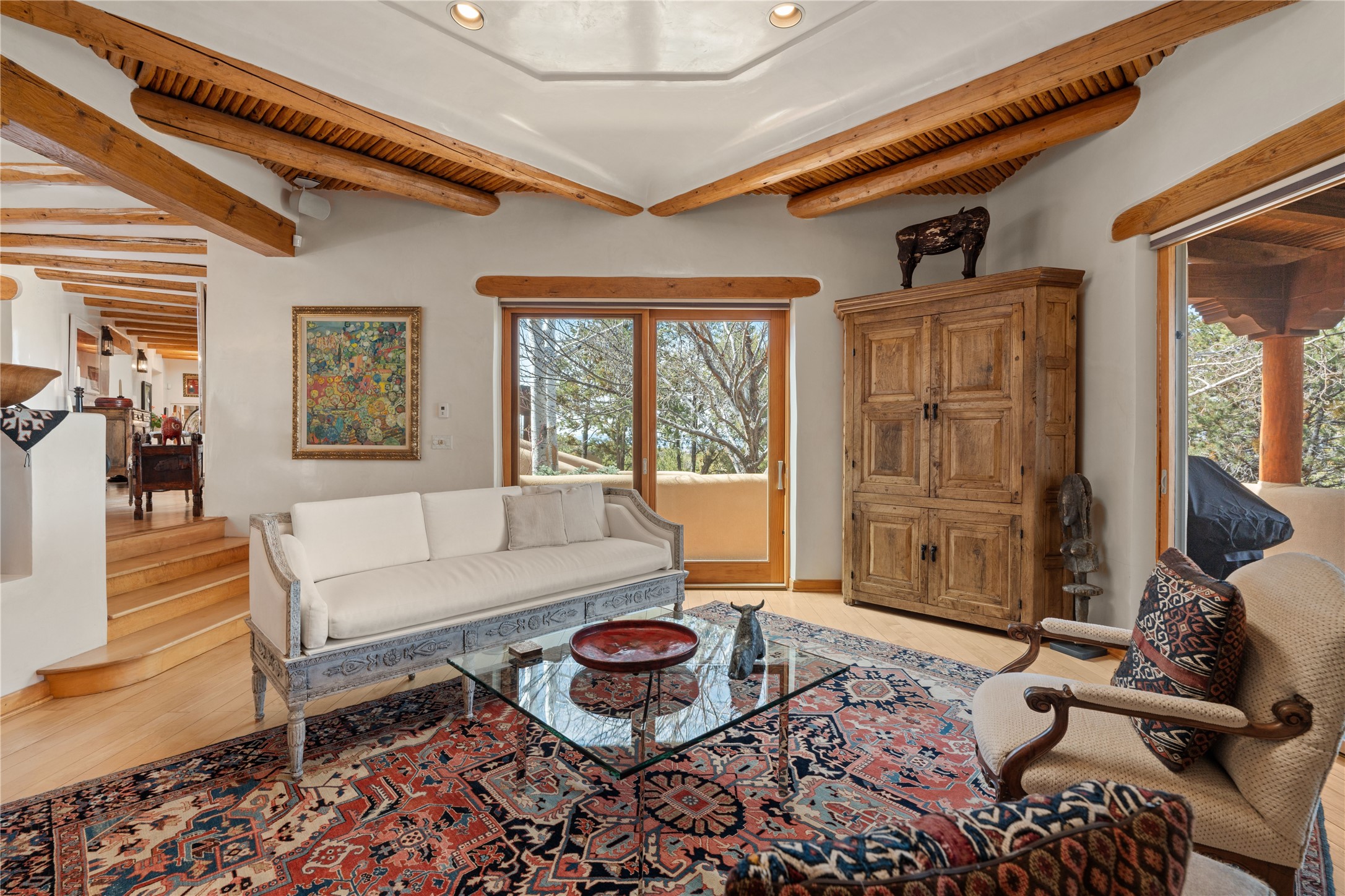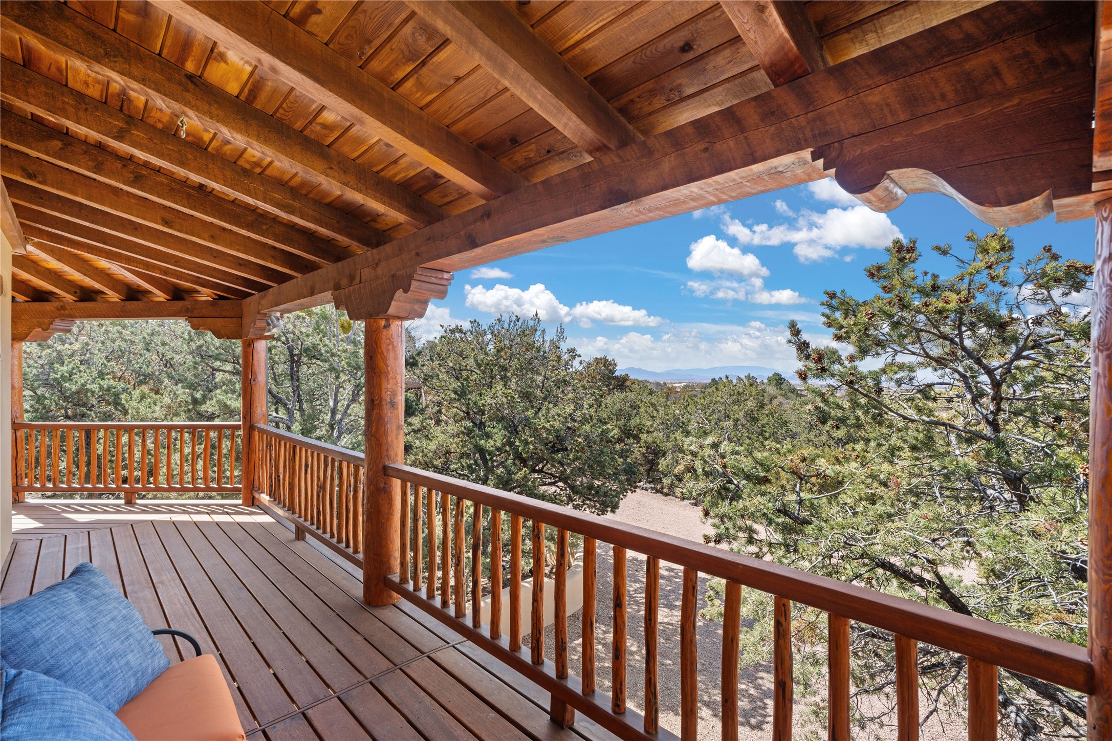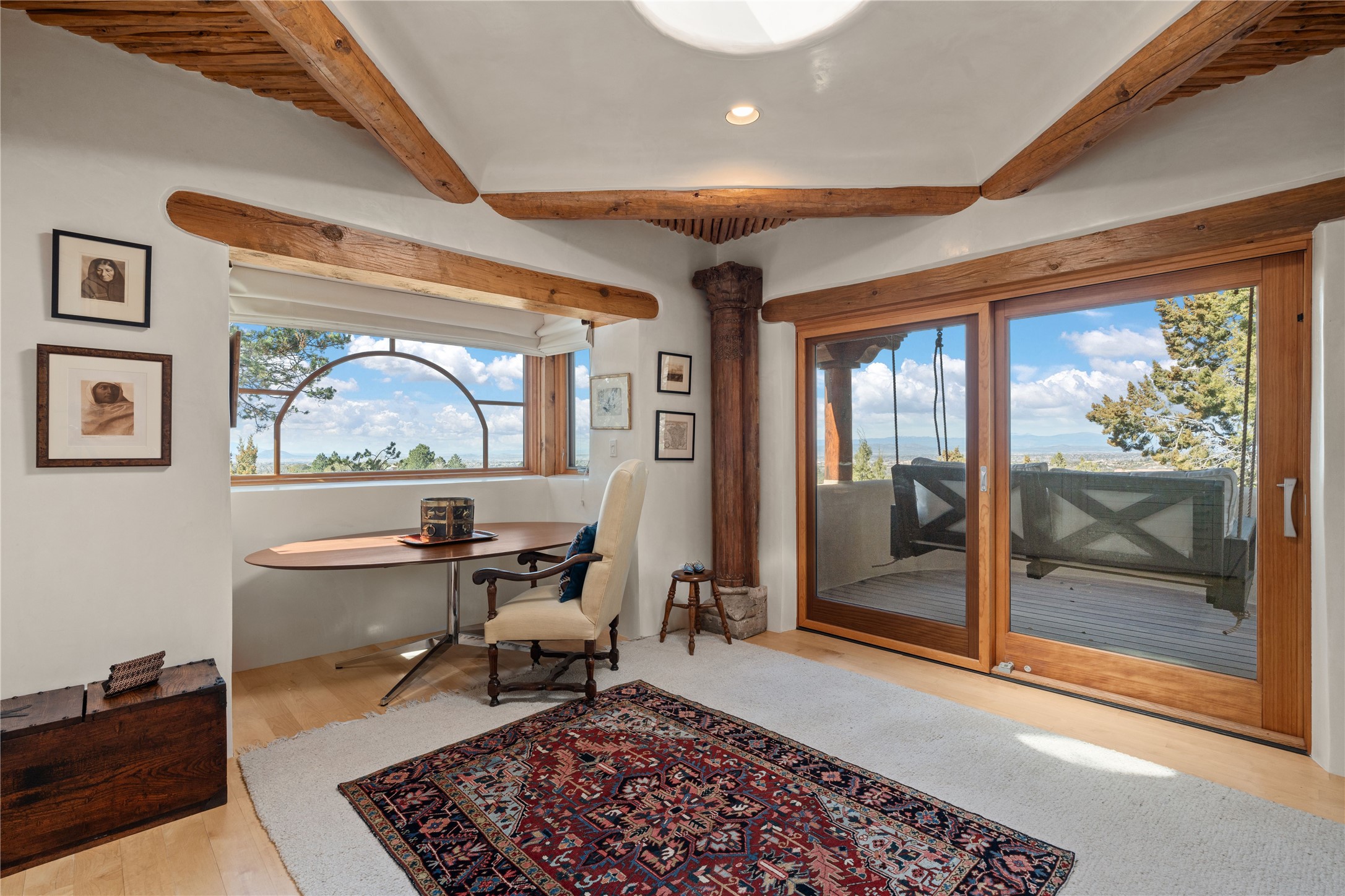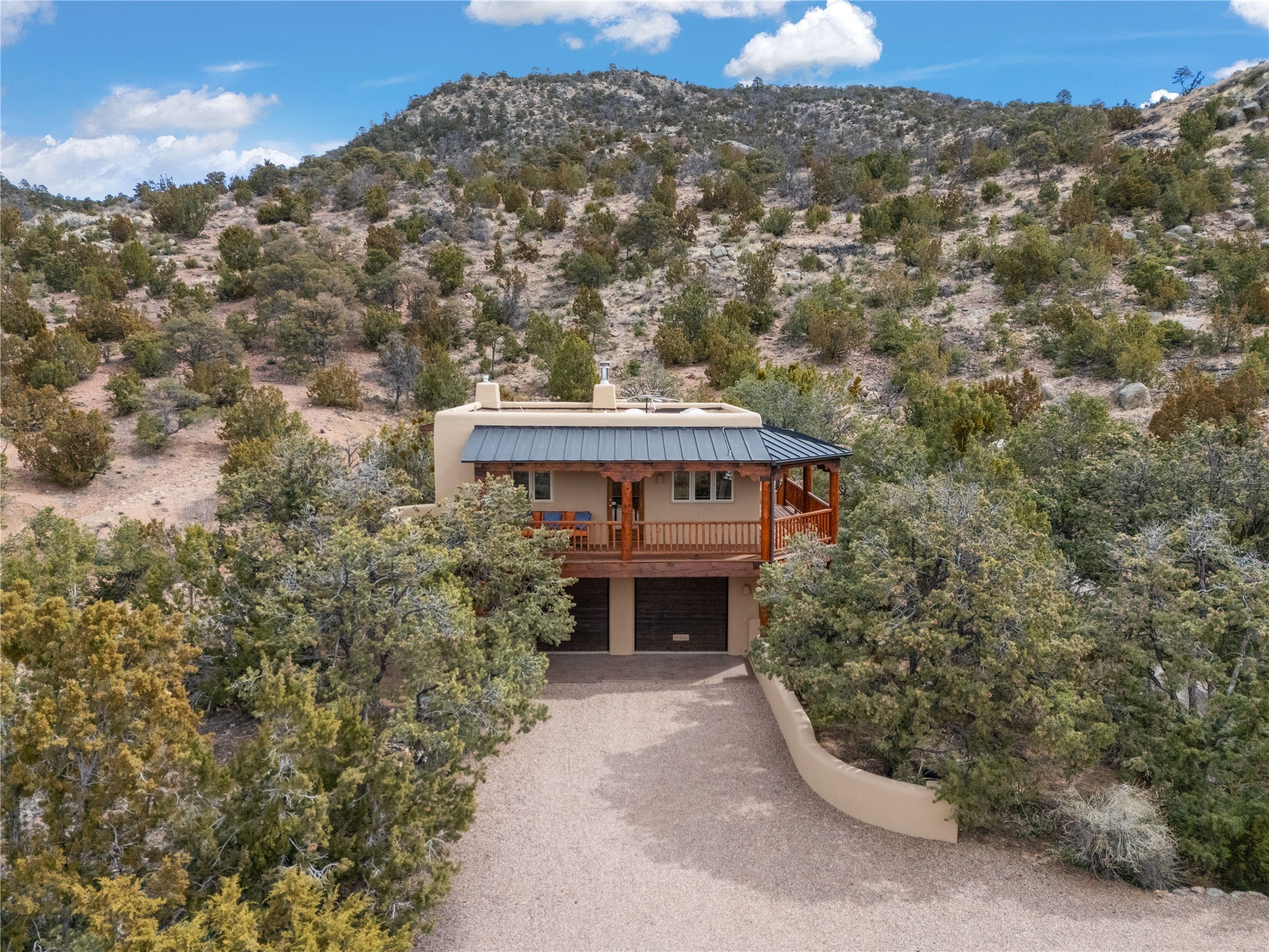 Nestled at the base of Sun and Moon Mountains, this exquisite adobe residence designed by Ken Mackenzie, and its charming casita, offer unparalleled views and masterful craftsmanship. Set amidst dramatic rock outcroppings, the home is accessed via a flagstone staircase surrounded by mature landscaping and a cascading water feature.Inside, curvaceous adobe walls create a seamless flow between distinct living areas. The cozy family room, featuring built-in bookshelves, banco seating, and a wood-burning fireplace, opens to a chef's kitchen with generous storage and ample prep-space. Adjacent to the kitchen, an intimate dining room is elevated above the living area, providing both a sense of architectural interest and breathtaking views of the Jemez Mountains and city lights. Two sets of sliding doors open to a mahogany deck, extending the living space and inviting you to enjoy the airy interplay between interior and exterior spaces.The primary suite offers a tranquil retreat with two bedrooms, one of which enjoys a kiva fireplace and a secluded flagstone patio, while the other can serve as a versatile office, den, or exercise space, with access to a private deck and incredible views. Both bedrooms share a spa-inspired bathroom with a double vanity and soaking tub, as well as a half bath. On the opposite side of the home, two additional bedrooms share a stylish 3/4-bath. Coved ceilings, plaster walls, built-ins and nichos enhance the charm and warmth of the home.An elevated 624-square-foot casita captures stunning views from its large windows and west-facing deck. The light-filled floor plan includes a kitchenette and 3/4-bath. An additional 130-square foot studio can be used for a variety of purposes. The exceptional foothill location provides immediate access to hiking trails and nearby Museum Hill. The property is well-maintained with pride of ownership reflected in the newer roof, stucco and mini-splits for cooling. Sited on 4.7 acres, this property is the perfect blend of peaceful living, stunning design, and unmatched views--truly a one-of-a-kind home.
