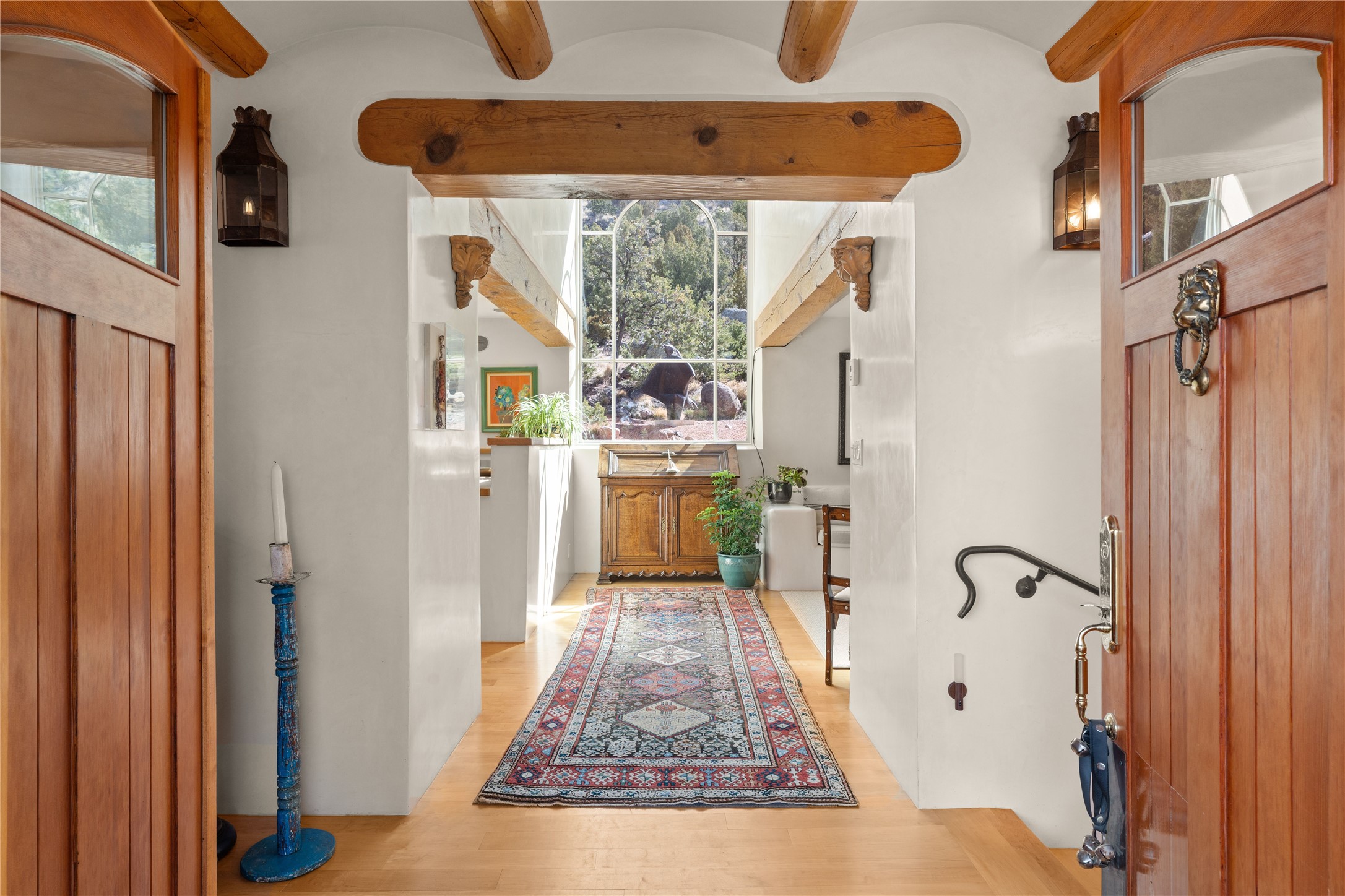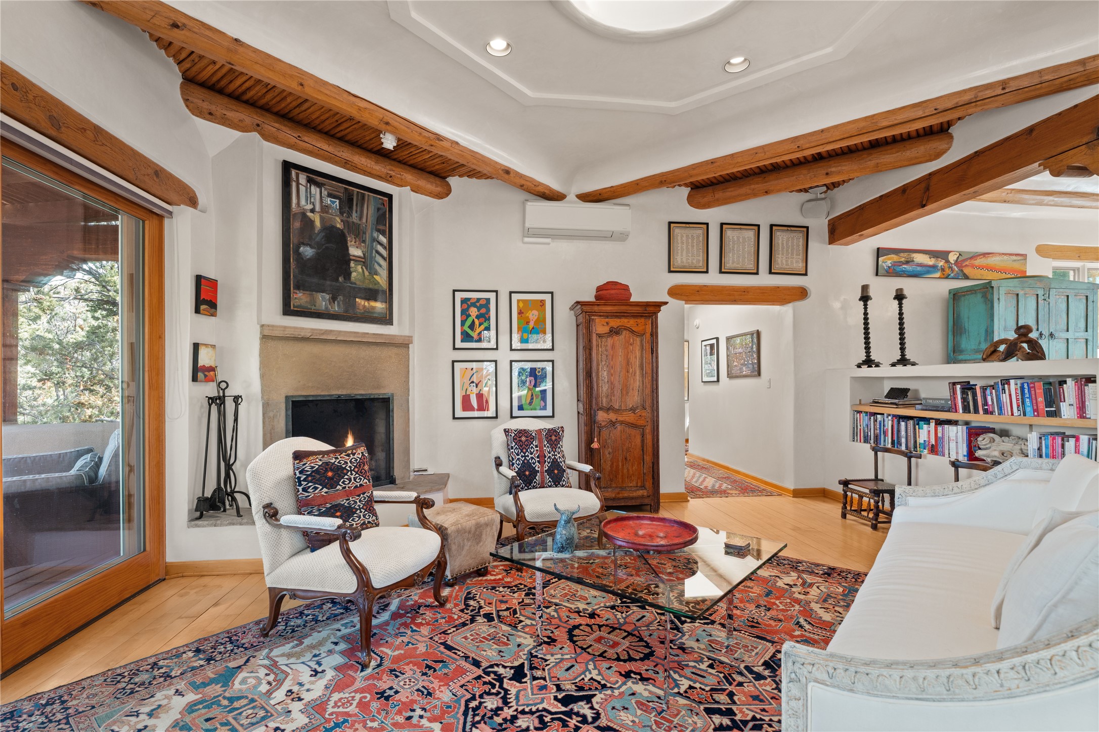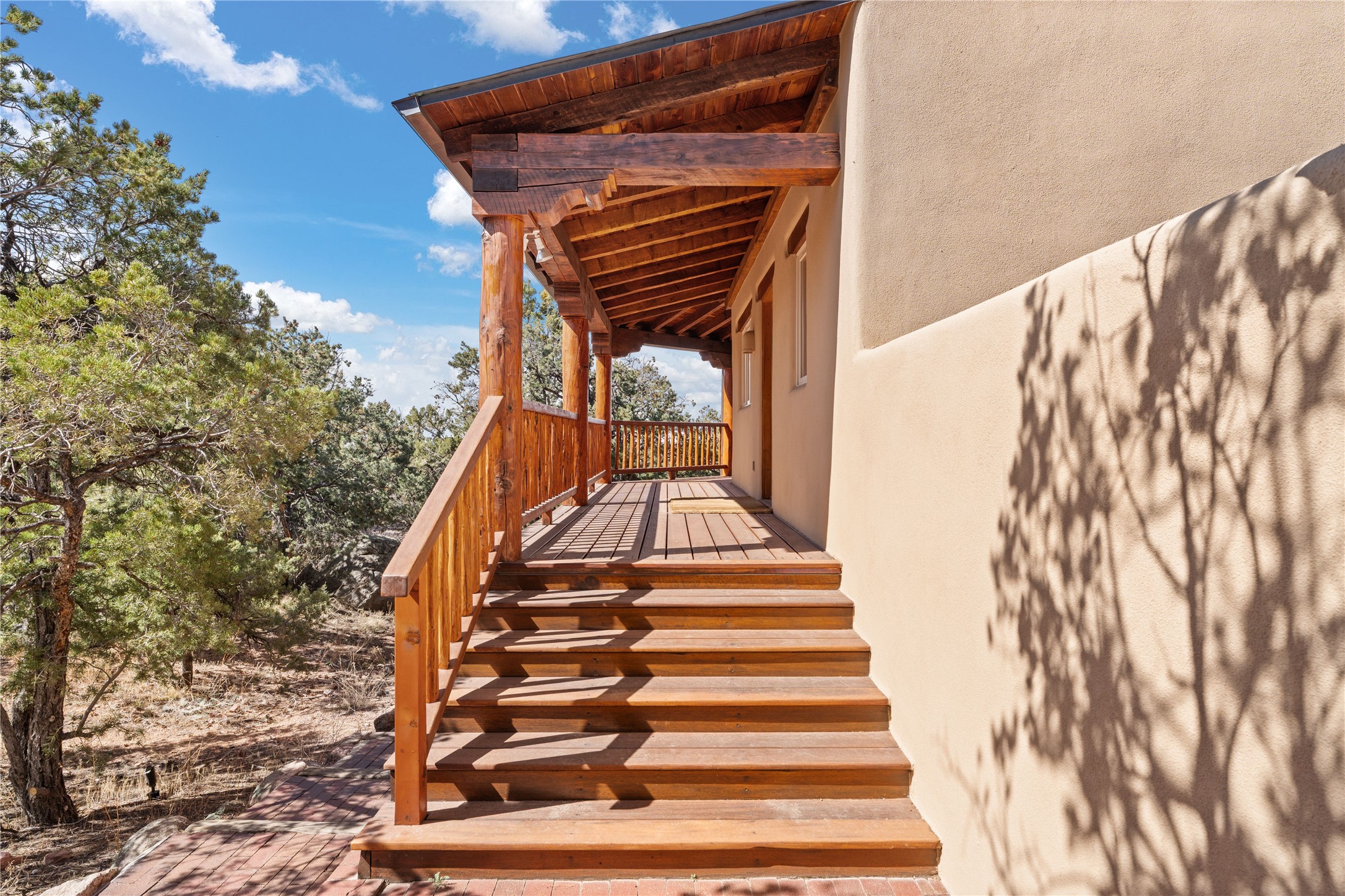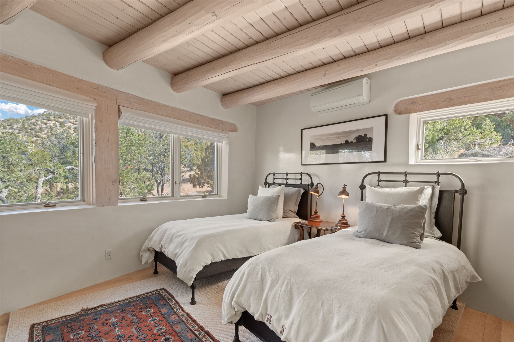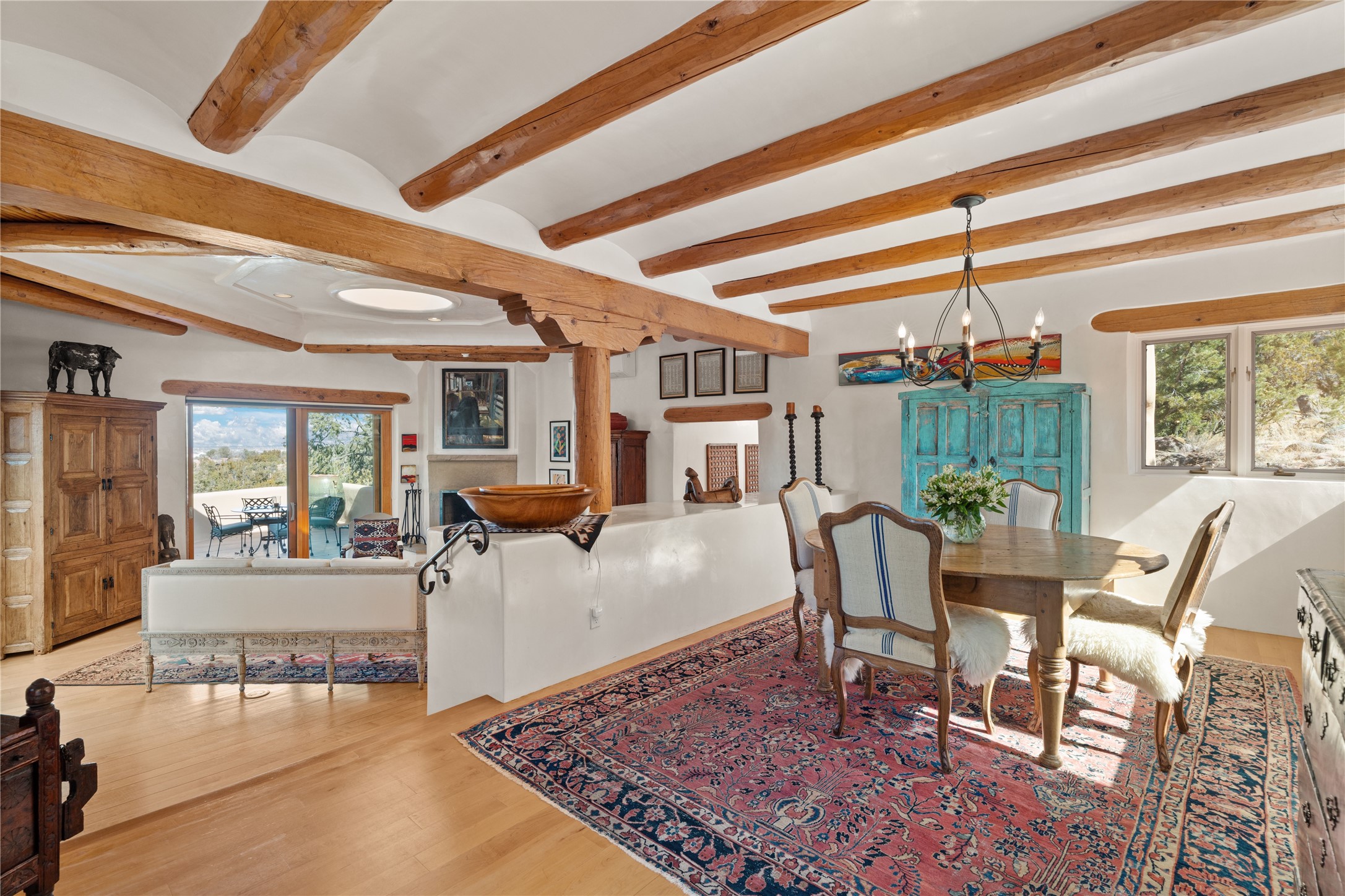Nestled at the base of Sun and Moon Mountains, this exquisite adobe residence designed by Ken Mackenzie, and its charming casita, offer unparalleled views and masterful craftsmanship. Set amidst dramatic rock outcroppings, the home is accessed via a flagstone staircase surrounded by mature landscaping and a cascading water feature.Inside, curvaceous adobe walls create a seamless flow between distinct living areas. The cozy family room, featuring built-in bookshelves, banco seating, and a wood-burning fireplace, opens to a chef's kitchen with generous storage and ample prep-space. Adjacent to the kitchen, an intimate dining room is elevated above the living area, providing both a sense of architectural interest and breathtaking views of the Jemez Mountains and city lights. Two sets of sliding doors open to a mahogany deck, extending the living space and inviting you to enjoy the airy interplay between interior and exterior spaces.The primary suite offers a tranquil retreat with two bedrooms, one of which enjoys a kiva fireplace and a secluded flagstone patio, while the other can serve as a versatile office, den, or exercise space, with access to a private deck and incredible views. Both bedrooms share a spa-inspired bathroom with a double vanity and soaking tub, as well as a half bath. On the opposite side of the home, two additional bedrooms share a stylish 3/4-bath. Coved ceilings, plaster walls, built-ins and nichos enhance the charm and warmth of the home.An elevated 624-square-foot casita captures stunning views from its large windows and west-facing deck. The light-filled floor plan includes a kitchenette and 3/4-bath. An additional 130-square foot studio can be used for a variety of purposes. The exceptional foothill location provides immediate access to hiking trails and nearby Museum Hill. The property is well-maintained with pride of ownership reflected in the newer roof, stucco and mini-splits for cooling. Sited on 4.7 acres, this property is the perfect blend of peaceful living, stunning design, and unmatched views--truly a one-of-a-kind home.