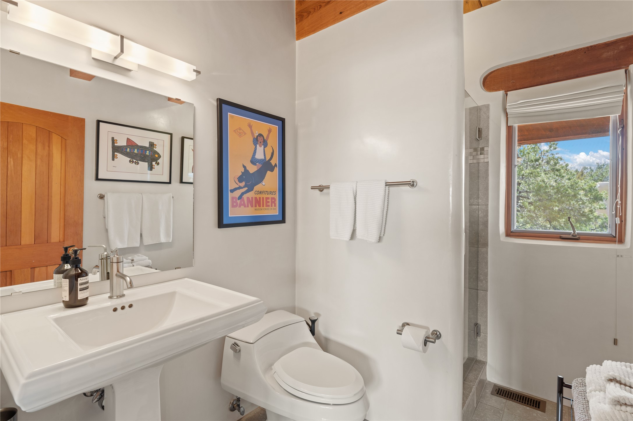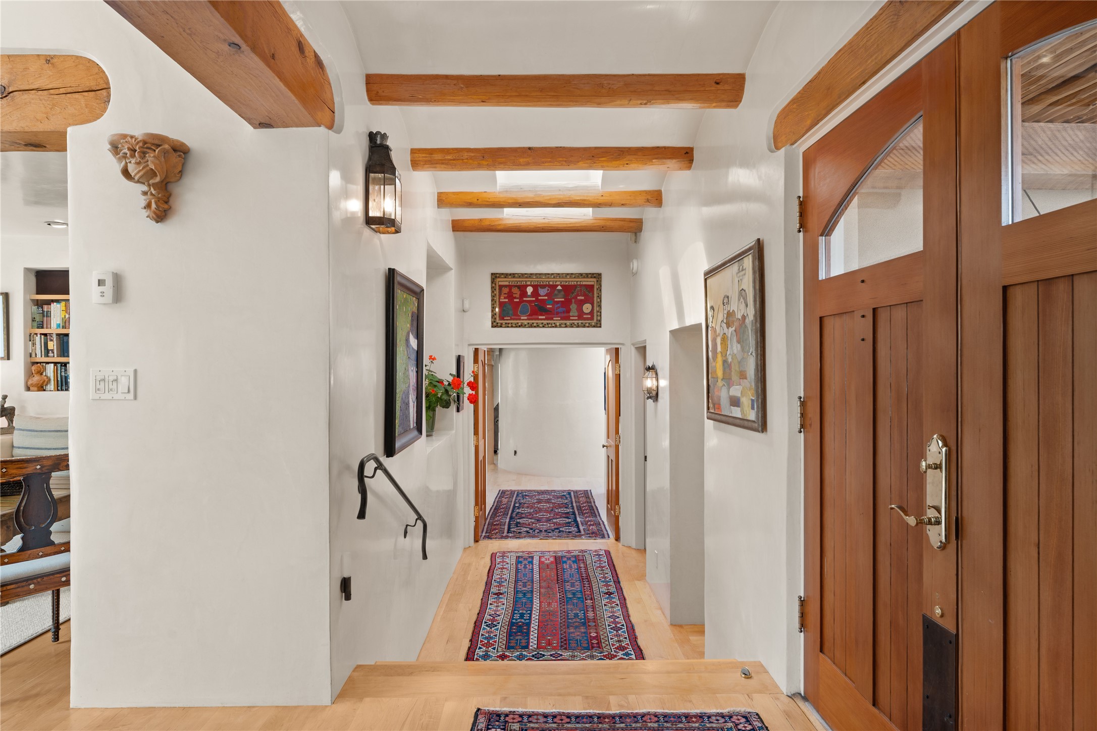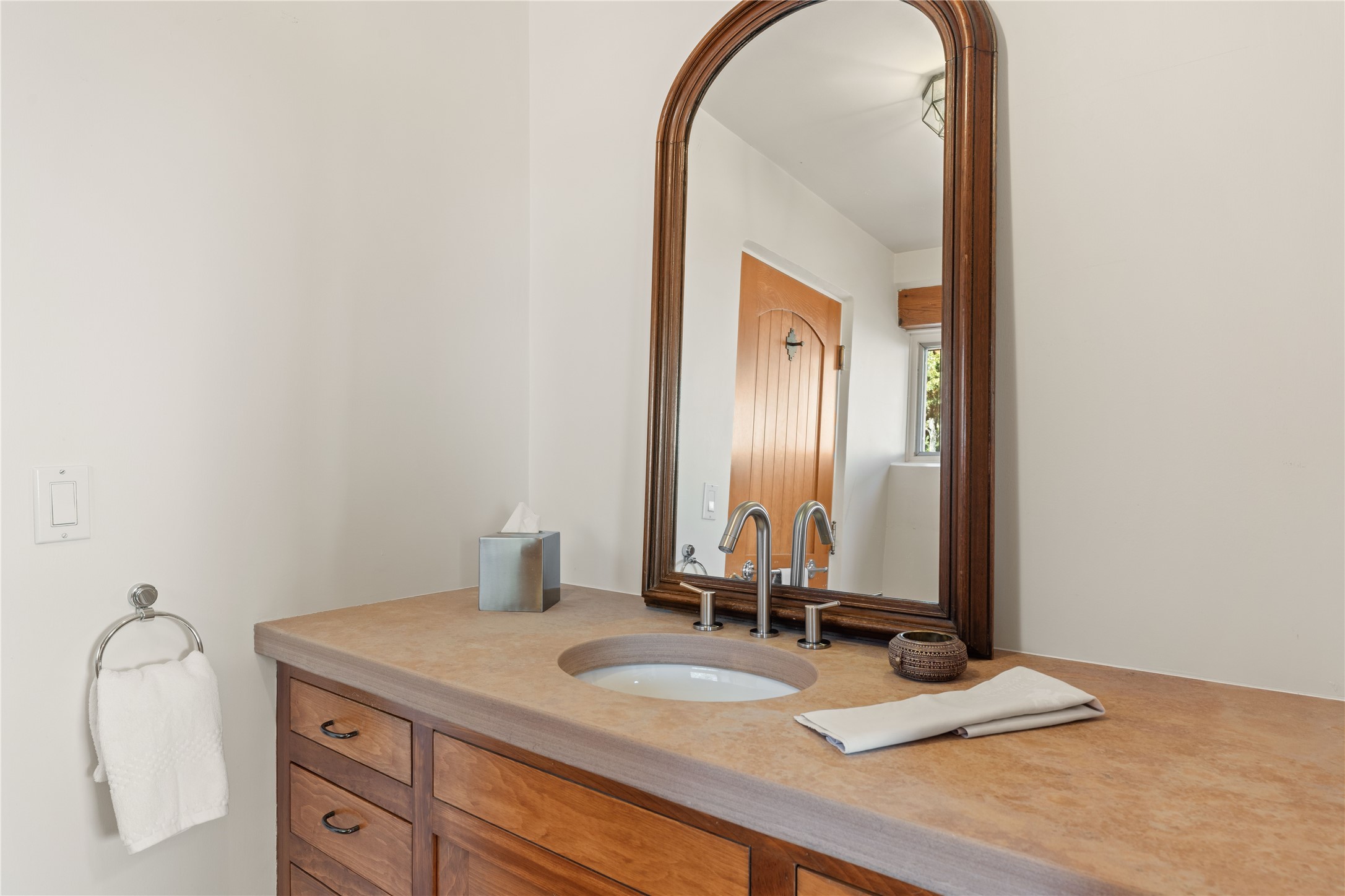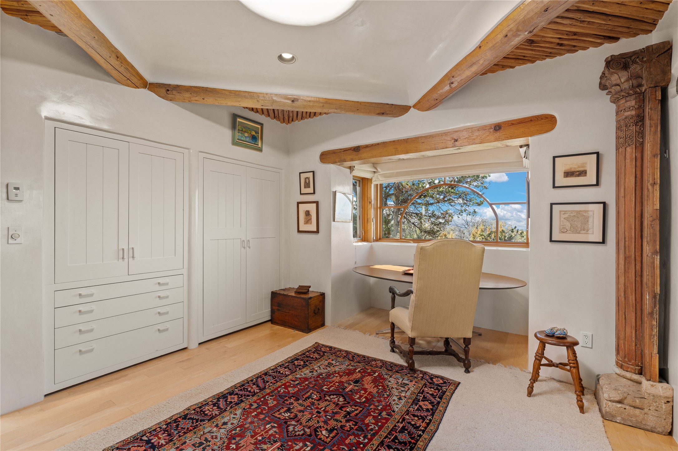 Nestled at the base of Sun and Moon Mountains, this exquisite adobe residence designed by Ken Mackenzie, and its charming casita, offer unparalleled views and masterful craftsmanship. Set amidst dramatic rock outcroppings, the home is accessed via a flagstone staircase surrounded by mature landscaping and a cascading water feature.Inside, curvaceous adobe walls create a seamless flow between distinct living areas. The cozy family room, featuring built-in bookshelves, banco seating, and a wood-burning fireplace, opens to a chef's kitchen with generous storage and ample prep-space. Adjacent to the kitchen, an intimate dining room is elevated above the living area, providing both a sense of architectural interest and breathtaking views of the Jemez Mountains and city lights. Two sets of sliding doors open to a mahogany deck, extending the living space and inviting you to enjoy the airy interplay between interior and exterior spaces.The primary suite offers a tranquil retreat with two bedrooms, one of which enjoys a kiva fireplace and a secluded flagstone patio, while the other can serve as a versatile office, den, or exercise space, with access to a private deck and incredible views. Both bedrooms share a spa-inspired bathroom with a double vanity and soaking tub, as well as a half bath. On the opposite side of the home, two additional bedrooms share a stylish 3/4-bath. Coved ceilings, plaster walls, built-ins and nichos enhance the charm and warmth of the home.An elevated 624-square-foot casita captures stunning views from its large windows and west-facing deck. The light-filled floor plan includes a kitchenette and 3/4-bath. An additional 130-square foot studio can be used for a variety of purposes. The exceptional foothill location provides immediate access to hiking trails and nearby Museum Hill. The property is well-maintained with pride of ownership reflected in the newer roof, stucco and mini-splits for cooling. Sited on 4.7 acres, this property is the perfect blend of peaceful living, stunning design, and unmatched views--truly a one-of-a-kind home.