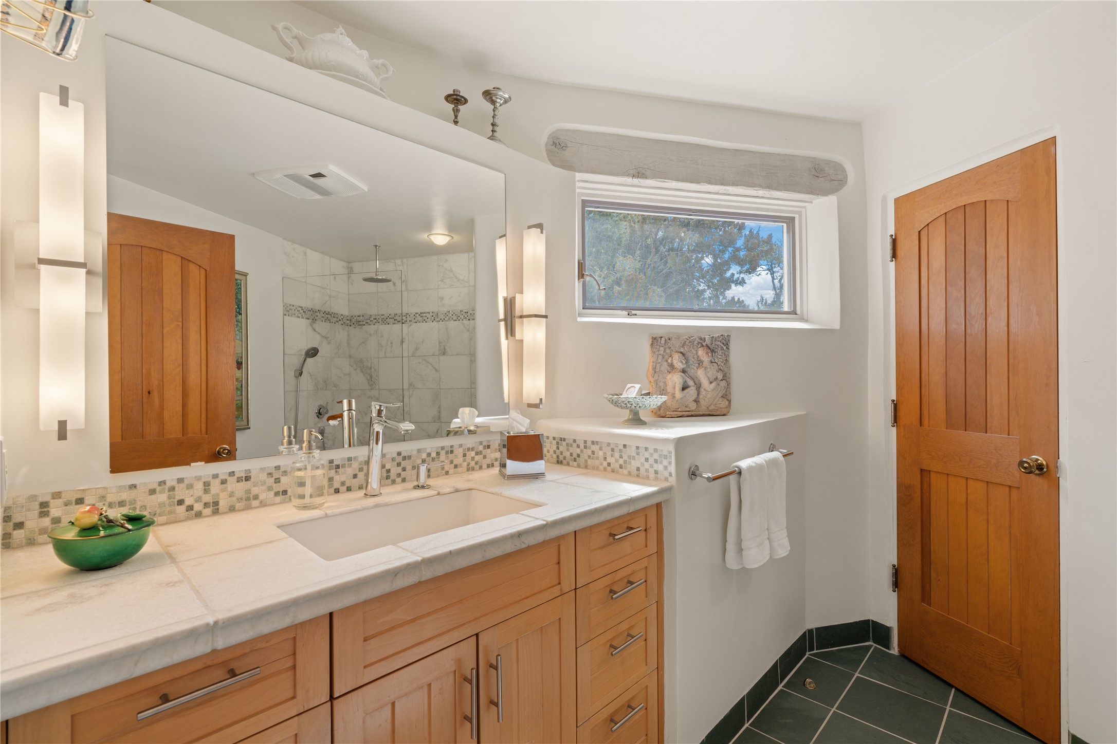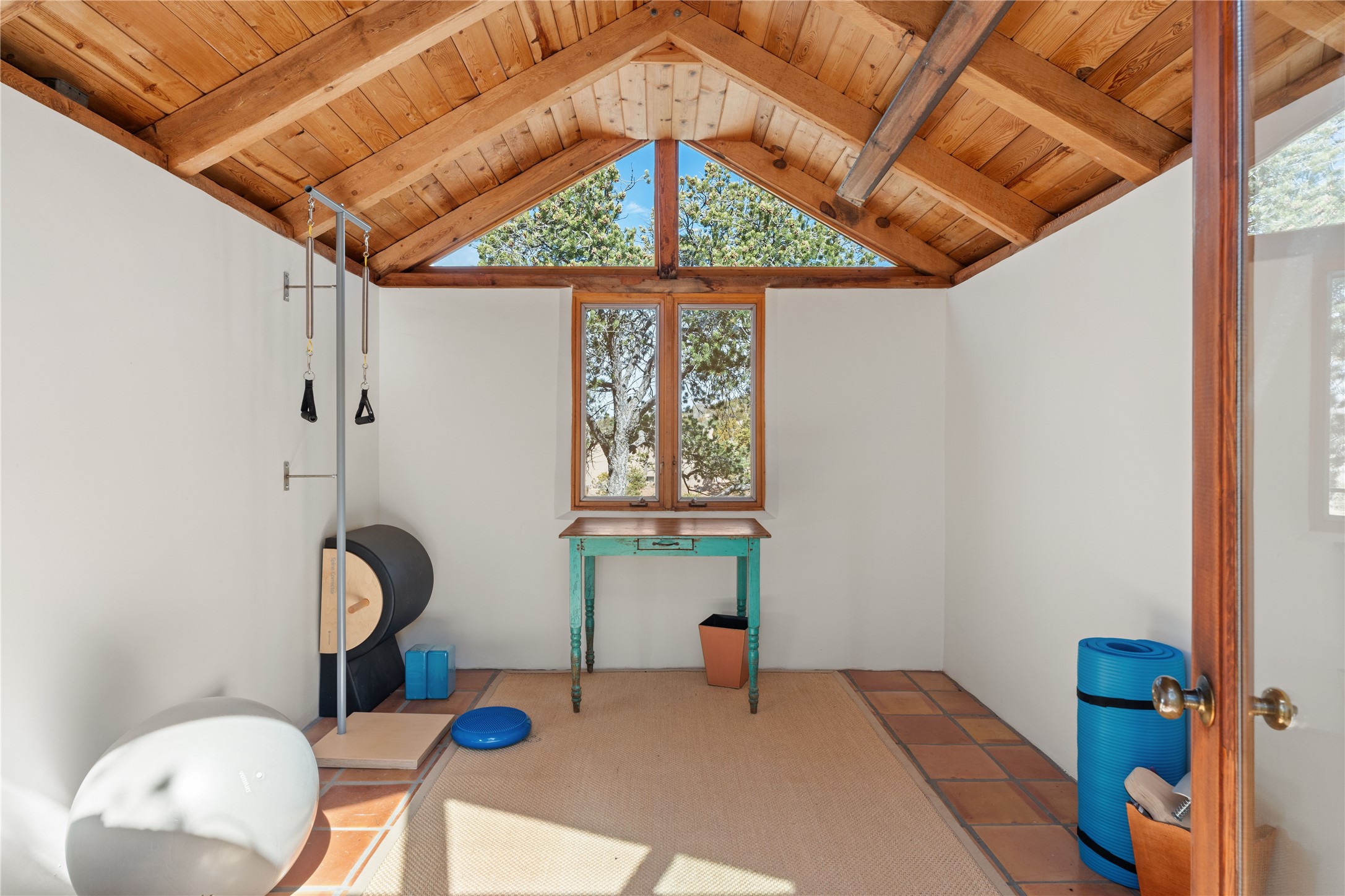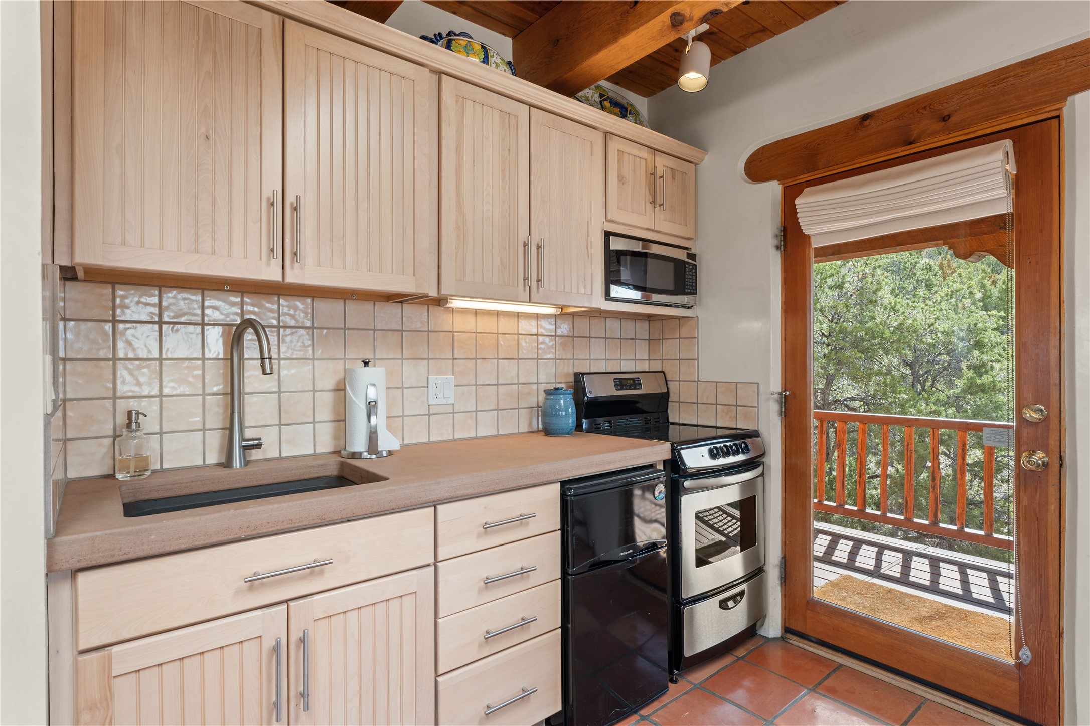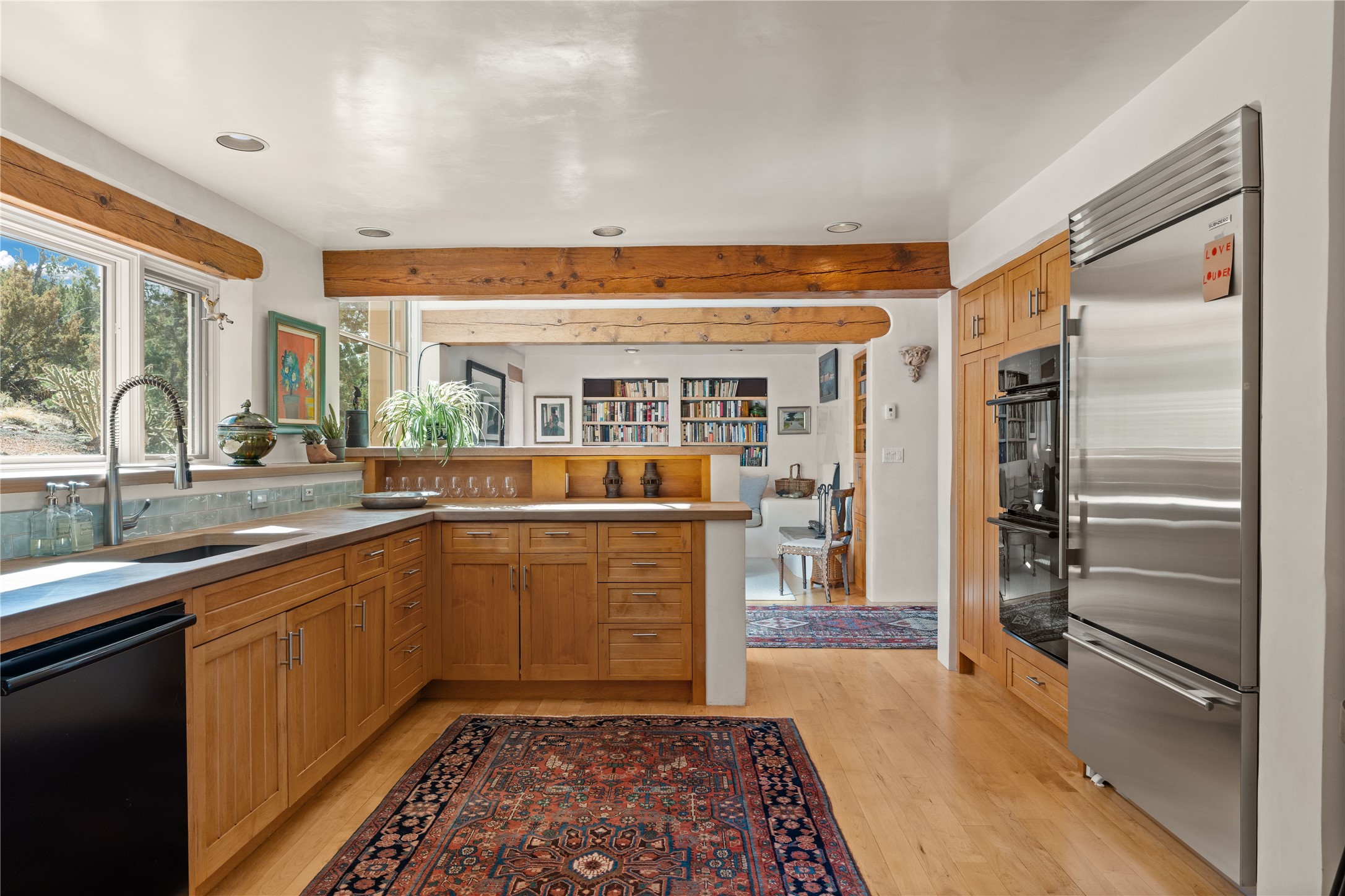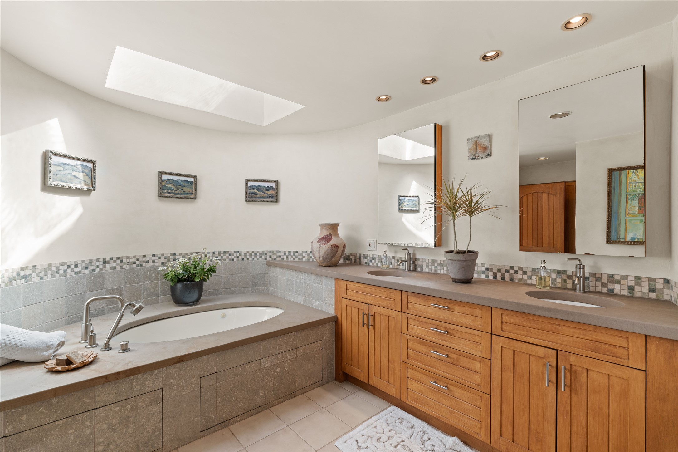 Nestled at the base of Sun and Moon Mountains, this exquisite adobe residence designed by Ken Mackenzie, and its charming casita, offer unparalleled views and masterful craftsmanship. Set amidst dramatic rock outcroppings, the home is accessed via a flagstone staircase surrounded by mature landscaping and a cascading water feature.Inside, curvaceous adobe walls create a seamless flow between distinct living areas. The cozy family room, featuring built-in bookshelves, banco seating, and a wood-burning fireplace, opens to a chef's kitchen with generous storage and ample prep-space. Adjacent to the kitchen, an intimate dining room is elevated above the living area, providing both a sense of architectural interest and breathtaking views of the Jemez Mountains and city lights. Two sets of sliding doors open to a mahogany deck, extending the living space and inviting you to enjoy the airy interplay between interior and exterior spaces.The primary suite offers a tranquil retreat with two bedrooms, one of which enjoys a kiva fireplace and a secluded flagstone patio, while the other can serve as a versatile office, den, or exercise space, with access to a private deck and incredible views. Both bedrooms share a spa-inspired bathroom with a double vanity and soaking tub, as well as a half bath. On the opposite side of the home, two additional bedrooms share a stylish 3/4-bath. Coved ceilings, plaster walls, built-ins and nichos enhance the charm and warmth of the home.An elevated 624-square-foot casita captures stunning views from its large windows and west-facing deck. The light-filled floor plan includes a kitchenette and 3/4-bath. An additional 130-square foot studio can be used for a variety of purposes. The exceptional foothill location provides immediate access to hiking trails and nearby Museum Hill. The property is well-maintained with pride of ownership reflected in the newer roof, stucco and mini-splits for cooling. Sited on 4.7 acres, this property is the perfect blend of peaceful living, stunning design, and unmatched views--truly a one-of-a-kind home.