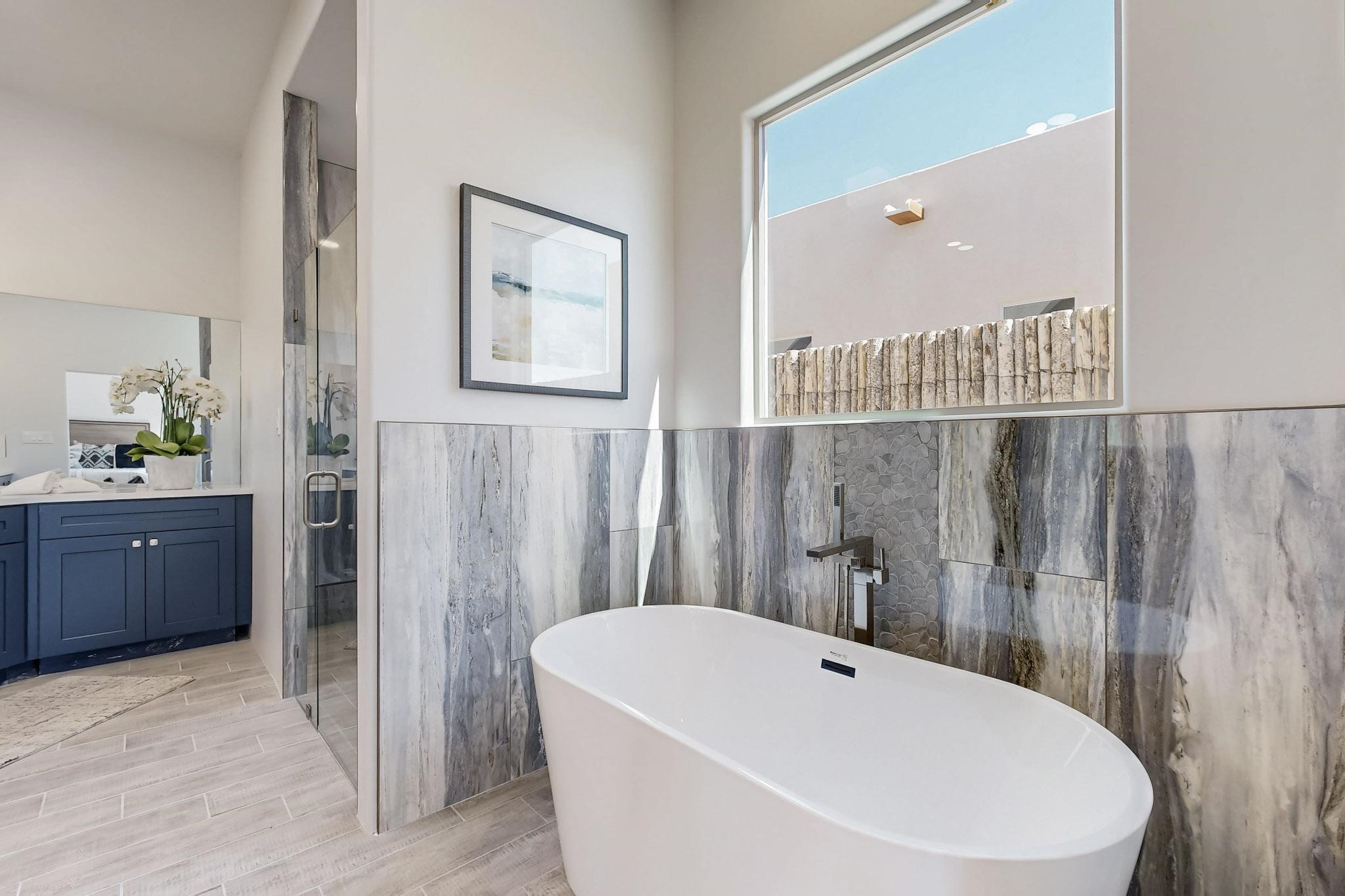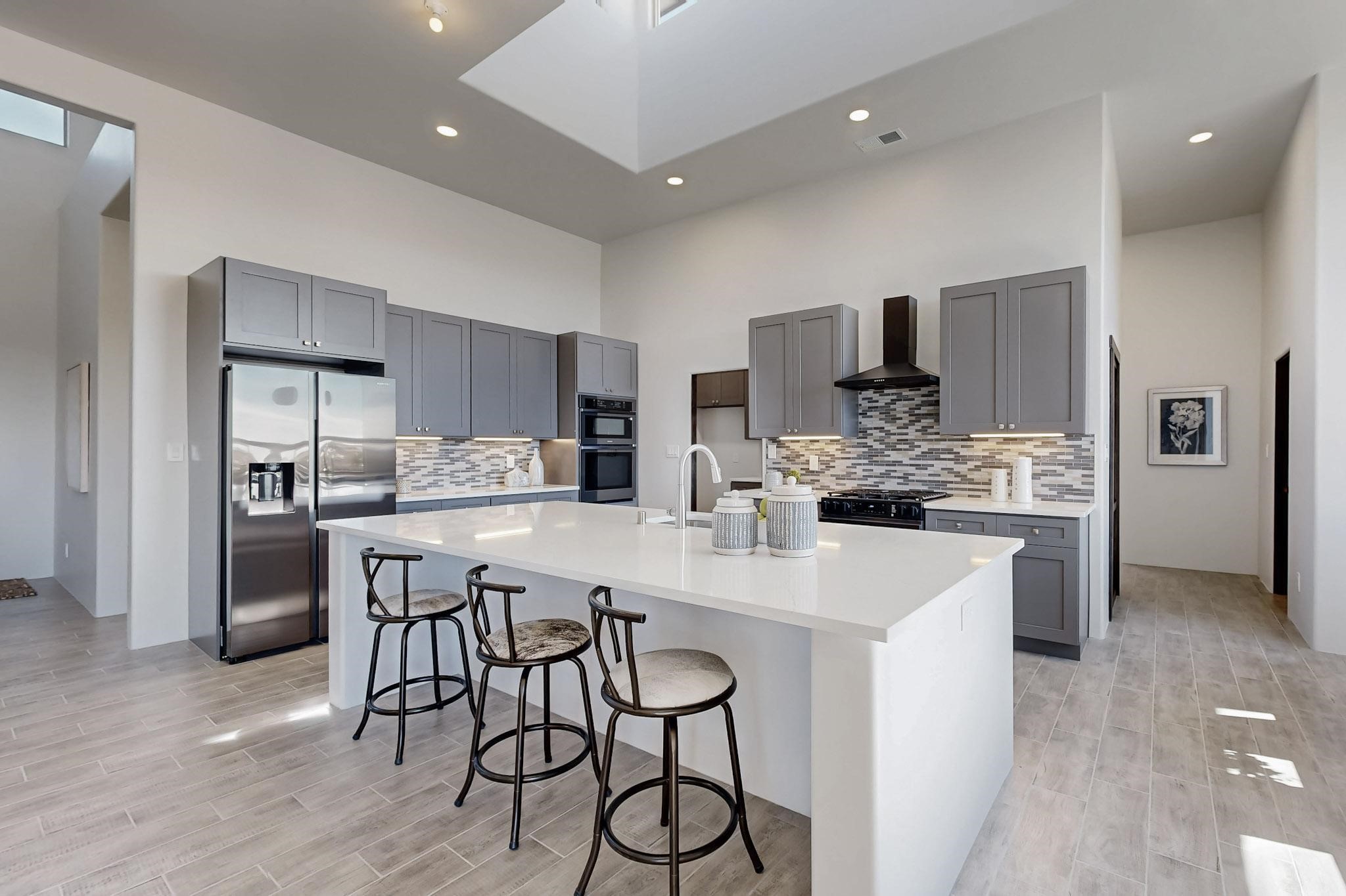 Step into luxury at 28 La Pradera, a 2350 square foot contemporary home designed for comfort, entertaining and breathtaking 180-degree territorial views. A brick-paved covered entry leads to an eight-foot high solid wood door opening into a soaring atrium with clerestory windows. To the right of the entry is a bedroom with a full bath that would be perfect for a home office. To the left is a second bedroom with a walk-in closet. A hall closet provides extra storage. Across is a sliding barn door accessing a large butler's pantry that connects to the kitchen with a swinging door. Open kitchen design with quartz countertops, 17-foot-tall skylight with clerestory windows on all four sides and wired for a chandelier. A powder room has direct access to the rear portal. Also, a secure room for a safe and storage of valuables. The generous owner's suite has wonderful views and double counters and sinks, a free-standing tub, a separate shower with marble and rainfall tile, linen closet, and a 72 sq. ft. walk-in closet. The two-car garage has an epoxied floor and a large room for holiday storage or gift wrapping.