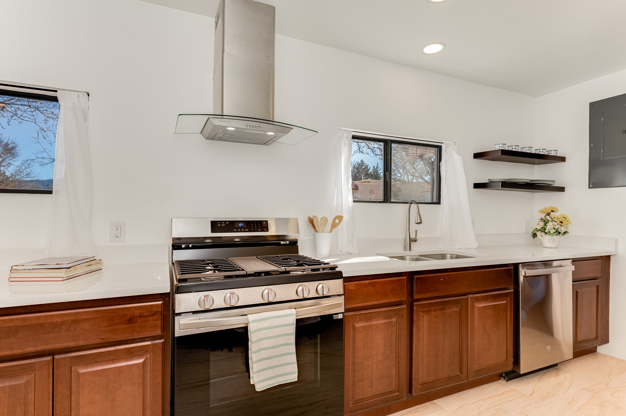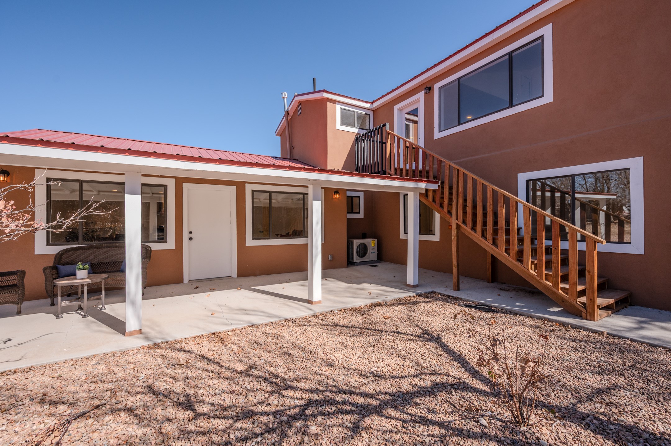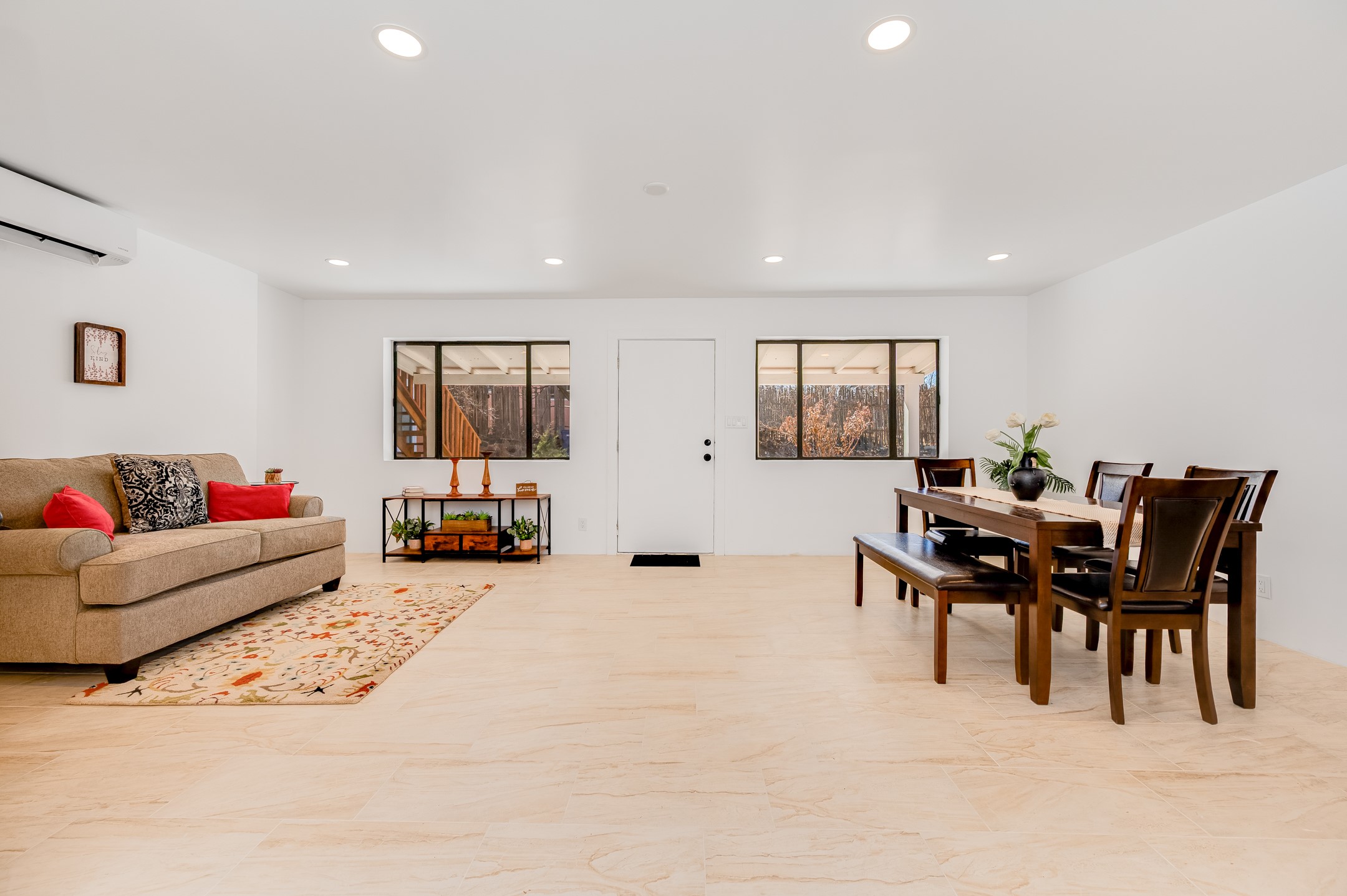 This beautifully renovated 2-level home covers 2,672 square feet of artful design and practicality. Offering an adaptable layout that can be tailored as two or three units, the entire home has been updated with recessed lighting, new kitchens complete with stainless appliances, new bathrooms, and gorgeous tile flooring. With many more features to love, including A/C, kiva fireplace, large balcony, a huge backyard and carport, this stellar property is in a prime location for commuters and ready for move-in! The main home offers two bedrooms on the main level. Upstairs, a spacious and light filled suite with secondary living area also has a separate private entry that can easily double as a light-filled studio or in-law suite, while the attached guest house presents another passive income opportunity. This established neighborhood with no HOA is ideal for commuters, a stones throw from shops, and central to everything Santa Fe has to offer.
