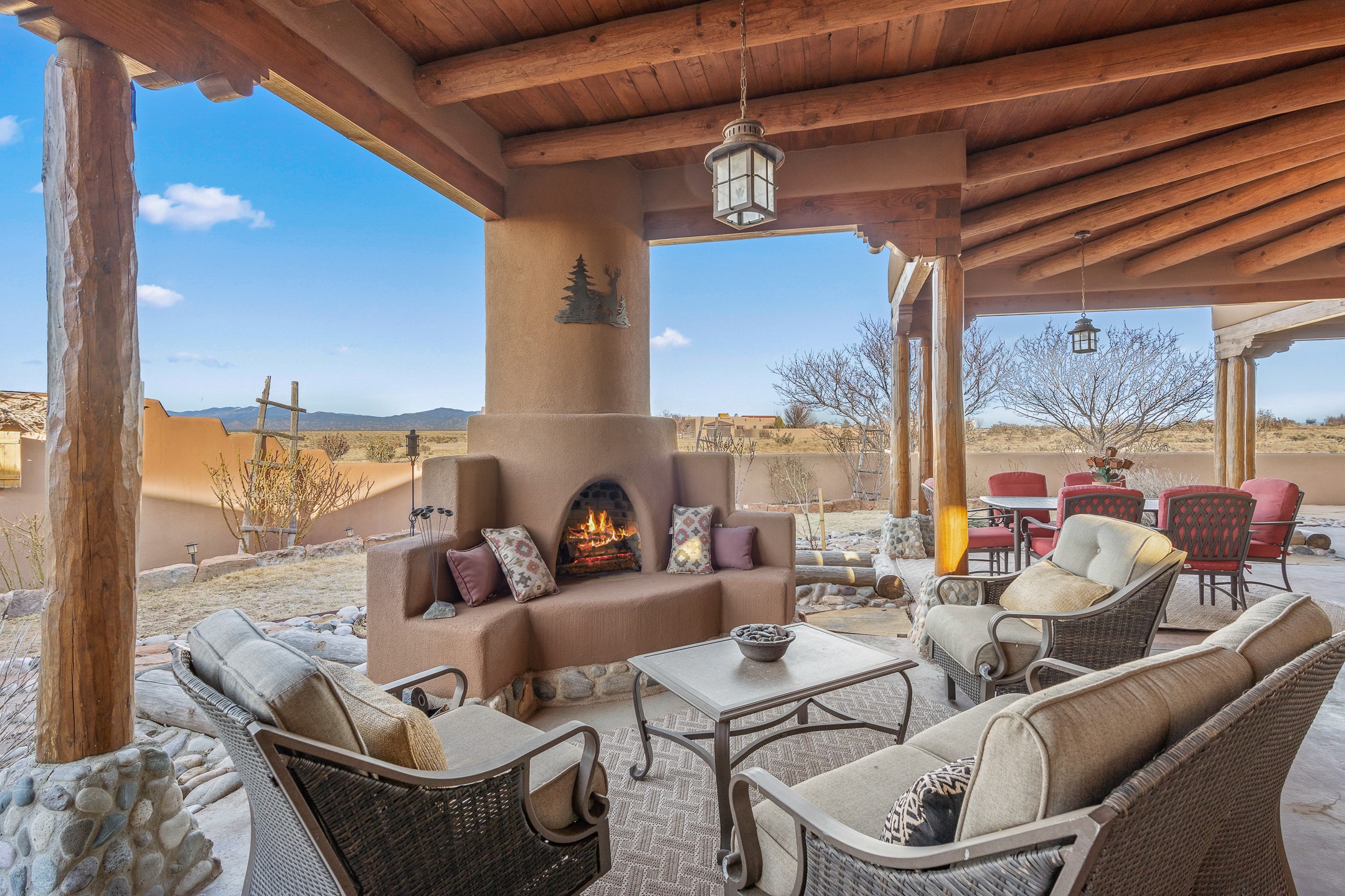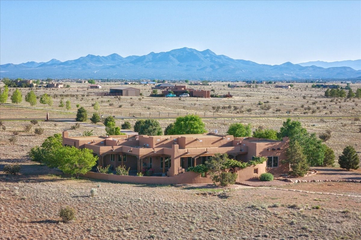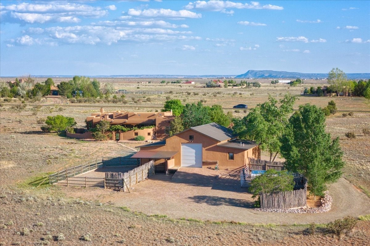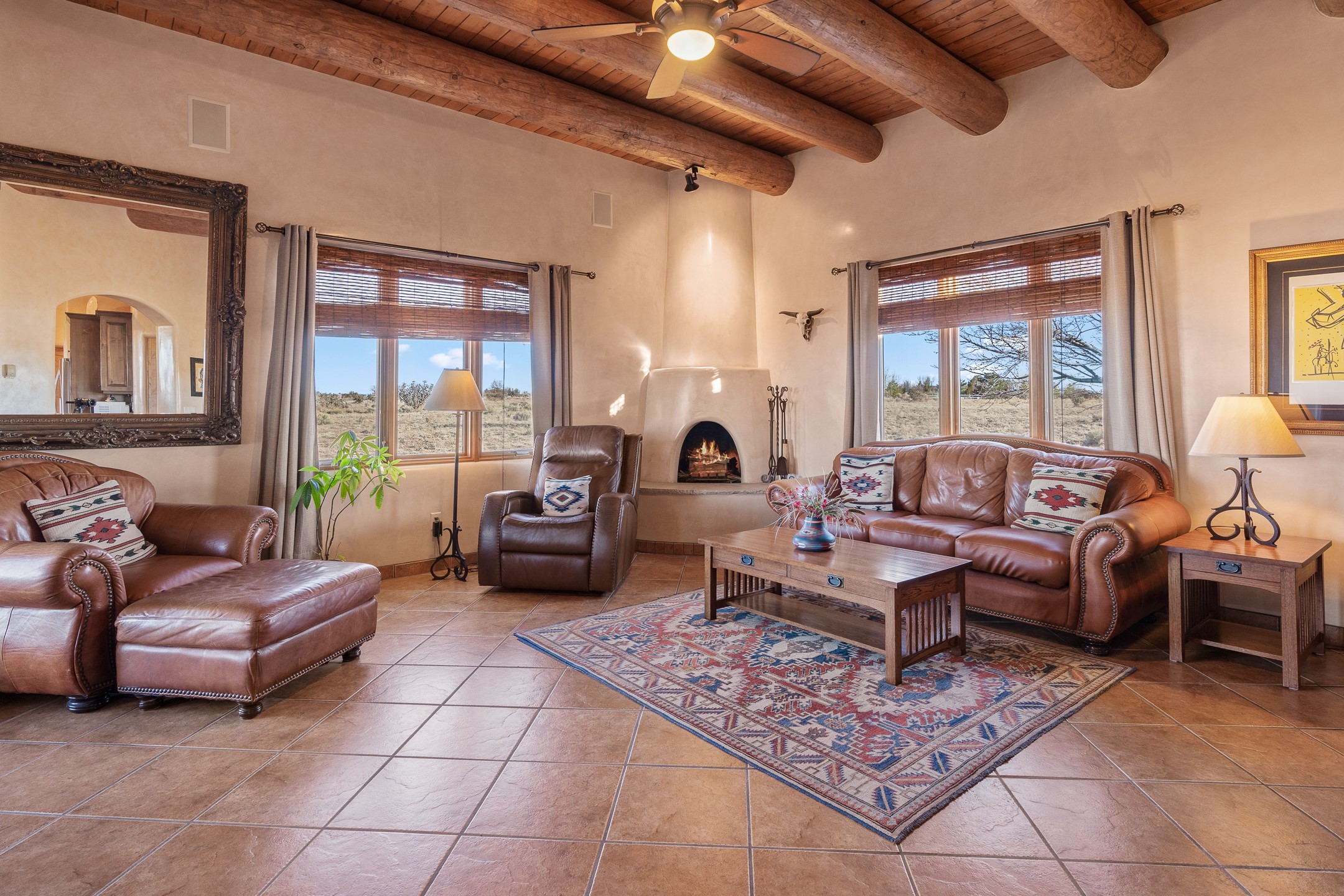 Welcome to the gated community of Rancho San Marcos. This stunning Pueblo-style custom built home sits on 12.51 acres & offers breathtaking 360 views of the Ortiz, Sangre De Cristo Mountains and the Cerrillos Hills. This expansive 2611 sq. ft. single-level residence features 3 bedrooms and 3 bathrooms, Primary Bath has full-size jet tub; two separated living areas; Chef's Kitchen has granite countertops, island, custom-built cabinets; Separate Dining Room; custom & recessed lighting; Hand-troweled diamond plaster finish walls with lighted nichos; 4 Fireplaces, Kiva, Shepard style; Pella Windows at high and low walls; Oversized vigas; Ceramic tile and colored concrete floors; In floor radiant heat; Outside living includes large portal with Spanish corbels, latillas and colored cement floors, large Kiva fireplace; flagstone and river-rock flower-lined patio, stucco privacy wall with archways, wall windows, draped in grapevines. Native Xeriscape grounds are drought-resistant plantings, mature fruit trees and pion trees fed by an underground automatic drip irrigation system.Heated 3-car garage, finished walls; wash sink area.This remarkable property boasts a 354 sq. ft. detached studio, complete with an open bedroom, living area, and a full bath. It is an ideal space for guests seeking a peaceful getaway. Additionally, the property boasts an impressive 1,824 sq. ft. horse barn/outbuilding.This property is ideal for equestrian enthusiasts and those wanting to be close to Santa Fe's vibrant culture and entertainment. Just 30 minutes from the Santa Fe Plaza, museums, and galleries. It's a 55 minute drive to Ski either Santa Fe or Sandia Peak. 10 minutes to I-25 and the Rail Runner. Don't miss this opportunity!