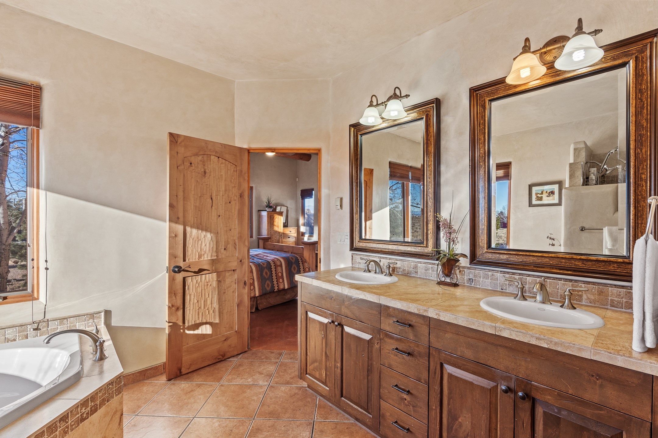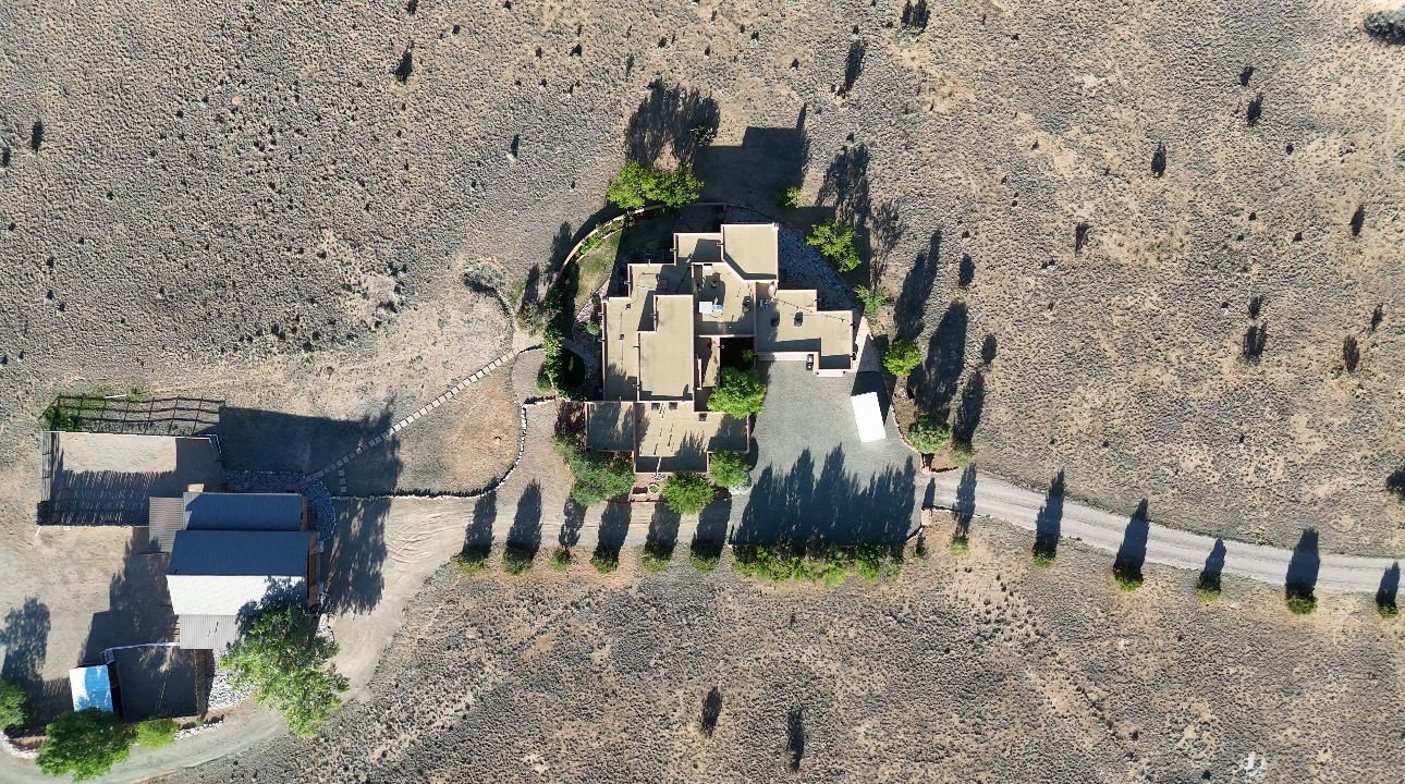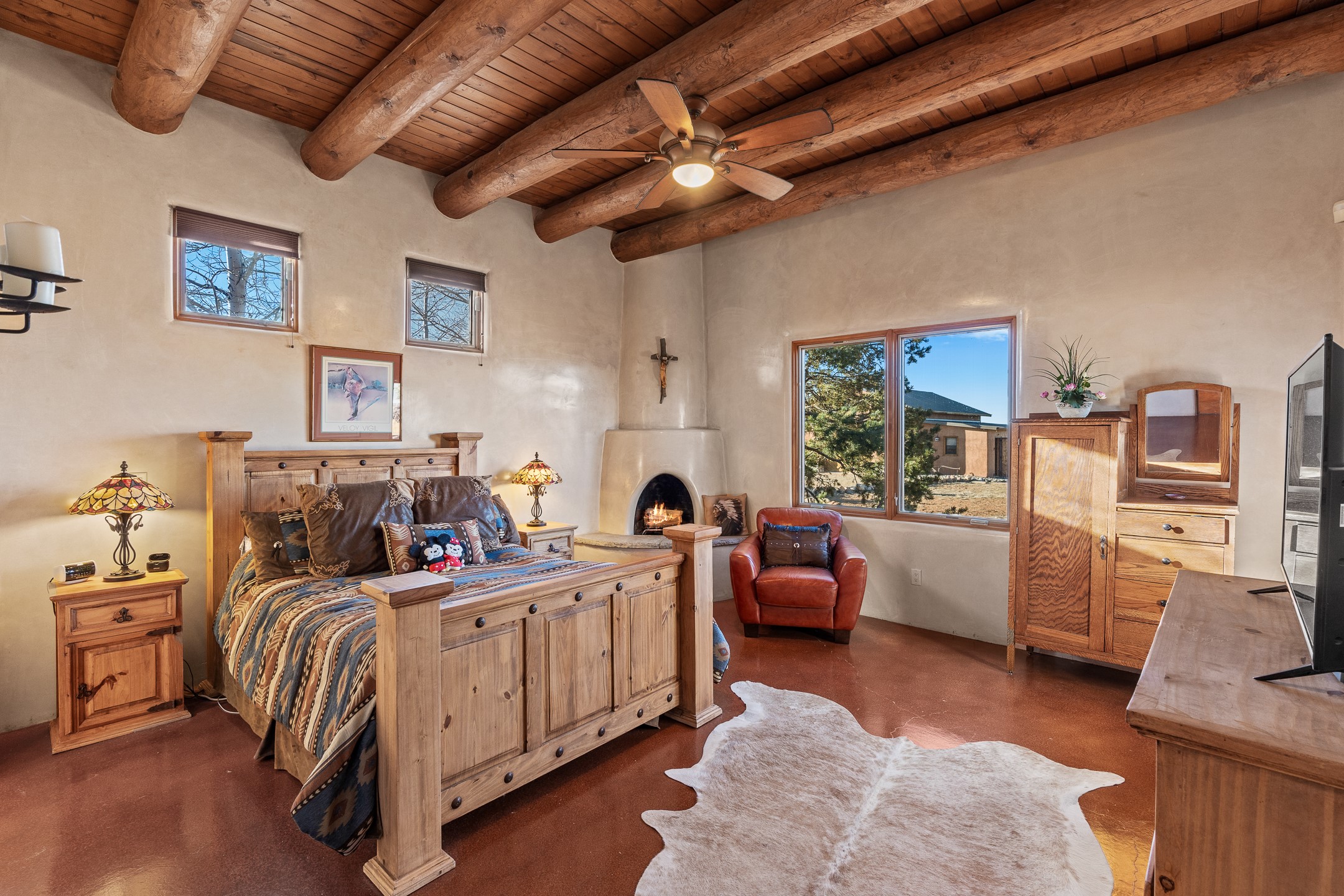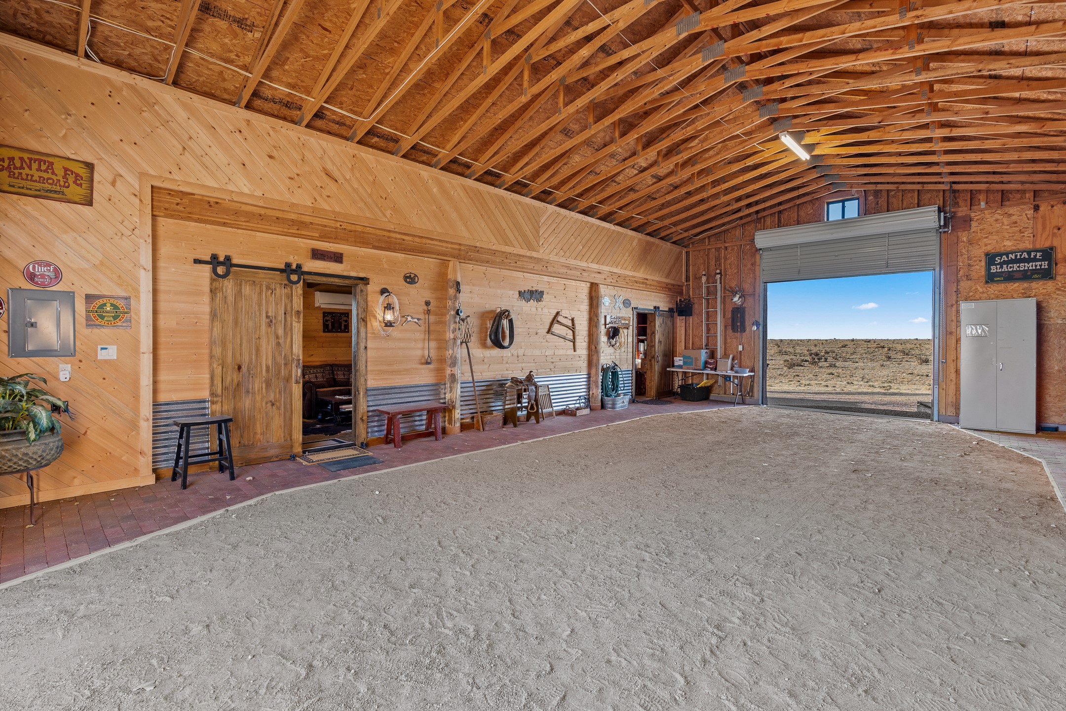 Welcome to the gated community of Rancho San Marcos. This stunning Pueblo-style custom built home sits on 12.51 acres & offers breathtaking 360 views of the Ortiz, Sangre De Cristo Mountains and the Cerrillos Hills. This expansive 2611 sq. ft. single-level residence features 3 bedrooms and 3 bathrooms, Primary Bath has full-size jet tub; two separated living areas; Chef's Kitchen has granite countertops, island, custom-built cabinets; Separate Dining Room; custom & recessed lighting; Hand-troweled diamond plaster finish walls with lighted nichos; 4 Fireplaces, Kiva, Shepard style; Pella Windows at high and low walls; Oversized vigas; Ceramic tile and colored concrete floors; In floor radiant heat; Outside living includes large portal with Spanish corbels, latillas and colored cement floors, large Kiva fireplace; flagstone and river-rock flower-lined patio, stucco privacy wall with archways, wall windows, draped in grapevines. Native Xeriscape grounds are drought-resistant plantings, mature fruit trees and pion trees fed by an underground automatic drip irrigation system.Heated 3-car garage, finished walls; wash sink area.This remarkable property boasts a 354 sq. ft. detached studio, complete with an open bedroom, living area, and a full bath. It is an ideal space for guests seeking a peaceful getaway. Additionally, the property boasts an impressive 1,824 sq. ft. horse barn/outbuilding.This property is ideal for equestrian enthusiasts and those wanting to be close to Santa Fe's vibrant culture and entertainment. Just 30 minutes from the Santa Fe Plaza, museums, and galleries. It's a 55 minute drive to Ski either Santa Fe or Sandia Peak. 10 minutes to I-25 and the Rail Runner. Don't miss this opportunity!