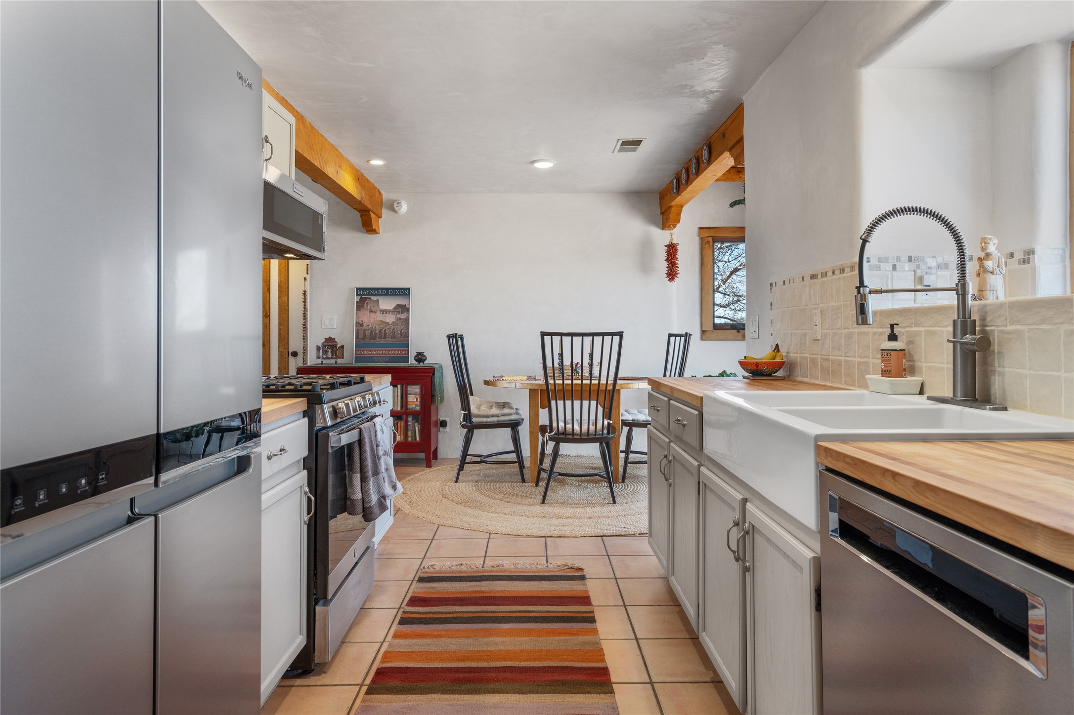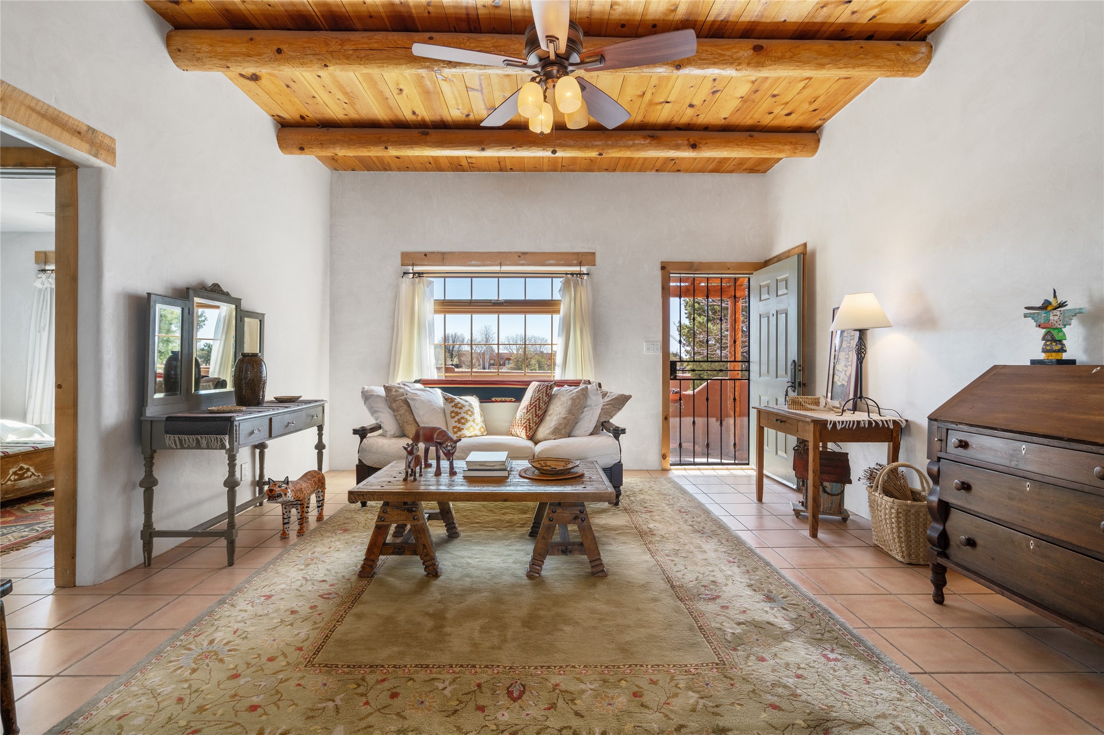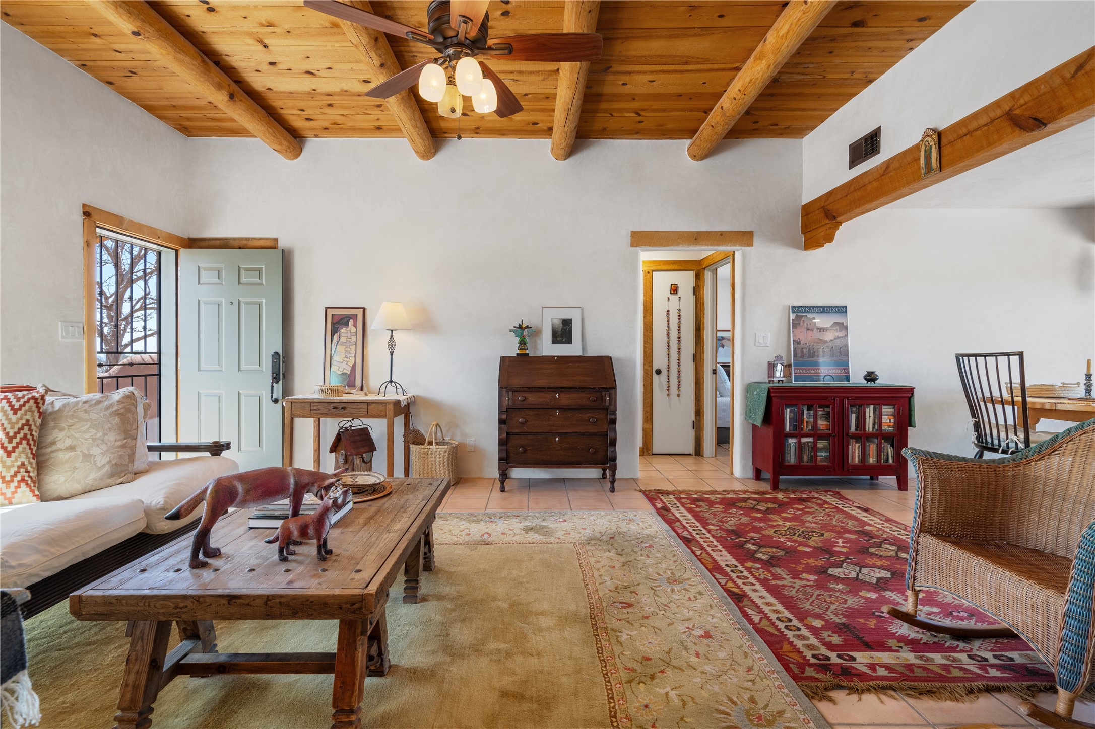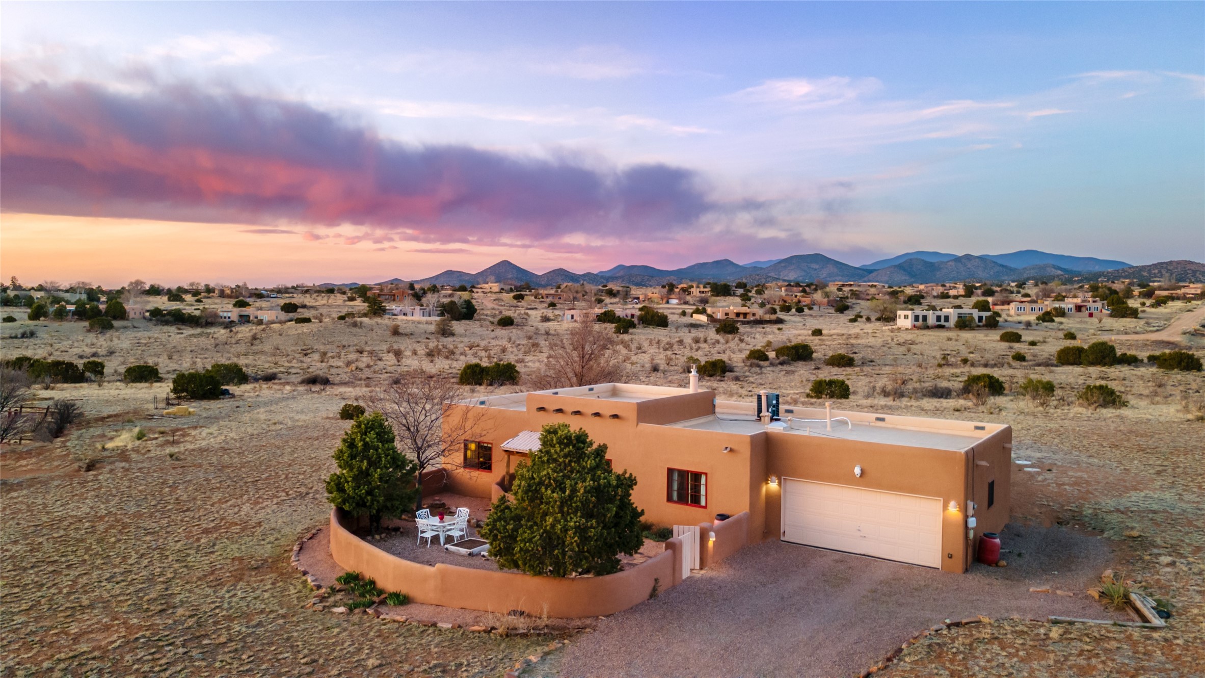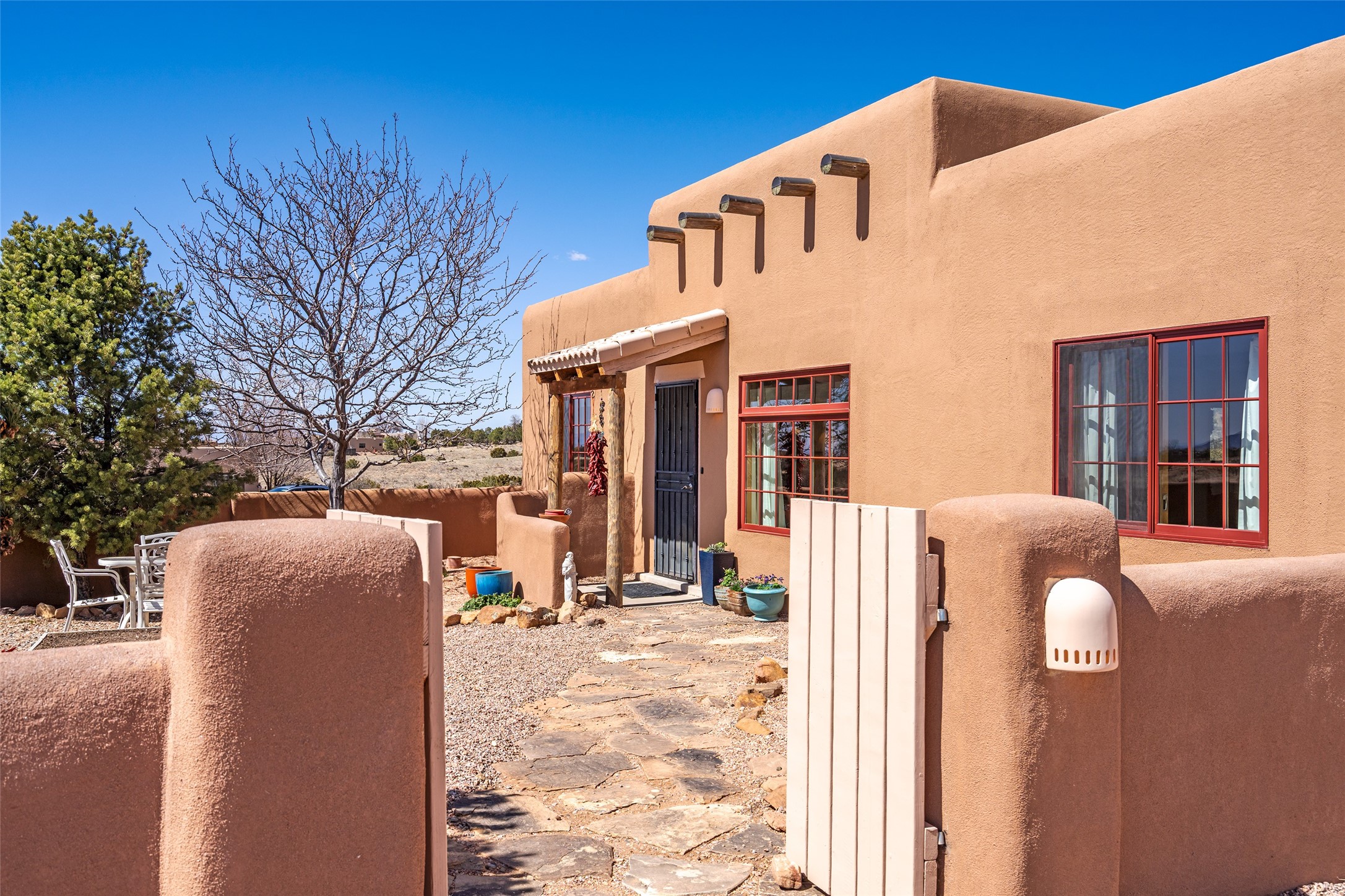 This unique jewel box home at 11 Bosque Loop offers serenity, natural beauty, abundant wildlife, and convenience in one of Santa Fe's most desirable locations. Sited on 1.24 acres on an arroyo green space, the house has been lovingly renovated with design, character, and quality in mind: natural materials and finishes, and hand-crafted traditional features such as high ceiling vigas, door and window lintels, rough sawn beams, corbels, Spanish tile, and diamond plaster walls that reflect abundant sunlight.The split floor plan offers an open living and dining area with views of the Sangre de Christo mountains. The primary suite is separated from the two guest bedrooms. Enjoy year-round comfort from the passive solar siting with forced air heating and air conditioning.The airy kitchen and both full bathrooms have been fully renovated with new Spanish tile, fixtures, and appliances.Step outside and savor the big skies, abundant birdsong, and vibrant landscape. A walled courtyard contains raised garden beds, trees, and plenty of room for your flowering pots. Coyote fencing offers privacy in the backyard.Eldorado community has many amenities. Extensive hike/bike trails, access to the Santa Fe Rail Trail, nearby shopping and service complexes, a gym and day care center, hardware store, cafes and restaurants, and a county library are all within a 5-minute drive.With its gorgeous setting and thoughtful renovation, this turn-key home invites you to experience the best of Santa Fe's relaxing lifestyle, full of beauty and tranquility. Schedule a showing today!