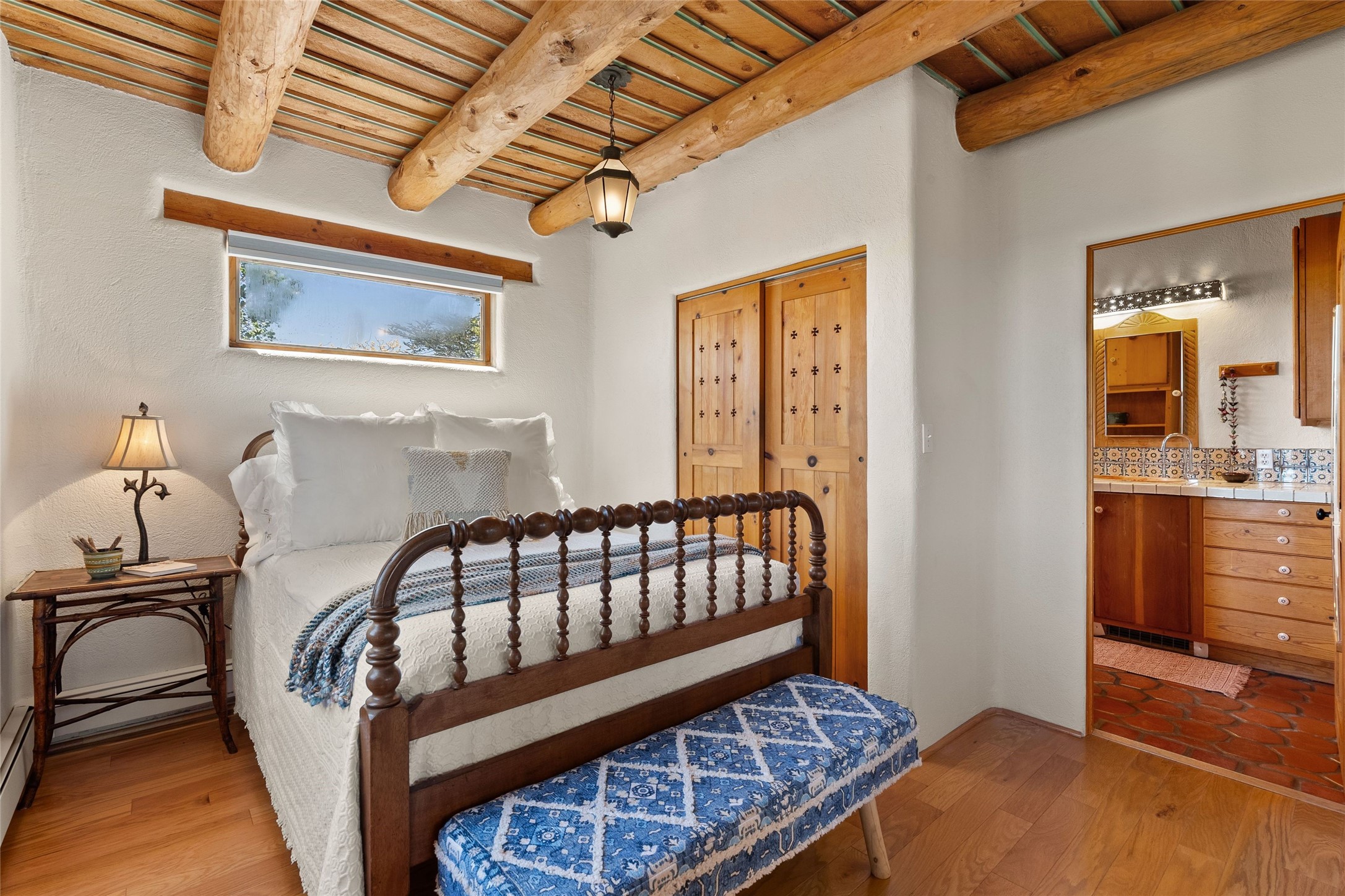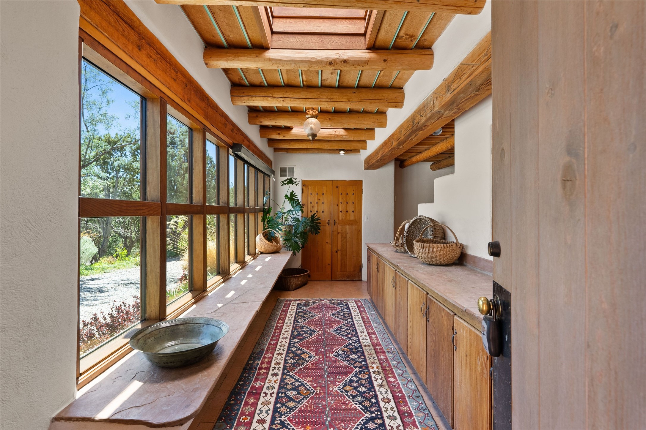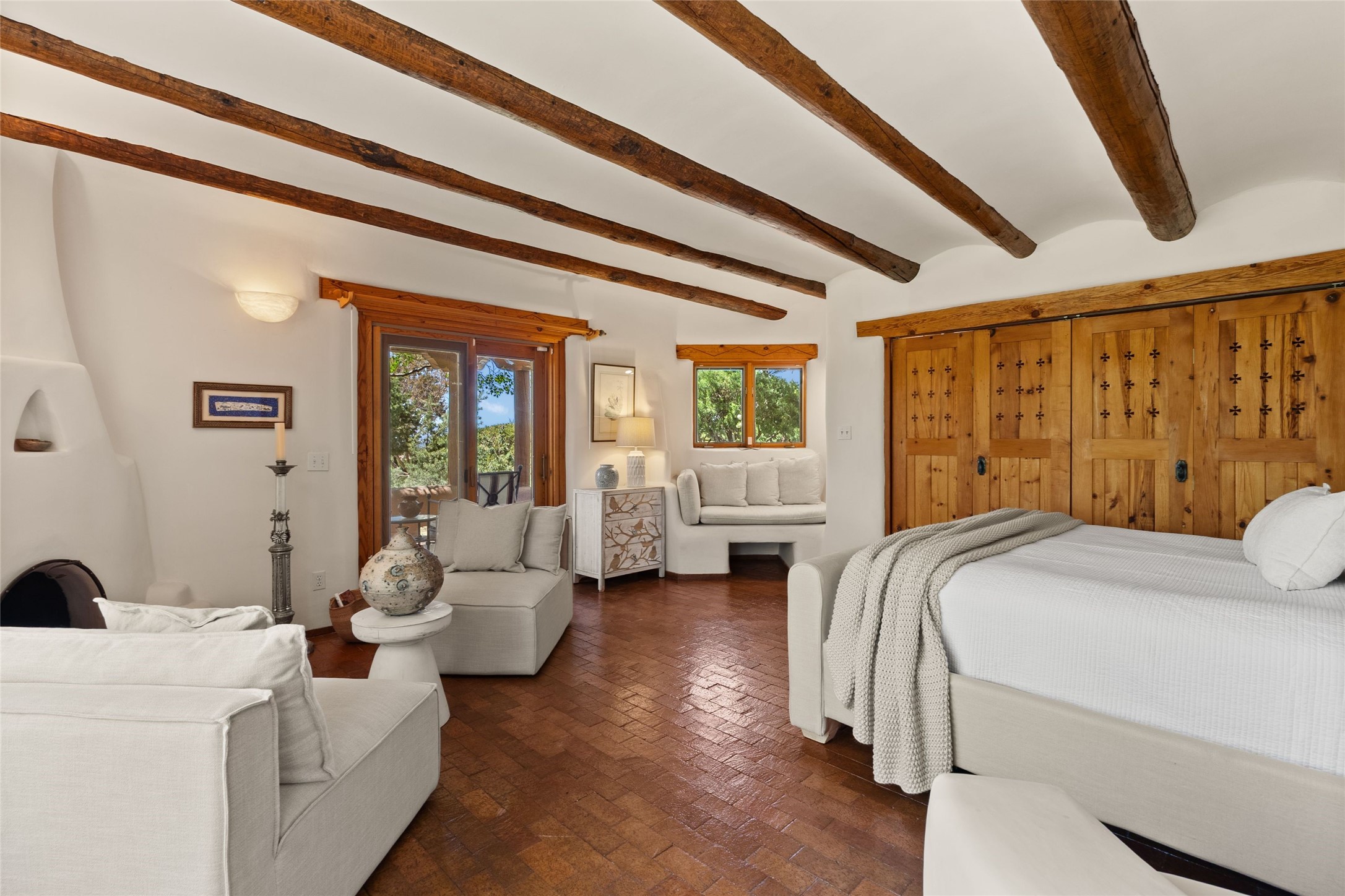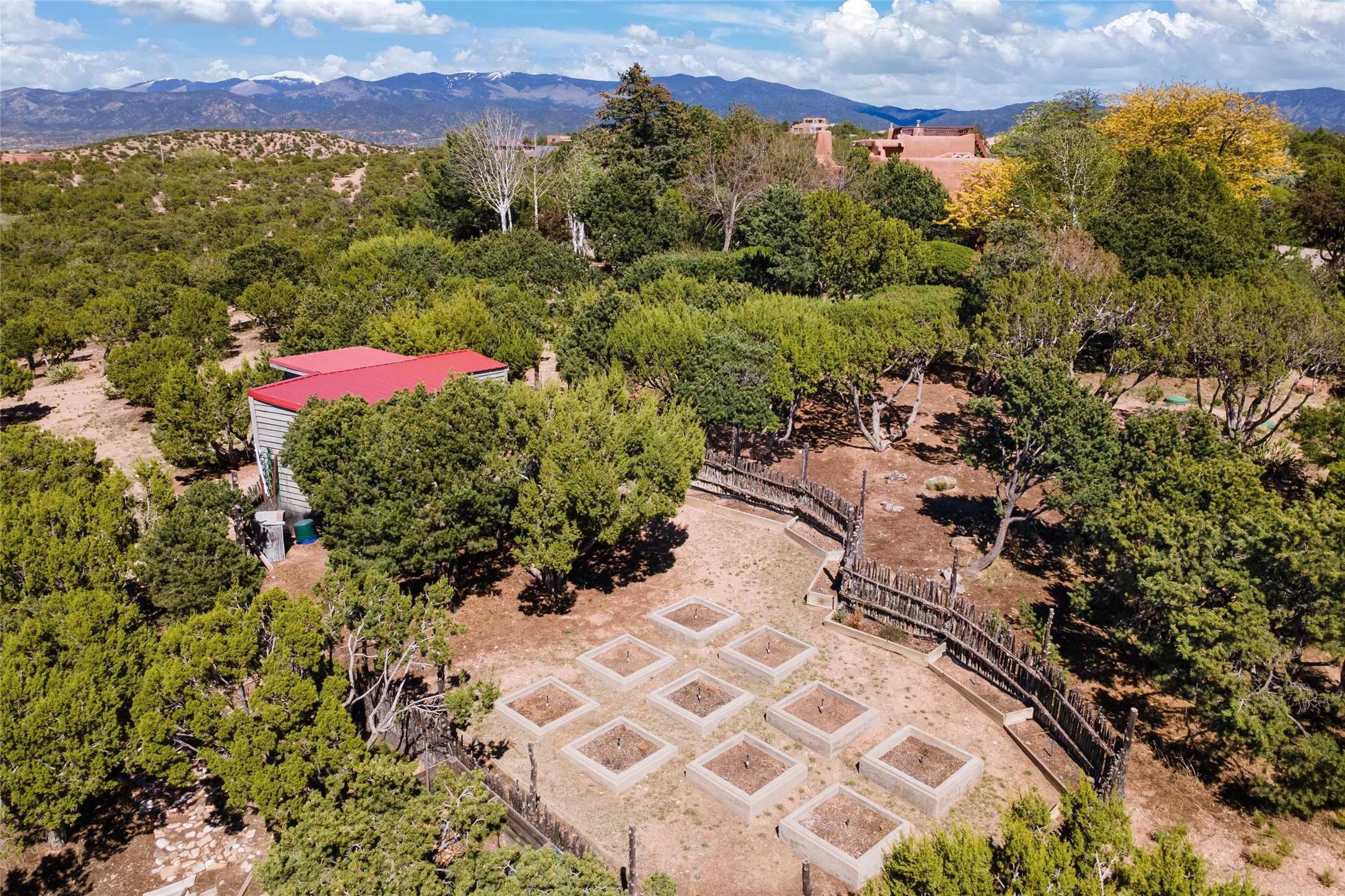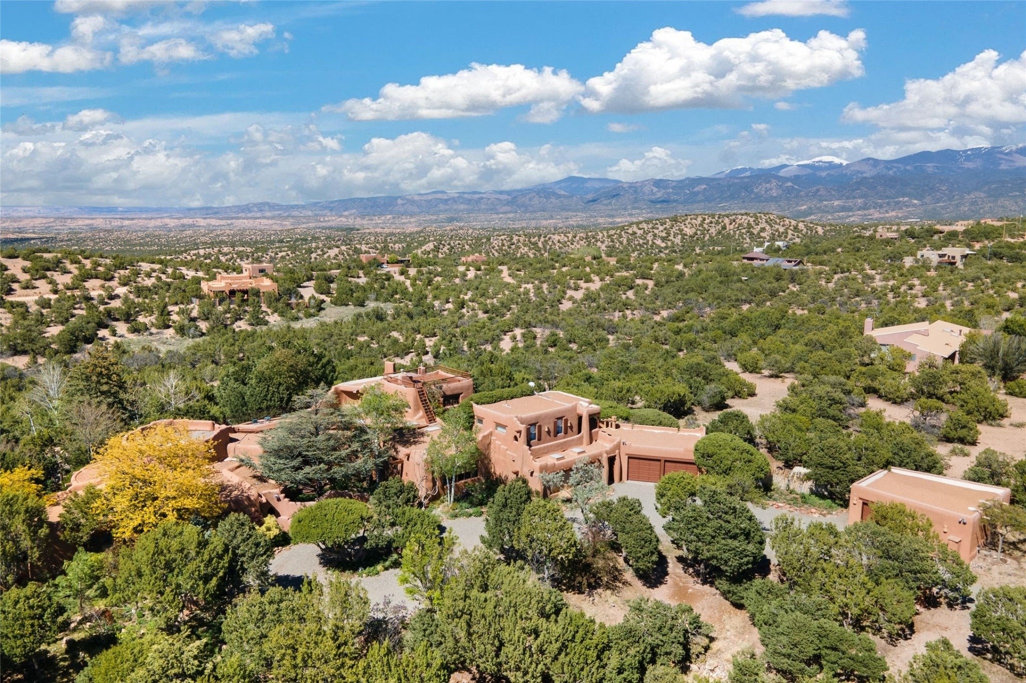 Perched in serene seclusion, this extraordinary estate embodies timeless New Mexico charm, offering breathtaking panoramic views from expansive rooftop decks and refined indoor-outdoor living. A lush courtyard leads into the heart of the home where artisan craftsmanship meets authentic Southwestern style. Curving adobe walls, Saltillo tile floors, carved wooden doors and kiva fireplaces echo throughout. The circular living room features a tiered beamed ceiling, kiva fireplace and intimate west-facing portal. The elegant dining room opens onto the courtyard creating harmony with nature. The kitchen flows to a covered portal with a built-in grill, cabinetry, dual sinks and ample seating--ideal for entertaining. A flagstone stairway leads to a luminous office with built-ins, powder room and rooftop deck. With stunning views of Sangre de Cristo sunrises and Jemez sunsets, this elevated open-air living space includes a kiva fireplace, bancos and a "crow's nest" retreat. The expansive primary suite offers a fireplace-side sitting area, access to a private garden with heated wading pool and outdoor shower and a spa bath with double vanity, soaking tub, steam shower and makeup station. Nearby flex rooms suit a gym, office or library. Two additional bedrooms--one with kiva fireplace and portal--share a beautifully appointed bath. A charming elevated casita includes a kitchen, full bath and mountain views. Meandering pathways wind through curated gardens, a koi pond, fenced garden with raised beds and potting shed, with many portals and patios. A 2-car garage with built-in storage and a separate third garage with a versatile studio and work sink round out the property. This exceptional estate is more than a home--it's a masterpiece of Southwestern living where art, nature and architecture converge in soulful, inspiring harmony.