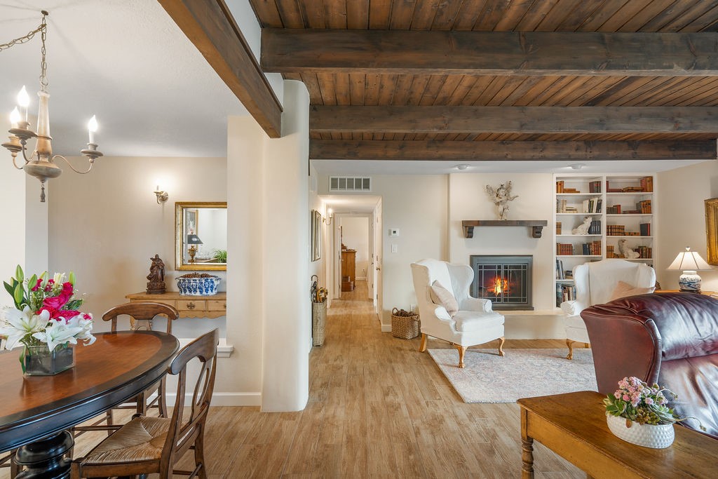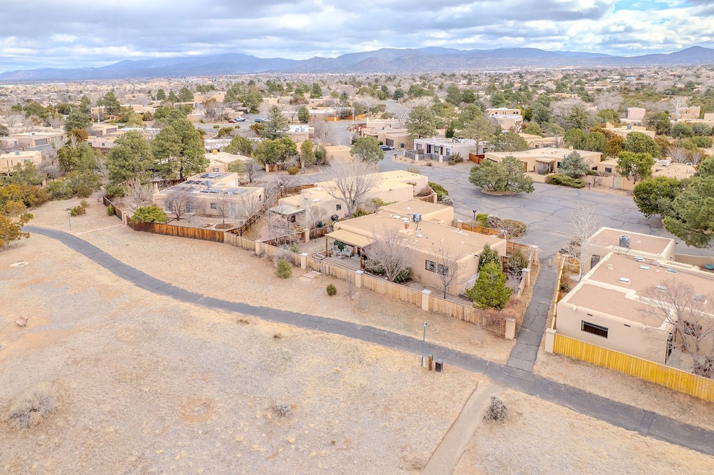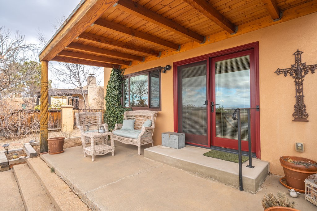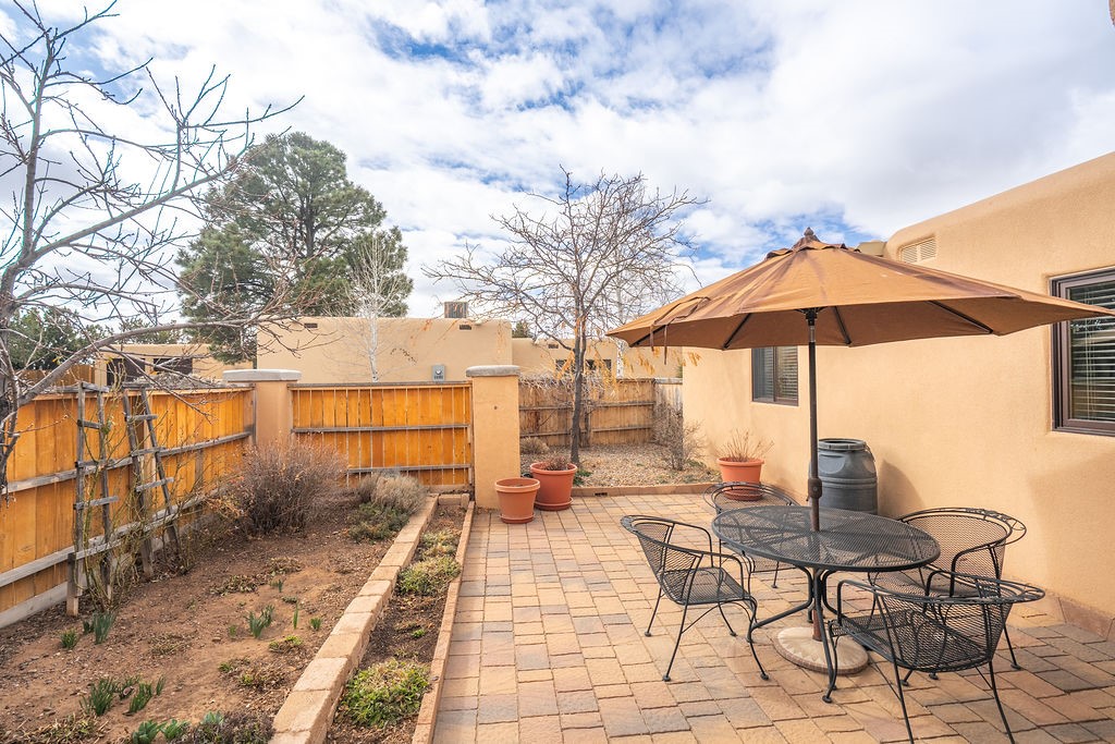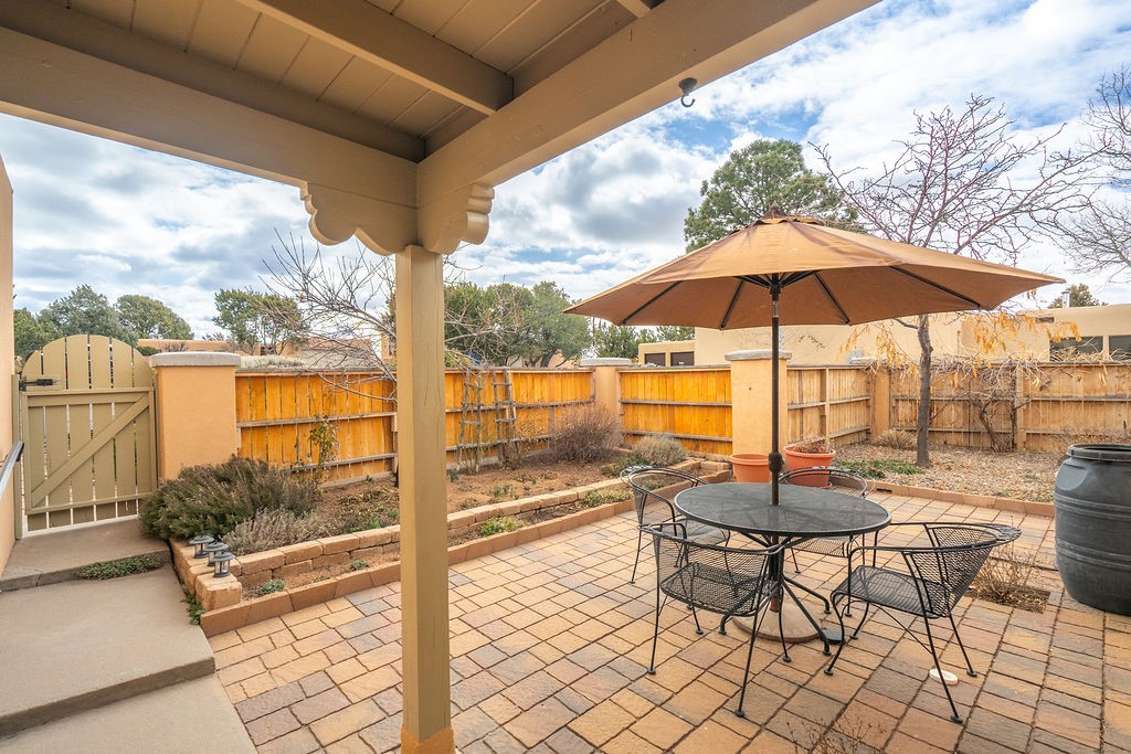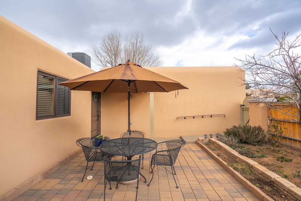 Nestled in a serene and private setting, this beautifully updated 1,632 sq. ft. home offers comfort, style, and breathtaking views of the Jemez Mountains. Featuring three bedrooms and two remodeled bathrooms, this home is designed for both relaxation and functionality. Step inside to discover updated tile floors throughout and an inviting living room with a wood-burning fireplace, built-in bookshelves, and French doors leading to a charming covered portal and landscaped backyard. The formal dining room, illuminated by two skylights, provides the perfect space for gatherings, while the renovated kitchen boasts newer appliances, a gas stove, and a pantry with pull-out shelves. The primary suite is a peaceful retreat with a walk-in closet and mountain views, while the third bedroom is a versatile space, complete with a built-in Murphy bed and office built-ins. Enjoy year-round comfort with forced air heating and refrigerated AC.Outdoor enthusiasts will love the generous front courtyard patio, perfect for lazy Summer breakfasts, and the walking path surrounding the property, leading to two raised garden beds--ideal for growing fresh produce or flowers. With community garden views and a quiet, peaceful atmosphere, this home is a rare gem waiting to be yours! TPO new roof with 10 year warranty has been ordered. Radon mitigation is being done on 4/3/25. Park Plazas is a unique and beautiful neighborhood, close to everything in Santa Fe, with miles of walking trails, a community garden, tennis courts, an off-leash dog park, and many other amenities, this neighborhood is one of the best values in Santa Fe.