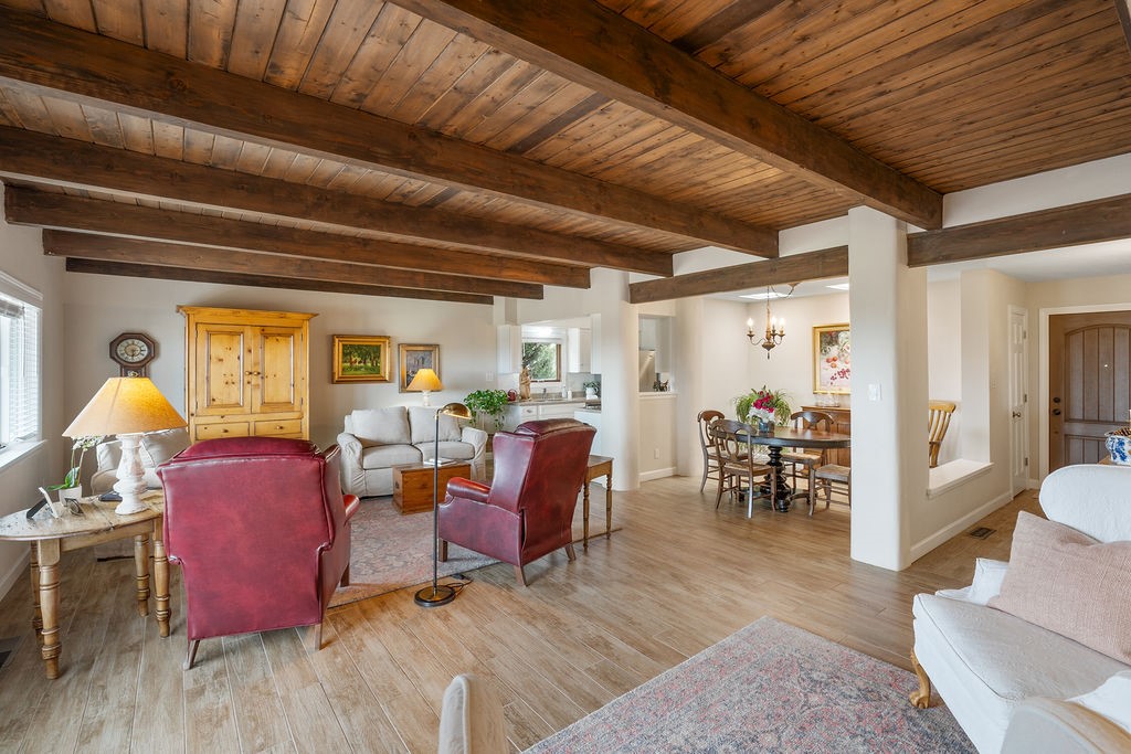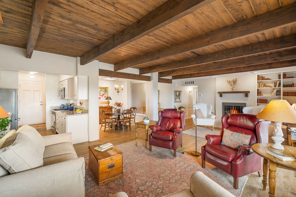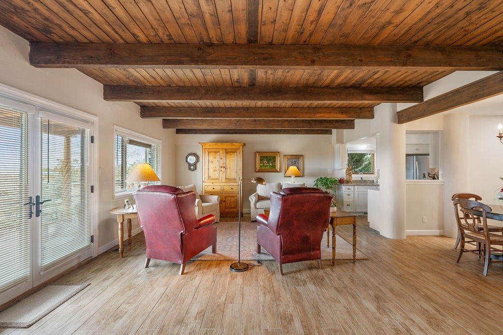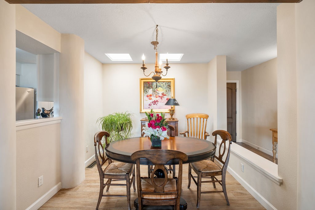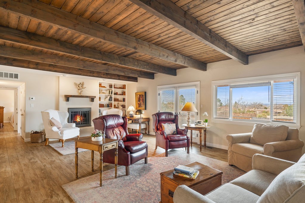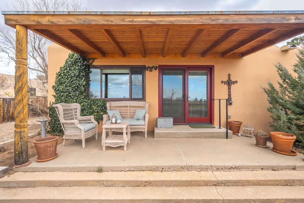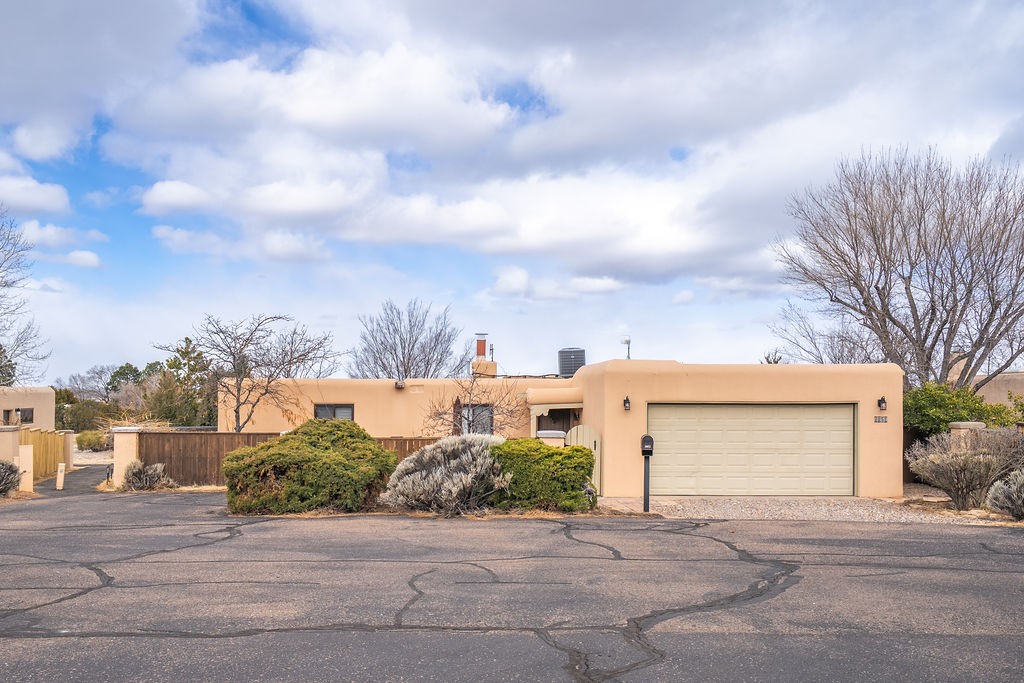 Nestled in a serene and private setting, this beautifully updated 1,632 sq. ft. home offers comfort, style, and breathtaking views of the Jemez Mountains. Featuring three bedrooms and two remodeled bathrooms, this home is designed for both relaxation and functionality. Step inside to discover updated tile floors throughout and an inviting living room with a wood-burning fireplace, built-in bookshelves, and French doors leading to a charming covered portal and landscaped backyard. The formal dining room, illuminated by two skylights, provides the perfect space for gatherings, while the renovated kitchen boasts newer appliances, a gas stove, and a pantry with pull-out shelves. The primary suite is a peaceful retreat with a walk-in closet and mountain views, while the third bedroom is a versatile space, complete with a built-in Murphy bed and office built-ins. Enjoy year-round comfort with forced air heating and refrigerated AC.Outdoor enthusiasts will love the generous front courtyard patio, perfect for lazy Summer breakfasts, and the walking path surrounding the property, leading to two raised garden beds--ideal for growing fresh produce or flowers. With community garden views and a quiet, peaceful atmosphere, this home is a rare gem waiting to be yours! TPO new roof with 10 year warranty has been ordered. Radon mitigation is being done on 4/3/25. Park Plazas is a unique and beautiful neighborhood, close to everything in Santa Fe, with miles of walking trails, a community garden, tennis courts, an off-leash dog park, and many other amenities, this neighborhood is one of the best values in Santa Fe.