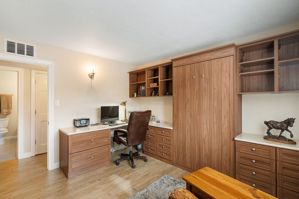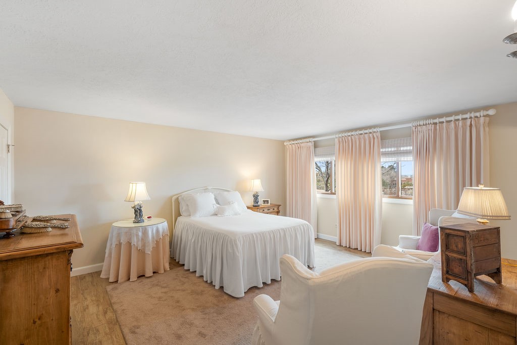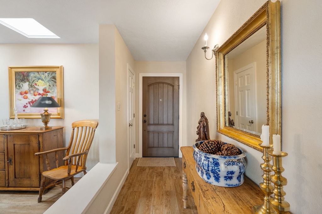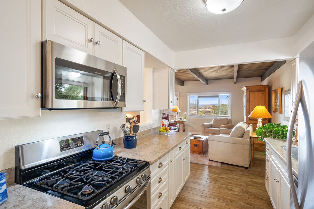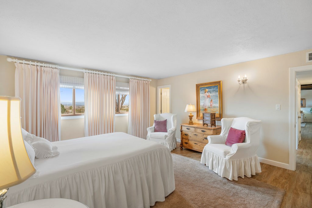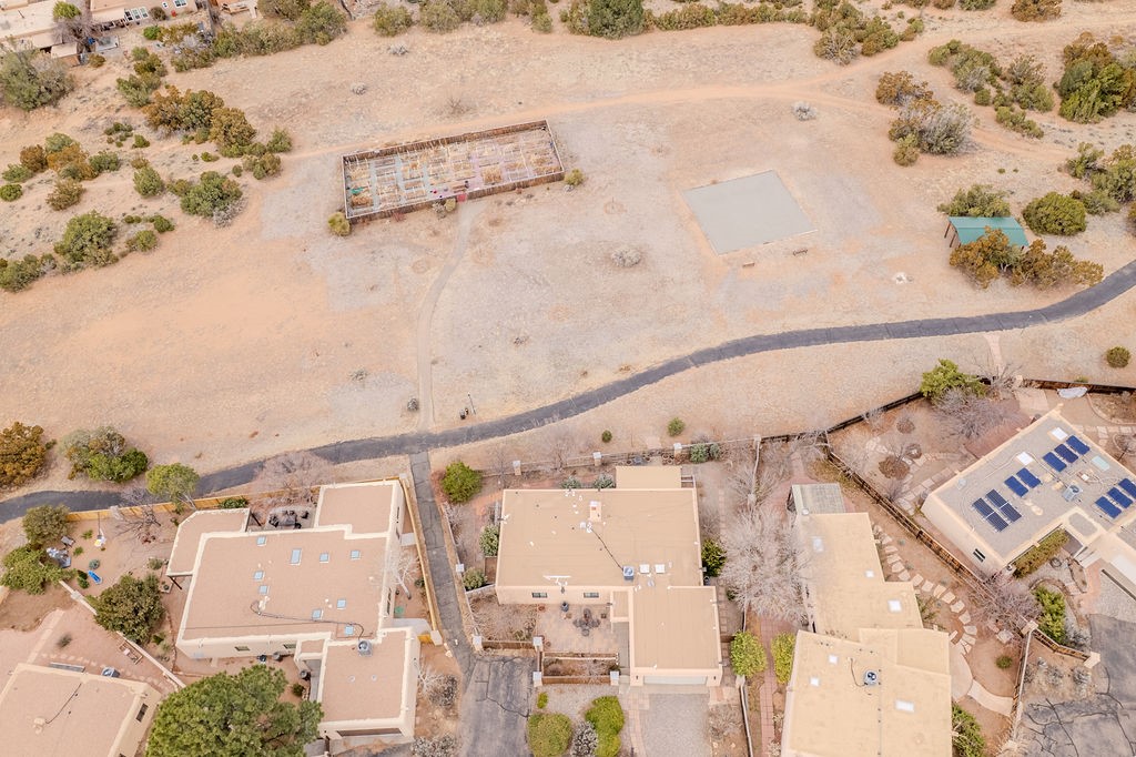Nestled in a serene and private setting, this beautifully updated 1,632 sq. ft. home offers comfort, style, and breathtaking views of the Jemez Mountains. Featuring three bedrooms and two remodeled bathrooms, this home is designed for both relaxation and functionality. Step inside to discover updated tile floors throughout and an inviting living room with a wood-burning fireplace, built-in bookshelves, and French doors leading to a charming covered portal and landscaped backyard. The formal dining room, illuminated by two skylights, provides the perfect space for gatherings, while the renovated kitchen boasts newer appliances, a gas stove, and a pantry with pull-out shelves. The primary suite is a peaceful retreat with a walk-in closet and mountain views, while the third bedroom is a versatile space, complete with a built-in Murphy bed and office built-ins. Enjoy year-round comfort with forced air heating and refrigerated AC.Outdoor enthusiasts will love the generous front courtyard patio, perfect for lazy Summer breakfasts, and the walking path surrounding the property, leading to two raised garden beds--ideal for growing fresh produce or flowers. With community garden views and a quiet, peaceful atmosphere, this home is a rare gem waiting to be yours! TPO new roof with 10 year warranty has been ordered. Radon mitigation is being done on 4/3/25. Park Plazas is a unique and beautiful neighborhood, close to everything in Santa Fe, with miles of walking trails, a community garden, tennis courts, an off-leash dog park, and many other amenities, this neighborhood is one of the best values in Santa Fe.