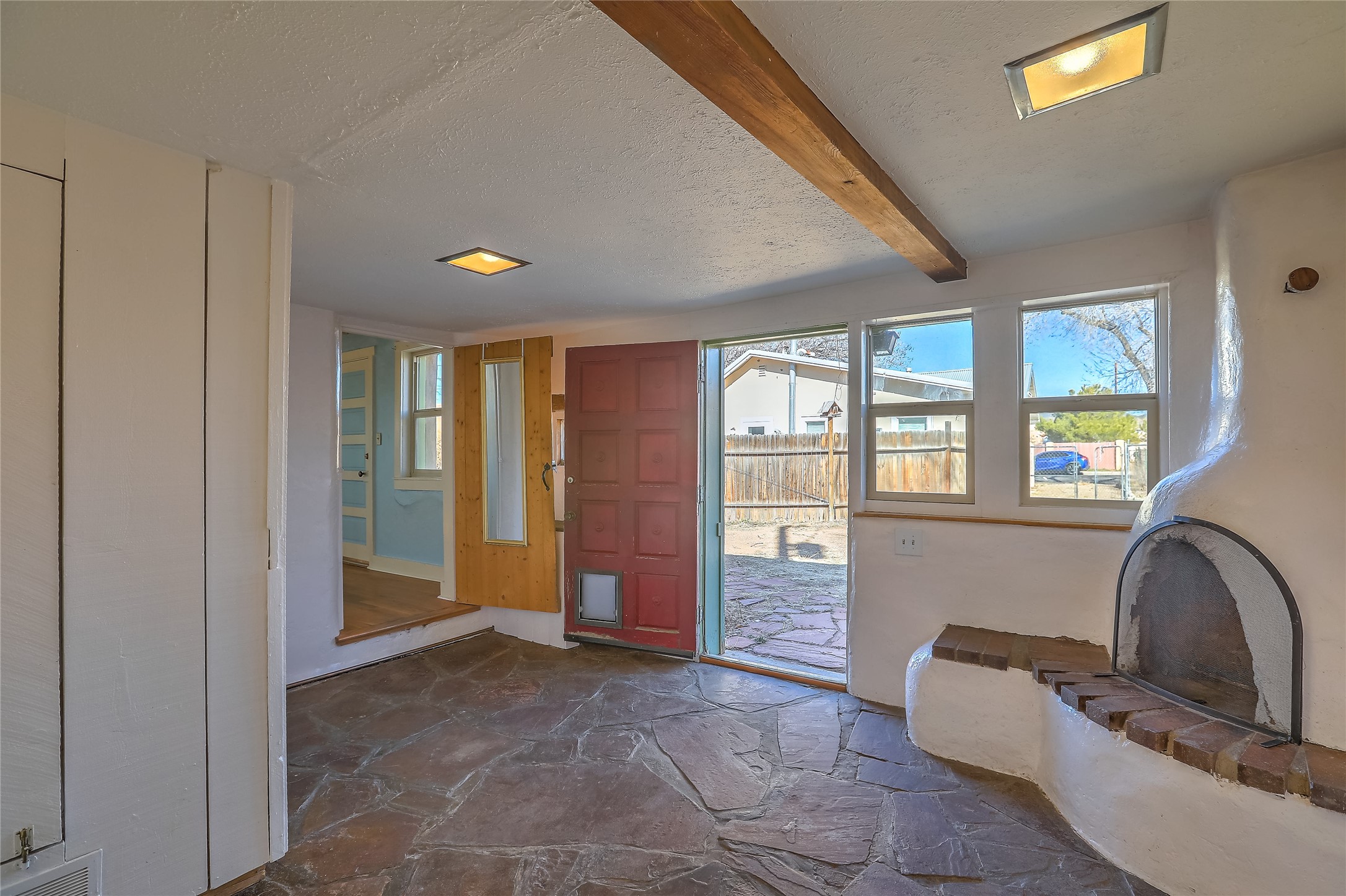 New Price Improvement!!! Embrace the charm of a 1930's gem just minutes from the Plaza! This delightful main house features two inviting bedrooms and one bath, where classic wood floors accentuate the warm living and dining spaces. Cooking enthusiasts will love the thoughtfully updated kitchen, while recent upgrades to the roof, plumbing, and electrical systems provide reliability. Step outside to enjoy the fenced yard, ensuring privacy between the houses, and make the most of the adorable casita that offers an additional bedroom, bath, and an inviting open layout with a kiva fireplace. With plentiful off-street parking and a bonus basement for extra storage, this property perfectly blends character and functionality in a fantastic location!