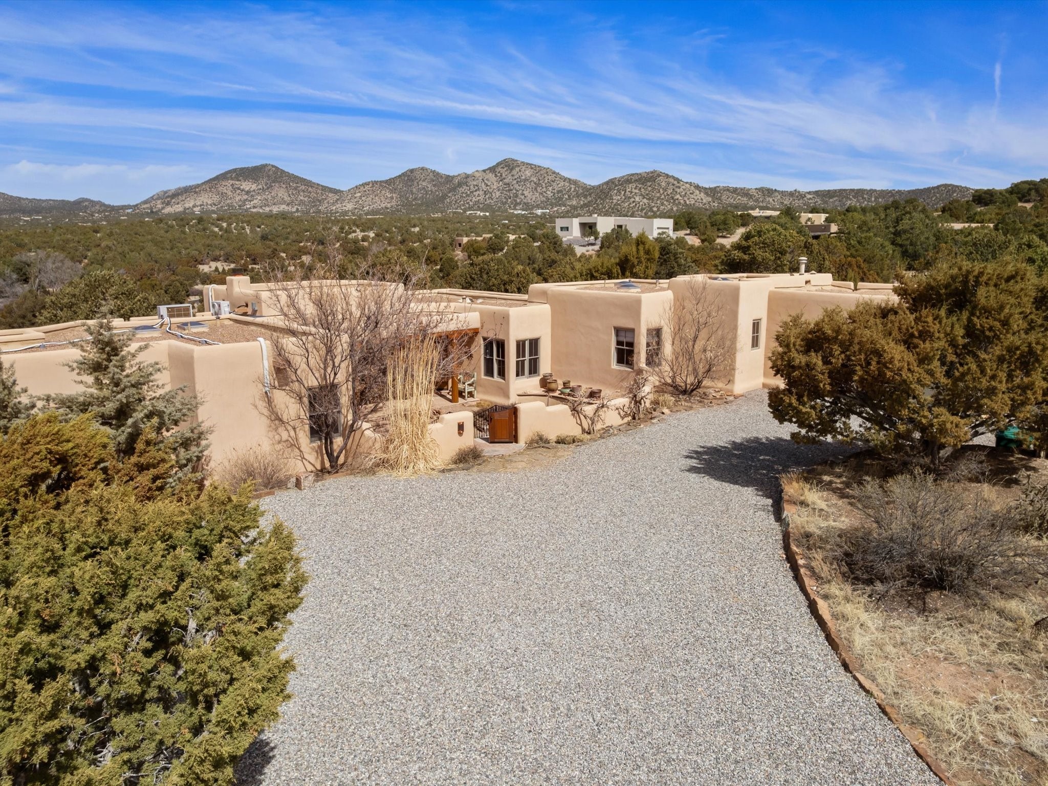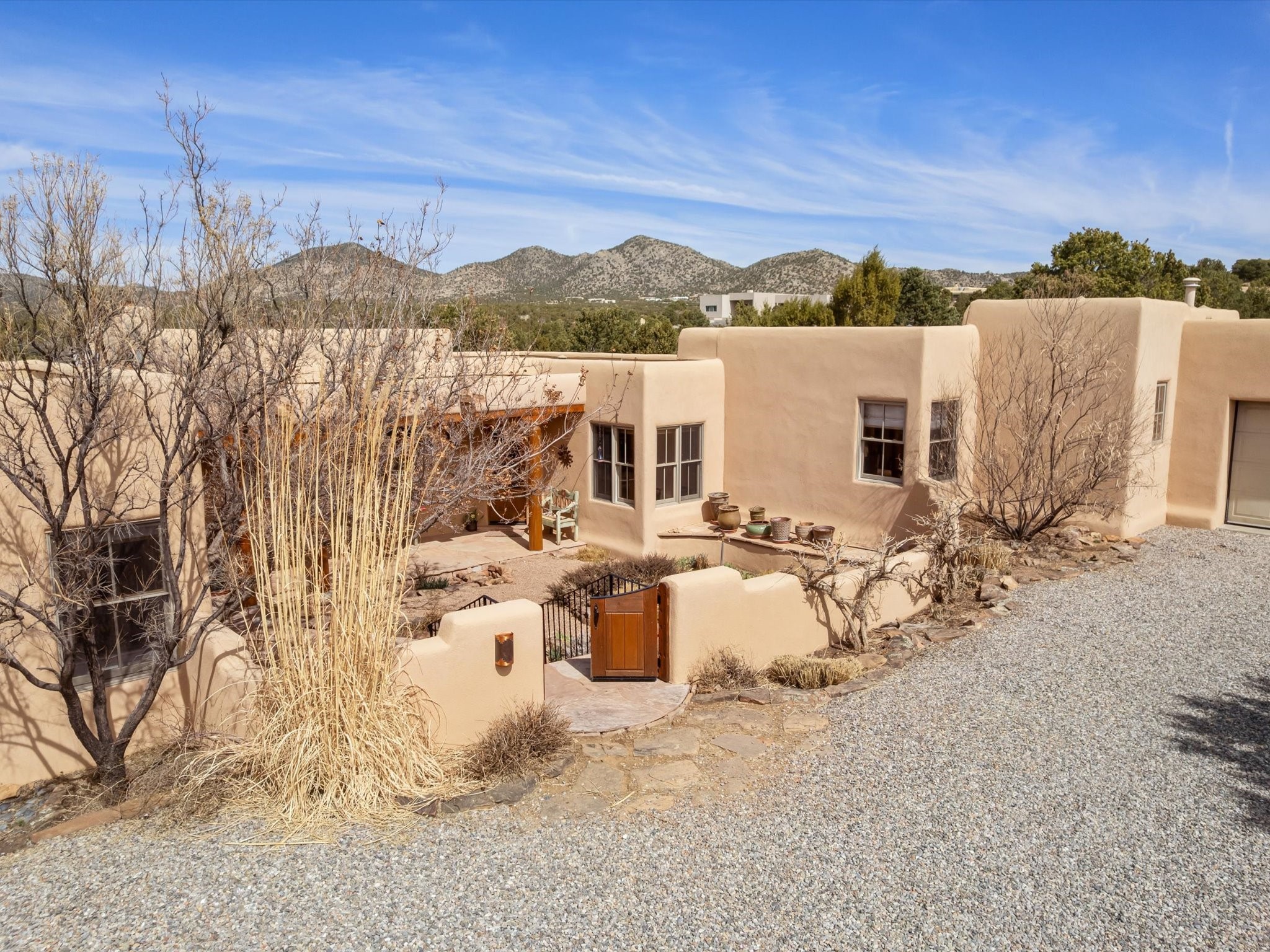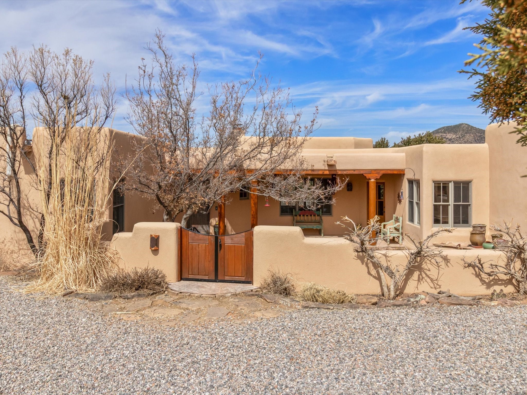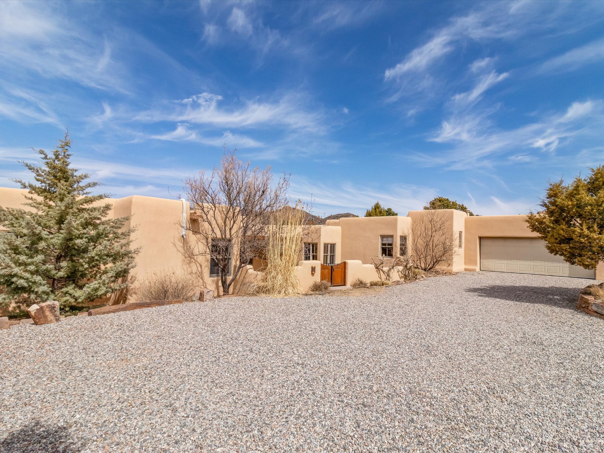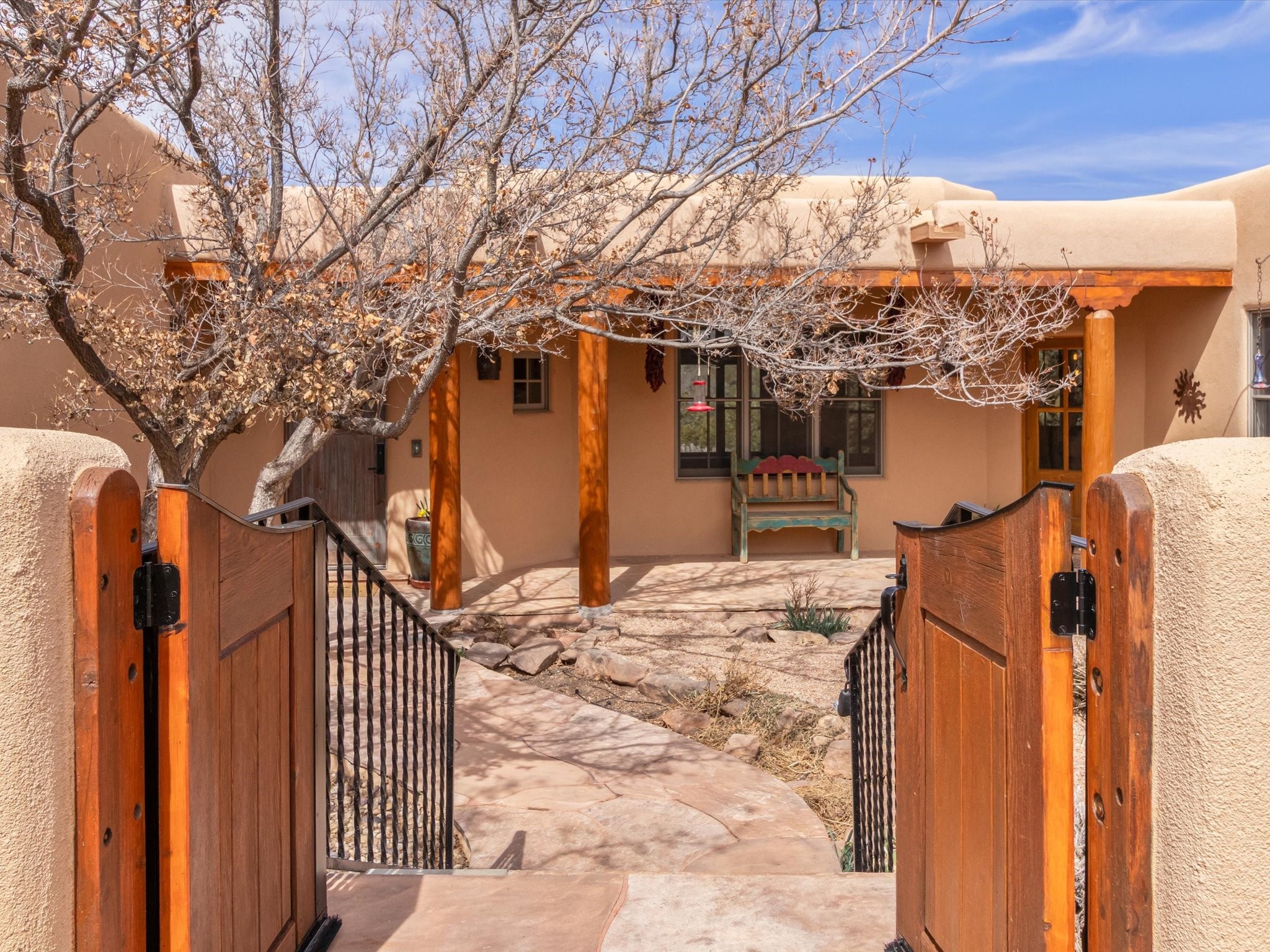 Santa Fe Sanctuary - located in the gated community of Alteza Estates just 20 minutes from the Historic Santa Fe Plaza. This stunning home boasts a living room with soaring ceilings, exposed Vigas and cozy wood-burning fireplace, perfect for gathering on chilly evenings or a blue sky summer's day. The recently remodeled kitchen is a chef's delight featuring sparkling quartz countertops, a designer tile backsplash, convenient island, electric induction range (propane stub in place), custom cabinetry with pullout shelves and undermount lighting. Enjoy casual meals in the eat-in kitchen or host elegant dinners in the formal dining room just off the kitchen and living area. The thoughtfully designed split floor plan offers privacy and comfort. A secondary bedroom and bath plus office are situated on a separate wing from the primary suite. Retreat to your private luxurious suite, featuring a wood-burning Kiva fireplace and french doors leading to a covered patio. Spa like primary bathroom with jacuzzi tub, oversized walk-in shower, dual sinks, and spacious walk-in closet. Custom details throughout this home: classic plaster walls in select areas, solid wood custom doors, ample built-in cabinetry, additional storage, and hard floor surfaces throughout. Two additional bedrooms with shared hallway bathroom. Laundry room with sink and built-ins. Property includes El Dorado water and access to Xfinity services. Stay comfortable year-round with new mini-split units installed in 2024, new boiler installed in 2025, and new tankless water heater in 2024. Outdoor living with expansive covered patio and enclosed yard, stunning views and unparalleled privacy. A front enclosed courtyard offers a welcoming entrance with lush landscaping. Oversized 2-car garage includes a workspace, storage room and EV receptacle. Experience Santa Fe living at its very finest!