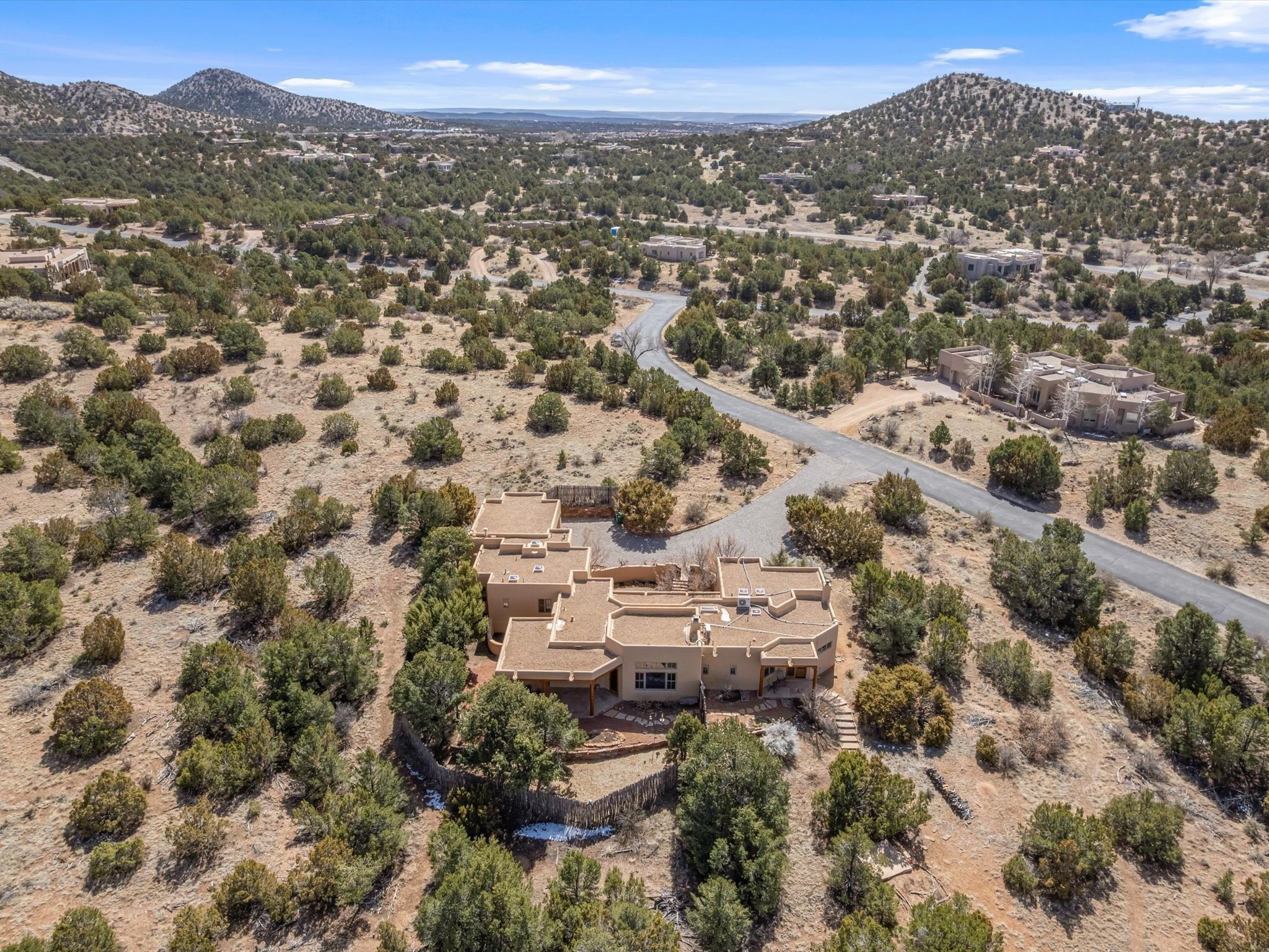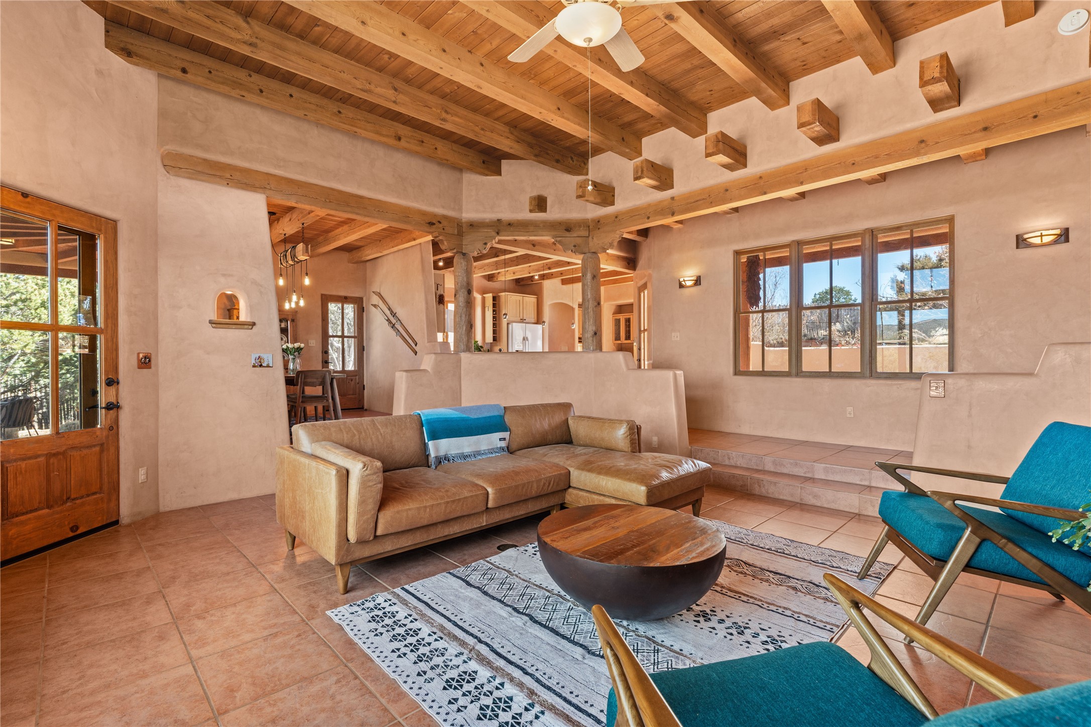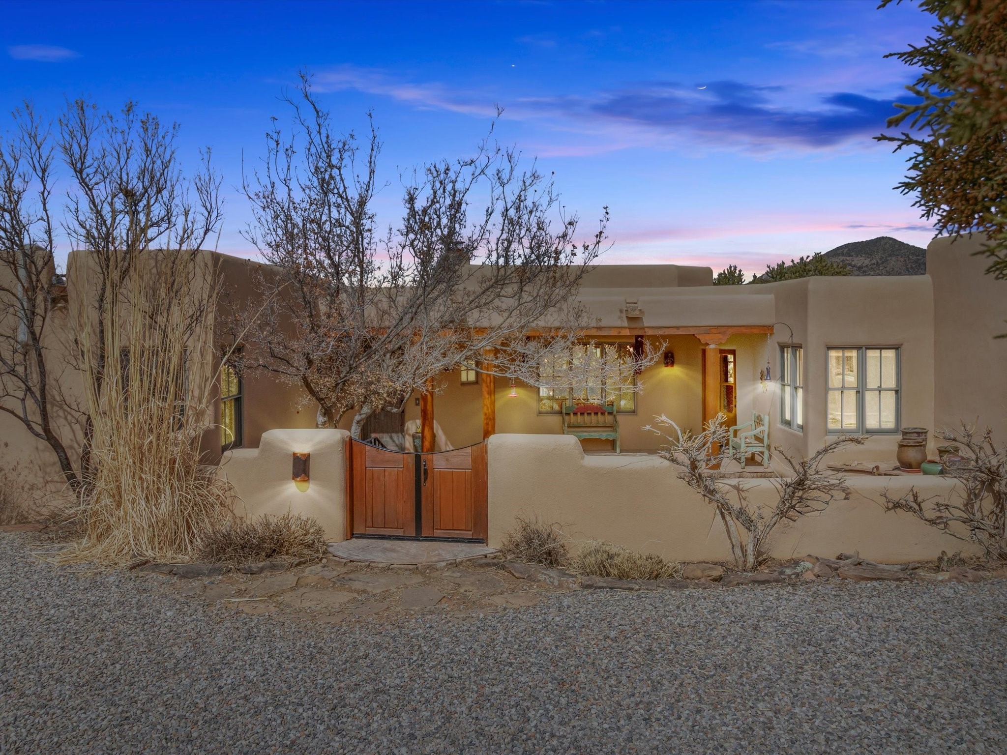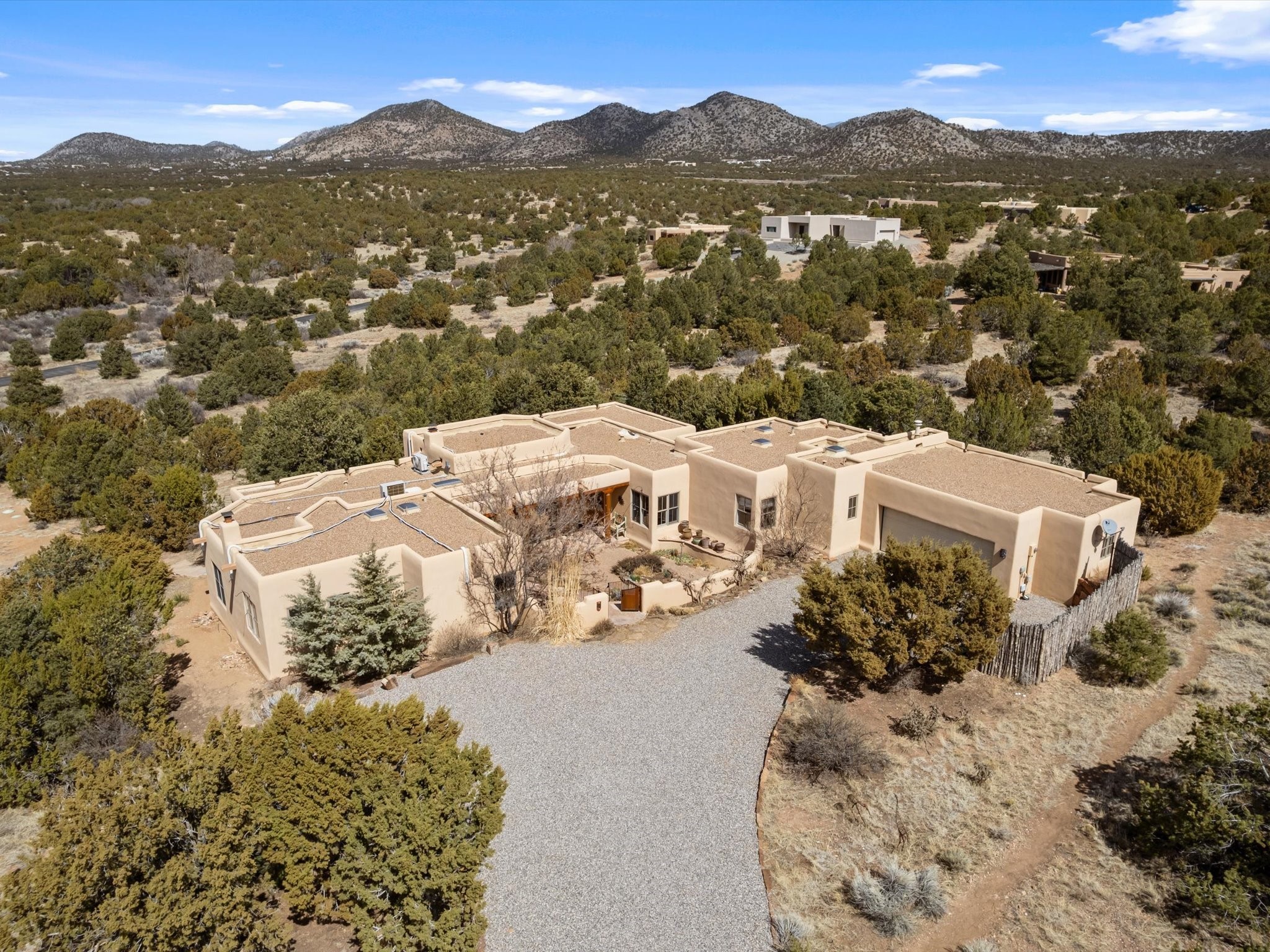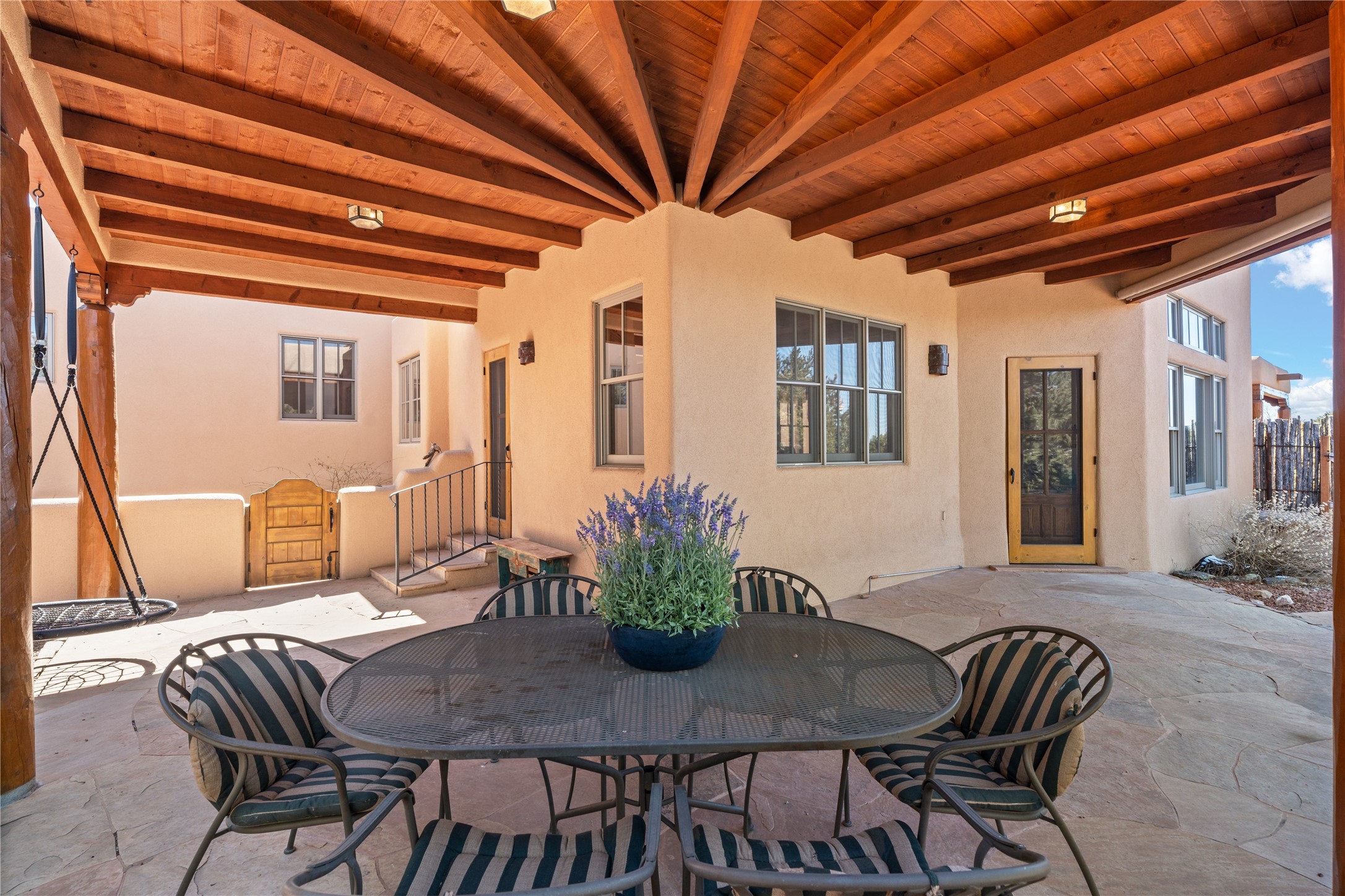 Santa Fe Sanctuary - located in the gated community of Alteza Estates just 20 minutes from the Historic Santa Fe Plaza. This stunning home boasts a living room with soaring ceilings, exposed Vigas and cozy wood-burning fireplace, perfect for gathering on chilly evenings or a blue sky summer's day. The recently remodeled kitchen is a chef's delight featuring sparkling quartz countertops, a designer tile backsplash, convenient island, electric induction range (propane stub in place), custom cabinetry with pullout shelves and undermount lighting. Enjoy casual meals in the eat-in kitchen or host elegant dinners in the formal dining room just off the kitchen and living area. The thoughtfully designed split floor plan offers privacy and comfort. A secondary bedroom and bath plus office are situated on a separate wing from the primary suite. Retreat to your private luxurious suite, featuring a wood-burning Kiva fireplace and french doors leading to a covered patio. Spa like primary bathroom with jacuzzi tub, oversized walk-in shower, dual sinks, and spacious walk-in closet. Custom details throughout this home: classic plaster walls in select areas, solid wood custom doors, ample built-in cabinetry, additional storage, and hard floor surfaces throughout. Two additional bedrooms with shared hallway bathroom. Laundry room with sink and built-ins. Property includes El Dorado water and access to Xfinity services. Stay comfortable year-round with new mini-split units installed in 2024, new boiler installed in 2025, and new tankless water heater in 2024. Outdoor living with expansive covered patio and enclosed yard, stunning views and unparalleled privacy. A front enclosed courtyard offers a welcoming entrance with lush landscaping. Oversized 2-car garage includes a workspace, storage room and EV receptacle. Experience Santa Fe living at its very finest!
