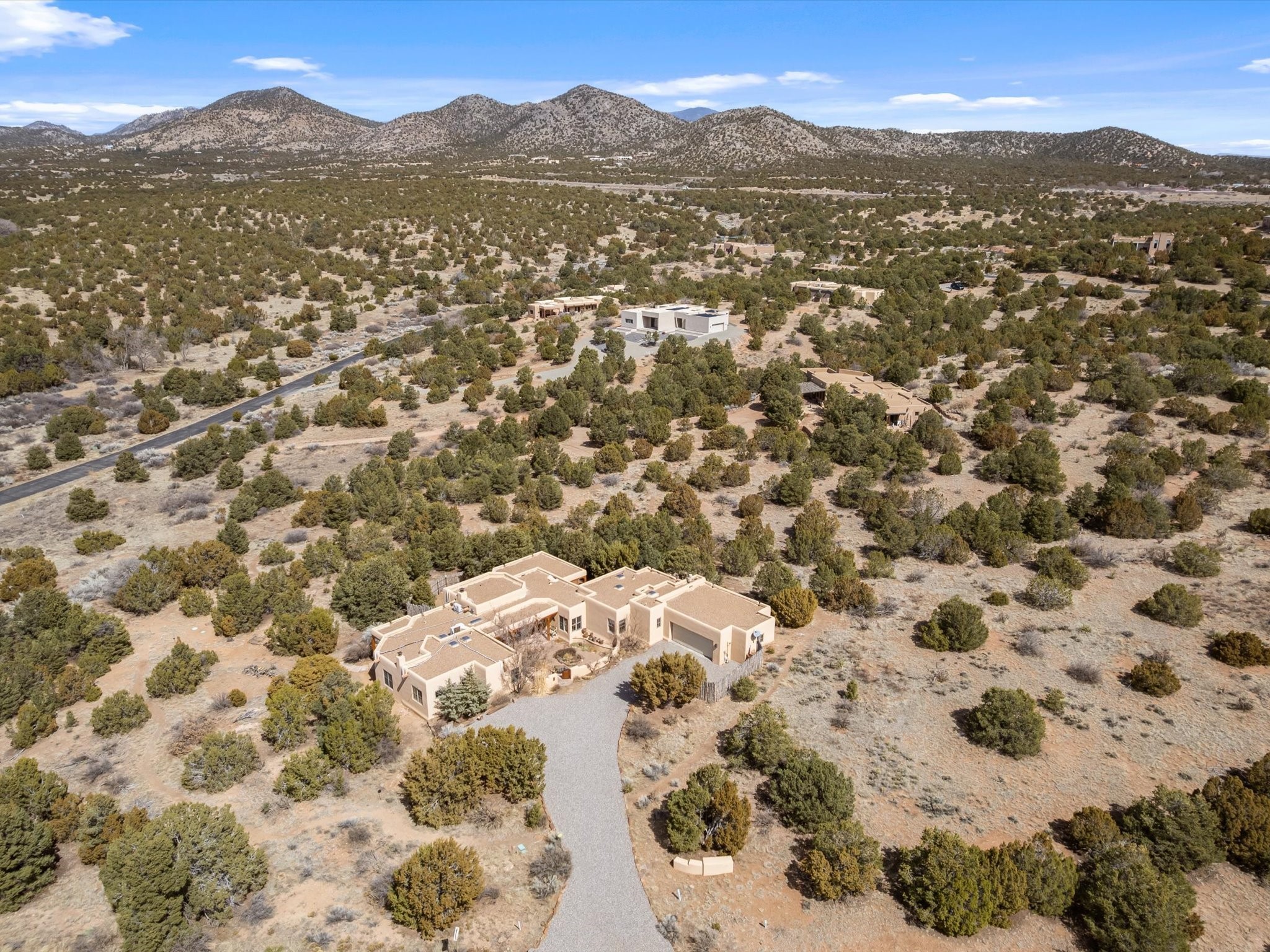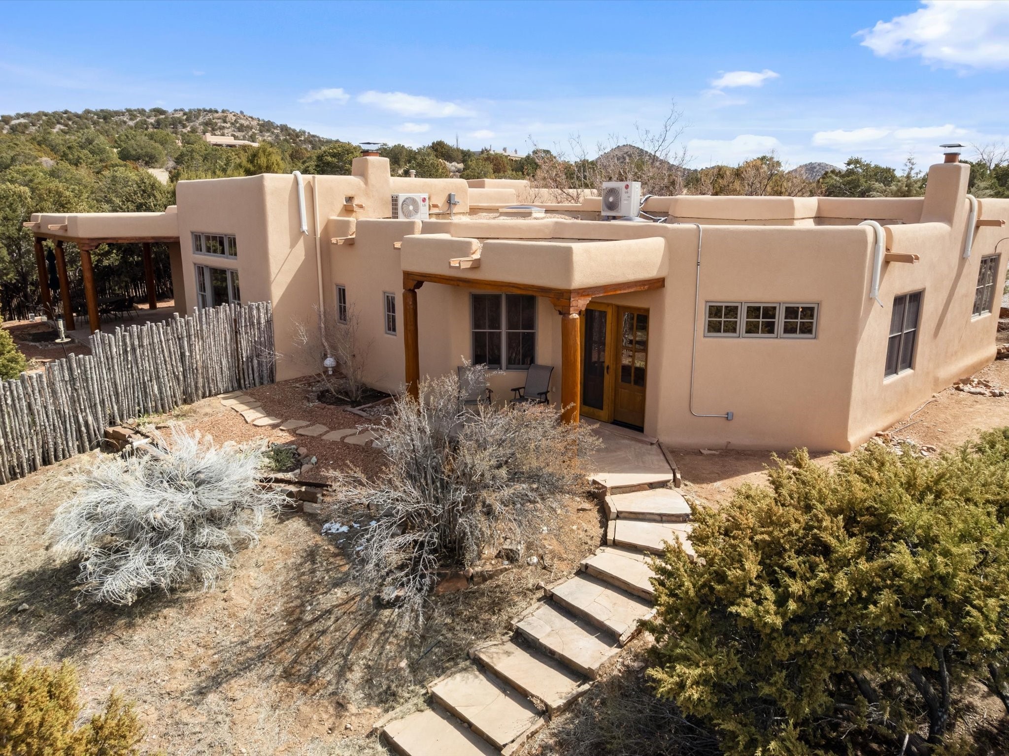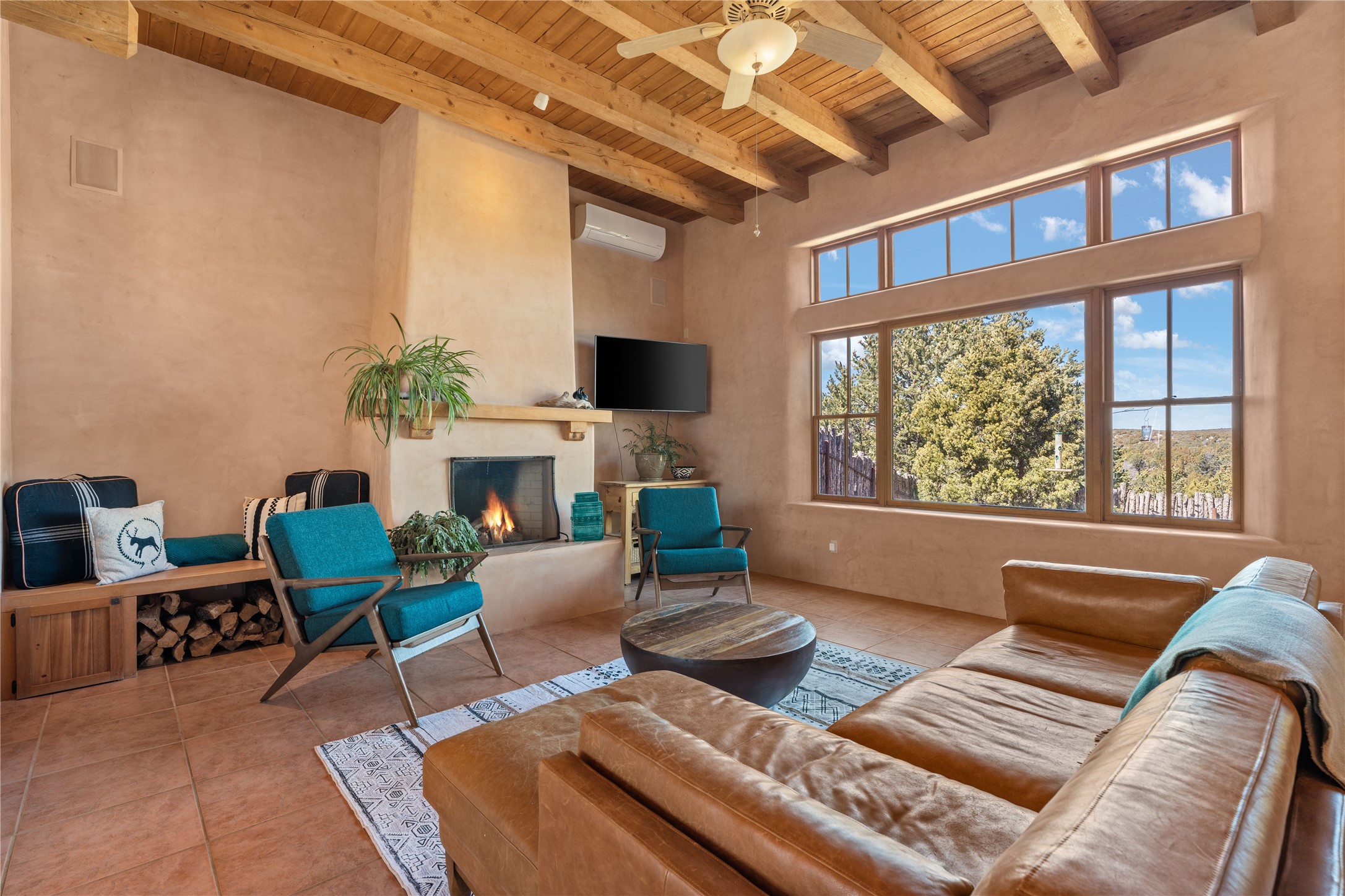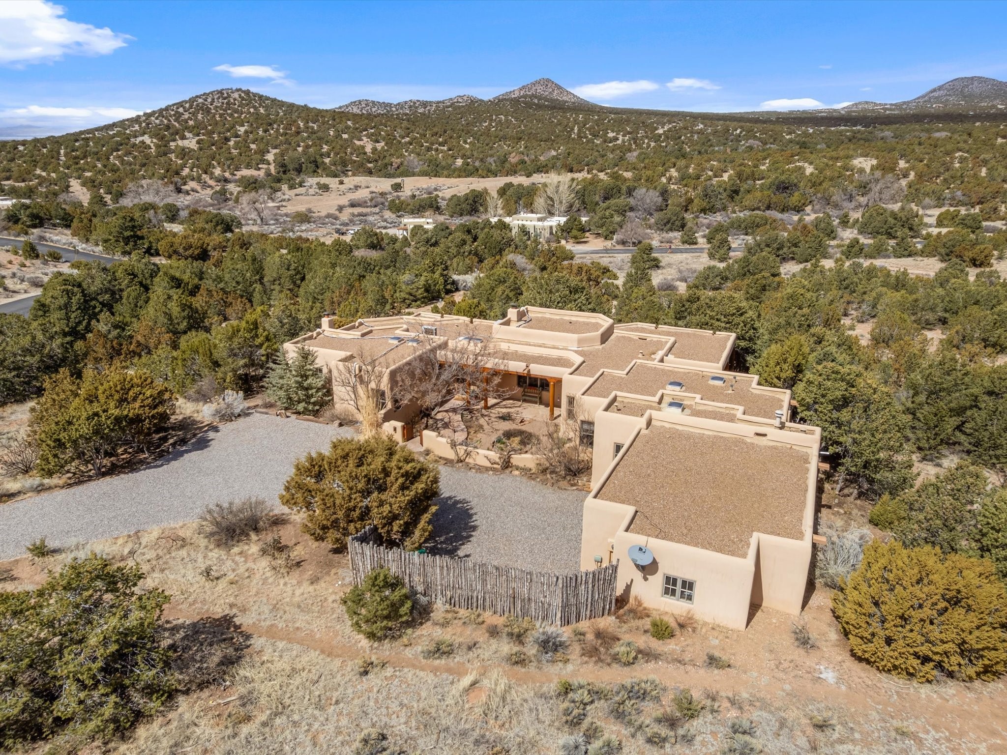 Santa Fe Sanctuary - located in the gated community of Alteza Estates just 20 minutes from the Historic Santa Fe Plaza. This stunning home boasts a living room with soaring ceilings, exposed Vigas and cozy wood-burning fireplace, perfect for gathering on chilly evenings or a blue sky summer's day. The recently remodeled kitchen is a chef's delight featuring sparkling quartz countertops, a designer tile backsplash, convenient island, electric induction range (propane stub in place), custom cabinetry with pullout shelves and undermount lighting. Enjoy casual meals in the eat-in kitchen or host elegant dinners in the formal dining room just off the kitchen and living area. The thoughtfully designed split floor plan offers privacy and comfort. A secondary bedroom and bath plus office are situated on a separate wing from the primary suite. Retreat to your private luxurious suite, featuring a wood-burning Kiva fireplace and french doors leading to a covered patio. Spa like primary bathroom with jacuzzi tub, oversized walk-in shower, dual sinks, and spacious walk-in closet. Custom details throughout this home: classic plaster walls in select areas, solid wood custom doors, ample built-in cabinetry, additional storage, and hard floor surfaces throughout. Two additional bedrooms with shared hallway bathroom. Laundry room with sink and built-ins. Property includes El Dorado water and access to Xfinity services. Stay comfortable year-round with new mini-split units installed in 2024, new boiler installed in 2025, and new tankless water heater in 2024. Outdoor living with expansive covered patio and enclosed yard, stunning views and unparalleled privacy. A front enclosed courtyard offers a welcoming entrance with lush landscaping. Oversized 2-car garage includes a workspace, storage room and EV receptacle. Experience Santa Fe living at its very finest!