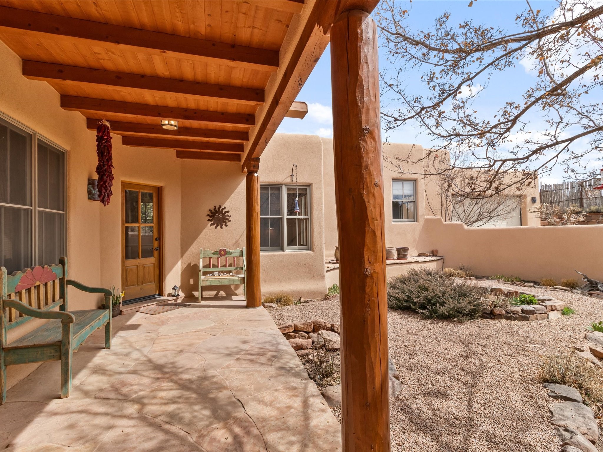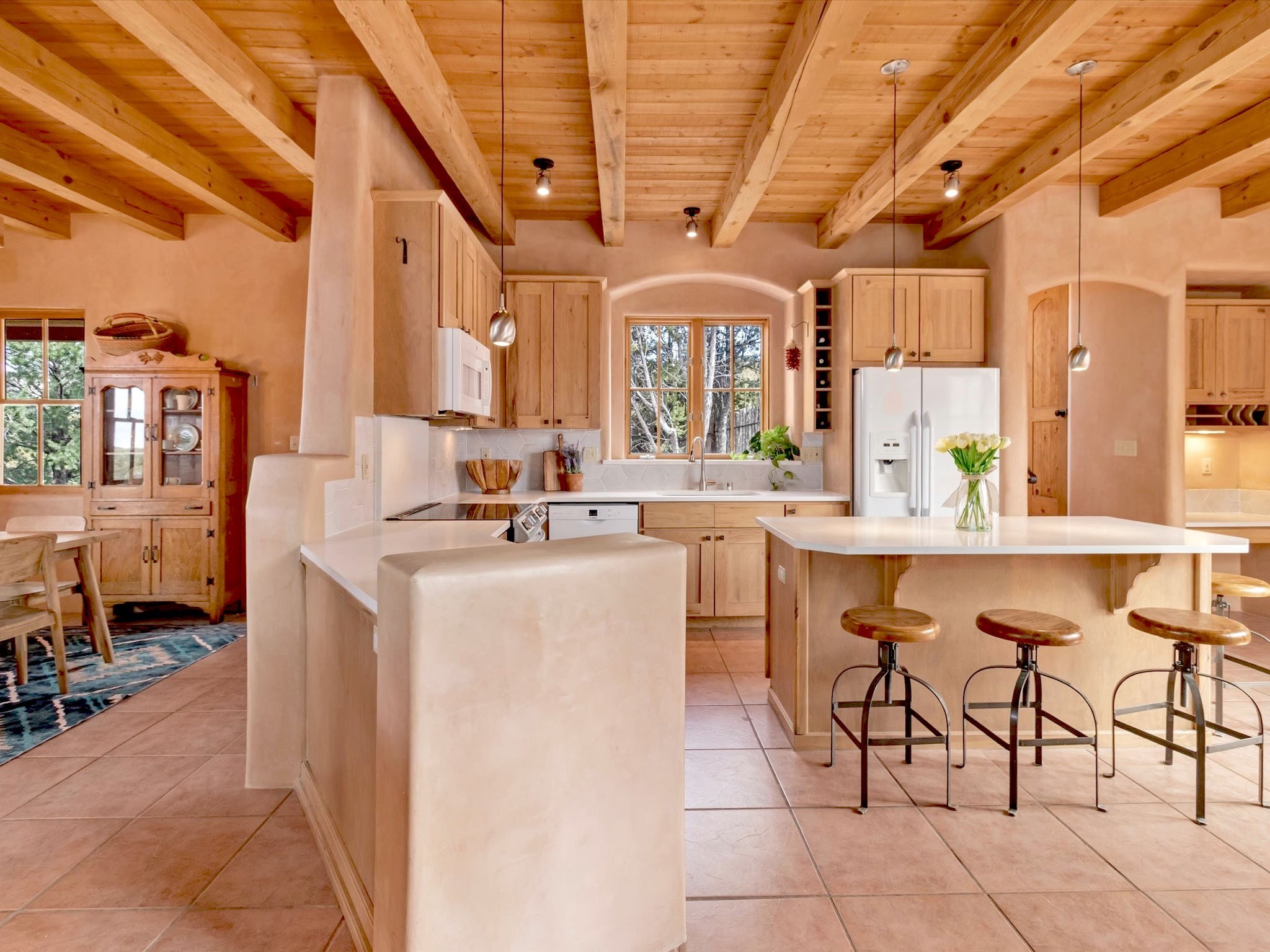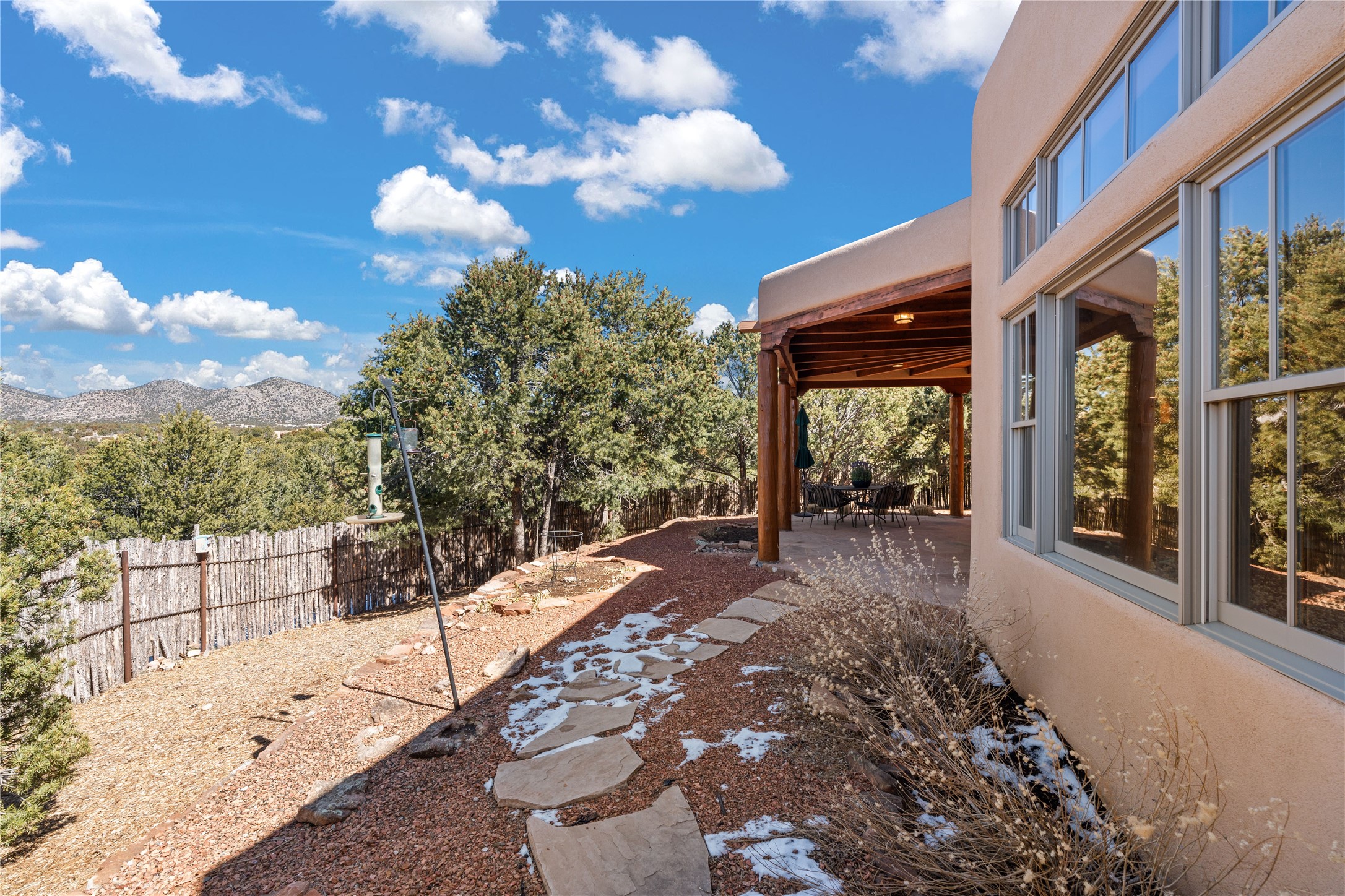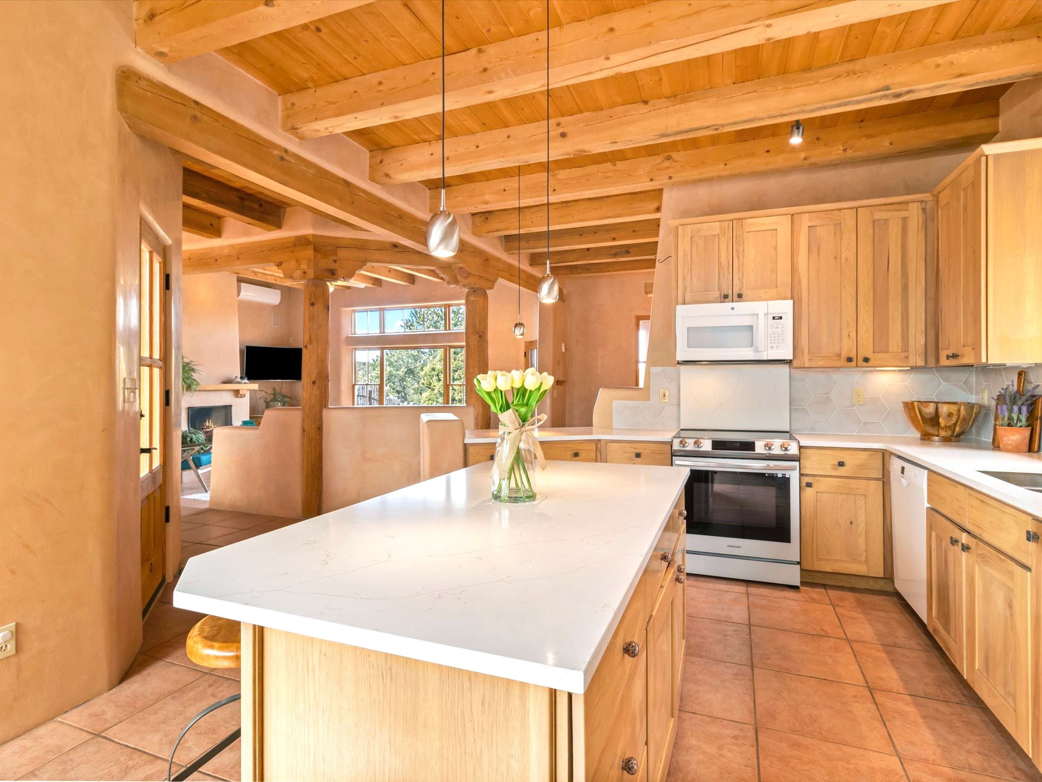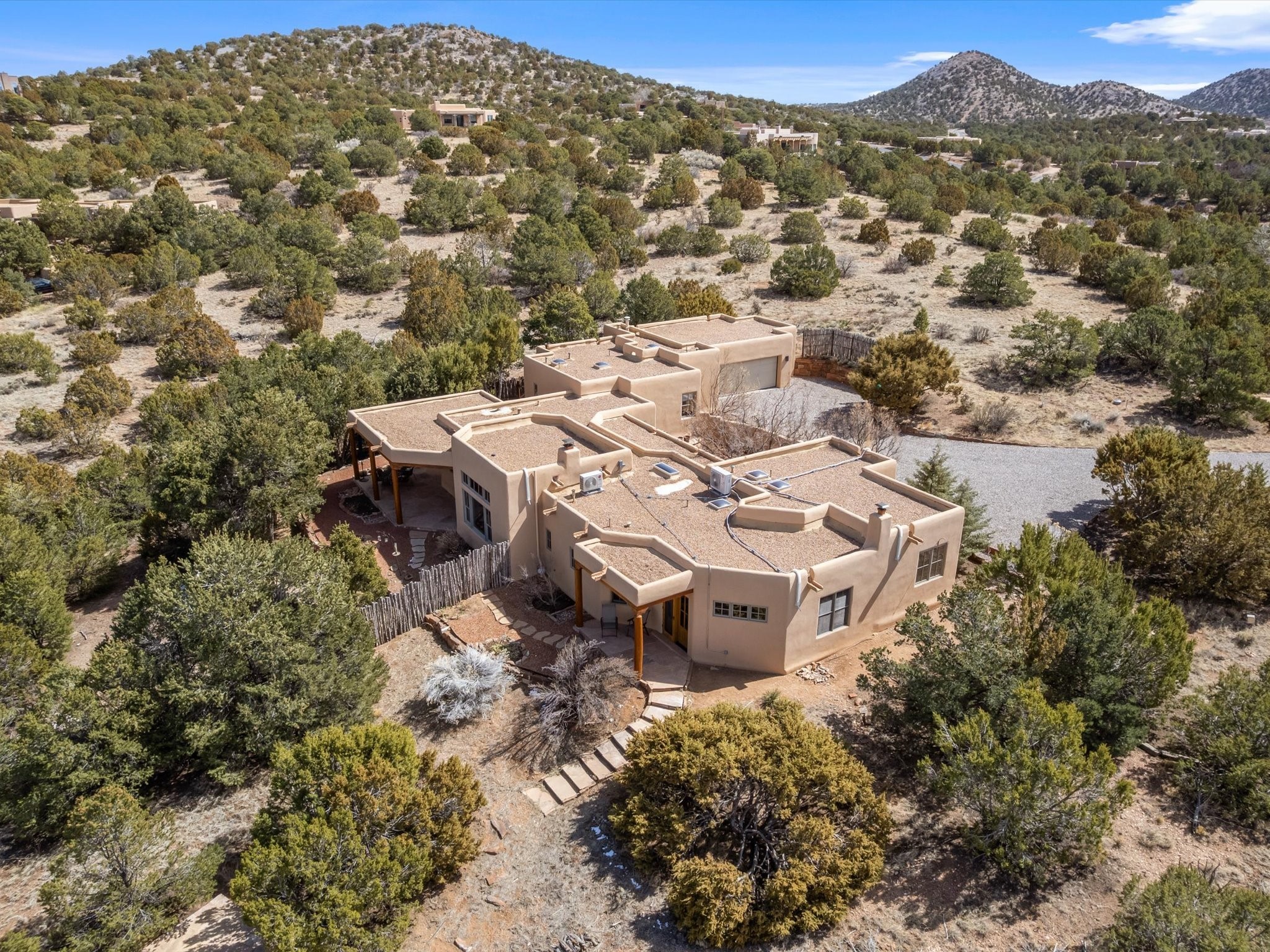 Santa Fe Sanctuary - located in the gated community of Alteza Estates just 20 minutes from the Historic Santa Fe Plaza. This stunning home boasts a living room with soaring ceilings, exposed Vigas and cozy wood-burning fireplace, perfect for gathering on chilly evenings or a blue sky summer's day. The recently remodeled kitchen is a chef's delight featuring sparkling quartz countertops, a designer tile backsplash, convenient island, electric induction range (propane stub in place), custom cabinetry with pullout shelves and undermount lighting. Enjoy casual meals in the eat-in kitchen or host elegant dinners in the formal dining room just off the kitchen and living area. The thoughtfully designed split floor plan offers privacy and comfort. A secondary bedroom and bath plus office are situated on a separate wing from the primary suite. Retreat to your private luxurious suite, featuring a wood-burning Kiva fireplace and french doors leading to a covered patio. Spa like primary bathroom with jacuzzi tub, oversized walk-in shower, dual sinks, and spacious walk-in closet. Custom details throughout this home: classic plaster walls in select areas, solid wood custom doors, ample built-in cabinetry, additional storage, and hard floor surfaces throughout. Two additional bedrooms with shared hallway bathroom. Laundry room with sink and built-ins. Property includes El Dorado water and access to Xfinity services. Stay comfortable year-round with new mini-split units installed in 2024, new boiler installed in 2025, and new tankless water heater in 2024. Outdoor living with expansive covered patio and enclosed yard, stunning views and unparalleled privacy. A front enclosed courtyard offers a welcoming entrance with lush landscaping. Oversized 2-car garage includes a workspace, storage room and EV receptacle. Experience Santa Fe living at its very finest!