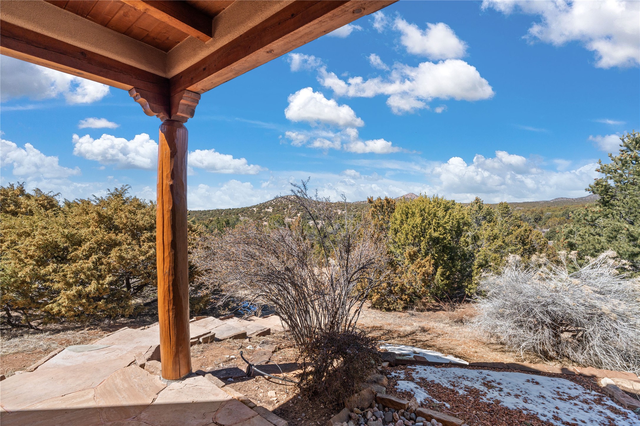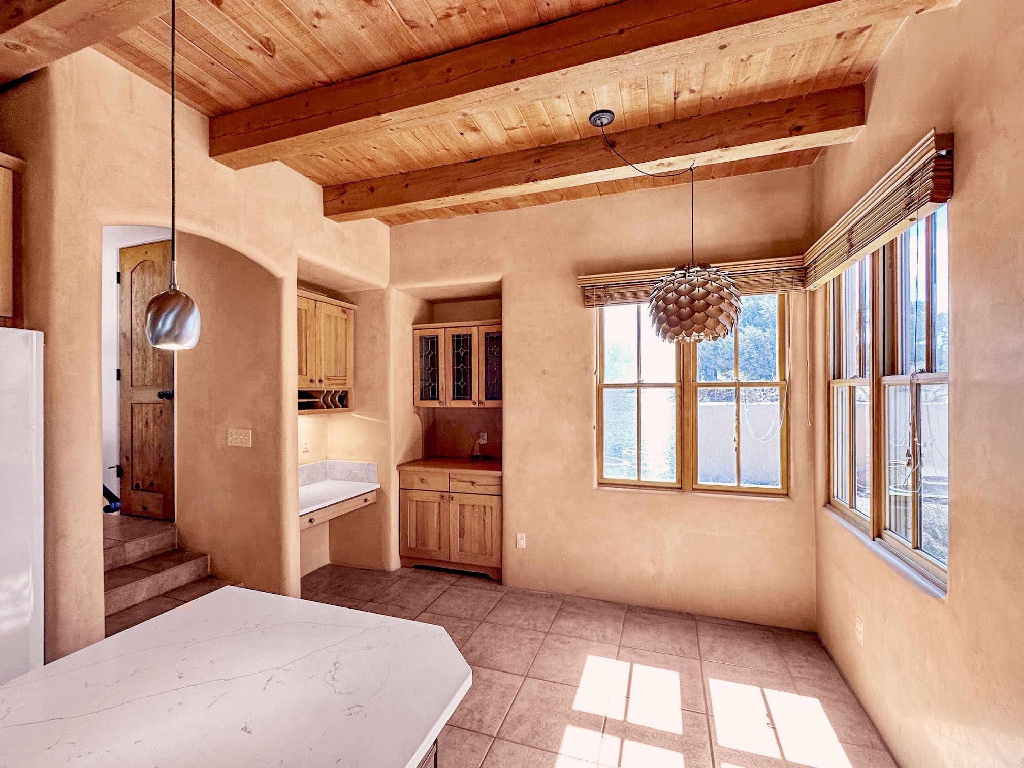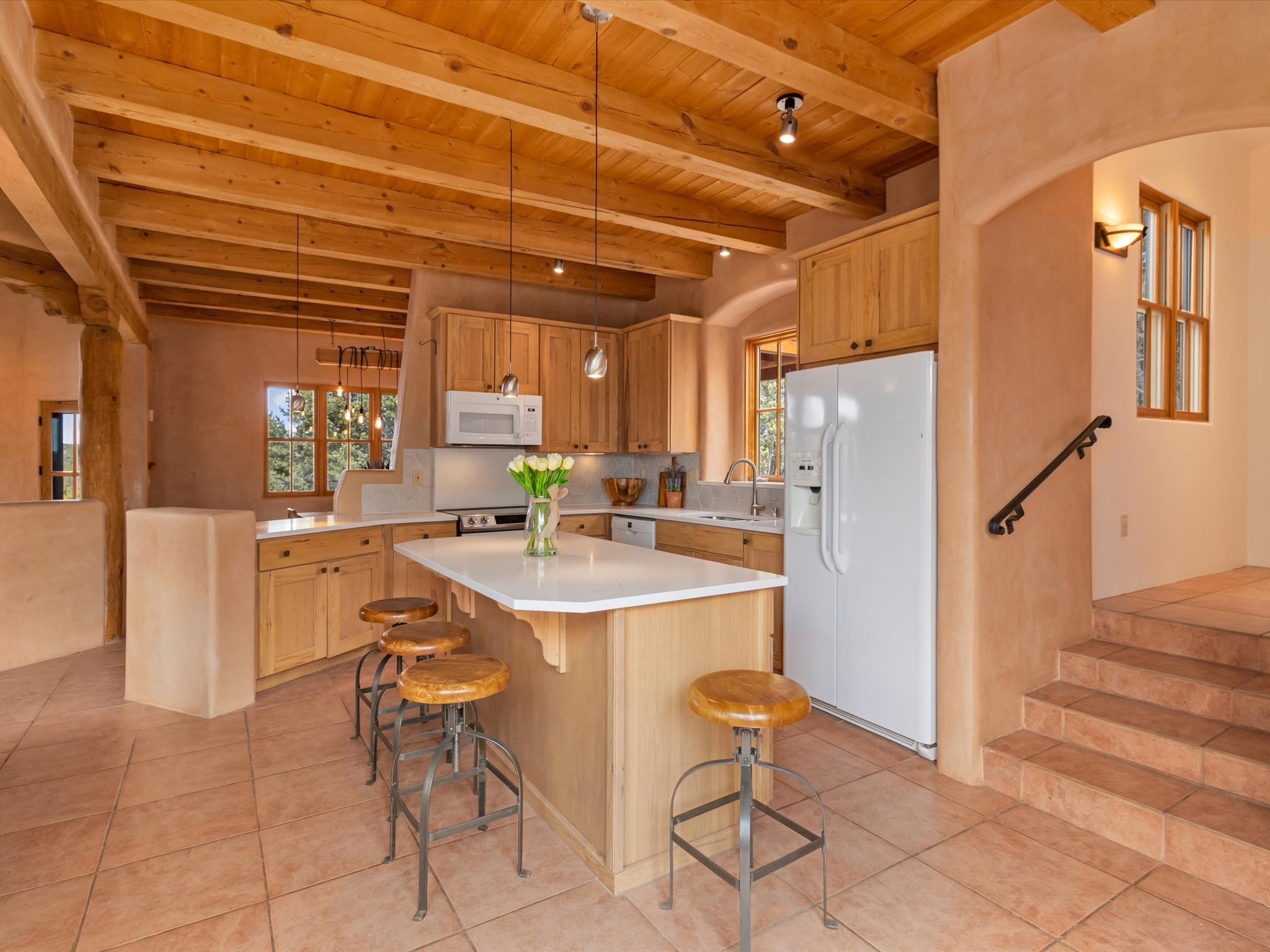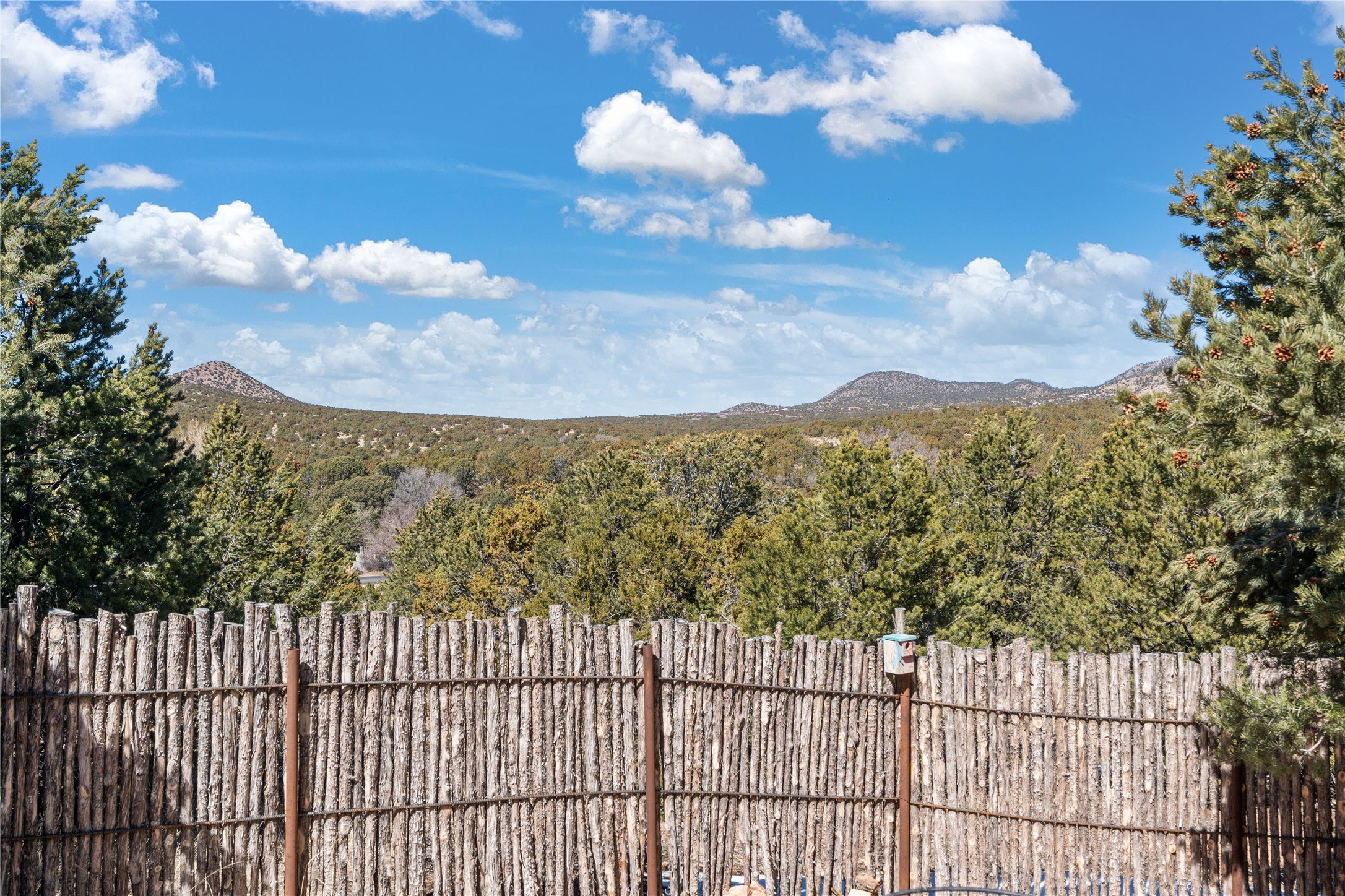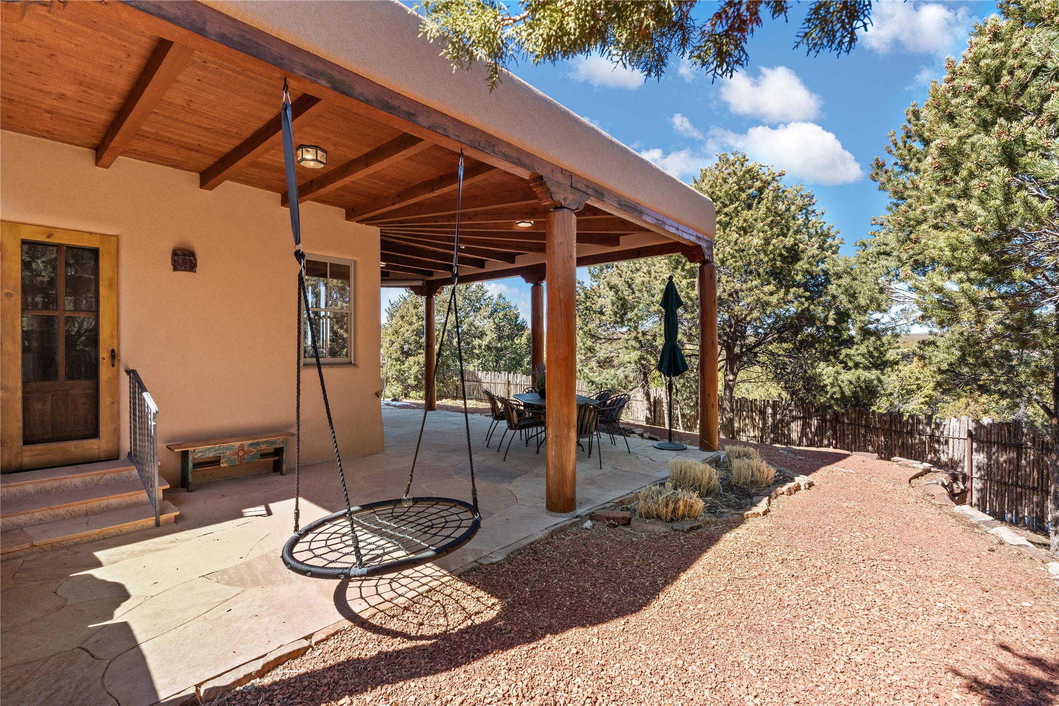 Santa Fe Sanctuary - located in the gated community of Alteza Estates just 20 minutes from the Historic Santa Fe Plaza. This stunning home boasts a living room with soaring ceilings, exposed Vigas and cozy wood-burning fireplace, perfect for gathering on chilly evenings or a blue sky summer's day. The recently remodeled kitchen is a chef's delight featuring sparkling quartz countertops, a designer tile backsplash, convenient island, electric induction range (propane stub in place), custom cabinetry with pullout shelves and undermount lighting. Enjoy casual meals in the eat-in kitchen or host elegant dinners in the formal dining room just off the kitchen and living area. The thoughtfully designed split floor plan offers privacy and comfort. A secondary bedroom and bath plus office are situated on a separate wing from the primary suite. Retreat to your private luxurious suite, featuring a wood-burning Kiva fireplace and french doors leading to a covered patio. Spa like primary bathroom with jacuzzi tub, oversized walk-in shower, dual sinks, and spacious walk-in closet. Custom details throughout this home: classic plaster walls in select areas, solid wood custom doors, ample built-in cabinetry, additional storage, and hard floor surfaces throughout. Two additional bedrooms with shared hallway bathroom. Laundry room with sink and built-ins. Property includes El Dorado water and access to Xfinity services. Stay comfortable year-round with new mini-split units installed in 2024, new boiler installed in 2025, and new tankless water heater in 2024. Outdoor living with expansive covered patio and enclosed yard, stunning views and unparalleled privacy. A front enclosed courtyard offers a welcoming entrance with lush landscaping. Oversized 2-car garage includes a workspace, storage room and EV receptacle. Experience Santa Fe living at its very finest!