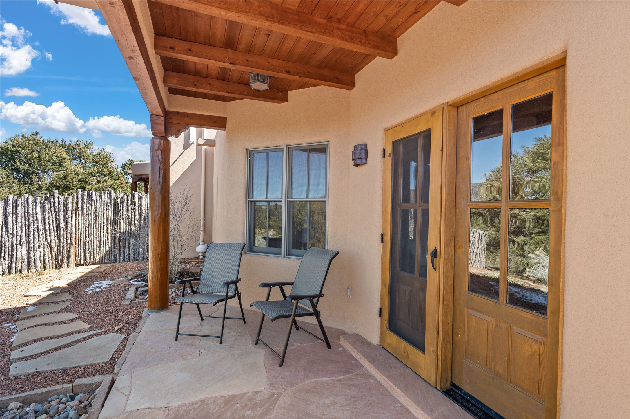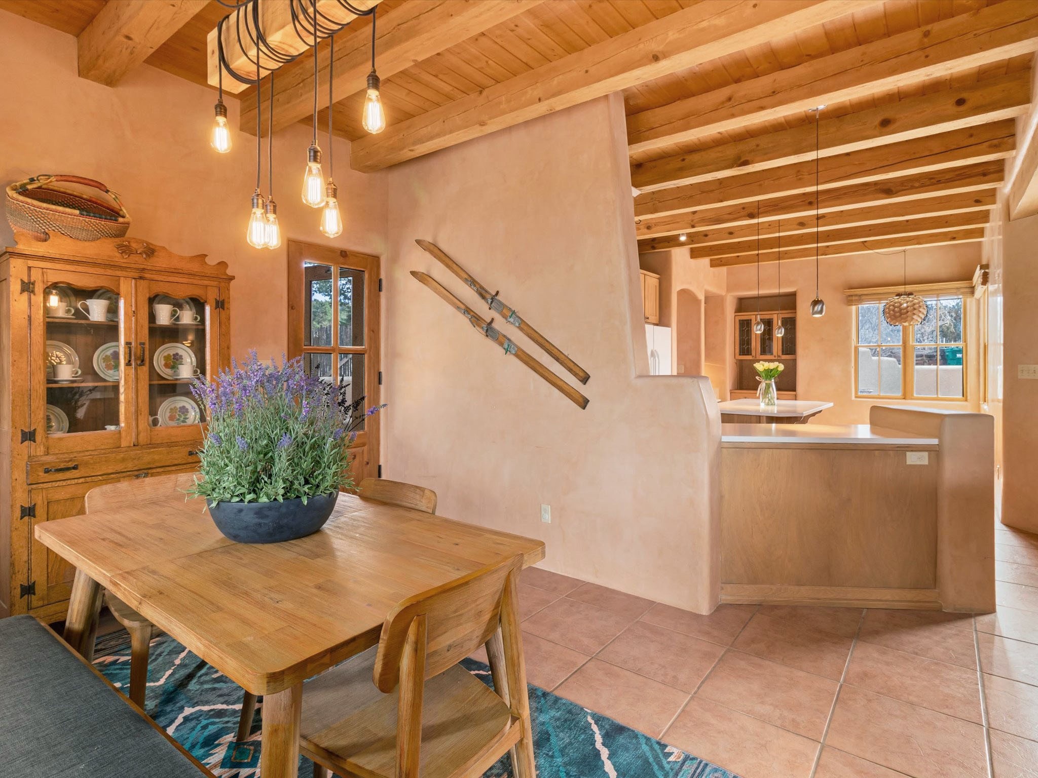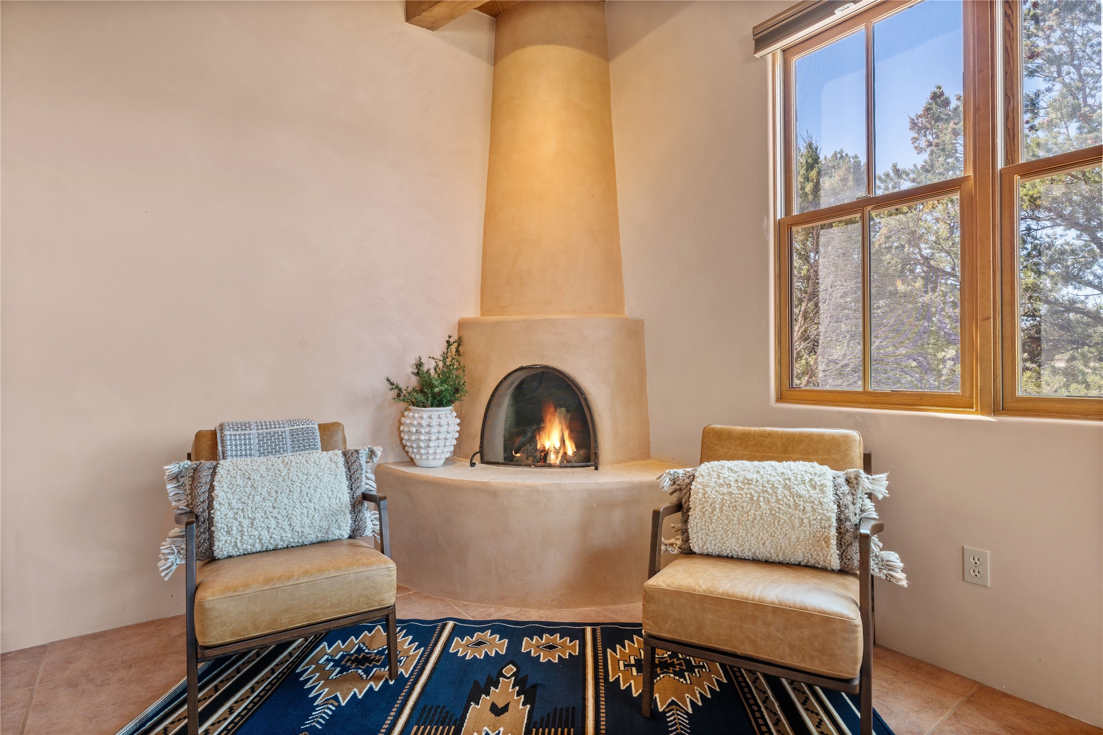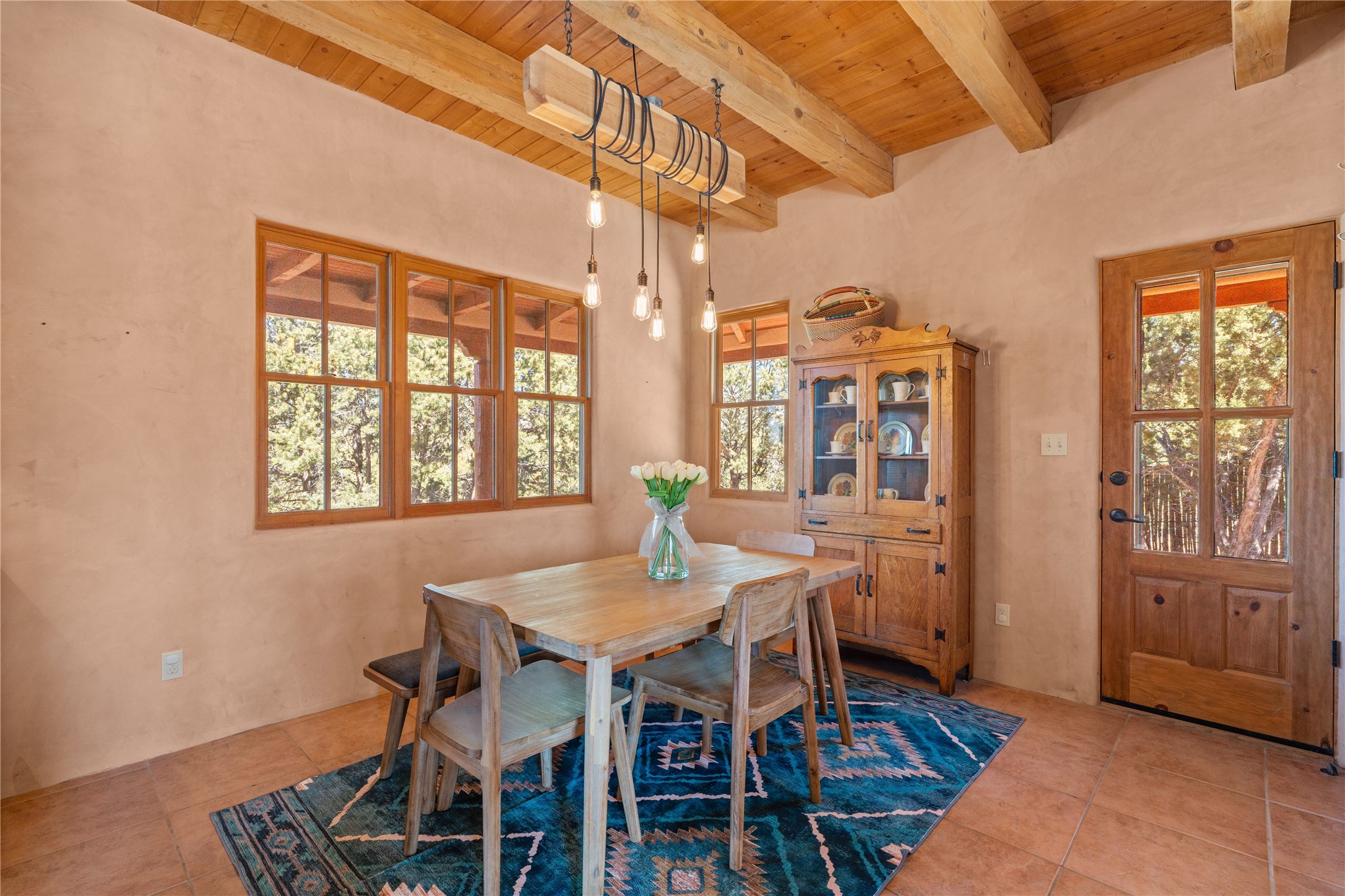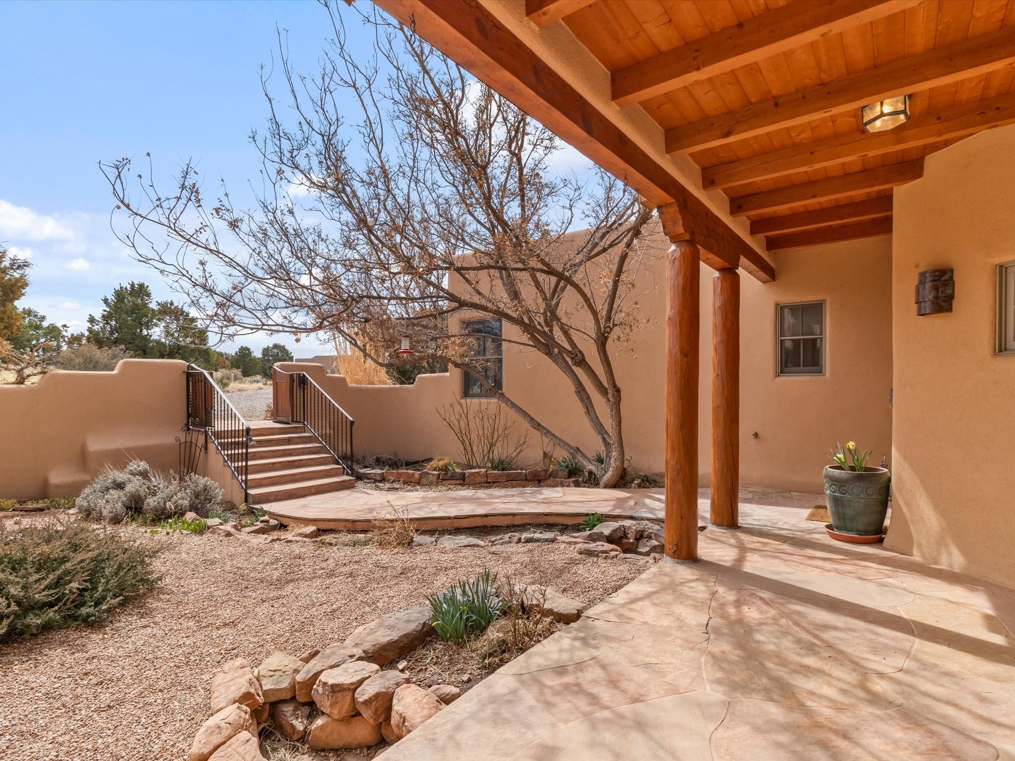Santa Fe Sanctuary - located in the gated community of Alteza Estates just 20 minutes from the Historic Santa Fe Plaza. This stunning home boasts a living room with soaring ceilings, exposed Vigas and cozy wood-burning fireplace, perfect for gathering on chilly evenings or a blue sky summer's day. The recently remodeled kitchen is a chef's delight featuring sparkling quartz countertops, a designer tile backsplash, convenient island, electric induction range (propane stub in place), custom cabinetry with pullout shelves and undermount lighting. Enjoy casual meals in the eat-in kitchen or host elegant dinners in the formal dining room just off the kitchen and living area. The thoughtfully designed split floor plan offers privacy and comfort. A secondary bedroom and bath plus office are situated on a separate wing from the primary suite. Retreat to your private luxurious suite, featuring a wood-burning Kiva fireplace and french doors leading to a covered patio. Spa like primary bathroom with jacuzzi tub, oversized walk-in shower, dual sinks, and spacious walk-in closet. Custom details throughout this home: classic plaster walls in select areas, solid wood custom doors, ample built-in cabinetry, additional storage, and hard floor surfaces throughout. Two additional bedrooms with shared hallway bathroom. Laundry room with sink and built-ins. Property includes El Dorado water and access to Xfinity services. Stay comfortable year-round with new mini-split units installed in 2024, new boiler installed in 2025, and new tankless water heater in 2024. Outdoor living with expansive covered patio and enclosed yard, stunning views and unparalleled privacy. A front enclosed courtyard offers a welcoming entrance with lush landscaping. Oversized 2-car garage includes a workspace, storage room and EV receptacle. Experience Santa Fe living at its very finest!