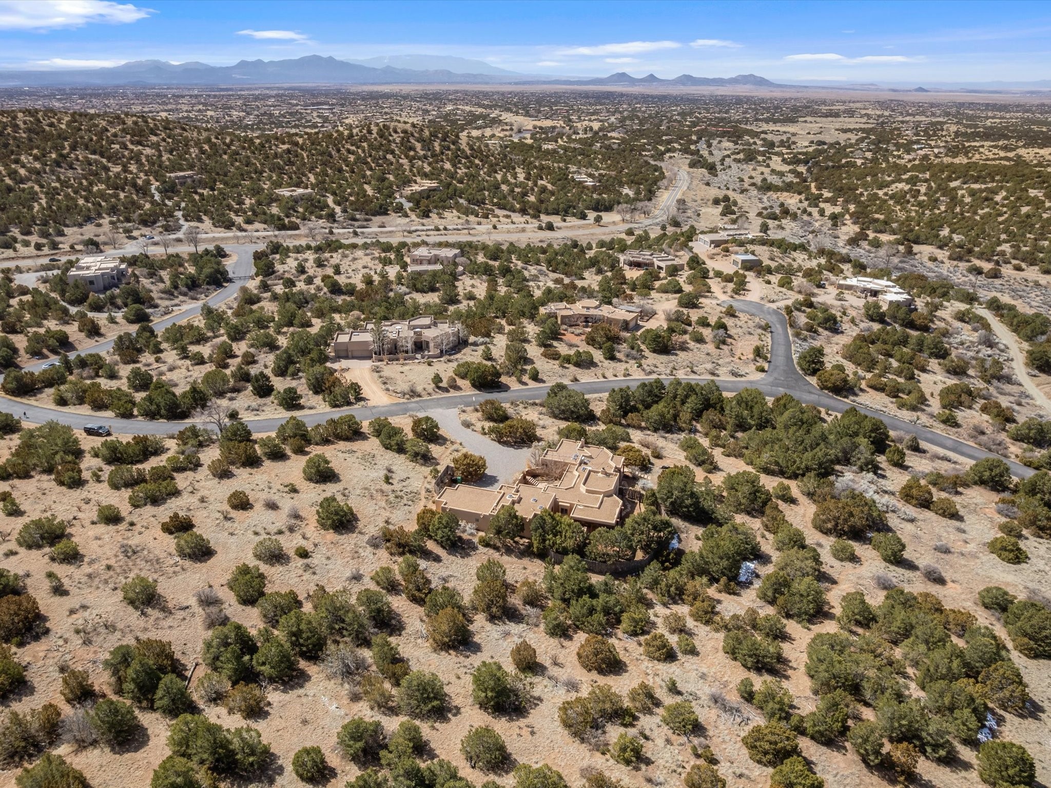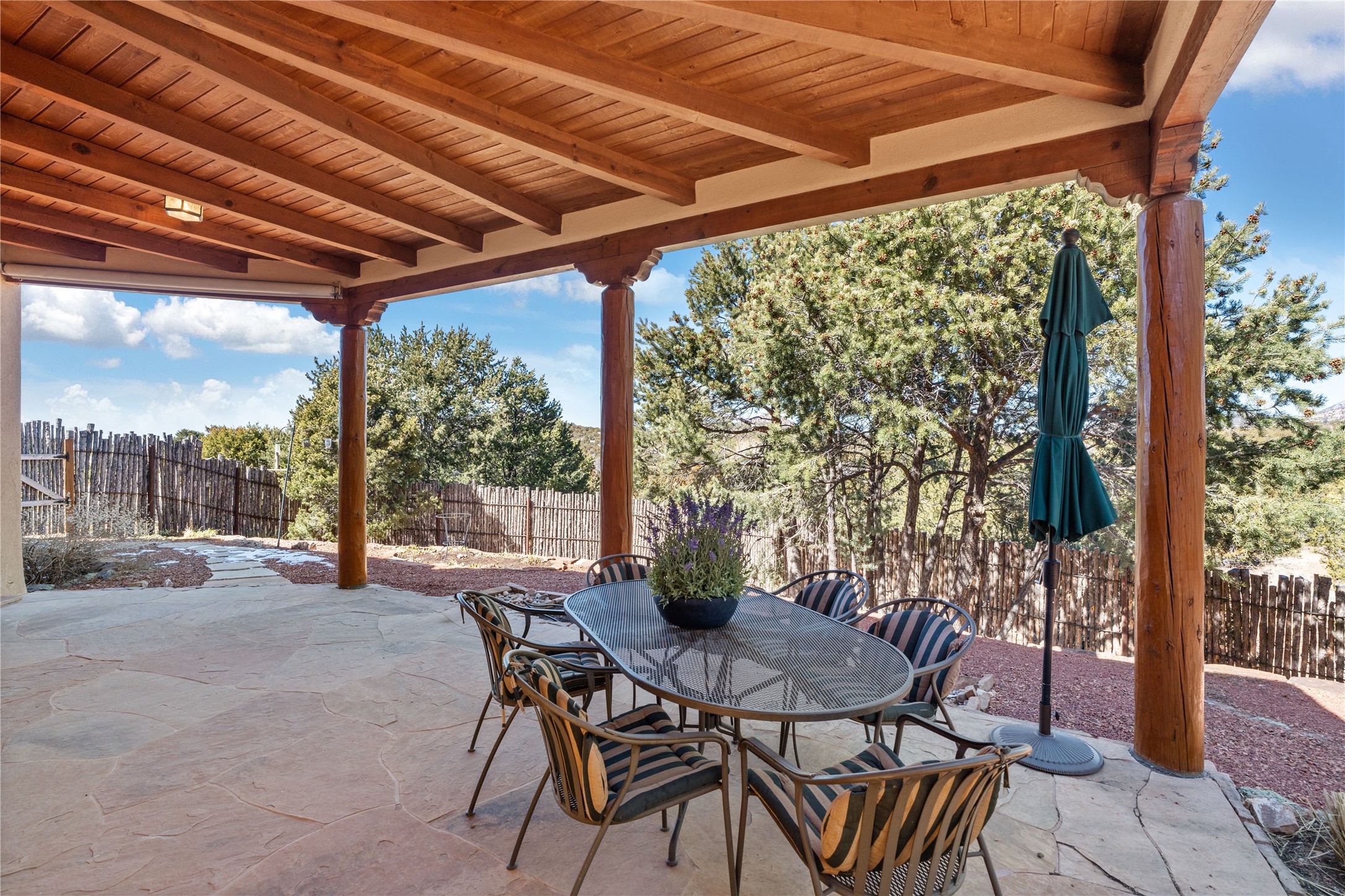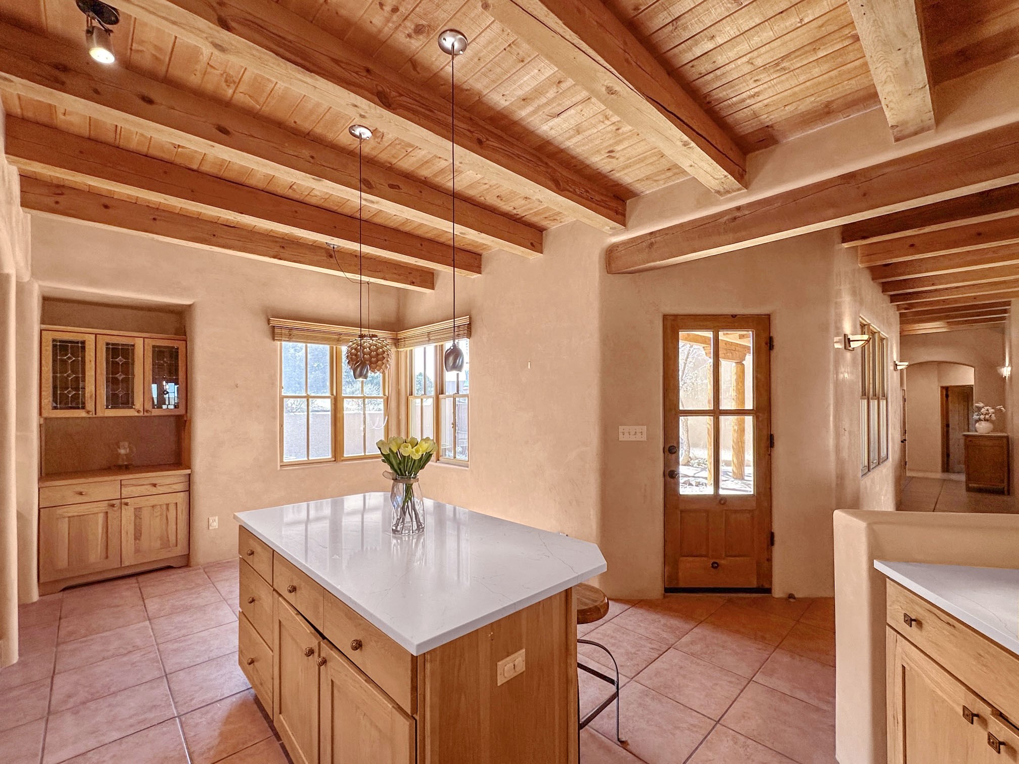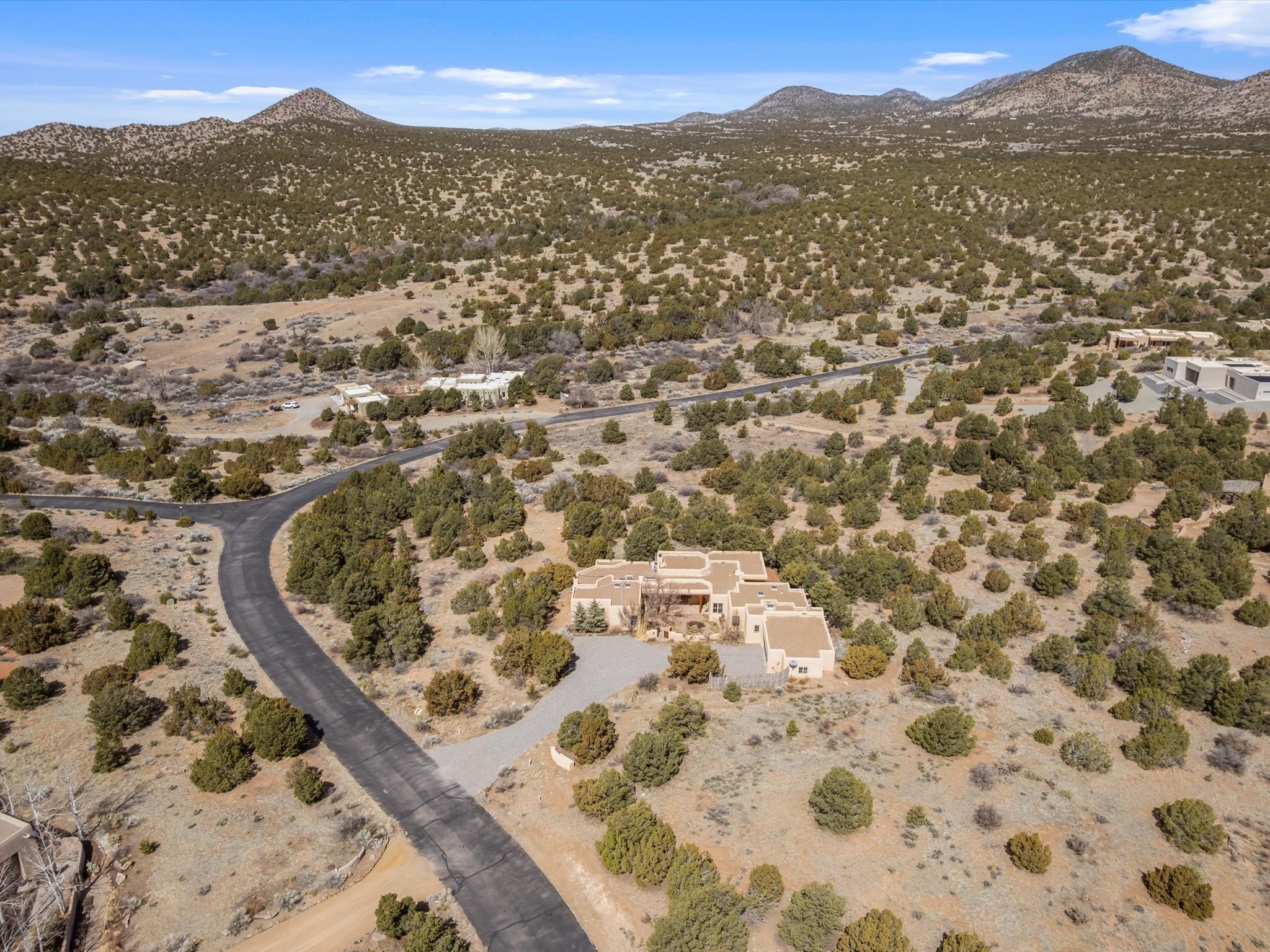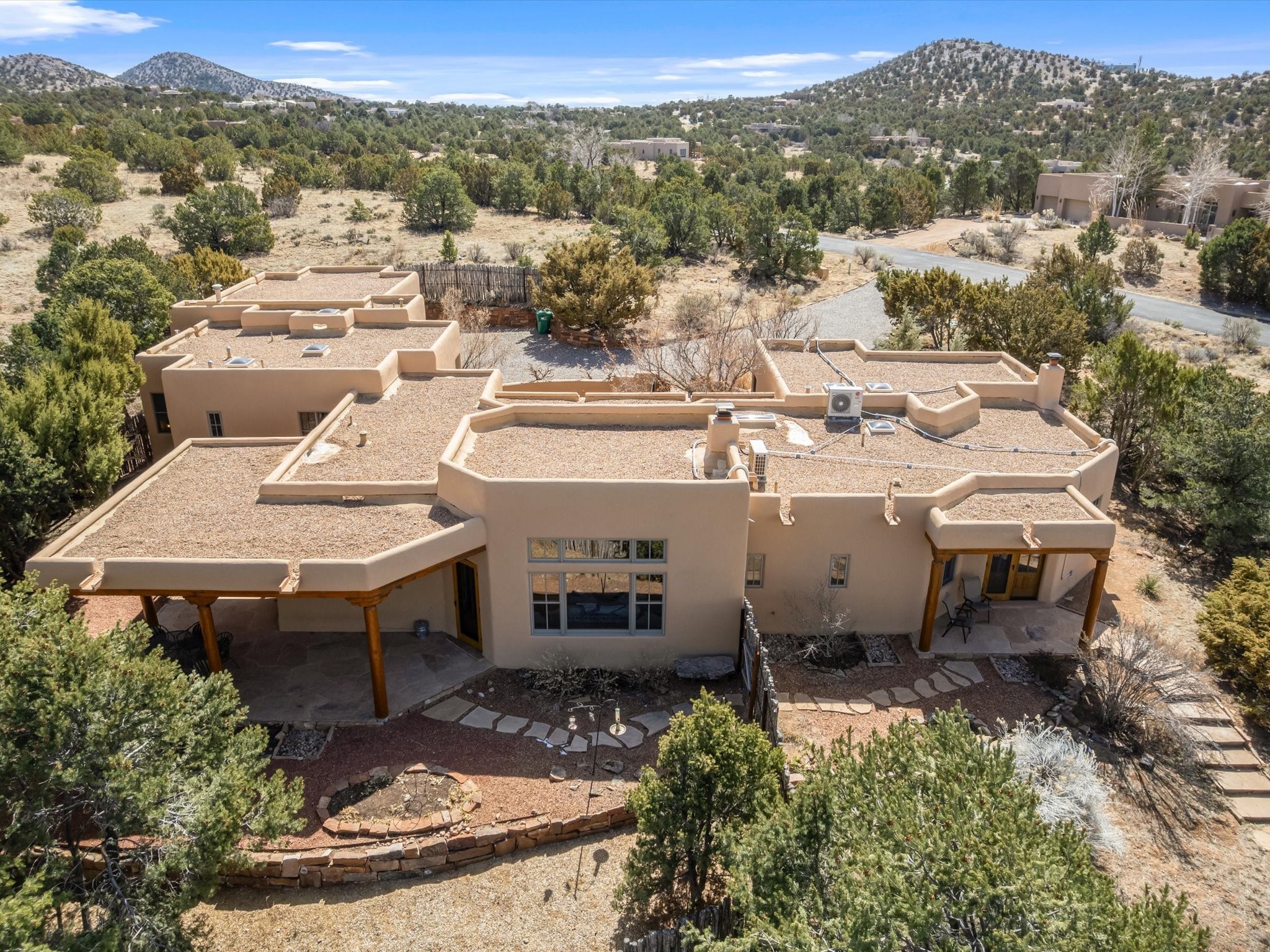 Santa Fe Sanctuary - located in the gated community of Alteza Estates just 20 minutes from the Historic Santa Fe Plaza. This stunning home boasts a living room with soaring ceilings, exposed Vigas and cozy wood-burning fireplace, perfect for gathering on chilly evenings or a blue sky summer's day. The recently remodeled kitchen is a chef's delight featuring sparkling quartz countertops, a designer tile backsplash, convenient island, electric induction range (propane stub in place), custom cabinetry with pullout shelves and undermount lighting. Enjoy casual meals in the eat-in kitchen or host elegant dinners in the formal dining room just off the kitchen and living area. The thoughtfully designed split floor plan offers privacy and comfort. A secondary bedroom and bath plus office are situated on a separate wing from the primary suite. Retreat to your private luxurious suite, featuring a wood-burning Kiva fireplace and french doors leading to a covered patio. Spa like primary bathroom with jacuzzi tub, oversized walk-in shower, dual sinks, and spacious walk-in closet. Custom details throughout this home: classic plaster walls in select areas, solid wood custom doors, ample built-in cabinetry, additional storage, and hard floor surfaces throughout. Two additional bedrooms with shared hallway bathroom. Laundry room with sink and built-ins. Property includes El Dorado water and access to Xfinity services. Stay comfortable year-round with new mini-split units installed in 2024, new boiler installed in 2025, and new tankless water heater in 2024. Outdoor living with expansive covered patio and enclosed yard, stunning views and unparalleled privacy. A front enclosed courtyard offers a welcoming entrance with lush landscaping. Oversized 2-car garage includes a workspace, storage room and EV receptacle. Experience Santa Fe living at its very finest!