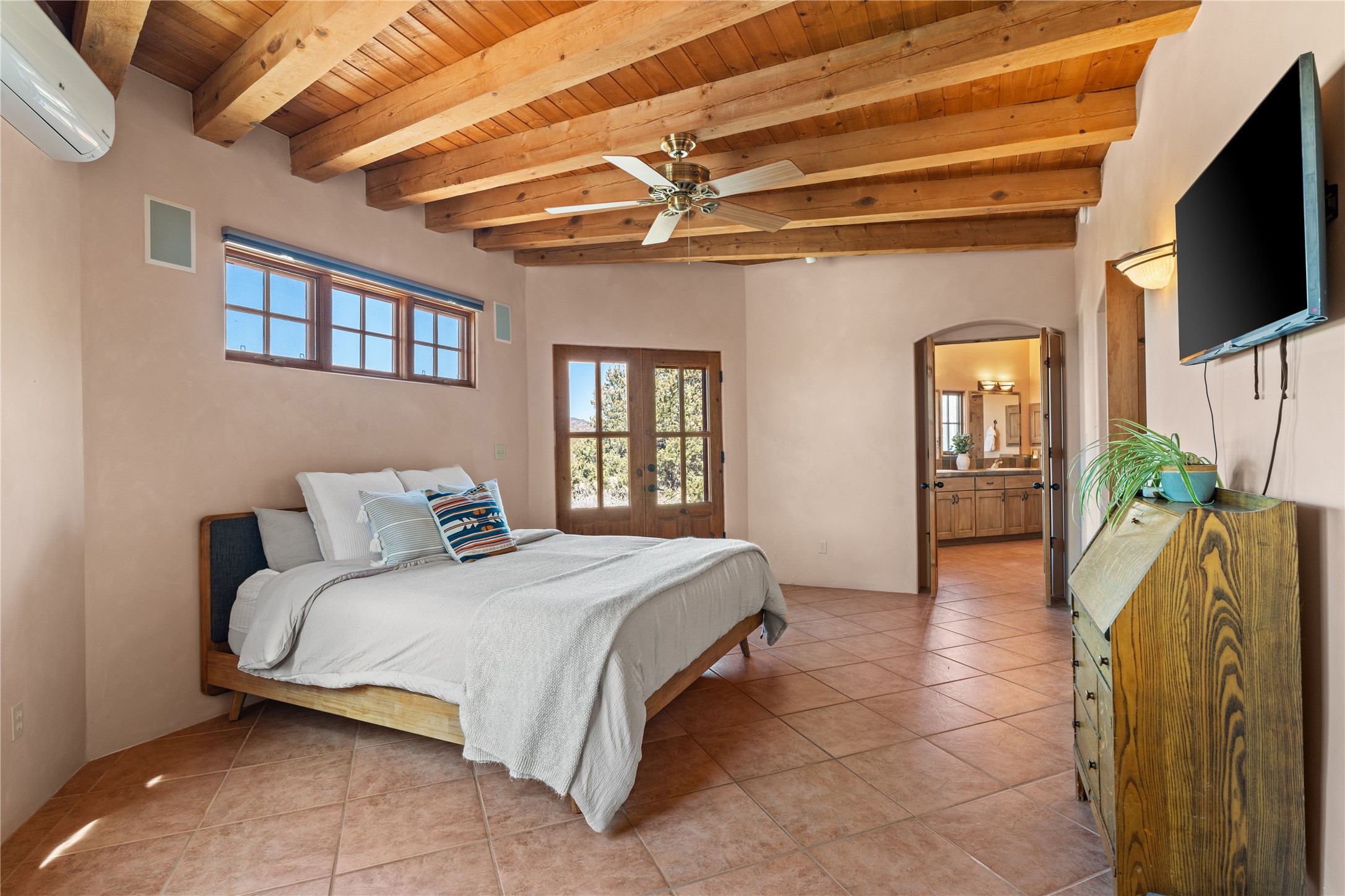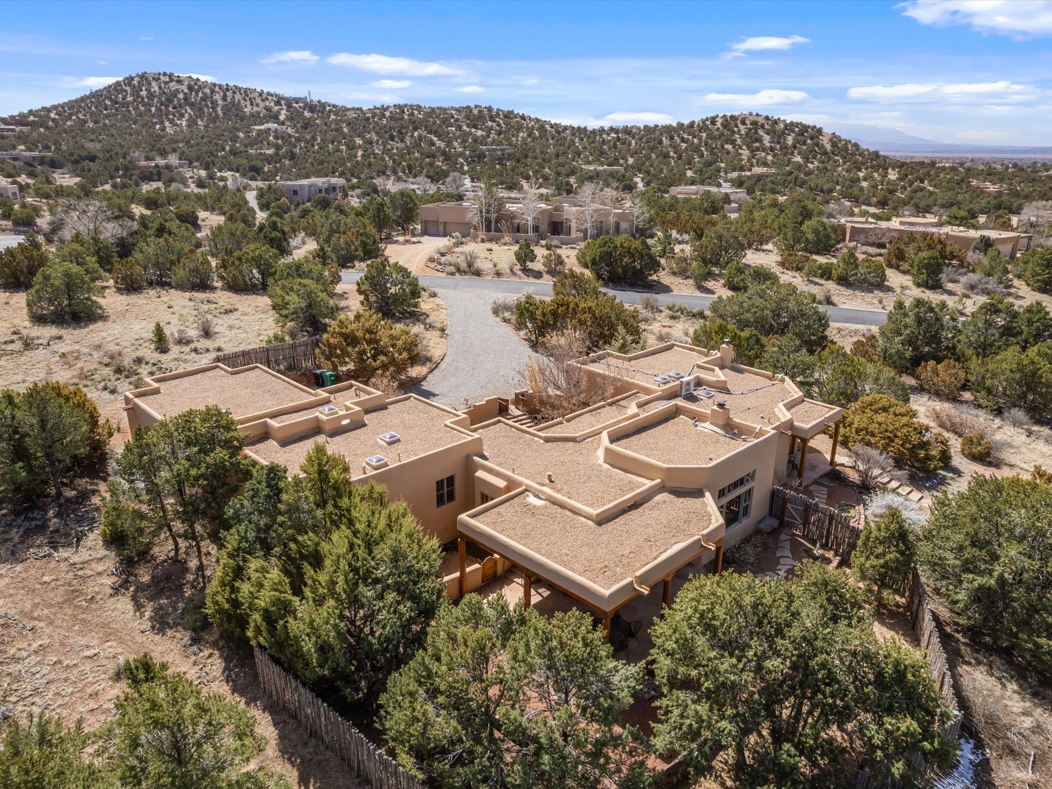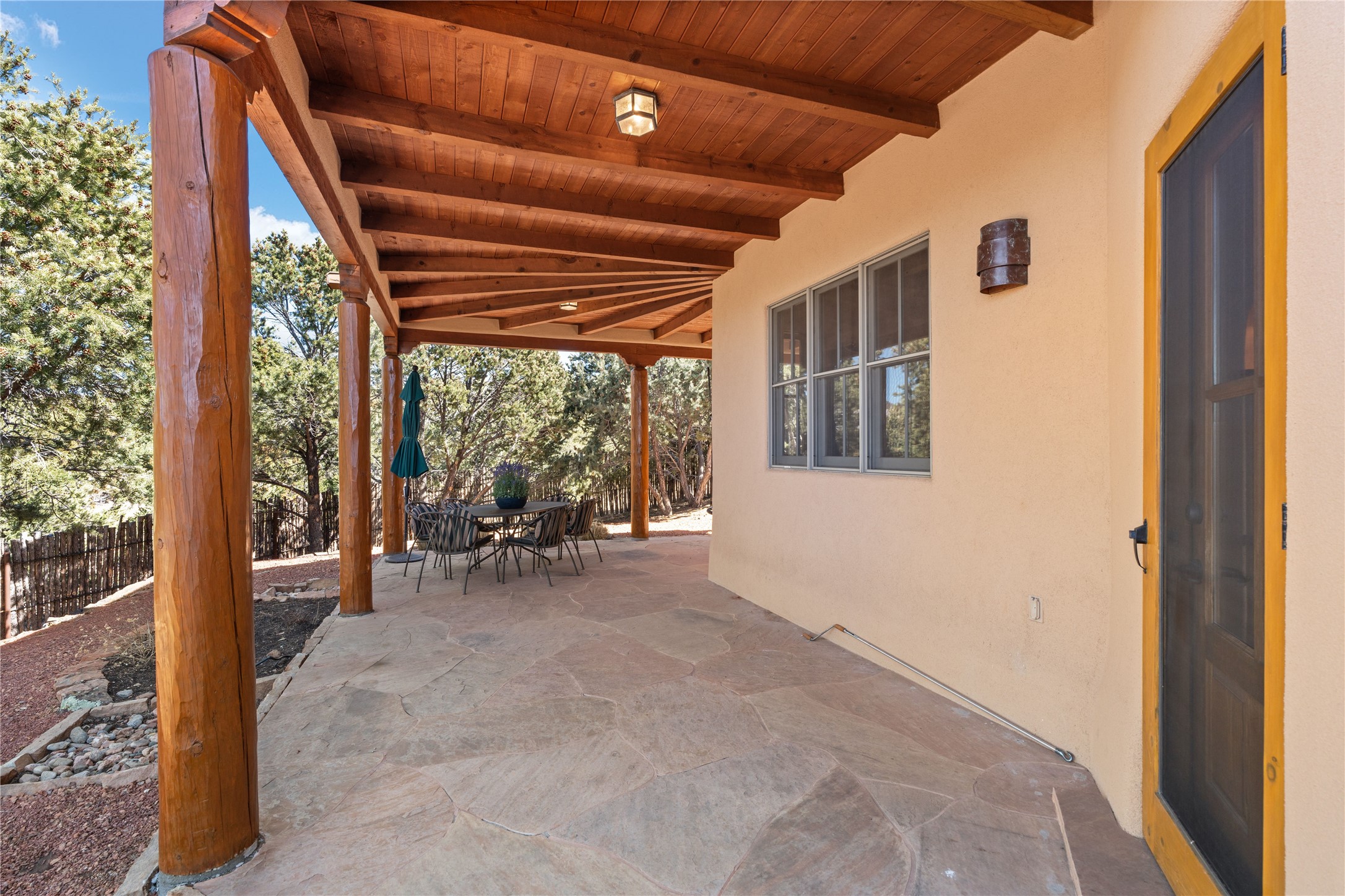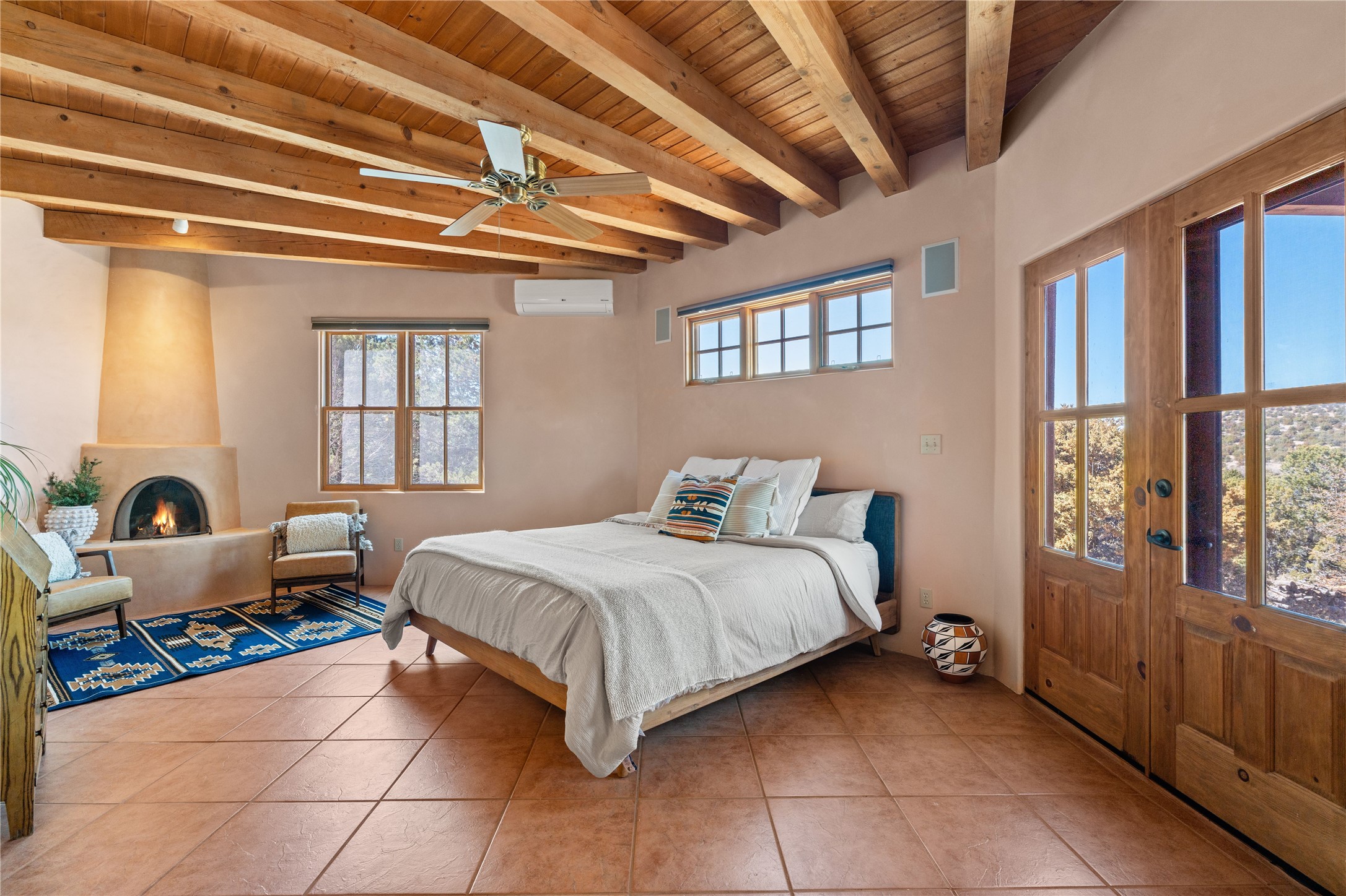 Santa Fe Sanctuary - located in the gated community of Alteza Estates just 20 minutes from the Historic Santa Fe Plaza. This stunning home boasts a living room with soaring ceilings, exposed Vigas and cozy wood-burning fireplace, perfect for gathering on chilly evenings or a blue sky summer's day. The recently remodeled kitchen is a chef's delight featuring sparkling quartz countertops, a designer tile backsplash, convenient island, electric induction range (propane stub in place), custom cabinetry with pullout shelves and undermount lighting. Enjoy casual meals in the eat-in kitchen or host elegant dinners in the formal dining room just off the kitchen and living area. The thoughtfully designed split floor plan offers privacy and comfort. A secondary bedroom and bath plus office are situated on a separate wing from the primary suite. Retreat to your private luxurious suite, featuring a wood-burning Kiva fireplace and french doors leading to a covered patio. Spa like primary bathroom with jacuzzi tub, oversized walk-in shower, dual sinks, and spacious walk-in closet. Custom details throughout this home: classic plaster walls in select areas, solid wood custom doors, ample built-in cabinetry, additional storage, and hard floor surfaces throughout. Two additional bedrooms with shared hallway bathroom. Laundry room with sink and built-ins. Property includes El Dorado water and access to Xfinity services. Stay comfortable year-round with new mini-split units installed in 2024, new boiler installed in 2025, and new tankless water heater in 2024. Outdoor living with expansive covered patio and enclosed yard, stunning views and unparalleled privacy. A front enclosed courtyard offers a welcoming entrance with lush landscaping. Oversized 2-car garage includes a workspace, storage room and EV receptacle. Experience Santa Fe living at its very finest!
