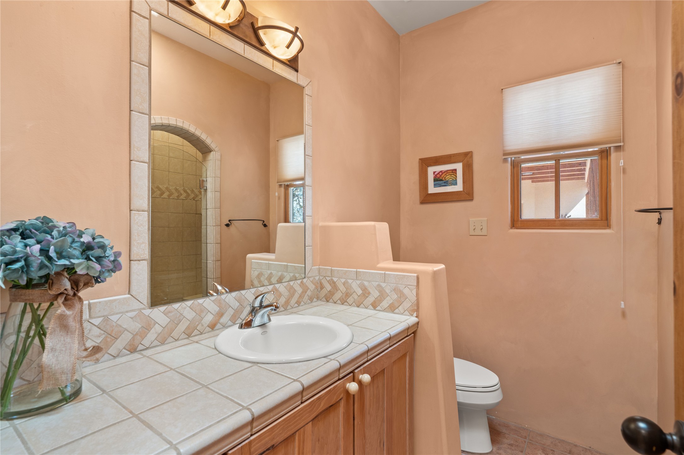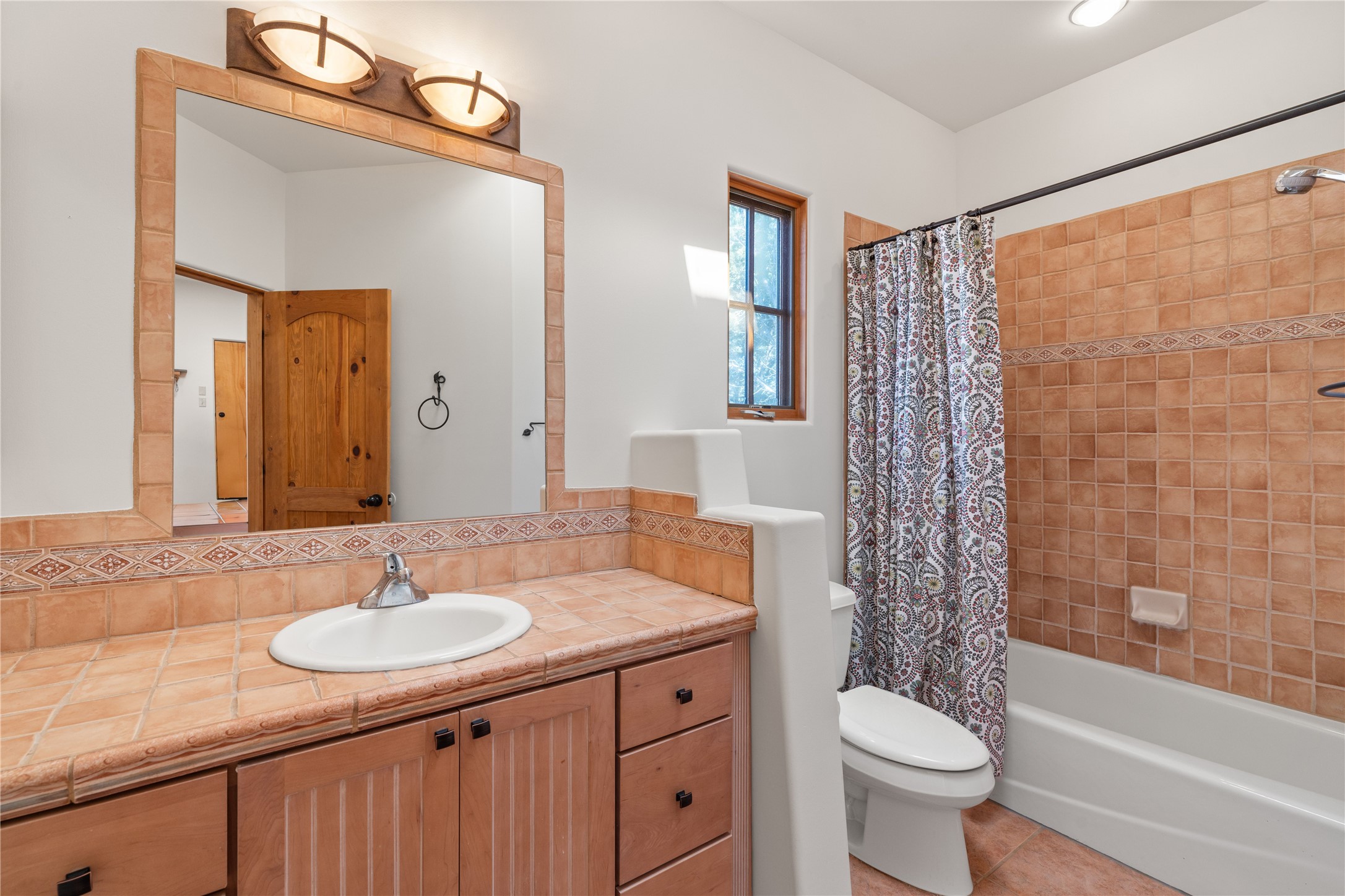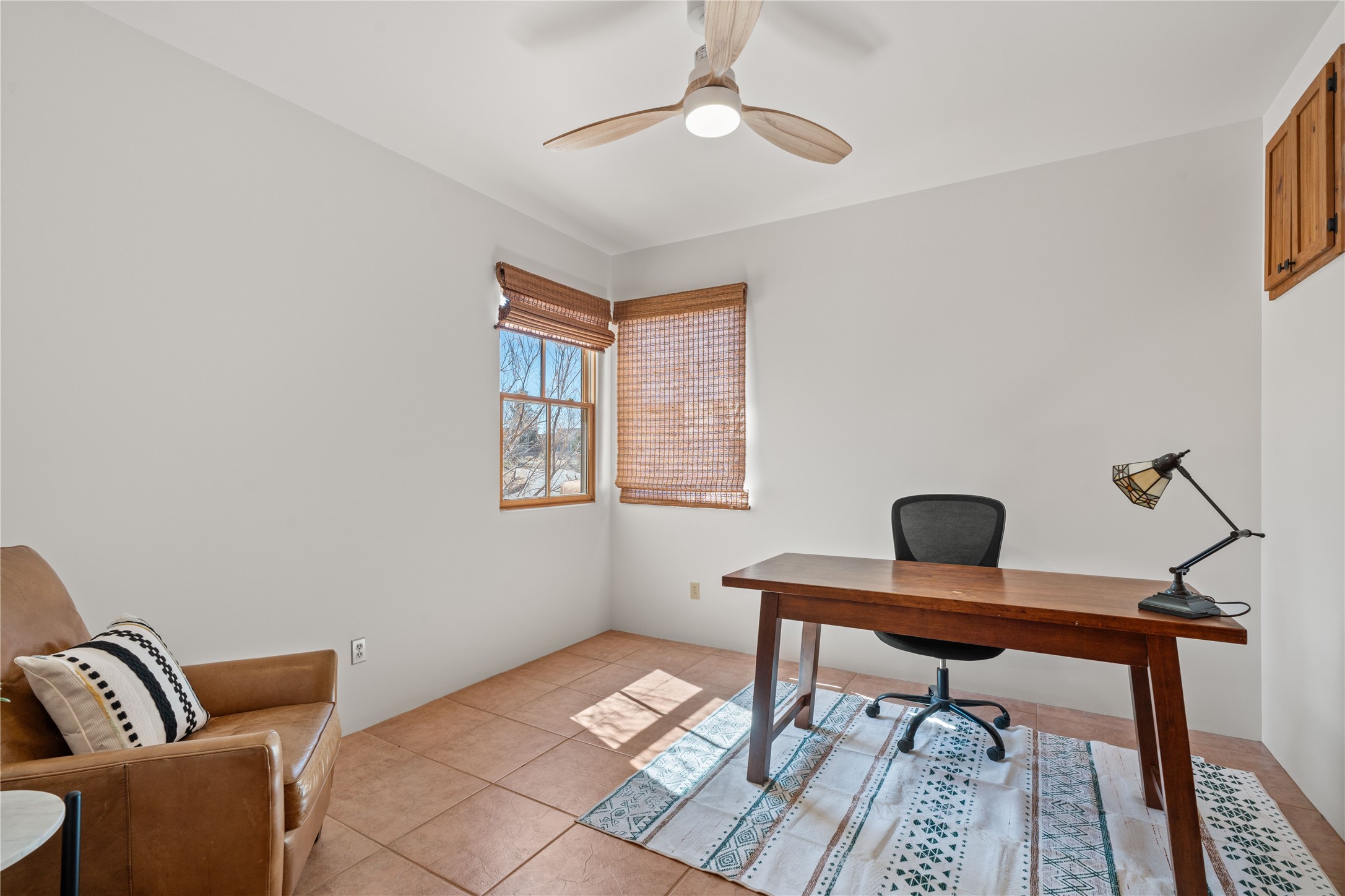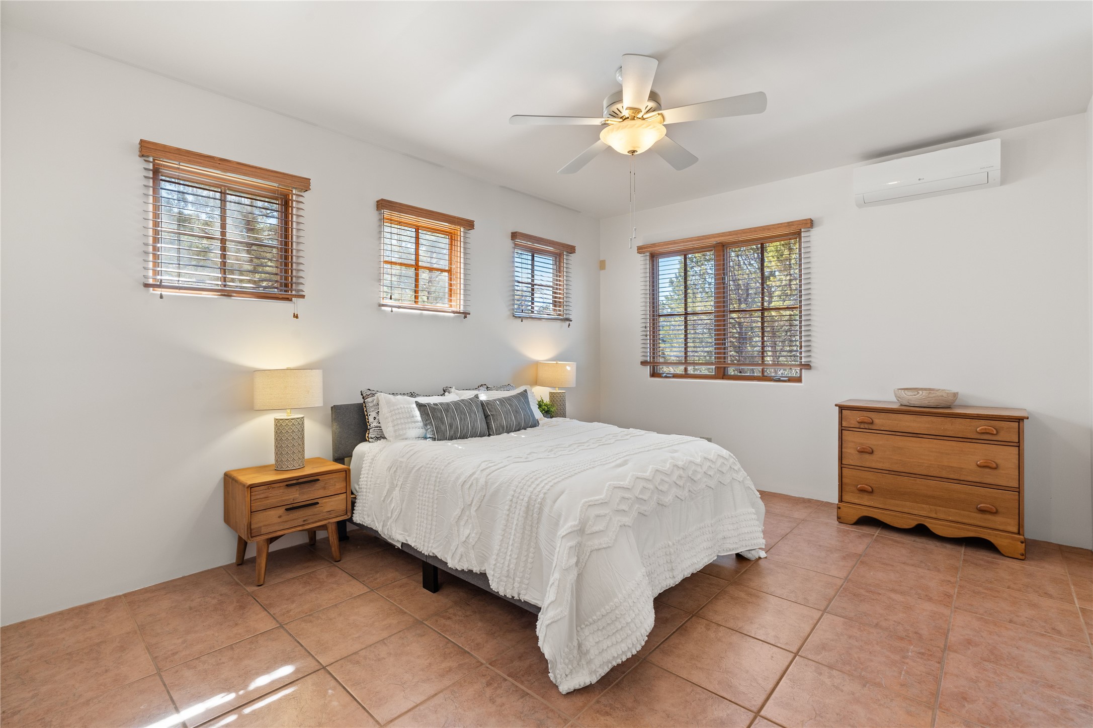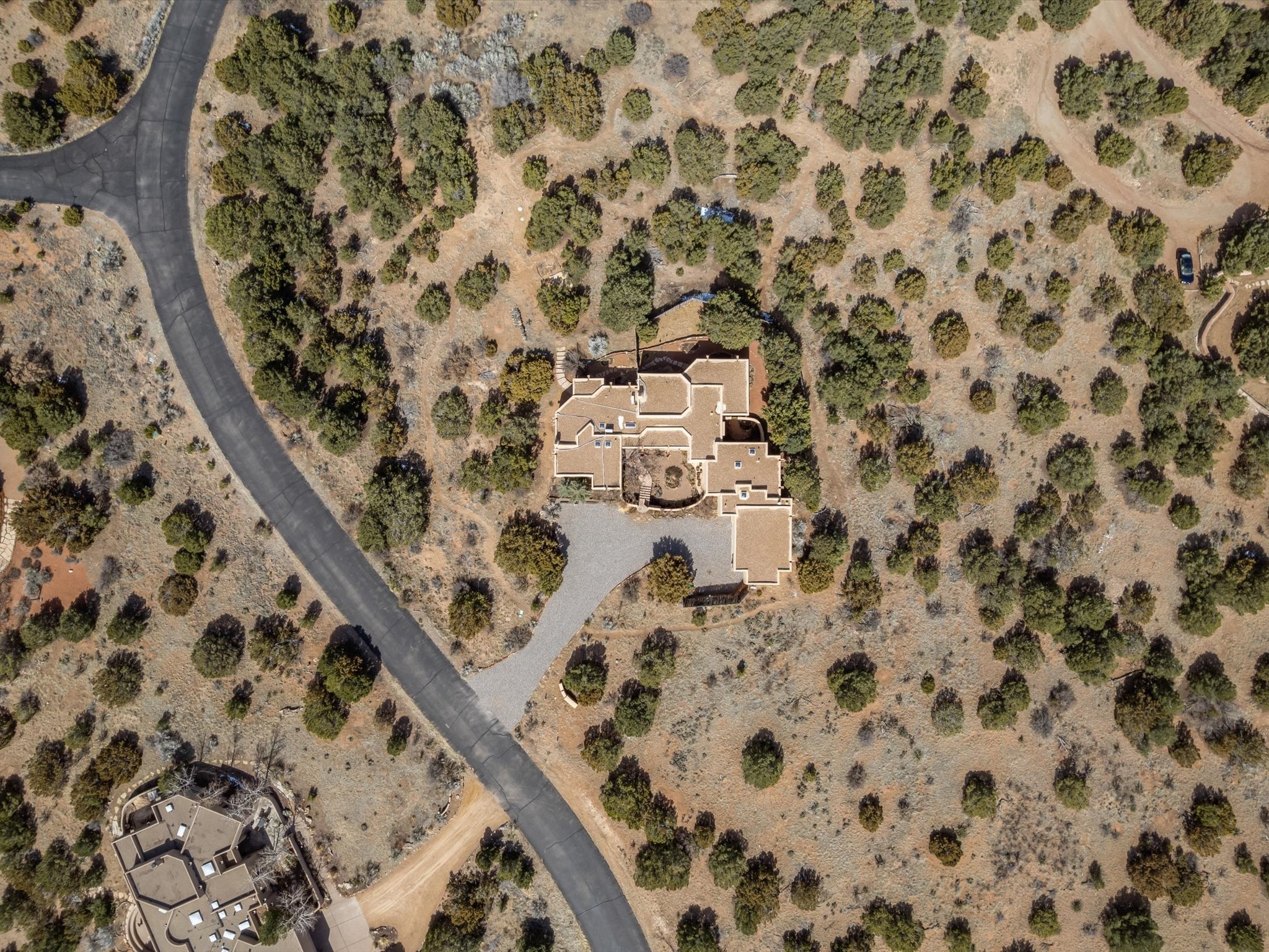 Santa Fe Sanctuary - located in the gated community of Alteza Estates just 20 minutes from the Historic Santa Fe Plaza. This stunning home boasts a living room with soaring ceilings, exposed Vigas and cozy wood-burning fireplace, perfect for gathering on chilly evenings or a blue sky summer's day. The recently remodeled kitchen is a chef's delight featuring sparkling quartz countertops, a designer tile backsplash, convenient island, electric induction range (propane stub in place), custom cabinetry with pullout shelves and undermount lighting. Enjoy casual meals in the eat-in kitchen or host elegant dinners in the formal dining room just off the kitchen and living area. The thoughtfully designed split floor plan offers privacy and comfort. A secondary bedroom and bath plus office are situated on a separate wing from the primary suite. Retreat to your private luxurious suite, featuring a wood-burning Kiva fireplace and french doors leading to a covered patio. Spa like primary bathroom with jacuzzi tub, oversized walk-in shower, dual sinks, and spacious walk-in closet. Custom details throughout this home: classic plaster walls in select areas, solid wood custom doors, ample built-in cabinetry, additional storage, and hard floor surfaces throughout. Two additional bedrooms with shared hallway bathroom. Laundry room with sink and built-ins. Property includes El Dorado water and access to Xfinity services. Stay comfortable year-round with new mini-split units installed in 2024, new boiler installed in 2025, and new tankless water heater in 2024. Outdoor living with expansive covered patio and enclosed yard, stunning views and unparalleled privacy. A front enclosed courtyard offers a welcoming entrance with lush landscaping. Oversized 2-car garage includes a workspace, storage room and EV receptacle. Experience Santa Fe living at its very finest!