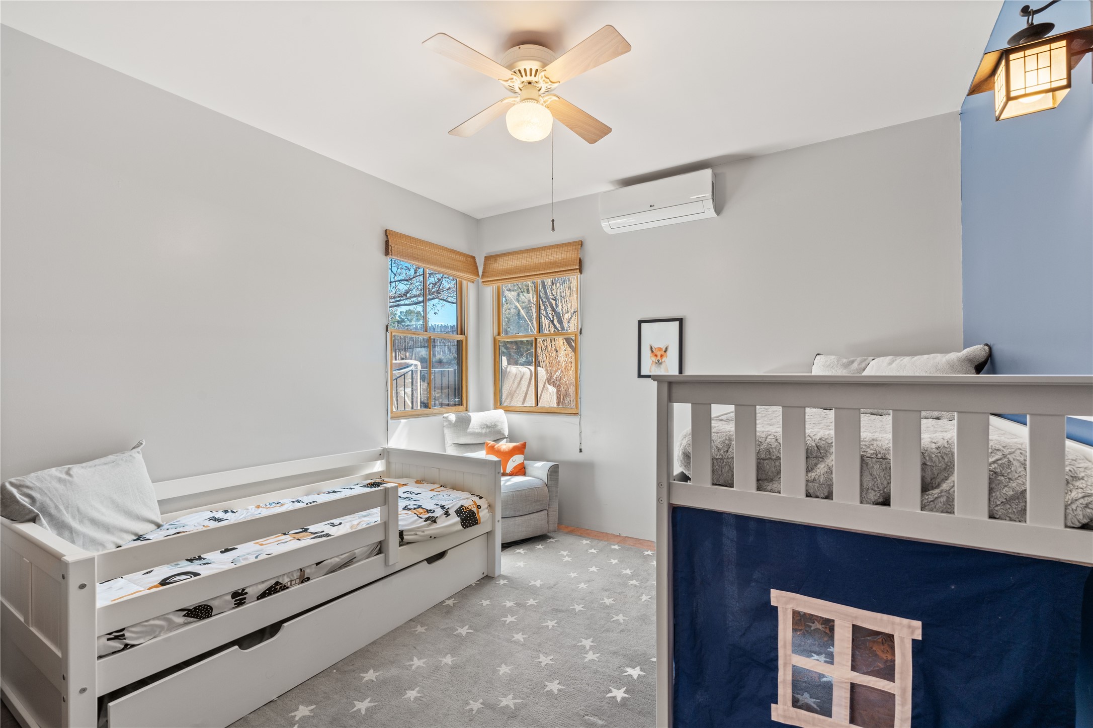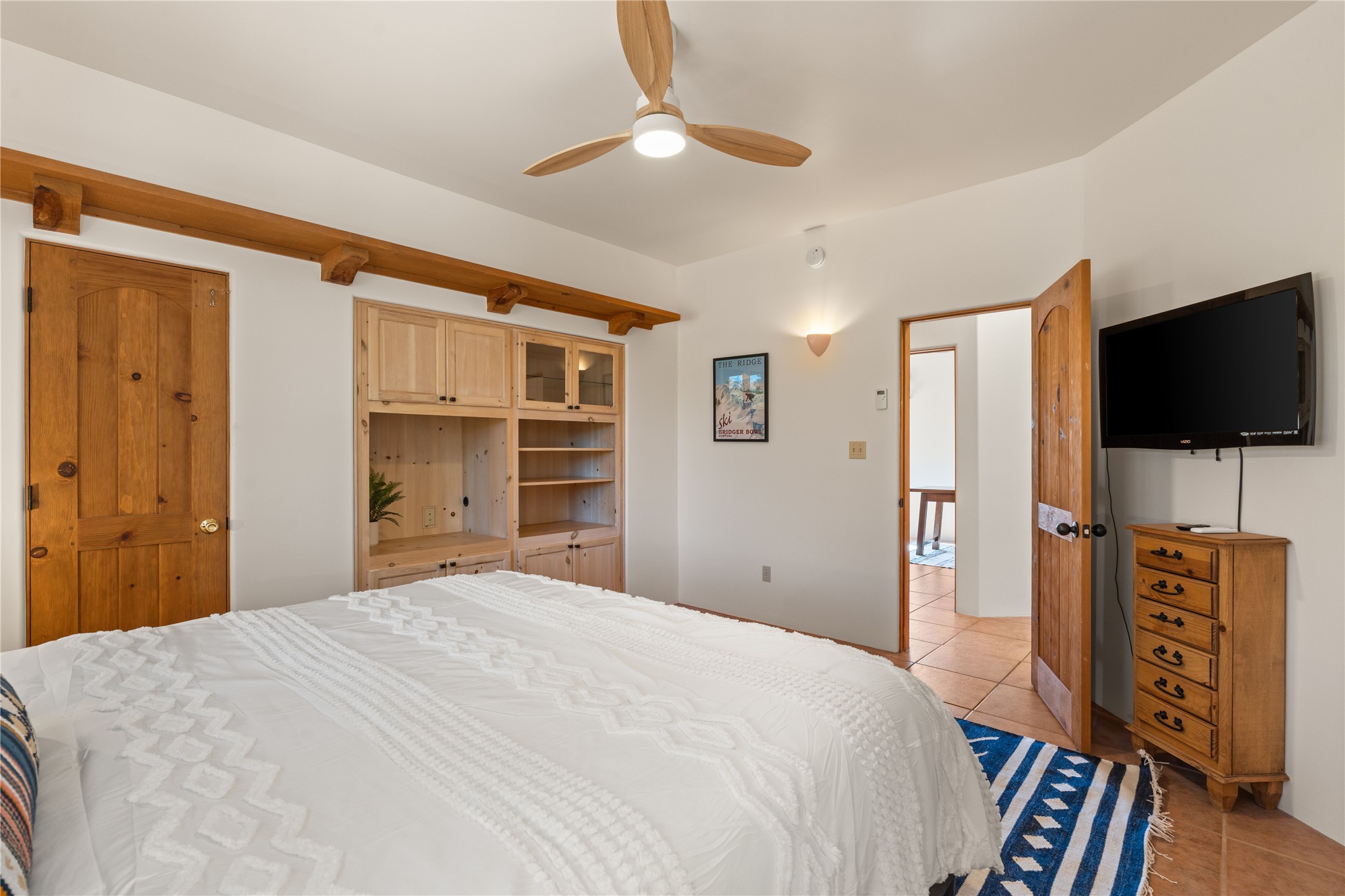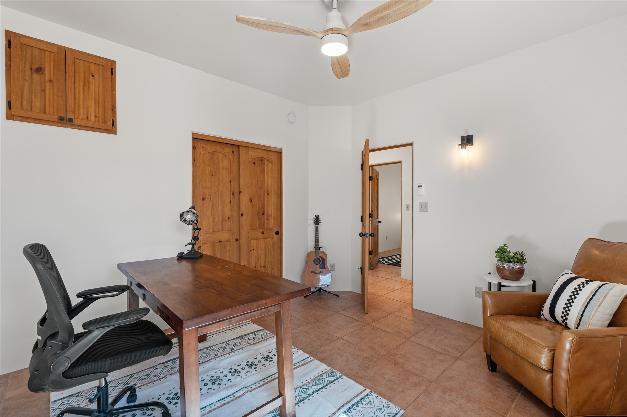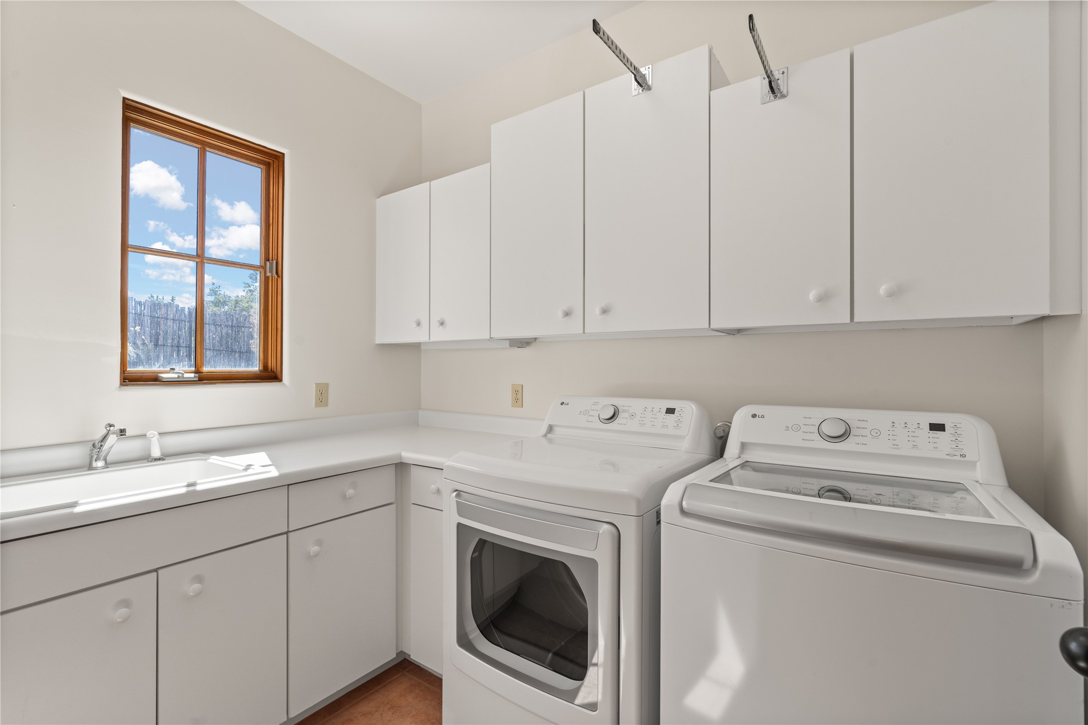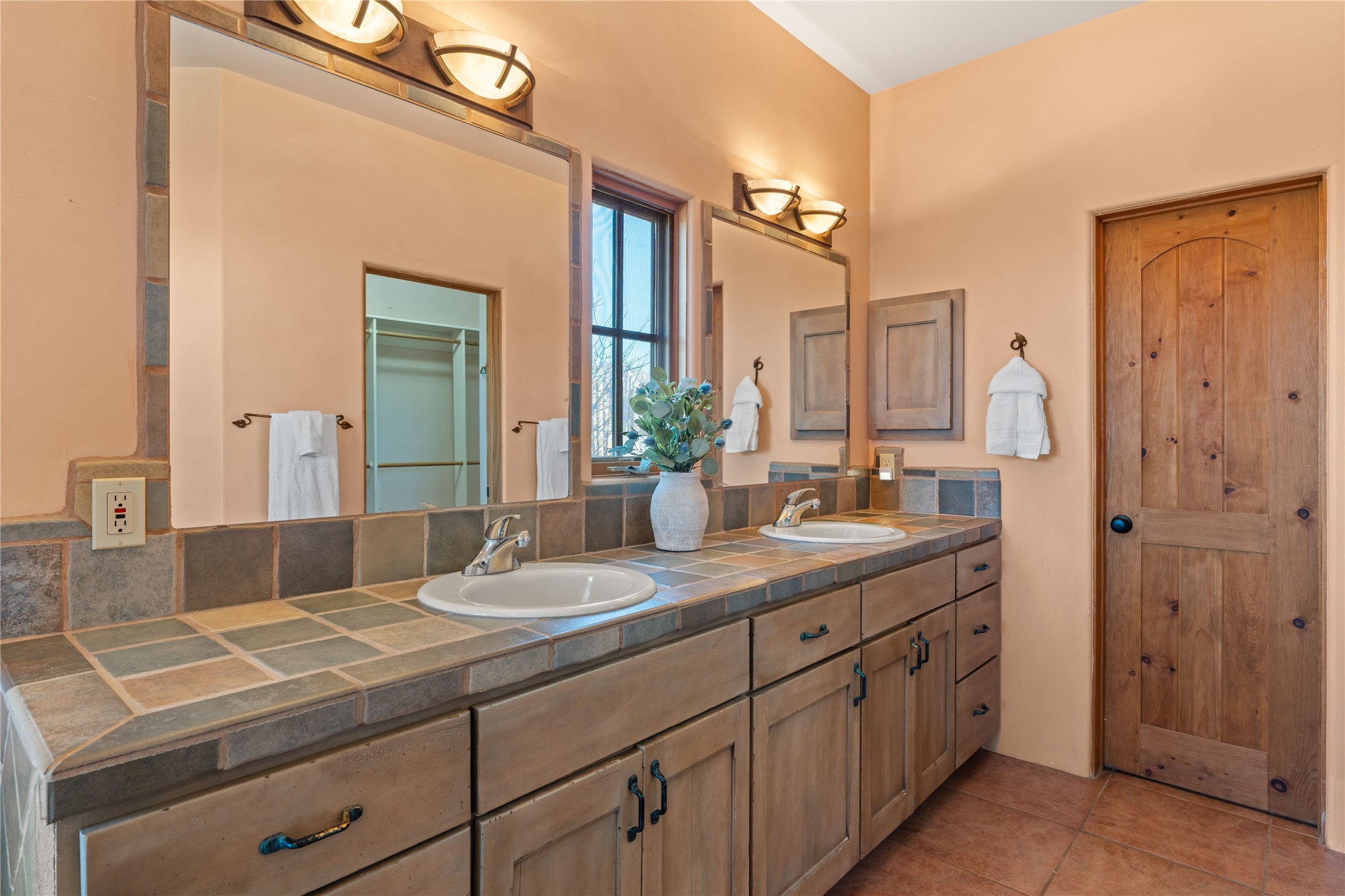 Santa Fe Sanctuary - located in the gated community of Alteza Estates just 20 minutes from the Historic Santa Fe Plaza. This stunning home boasts a living room with soaring ceilings, exposed Vigas and cozy wood-burning fireplace, perfect for gathering on chilly evenings or a blue sky summer's day. The recently remodeled kitchen is a chef's delight featuring sparkling quartz countertops, a designer tile backsplash, convenient island, electric induction range (propane stub in place), custom cabinetry with pullout shelves and undermount lighting. Enjoy casual meals in the eat-in kitchen or host elegant dinners in the formal dining room just off the kitchen and living area. The thoughtfully designed split floor plan offers privacy and comfort. A secondary bedroom and bath plus office are situated on a separate wing from the primary suite. Retreat to your private luxurious suite, featuring a wood-burning Kiva fireplace and french doors leading to a covered patio. Spa like primary bathroom with jacuzzi tub, oversized walk-in shower, dual sinks, and spacious walk-in closet. Custom details throughout this home: classic plaster walls in select areas, solid wood custom doors, ample built-in cabinetry, additional storage, and hard floor surfaces throughout. Two additional bedrooms with shared hallway bathroom. Laundry room with sink and built-ins. Property includes El Dorado water and access to Xfinity services. Stay comfortable year-round with new mini-split units installed in 2024, new boiler installed in 2025, and new tankless water heater in 2024. Outdoor living with expansive covered patio and enclosed yard, stunning views and unparalleled privacy. A front enclosed courtyard offers a welcoming entrance with lush landscaping. Oversized 2-car garage includes a workspace, storage room and EV receptacle. Experience Santa Fe living at its very finest!