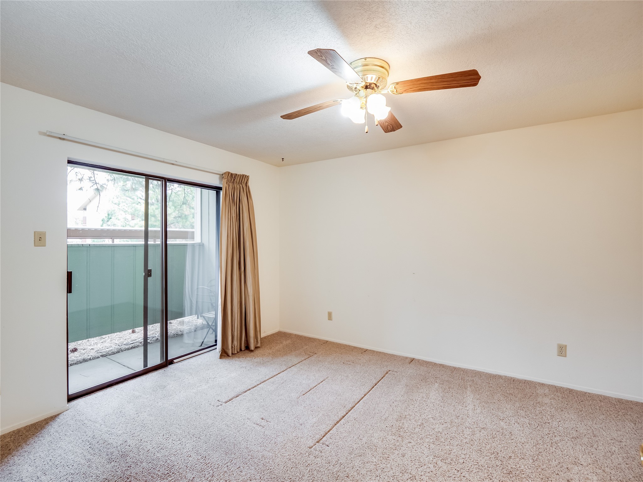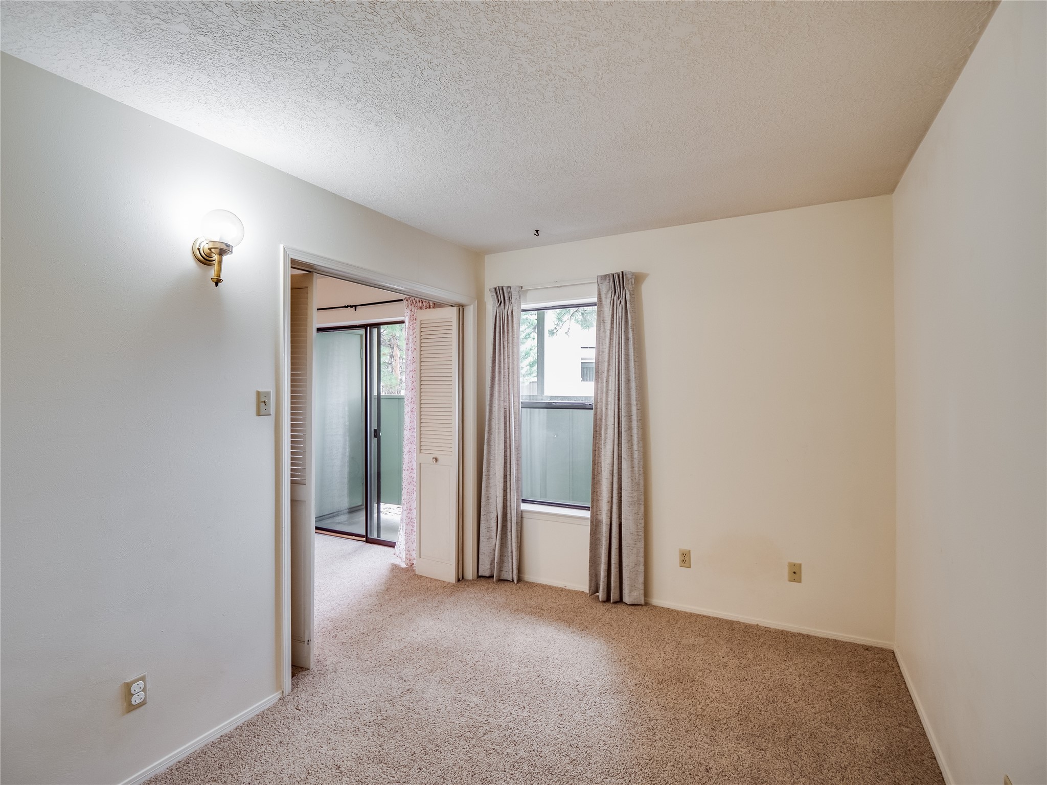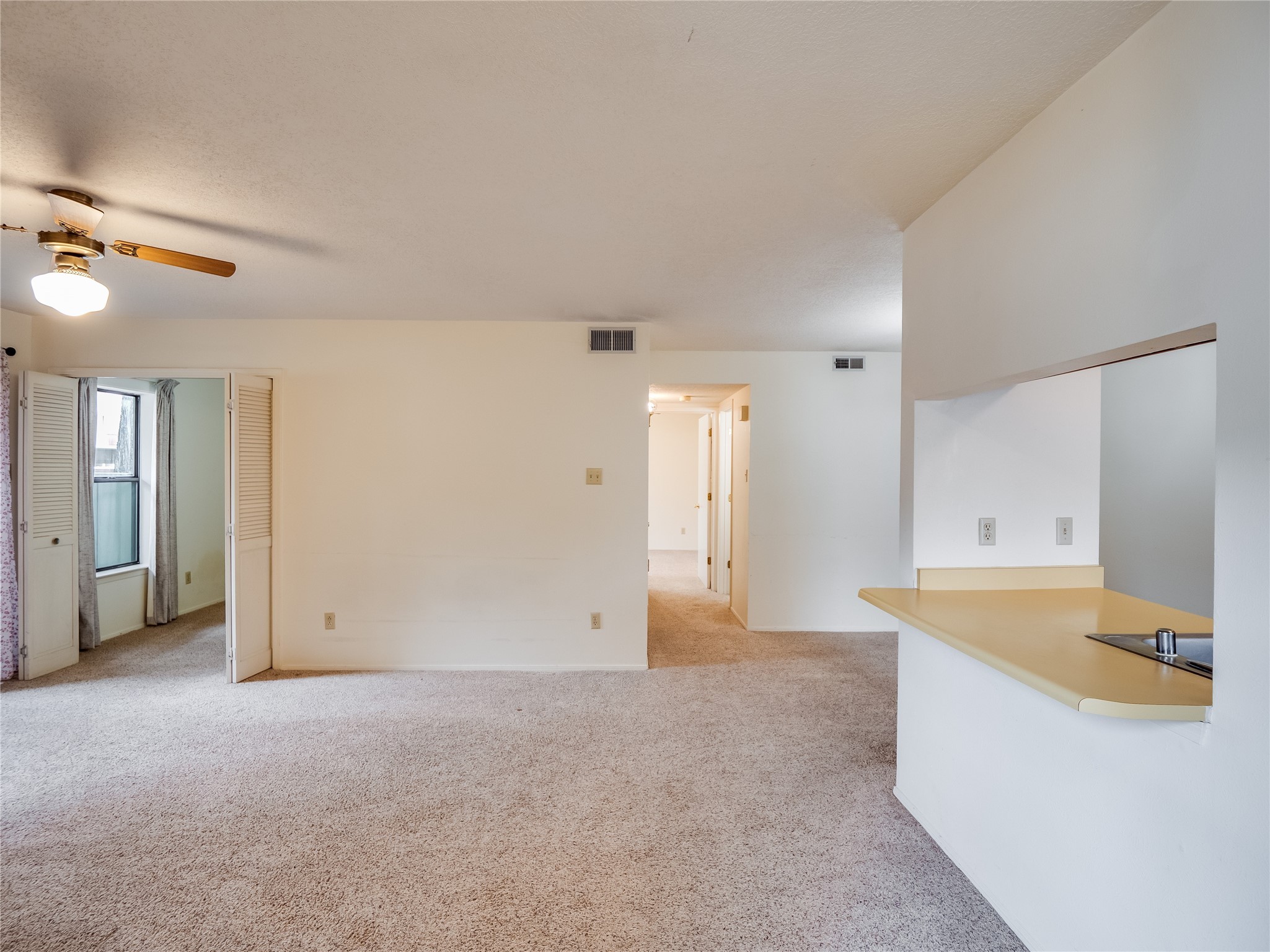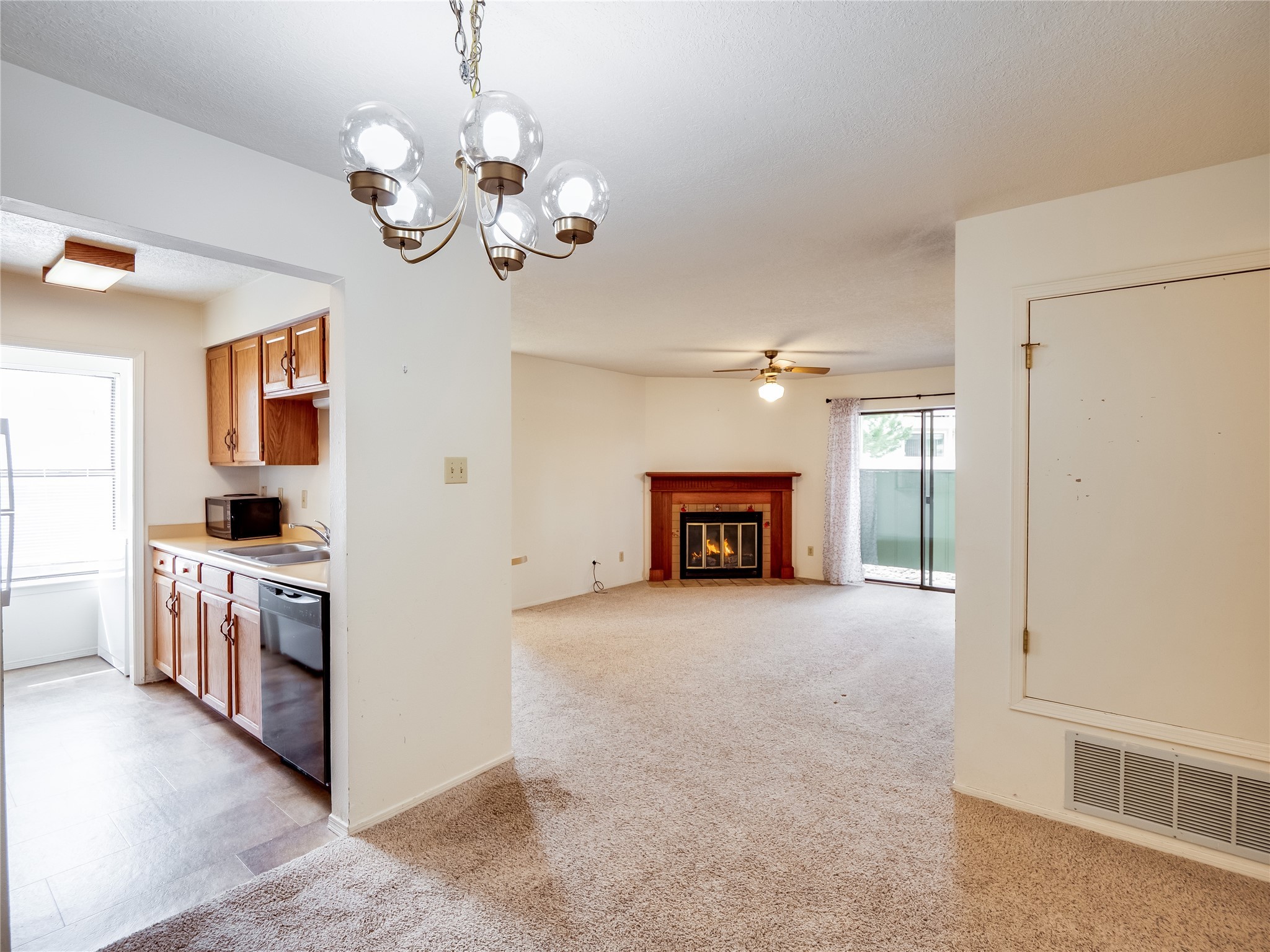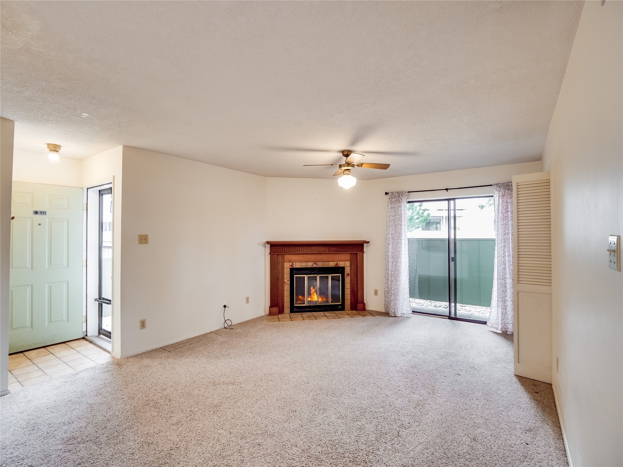 Charming ground-level end unit condo in a prime Eastern Area neighborhood! This delightful condo offers a blend of comfort and convenience. Located near the community center, residents can enjoy access to a pool, common gathering spaces, a grill, and a fire pit--perfect for relaxing or entertaining. Enter a welcoming entryway with a coat closet before entering the open floor plan. The living room is designed for comfort, featuring plush carpeting, a cozy wood burning fireplace with a classic mantel, and glass sliders that fill the space with natural light and leads to a covered, enclosed patio. This private outdoor space is perfect for year-round enjoyment, perfect for a small seating area or potted plants making it an ideal spot for morning coffee or an evening unwind. A convenient storage closet on the patio ensures extra space for seasonal items, outdoor gear, or gardening supplies. Adjacent to the living room is a guest bedroom offering flexibility as a home office. Whether you need a private workspace, a cozy reading nook, or a guest retreat, this space adapts to your lifestyle needs. The dining space flows seamlessly into the kitchen, which boasts warm wood cabinetry with black hardware, a pantry/laundry closet with a washer and dryer, and a convenient pass-through window that doubles as bar seating. Down the hallway, you'll find the spacious primary bedroom, complete with its own private enclosed covered patio, a walk-in closet, and a separate single-sink vanity that connects to the main bathroom. The bathroom features tile flooring, an additional single-sink vanity, and a tiled shower/tub combination. This unit also comes with a covered designated parking spot and is situated near shopping, parks, and restaurants, making it an ideal place to call home. Don't miss the opportunity to tour this inviting condo today!