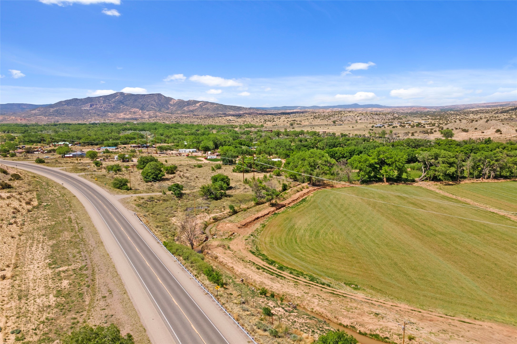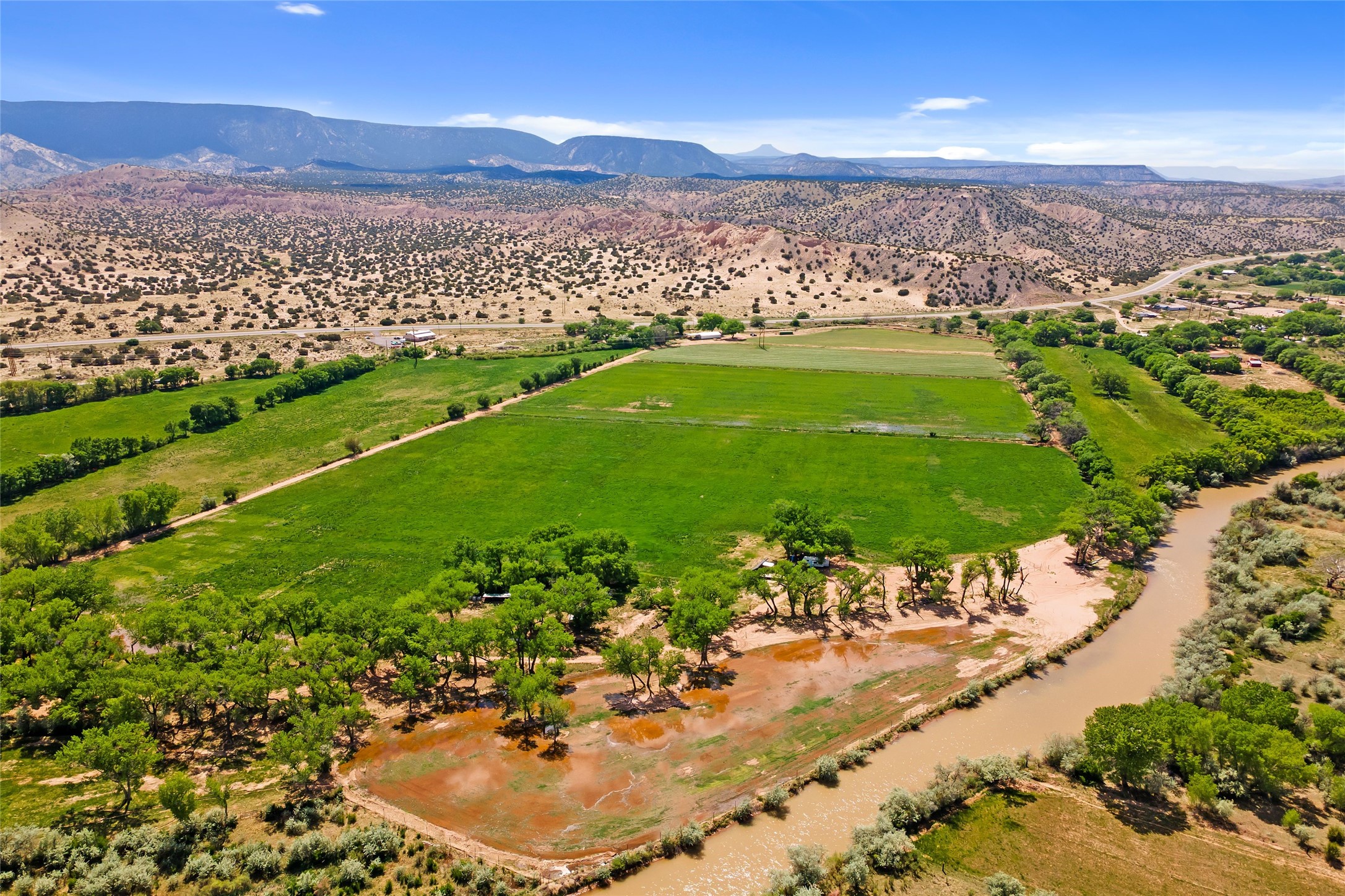 Ideal setting in the Rio Chama Valley for homesite and equestrian facilities with river frontage and stunning views in all directions including barrancas and surrounding mountain ranges. Nestled into a bosque lined with cottonwood trees, willows and native grasses, the property has easy access to riding trails and the Carson National Forest Land. Located just south of Abiquiu, this 53+ acre fertile crop producing farmland with water rights has excellent income potential. Laser-levelled fields, extensive irrigation systems, gates and fencing, solar panels, equipment and storage barn and outbuildings are among the improvements made to this land.