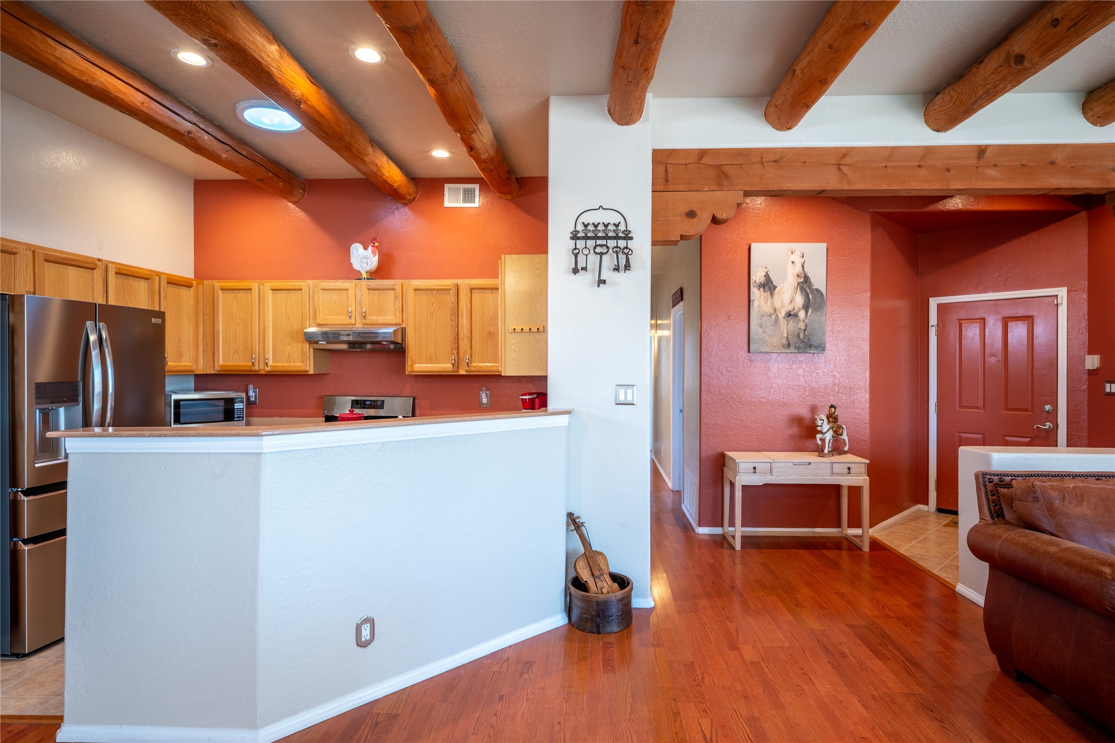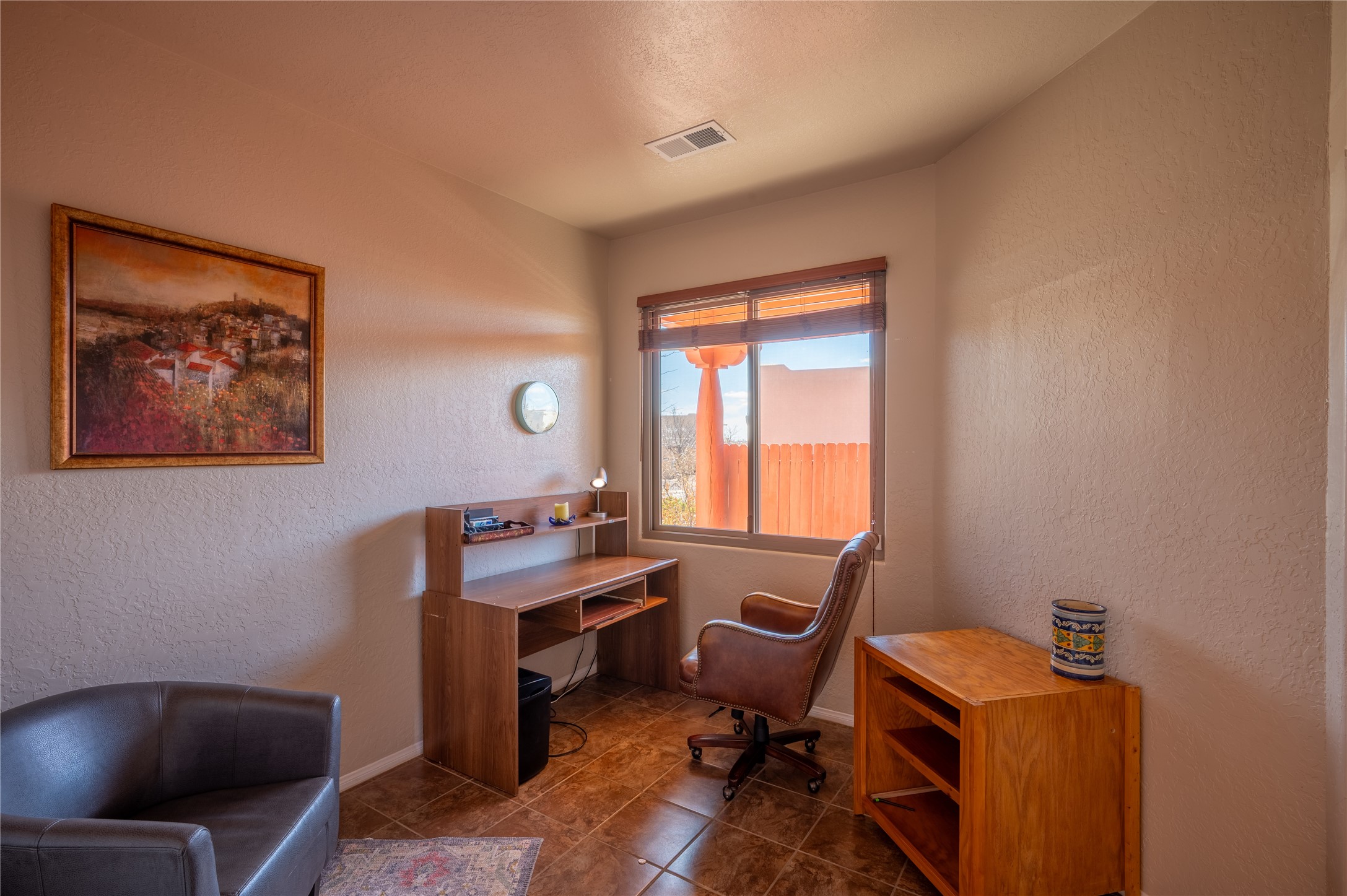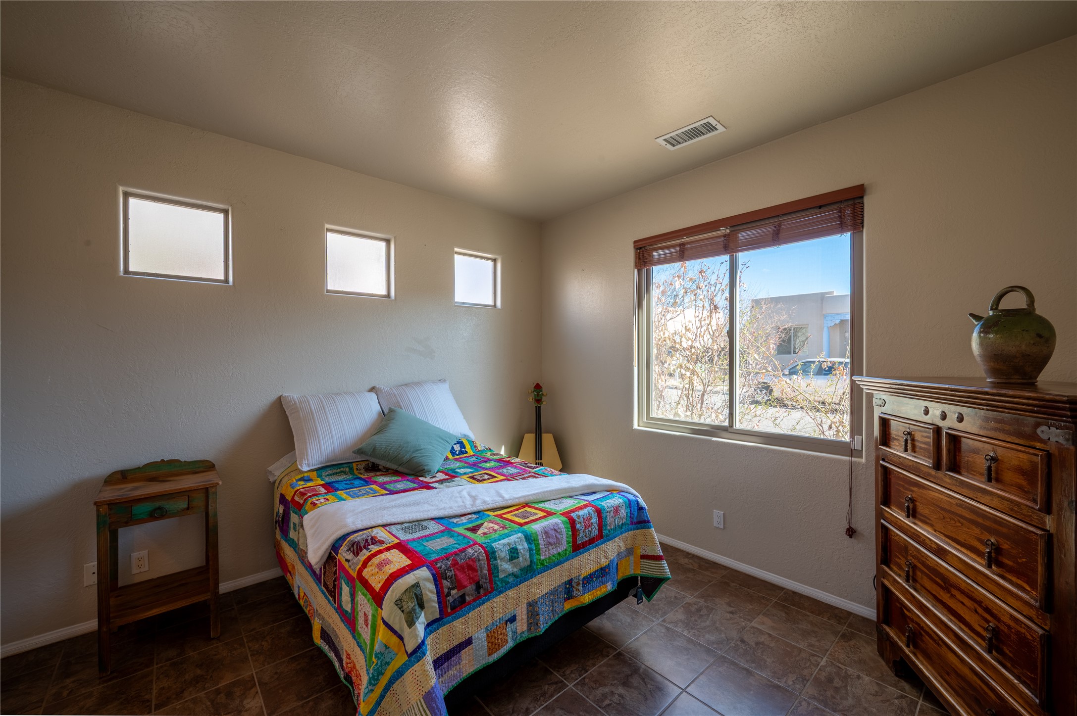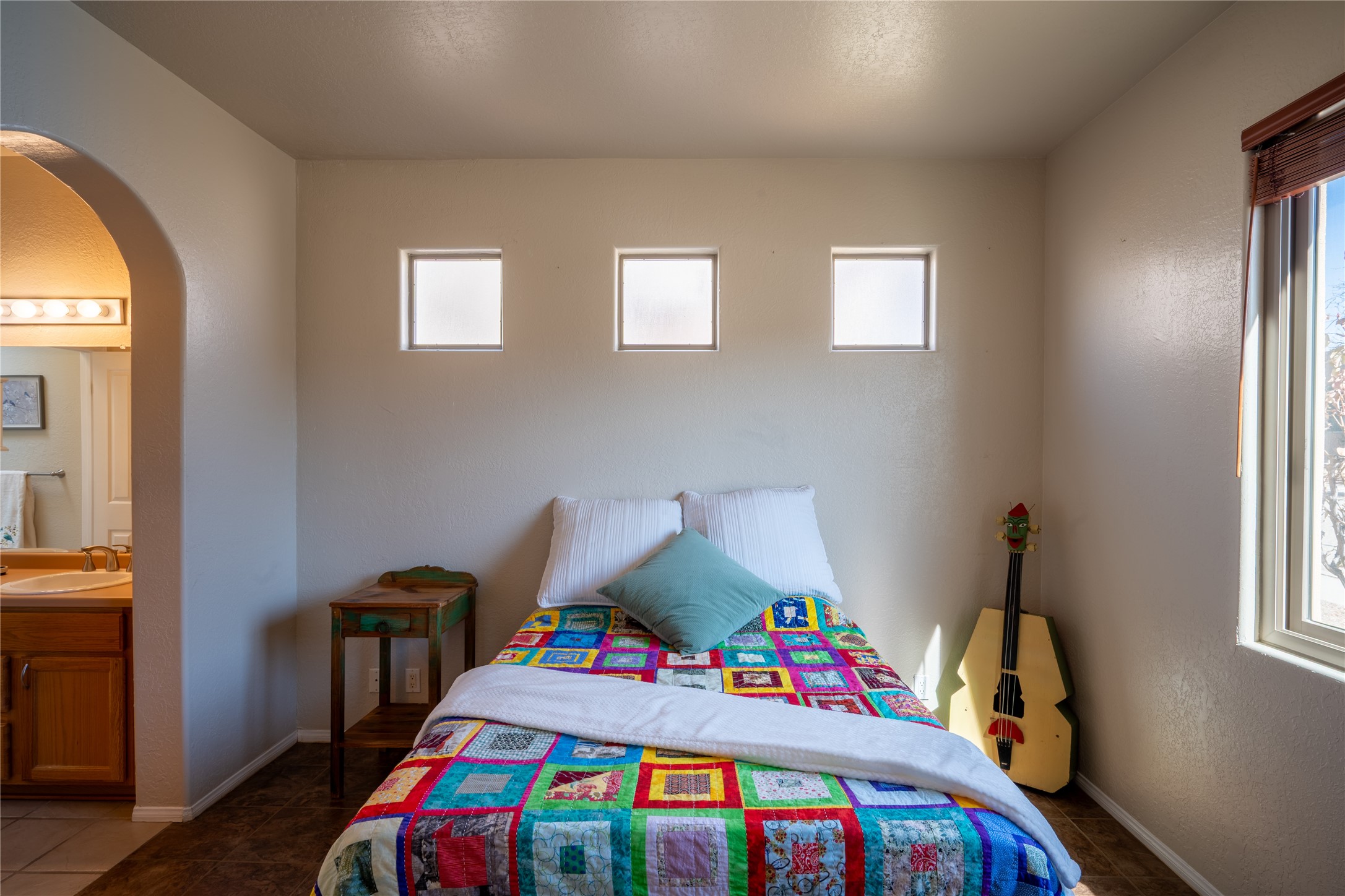 Extrordinary single level home with beautiful custom finishes which includes an open concept floor plan, an enclosed and heated sunroom, large corner windows in the livingroom adding warmth and light with a view of a beautiful and spacious back yard, vigas, a kiva fireplace, custom colors and frontage on two streets for easy back or front entry. Also active solar conveys with the home. Maximum comfort and style in rare affordable home. Make an offer while you can. This will not be available long.
