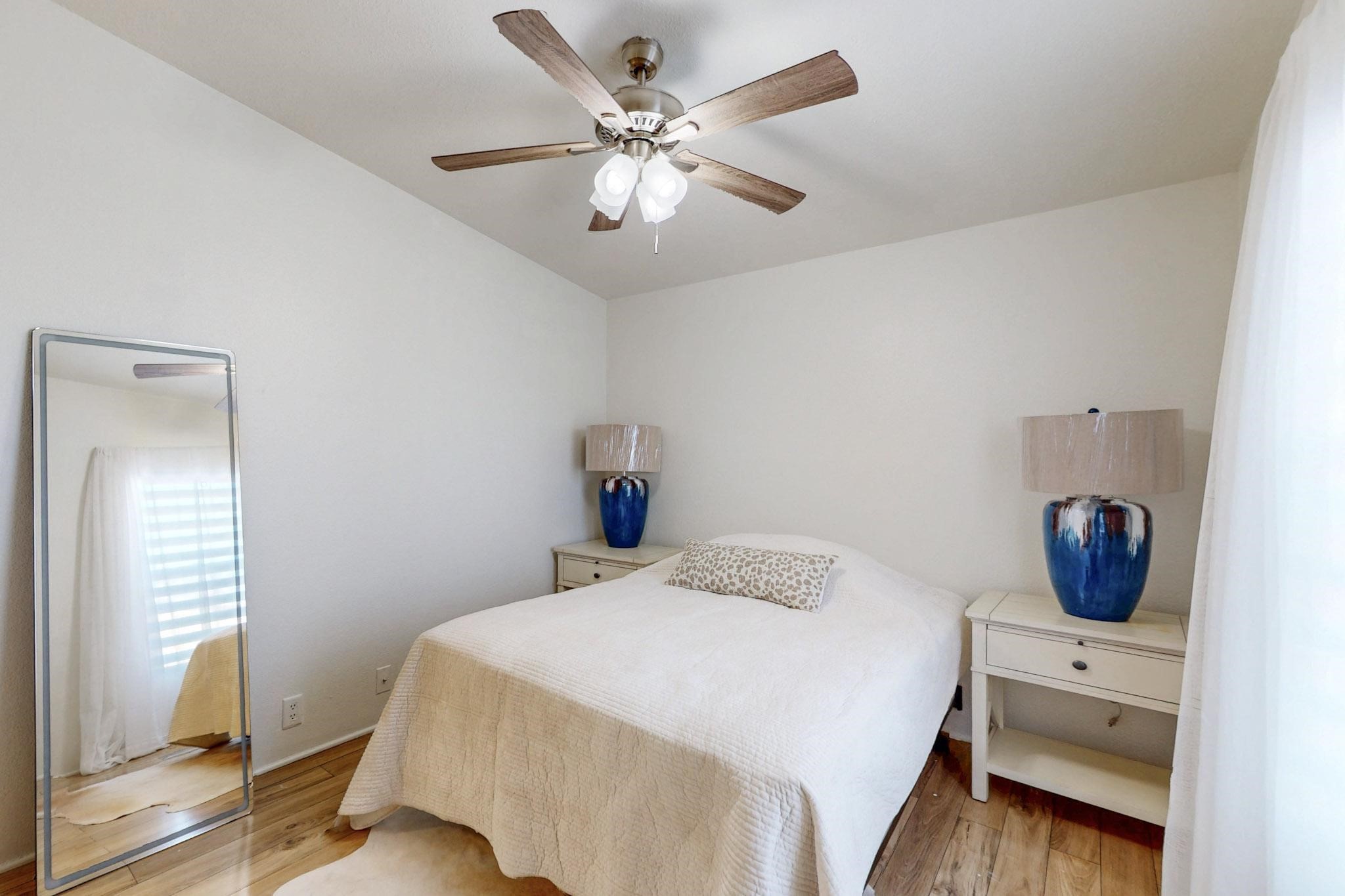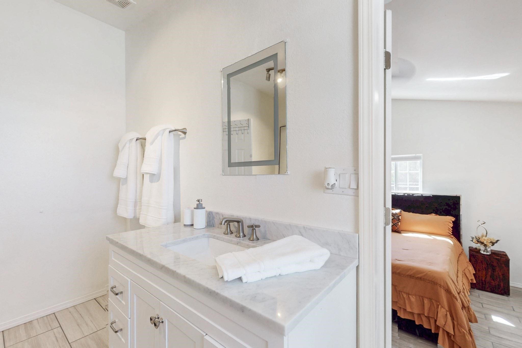 This beautiful single level contemporary style home exudes a modern flair and boasts an updated interior designed to cater to the needs of modern livng. The tasteful neutral color palette creates a warm & inviting atmosphere. Five bedrooms, each equipped with closets & built in cabinetry, offering ample storage and a clean, organized look. The primay bedroom with an adjoining bath features a huge walk-in closet with built in cabinetry. A fabulous kitchen featuring large countertop dining - perfect for casual meals and socializing. Designer cabinetry and upscale appliances including a Subzero refrigerator add to the appeal. The living area open to the kitchen features a stunning electric fireplace, providing both a cativating visual effect and ambiance. Just off this area is a versatile room - currently used as a media room but could be a formal dining room for family gatherings. Enjoy outdoor seating under a charming pergola, perfect for relaxing or entertaining guests. The gated driveway and side entrance offer privacy and security. Mini splits with solar panels providing low energy costs.