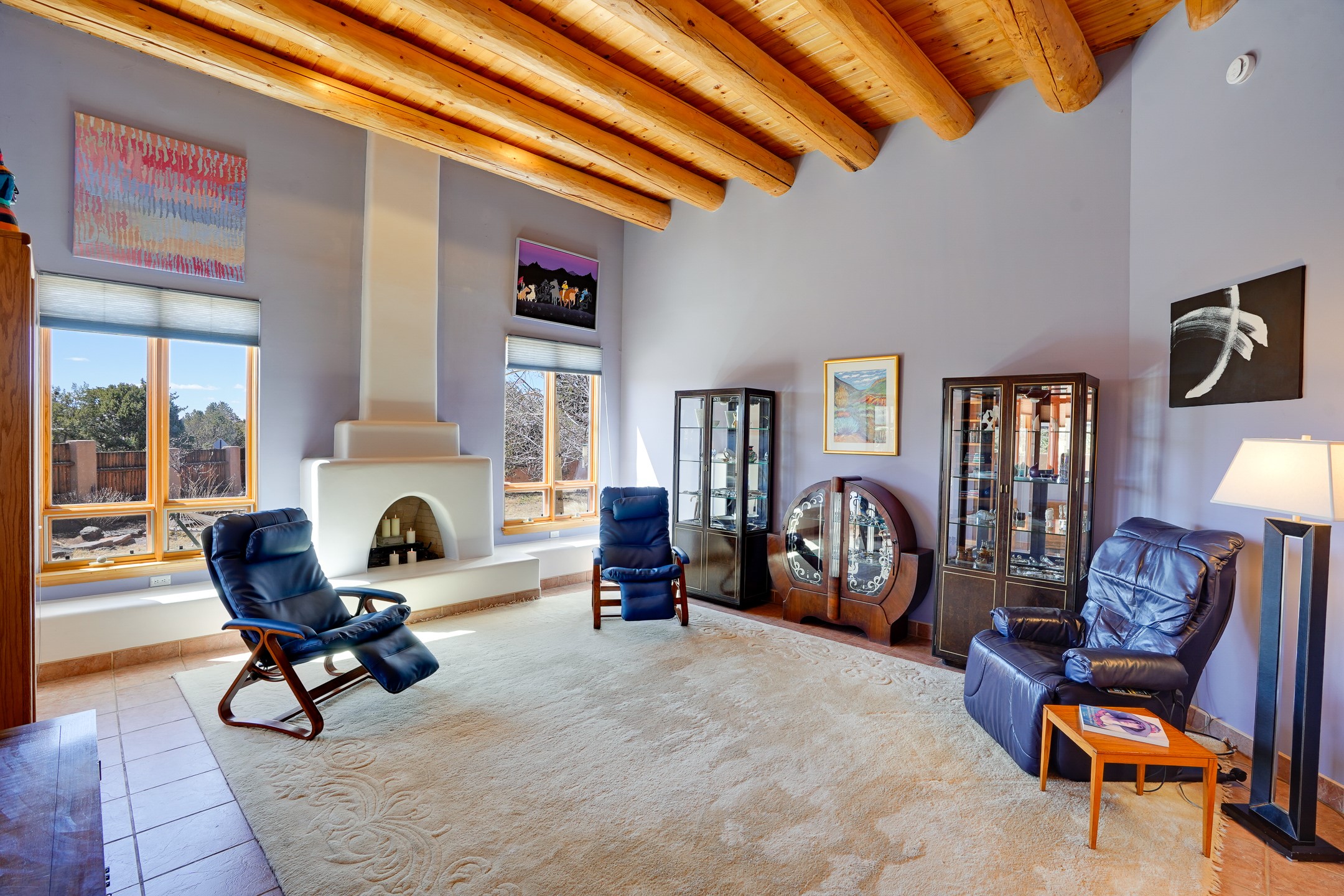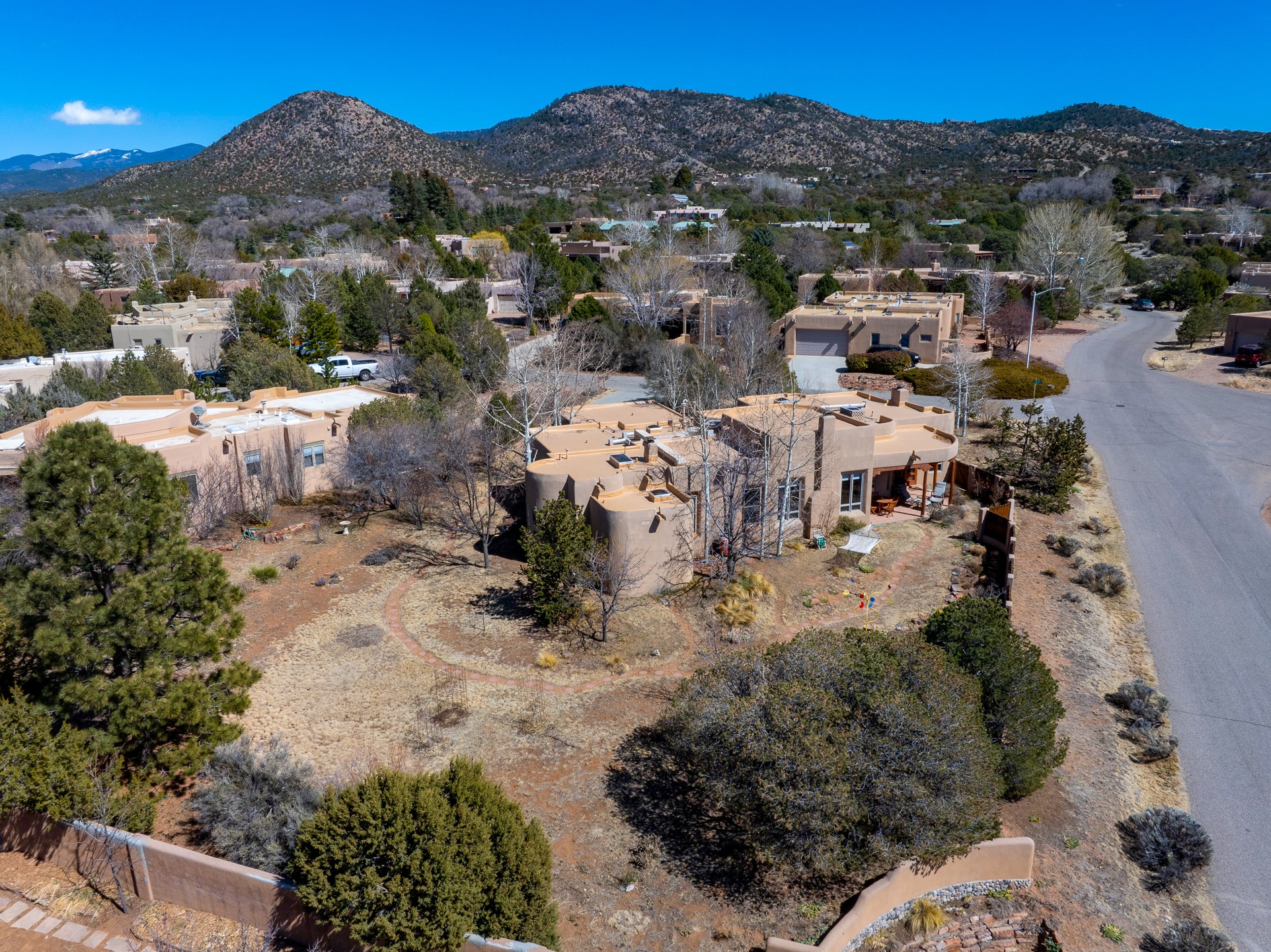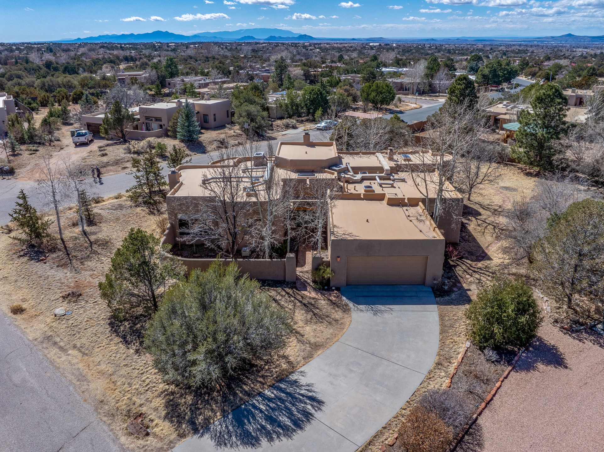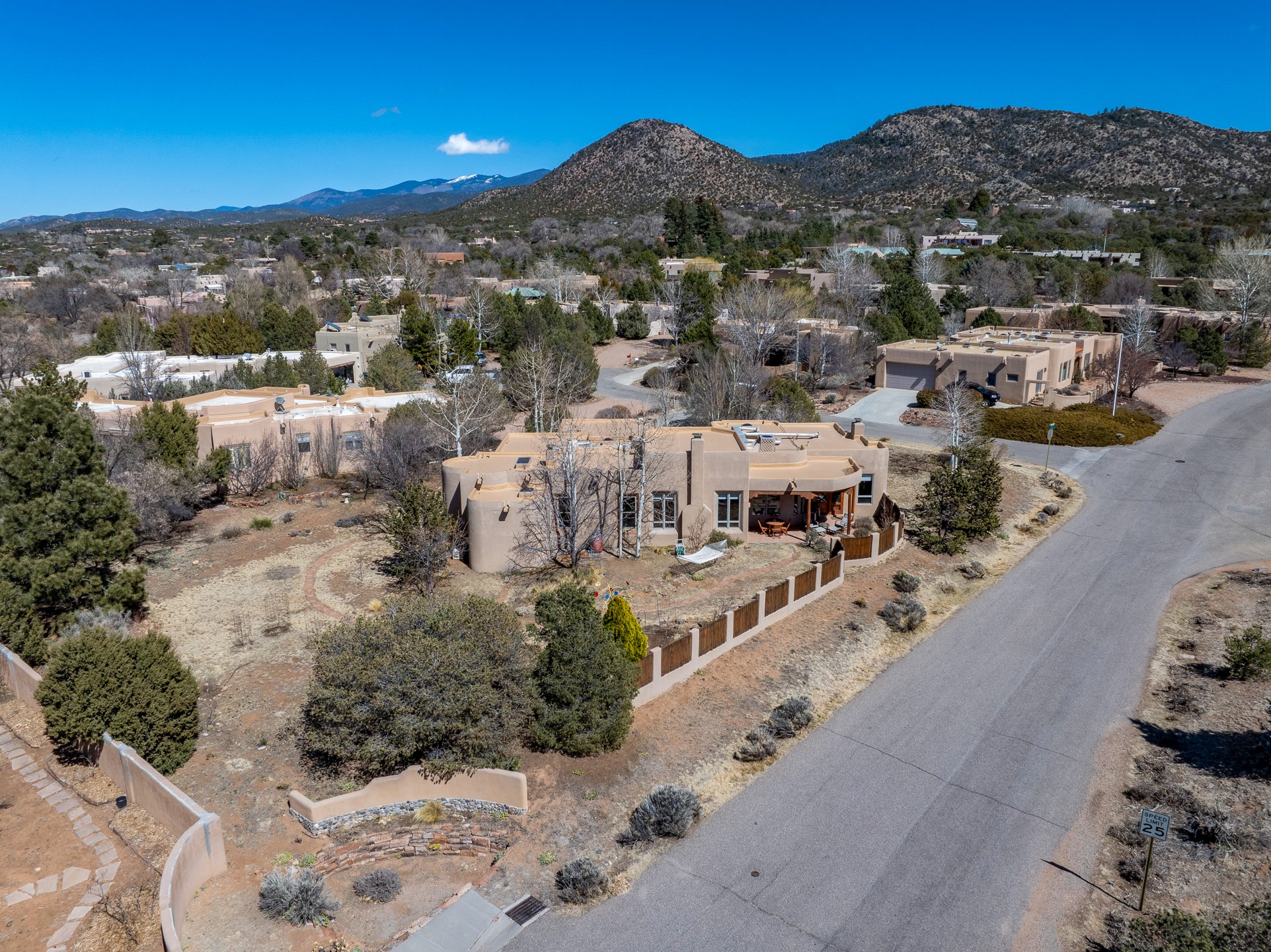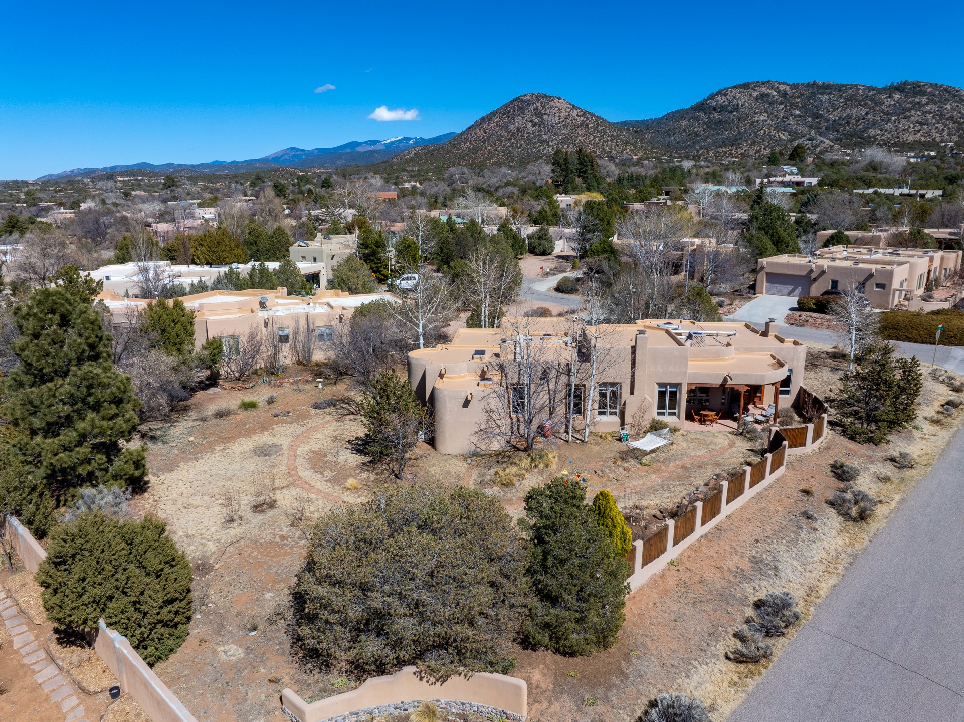 Welcome to this very gracious single level home nestled in the foothills of Santa Fe offering comfort, privacy and convenience with mountain views and spectacular sunsets. It sits on .40 acres just minutes away from museums, shopping, the local hospitals and schools on a cul-de-sac and at the end of the street. The historic plaza is within 4 miles. This home has beautiful high ceilings ( 10 ft,12 ft ,and 14 ft) with vigas in the entryway, dining room and living room. The living room, family room and primary bedroom offer sculpted fireplaces. The primary suite is very spacious and romantic with the stand alone sculpted fireplace, the bathroom has a jetted tub for relaxation, a walk-in shower with grab bars, a large walk-in closet, double sinks, a makeup vanity, tons of light and space. The open kitchen is a 'cooks kitchen' with generous space, double ovens and a center island cooktop. The kitchen and dining room open to a covered back patio with an inline gas barbecue. The patio looks out onto a beautiful garden area offering mature landscaping (with drip irrigation) with cherry and peach trees and dramatic sunset views. This home includes a newer roof (11/2021), new Navien hot water heater and boiler (12/2024), wheelchair accessibility, central air, radiant floor heat, seven skylights and an oversized garage.