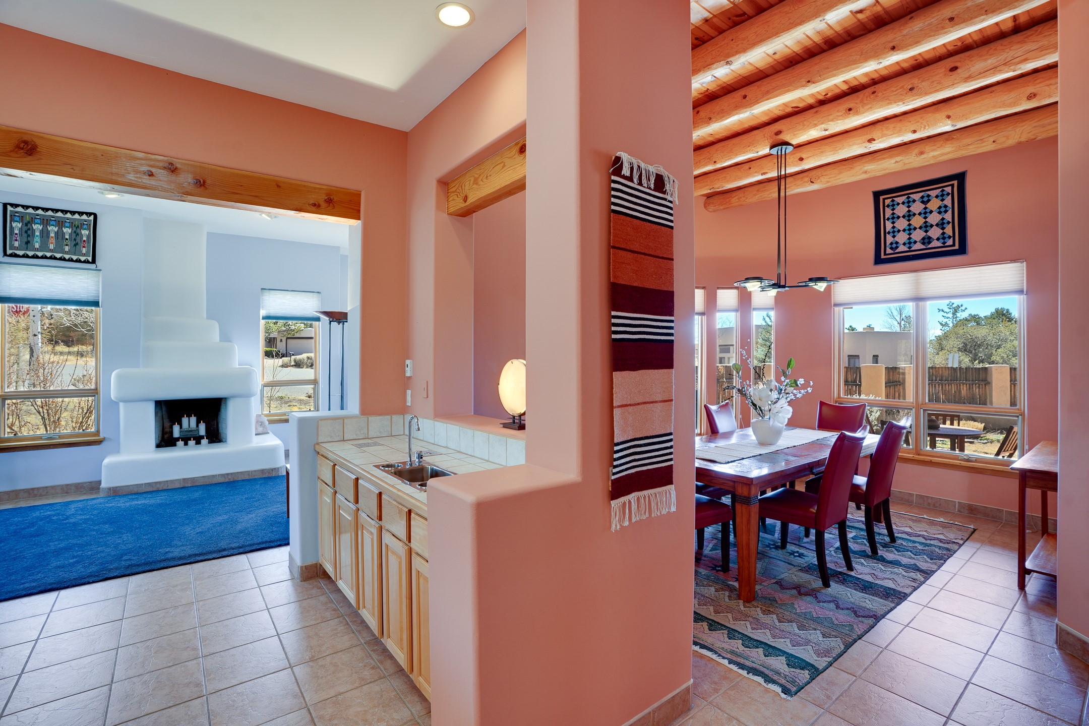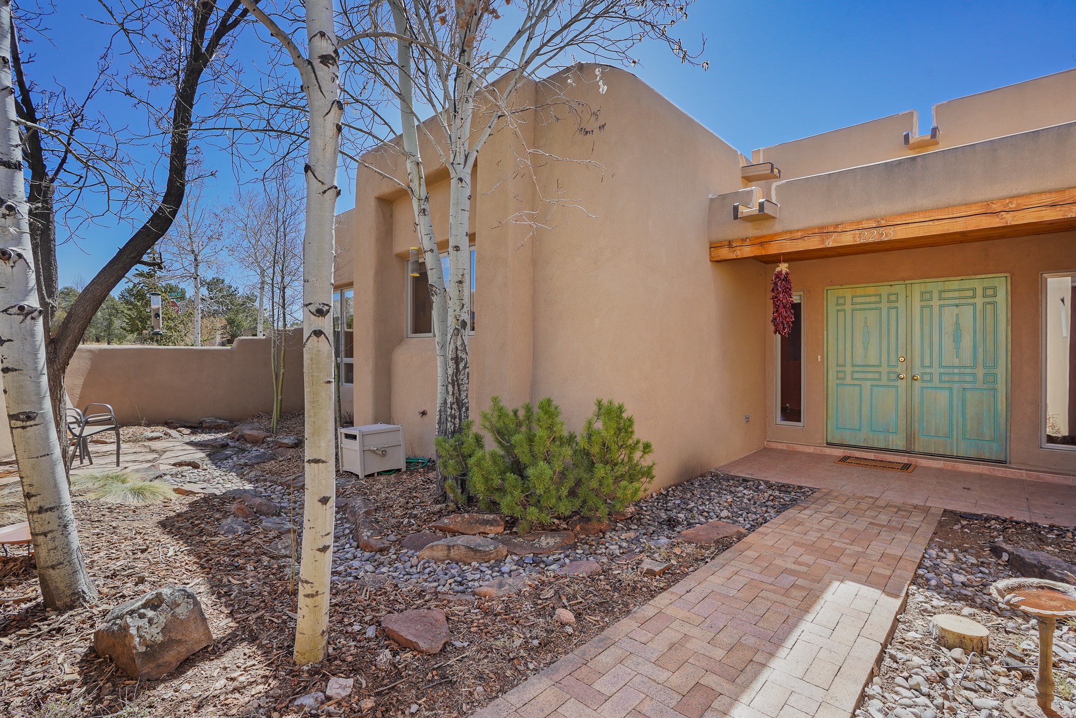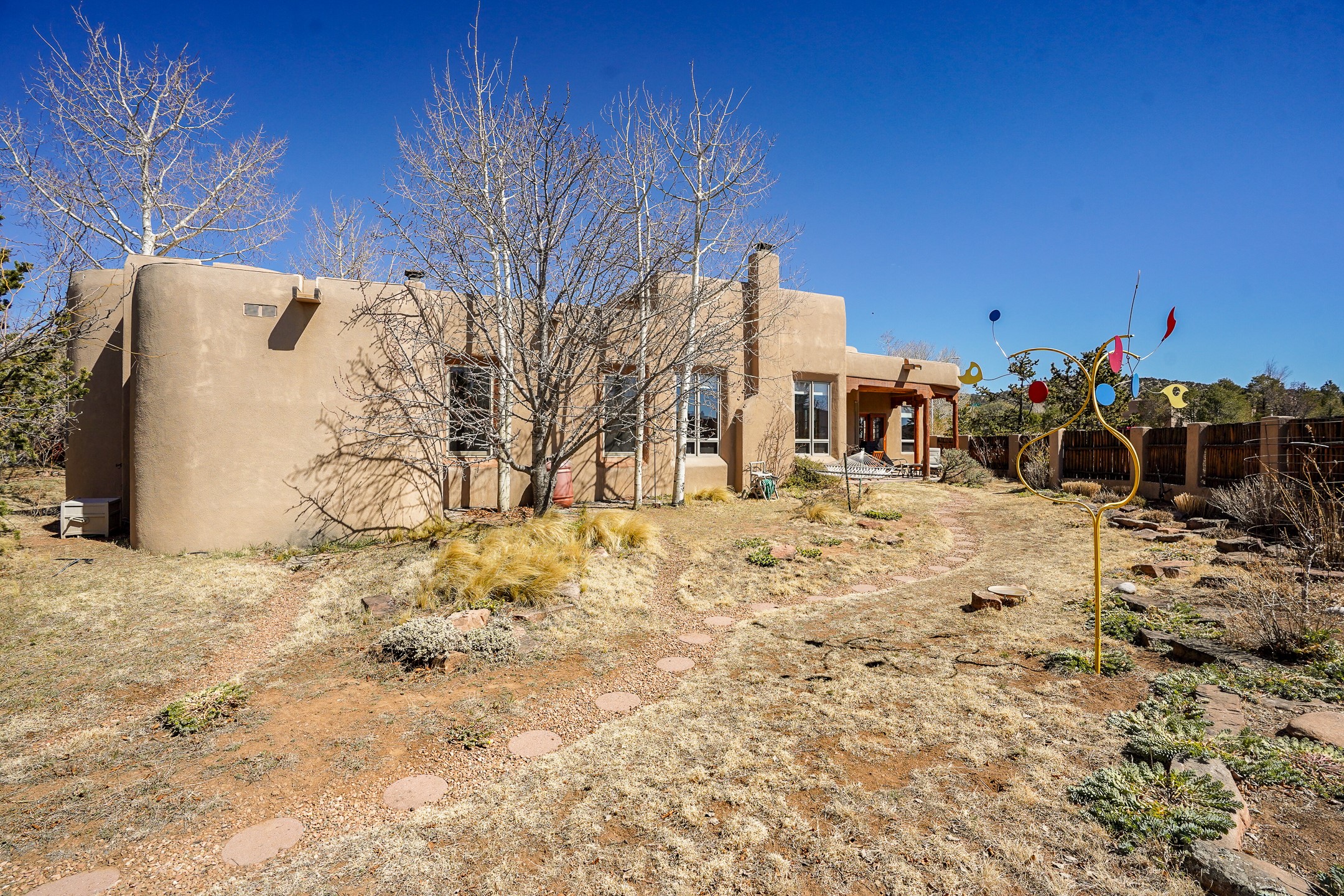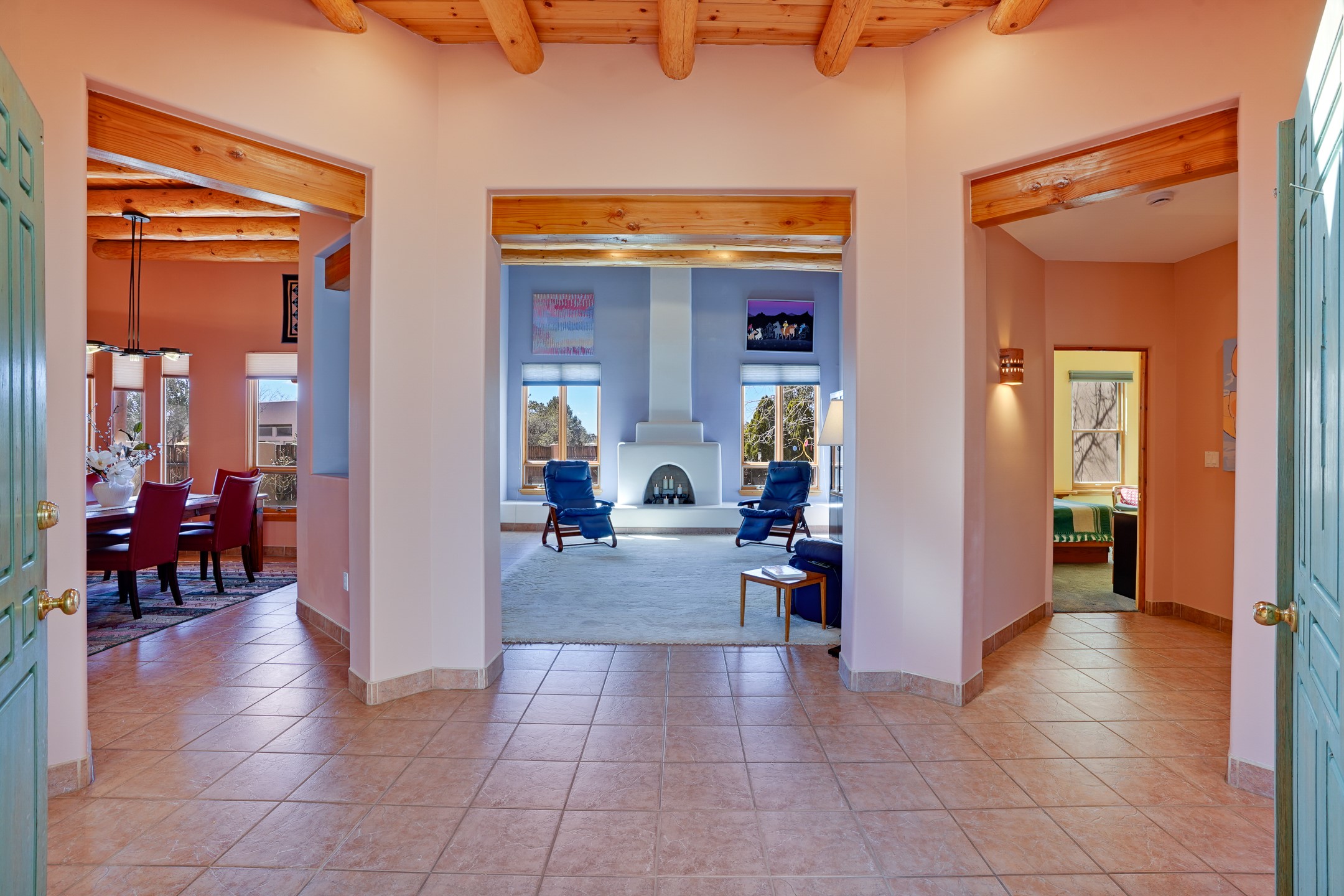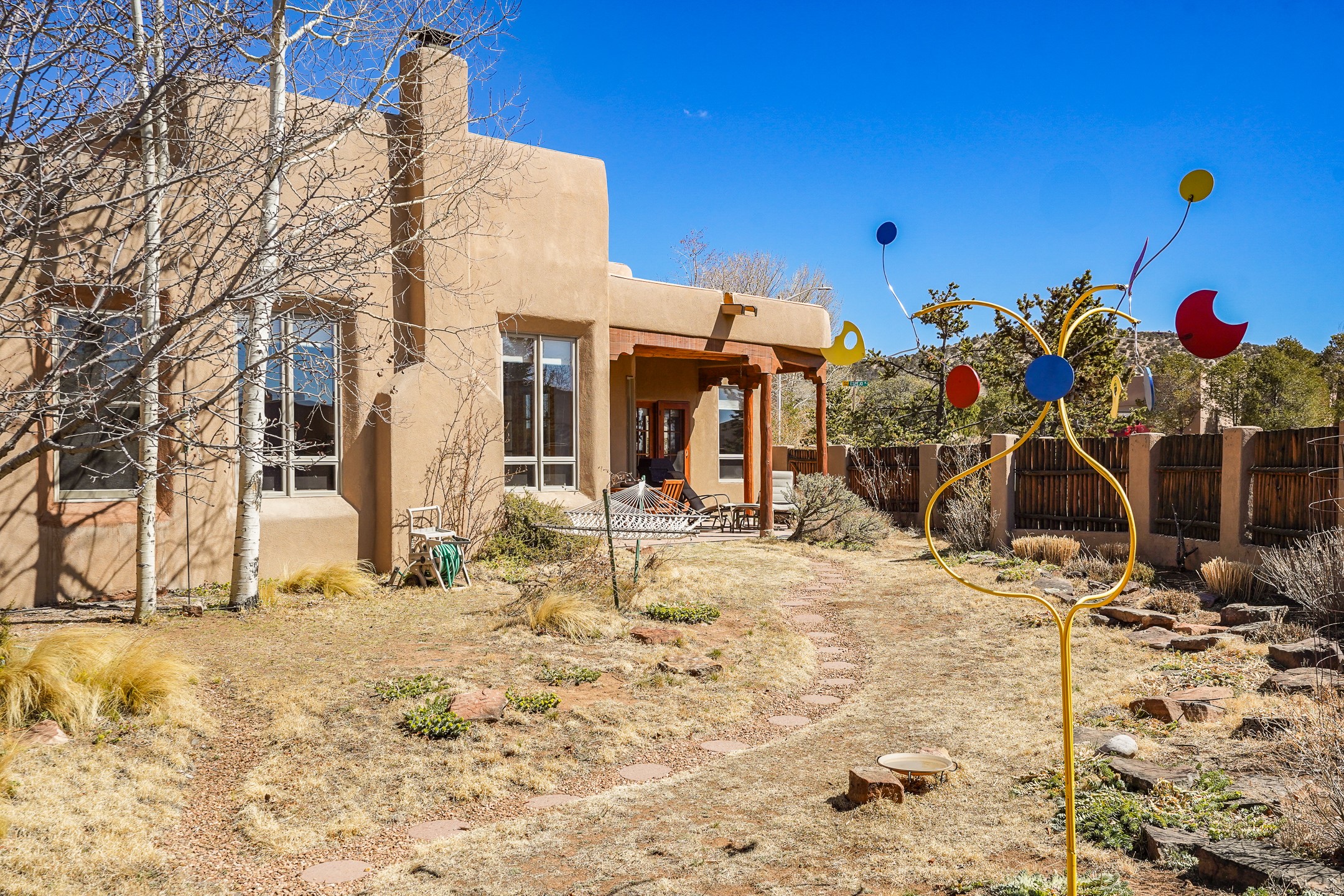 Welcome to this very gracious single level home nestled in the foothills of Santa Fe offering comfort, privacy and convenience with mountain views and spectacular sunsets. It sits on .40 acres just minutes away from museums, shopping, the local hospitals and schools on a cul-de-sac and at the end of the street. The historic plaza is within 4 miles. This home has beautiful high ceilings ( 10 ft,12 ft ,and 14 ft) with vigas in the entryway, dining room and living room. The living room, family room and primary bedroom offer sculpted fireplaces. The primary suite is very spacious and romantic with the stand alone sculpted fireplace, the bathroom has a jetted tub for relaxation, a walk-in shower with grab bars, a large walk-in closet, double sinks, a makeup vanity, tons of light and space. The open kitchen is a 'cooks kitchen' with generous space, double ovens and a center island cooktop. The kitchen and dining room open to a covered back patio with an inline gas barbecue. The patio looks out onto a beautiful garden area offering mature landscaping (with drip irrigation) with cherry and peach trees and dramatic sunset views. This home includes a newer roof (11/2021), new Navien hot water heater and boiler (12/2024), wheelchair accessibility, central air, radiant floor heat, seven skylights and an oversized garage.