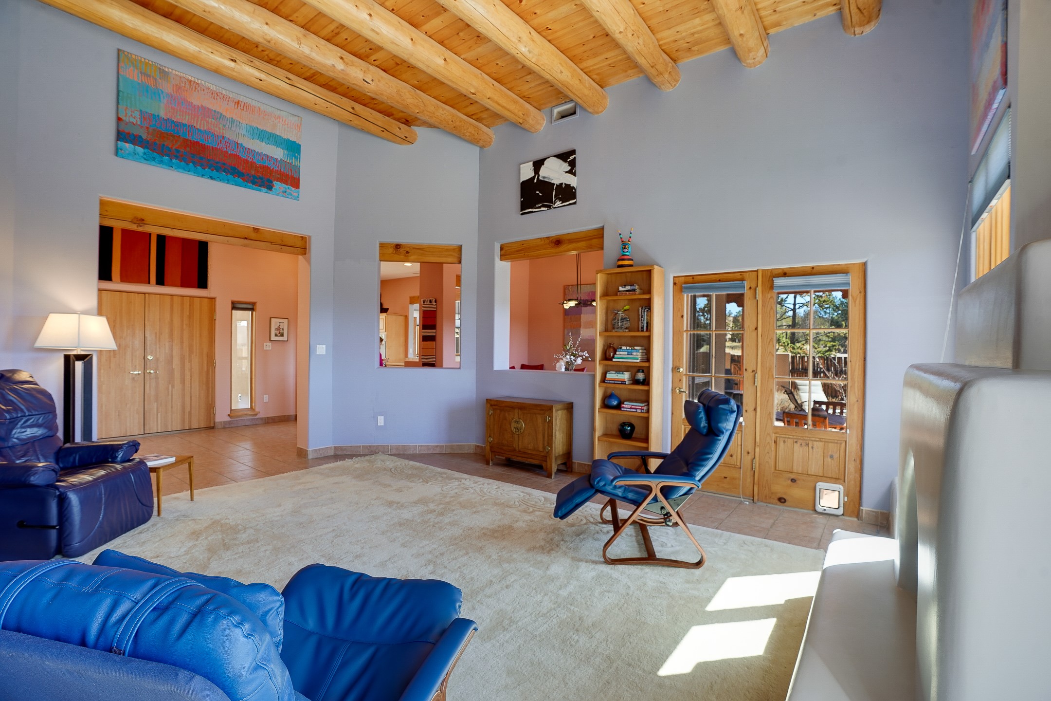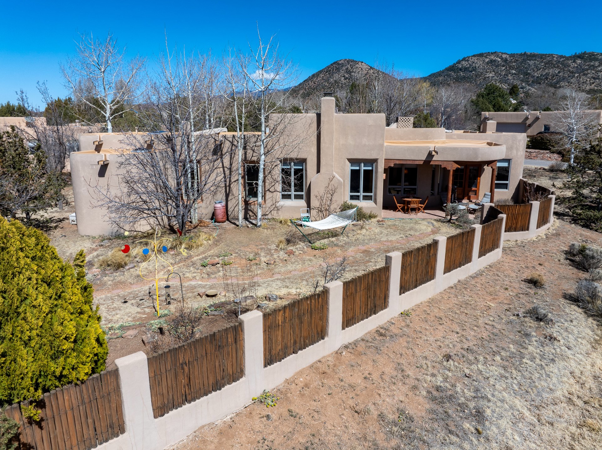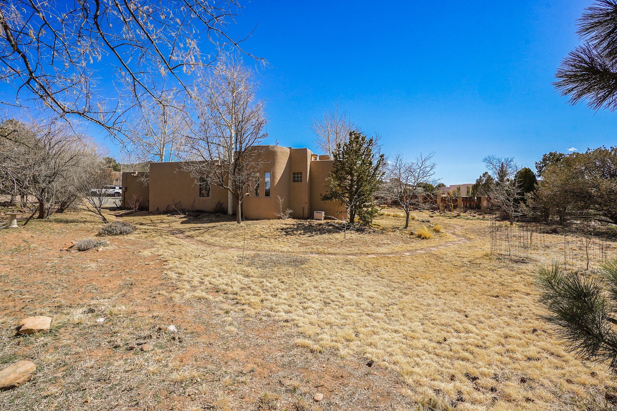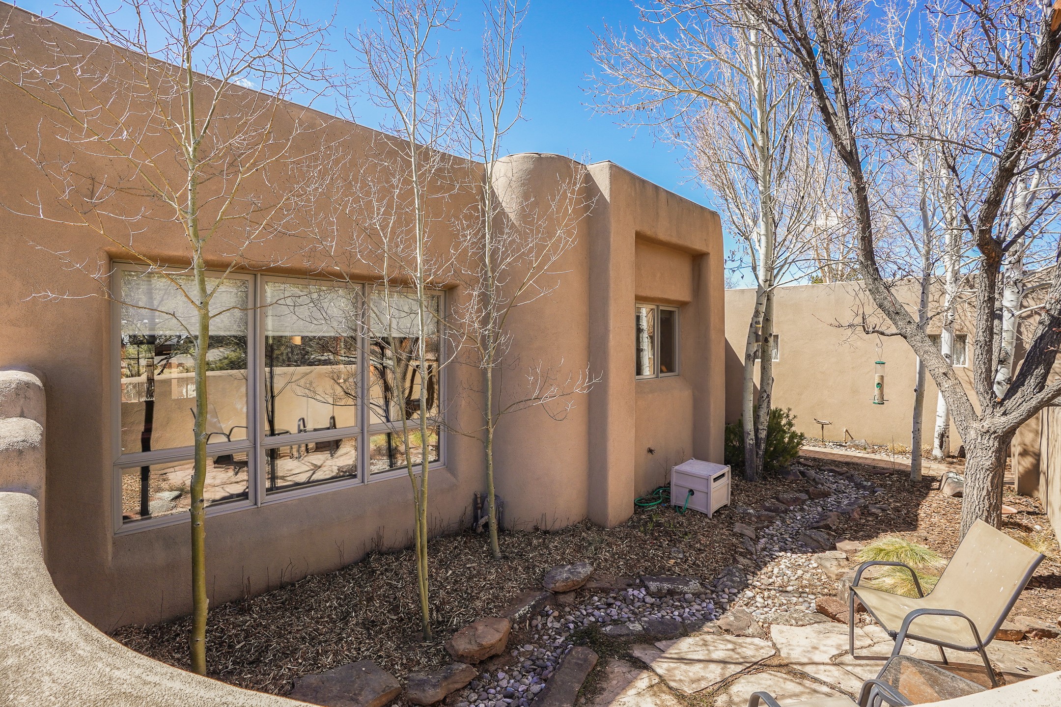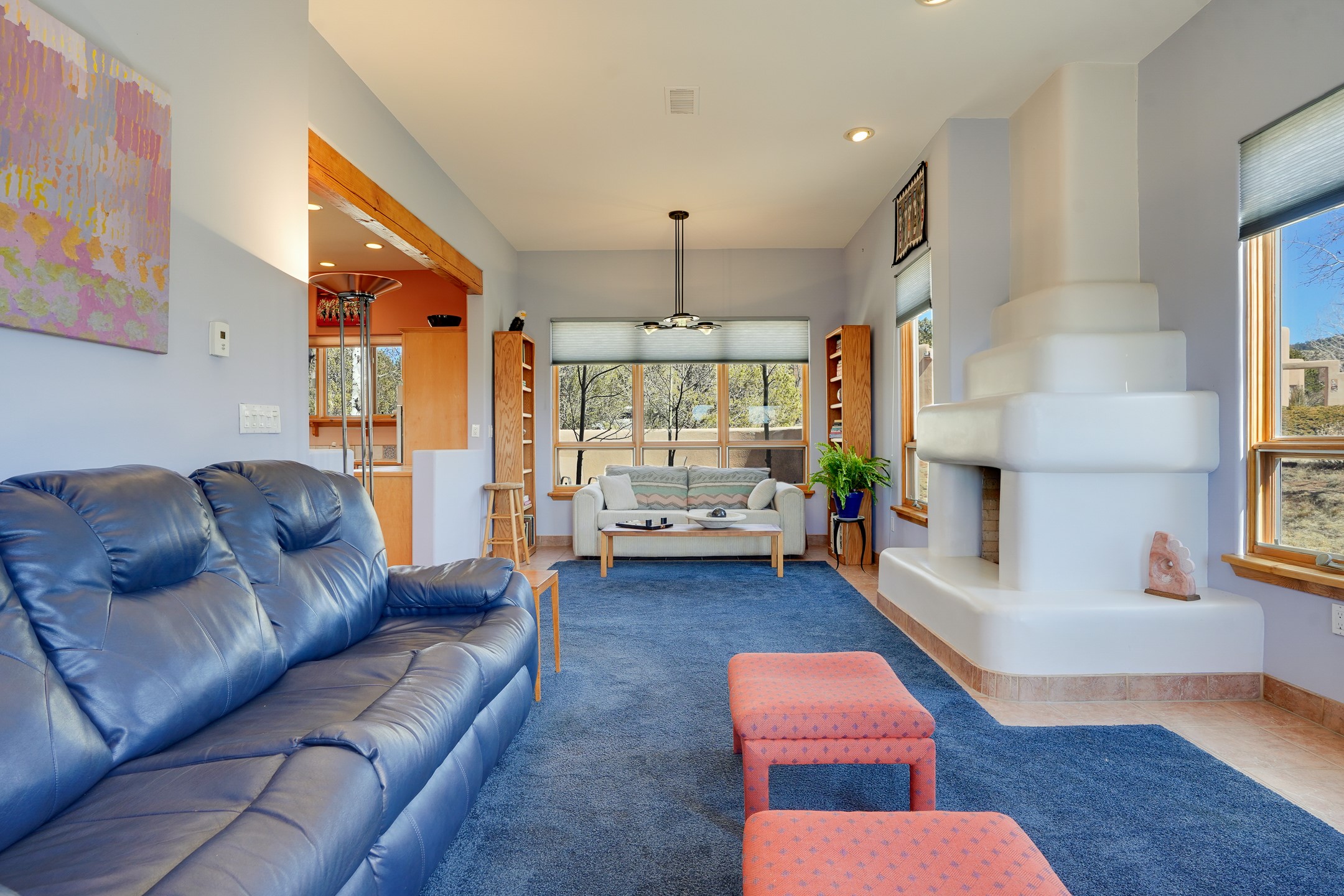 Welcome to this very gracious single level home nestled in the foothills of Santa Fe offering comfort, privacy and convenience with mountain views and spectacular sunsets. It sits on .40 acres just minutes away from museums, shopping, the local hospitals and schools on a cul-de-sac and at the end of the street. The historic plaza is within 4 miles. This home has beautiful high ceilings ( 10 ft,12 ft ,and 14 ft) with vigas in the entryway, dining room and living room. The living room, family room and primary bedroom offer sculpted fireplaces. The primary suite is very spacious and romantic with the stand alone sculpted fireplace, the bathroom has a jetted tub for relaxation, a walk-in shower with grab bars, a large walk-in closet, double sinks, a makeup vanity, tons of light and space. The open kitchen is a 'cooks kitchen' with generous space, double ovens and a center island cooktop. The kitchen and dining room open to a covered back patio with an inline gas barbecue. The patio looks out onto a beautiful garden area offering mature landscaping (with drip irrigation) with cherry and peach trees and dramatic sunset views. This home includes a newer roof (11/2021), new Navien hot water heater and boiler (12/2024), wheelchair accessibility, central air, radiant floor heat, seven skylights and an oversized garage.
