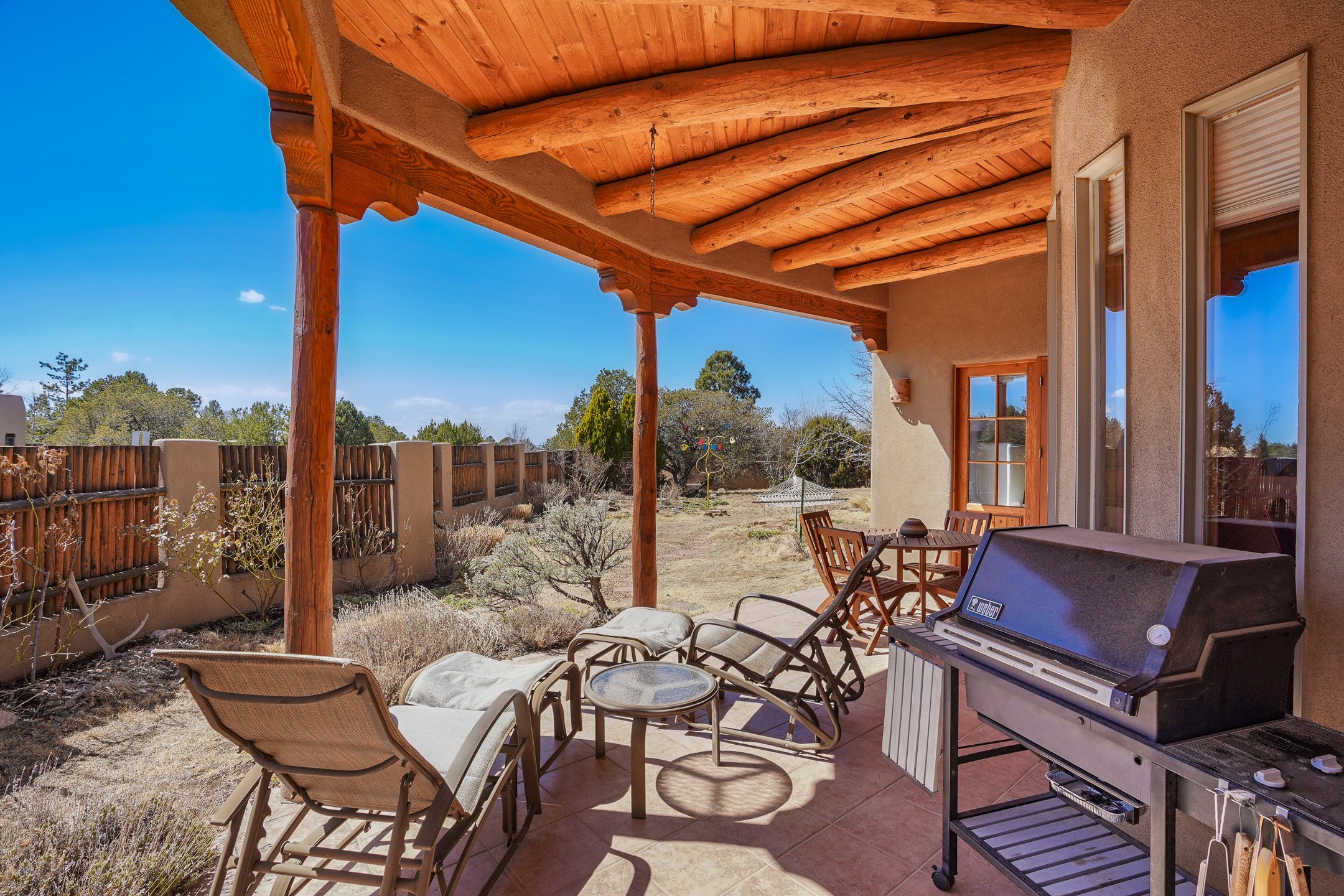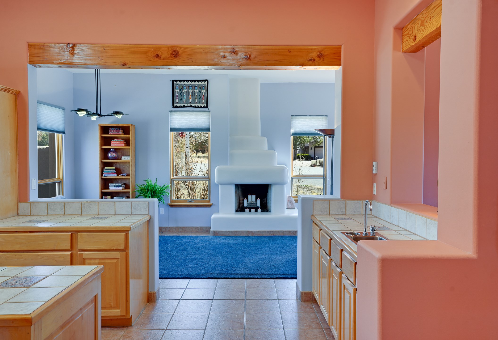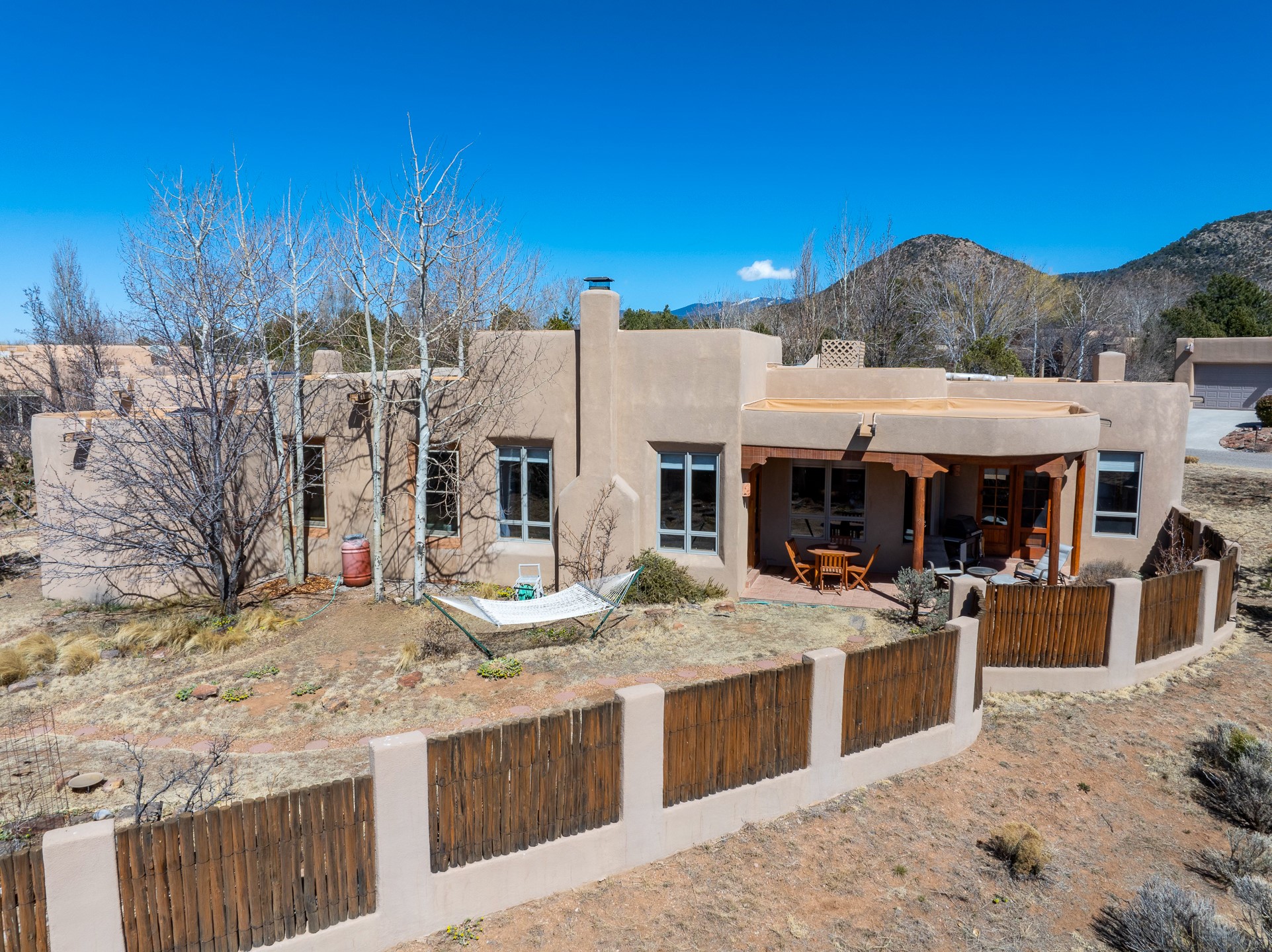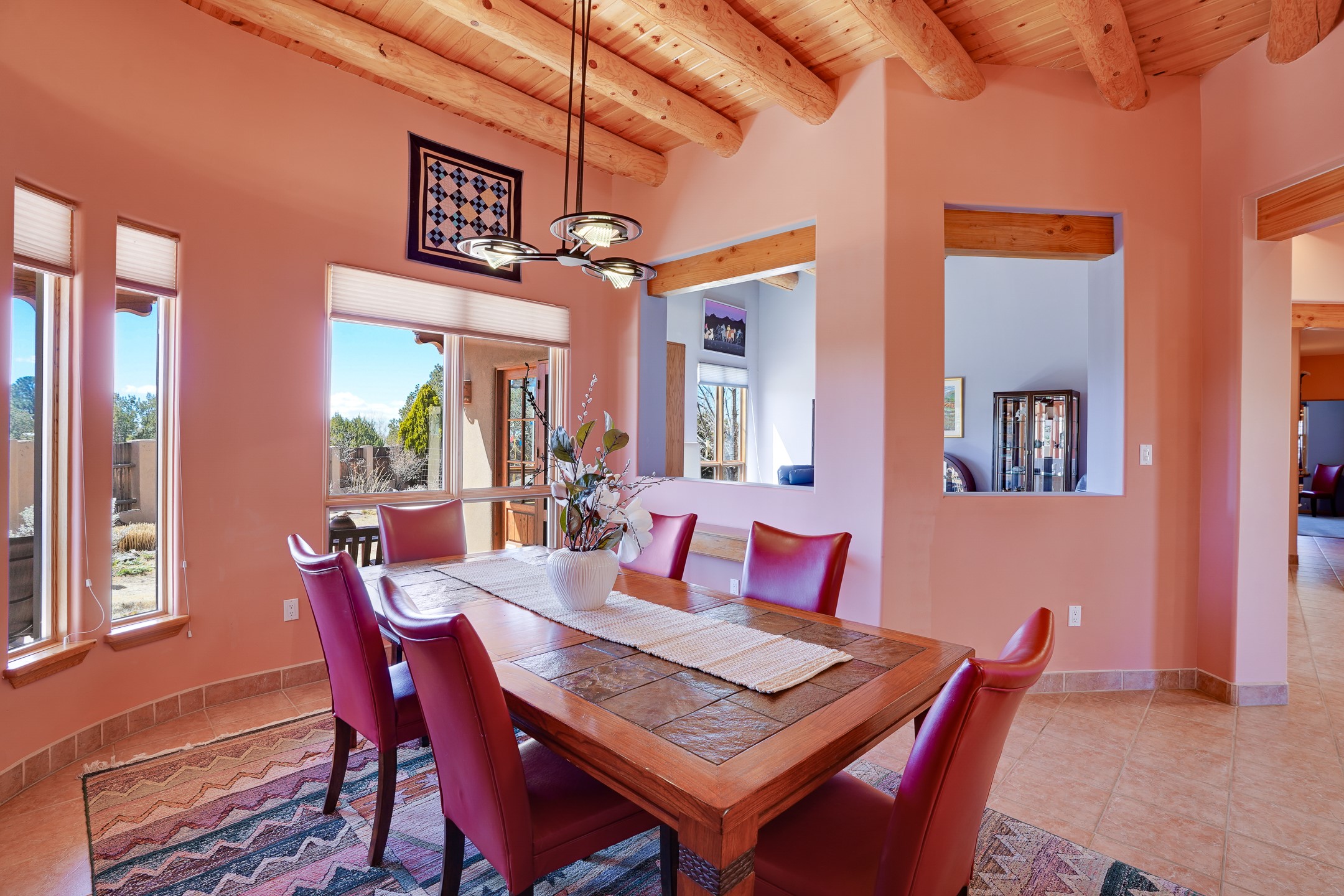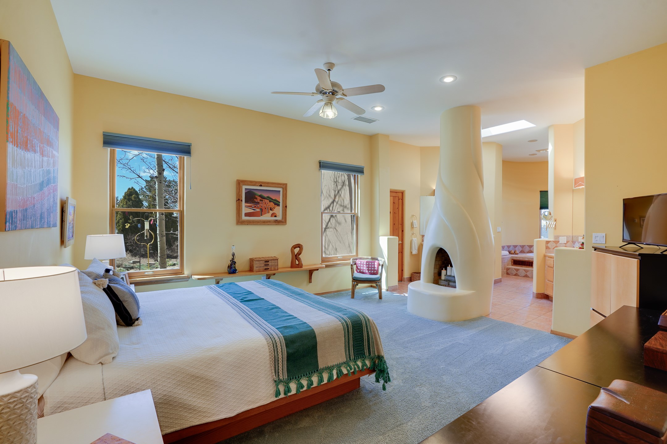 Welcome to this very gracious single level home nestled in the foothills of Santa Fe offering comfort, privacy and convenience with mountain views and spectacular sunsets. It sits on .40 acres just minutes away from museums, shopping, the local hospitals and schools on a cul-de-sac and at the end of the street. The historic plaza is within 4 miles. This home has beautiful high ceilings ( 10 ft,12 ft ,and 14 ft) with vigas in the entryway, dining room and living room. The living room, family room and primary bedroom offer sculpted fireplaces. The primary suite is very spacious and romantic with the stand alone sculpted fireplace, the bathroom has a jetted tub for relaxation, a walk-in shower with grab bars, a large walk-in closet, double sinks, a makeup vanity, tons of light and space. The open kitchen is a 'cooks kitchen' with generous space, double ovens and a center island cooktop. The kitchen and dining room open to a covered back patio with an inline gas barbecue. The patio looks out onto a beautiful garden area offering mature landscaping (with drip irrigation) with cherry and peach trees and dramatic sunset views. This home includes a newer roof (11/2021), new Navien hot water heater and boiler (12/2024), wheelchair accessibility, central air, radiant floor heat, seven skylights and an oversized garage.
