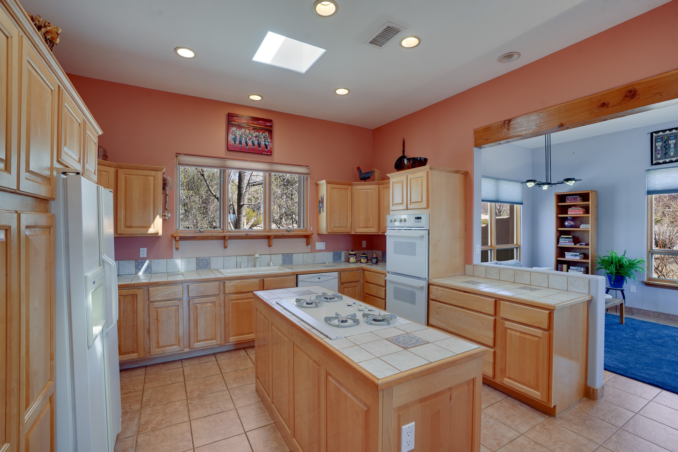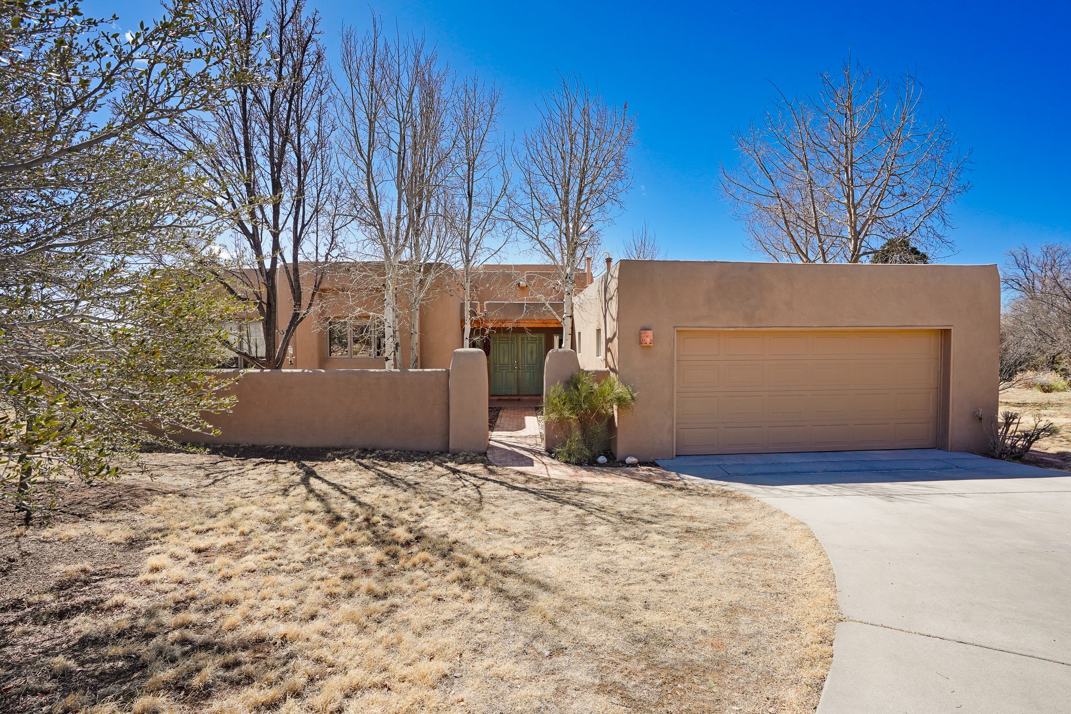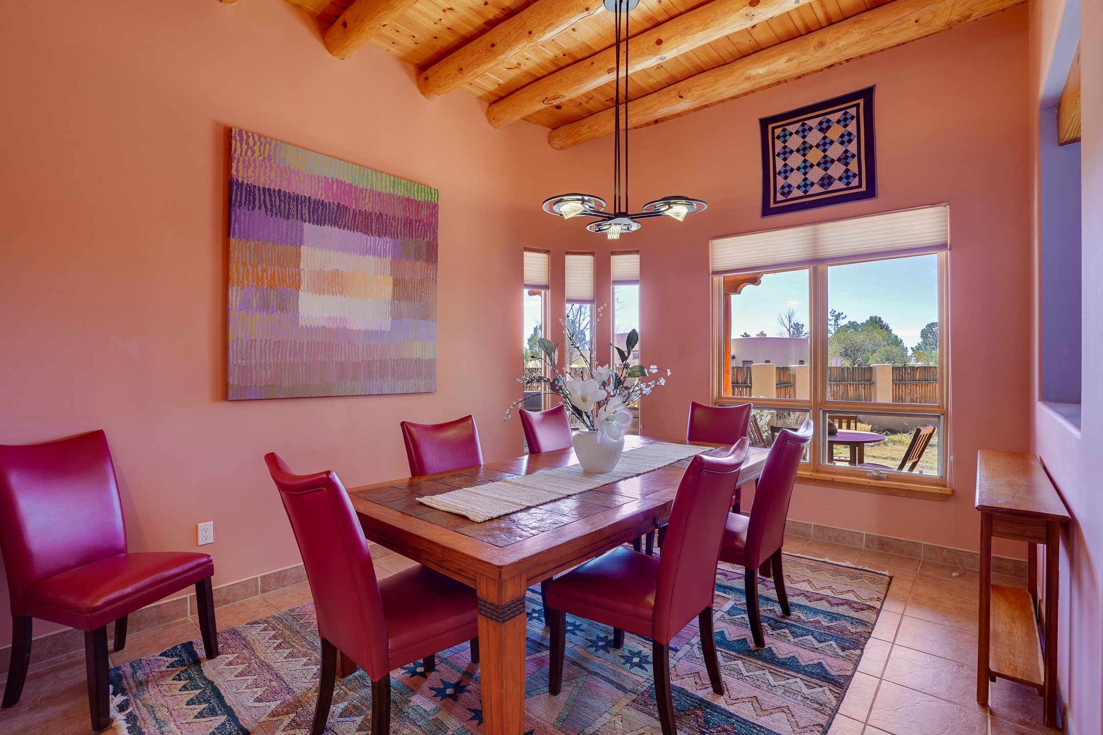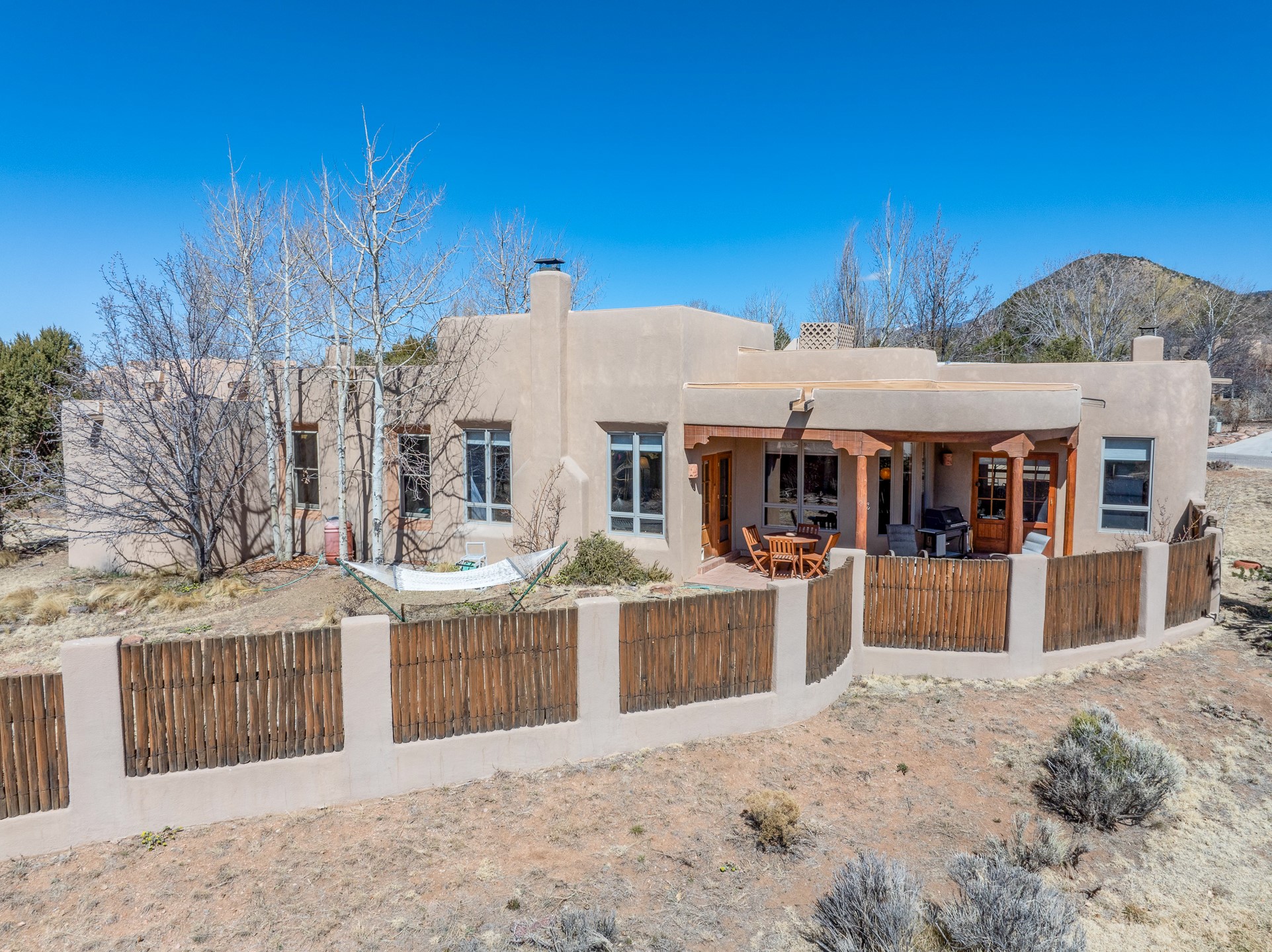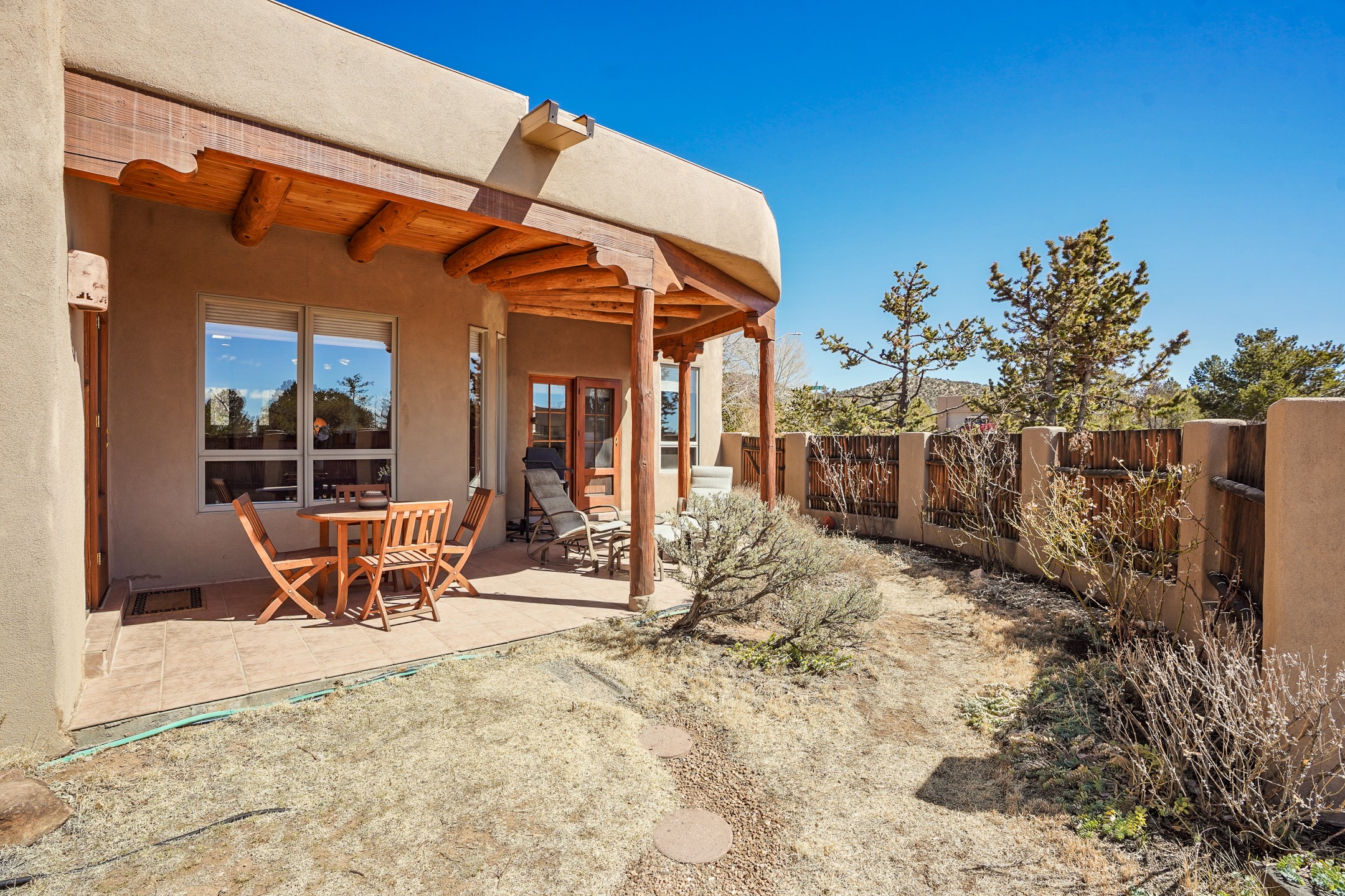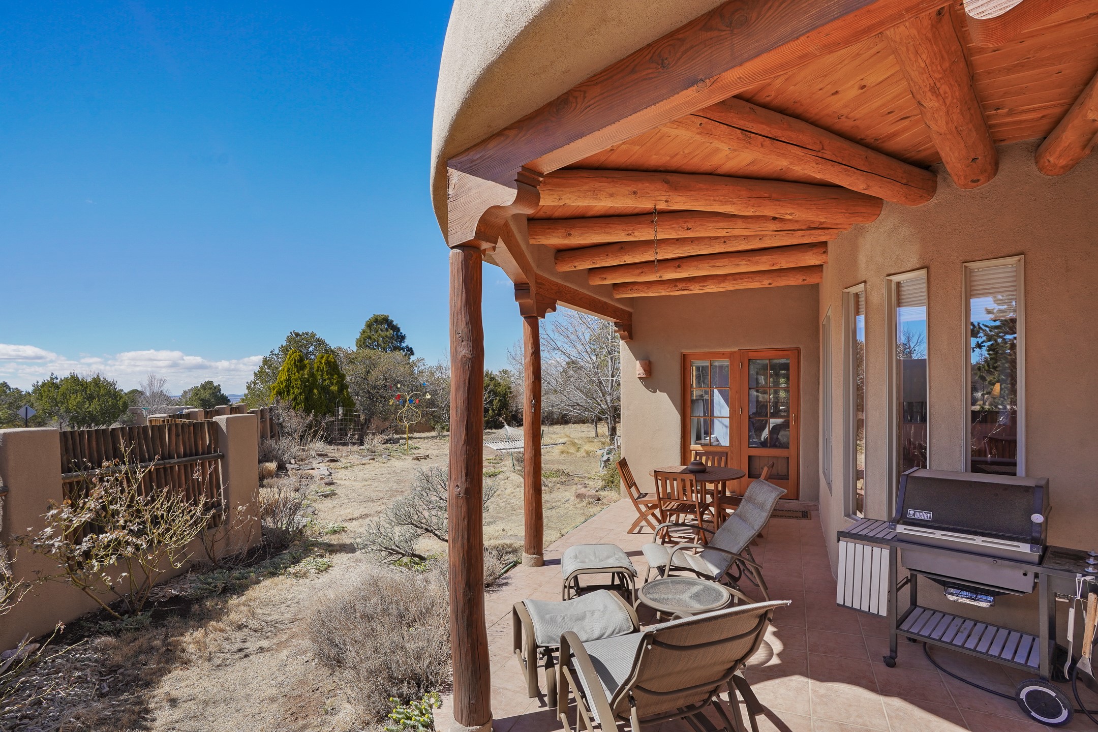 Welcome to this very gracious single level home nestled in the foothills of Santa Fe offering comfort, privacy and convenience with mountain views and spectacular sunsets. It sits on .40 acres just minutes away from museums, shopping, the local hospitals and schools on a cul-de-sac and at the end of the street. The historic plaza is within 4 miles. This home has beautiful high ceilings ( 10 ft,12 ft ,and 14 ft) with vigas in the entryway, dining room and living room. The living room, family room and primary bedroom offer sculpted fireplaces. The primary suite is very spacious and romantic with the stand alone sculpted fireplace, the bathroom has a jetted tub for relaxation, a walk-in shower with grab bars, a large walk-in closet, double sinks, a makeup vanity, tons of light and space. The open kitchen is a 'cooks kitchen' with generous space, double ovens and a center island cooktop. The kitchen and dining room open to a covered back patio with an inline gas barbecue. The patio looks out onto a beautiful garden area offering mature landscaping (with drip irrigation) with cherry and peach trees and dramatic sunset views. This home includes a newer roof (11/2021), new Navien hot water heater and boiler (12/2024), wheelchair accessibility, central air, radiant floor heat, seven skylights and an oversized garage.