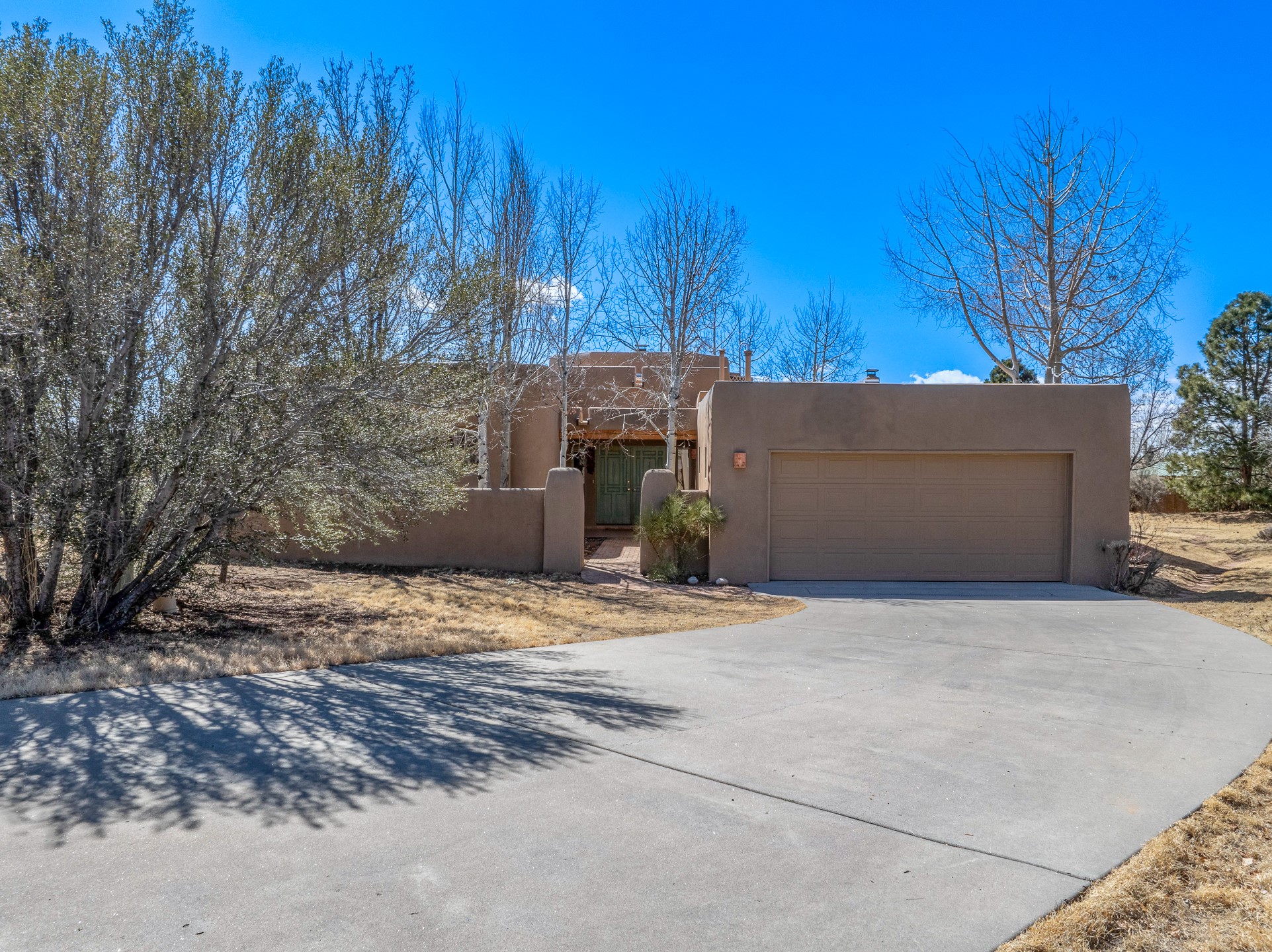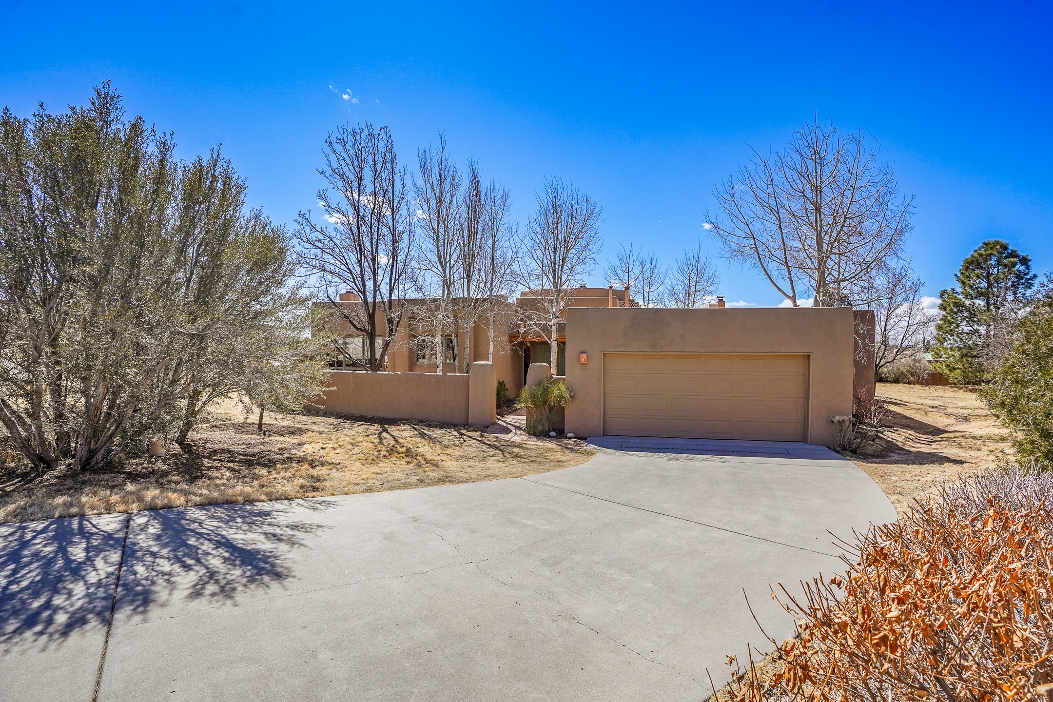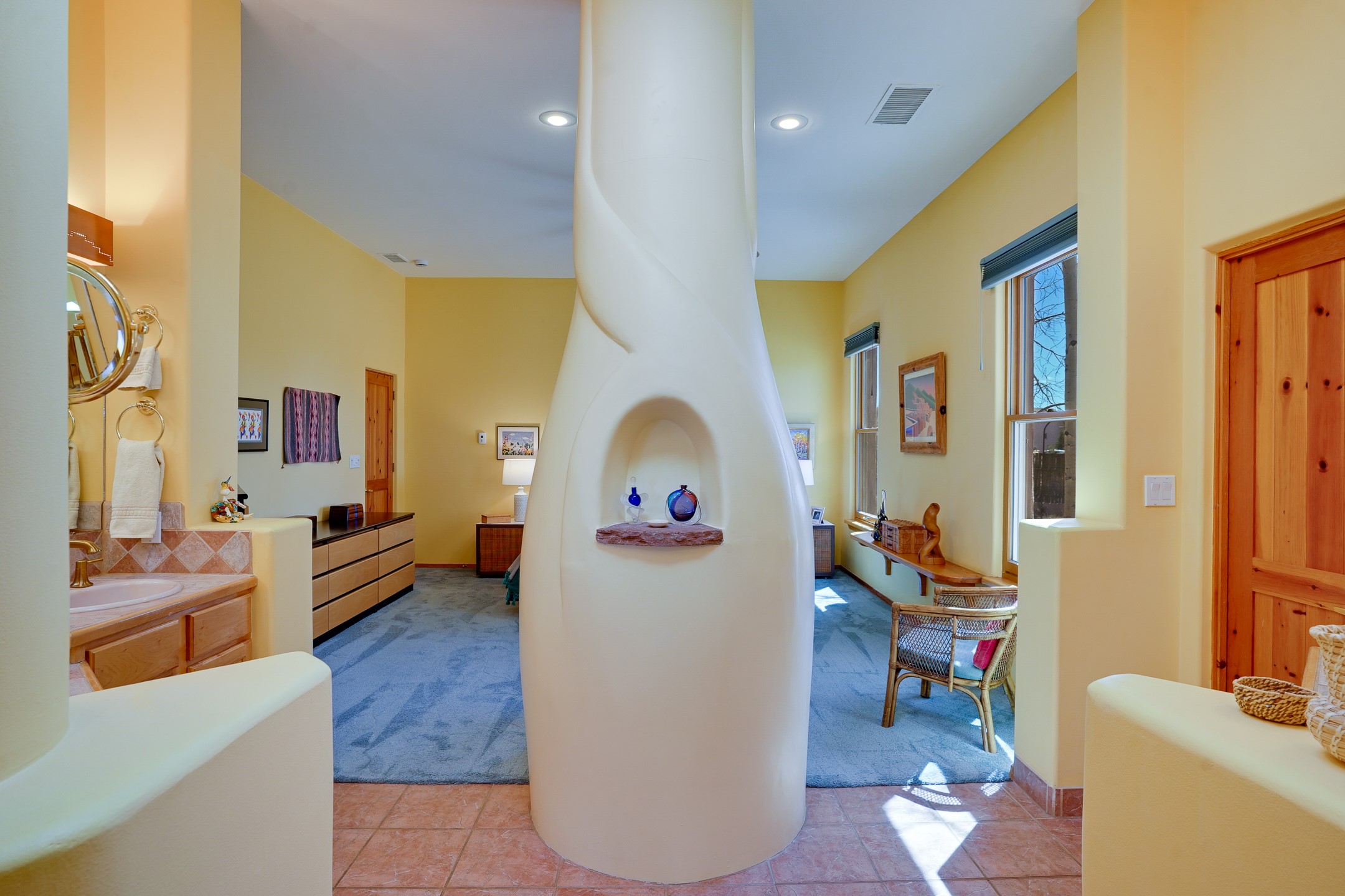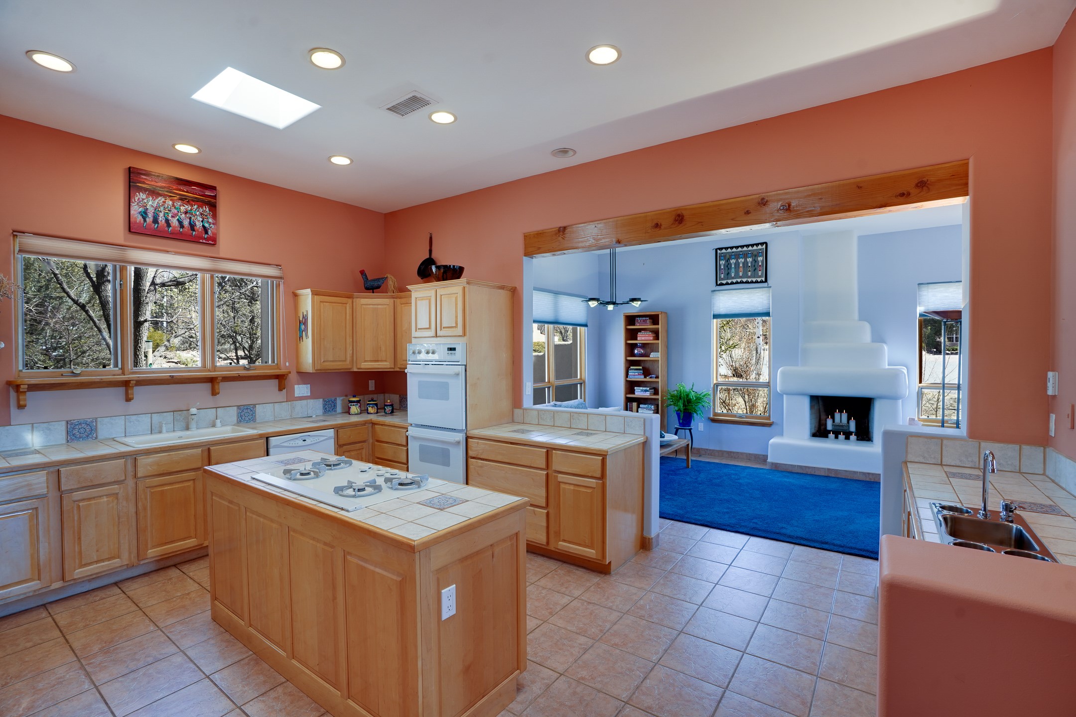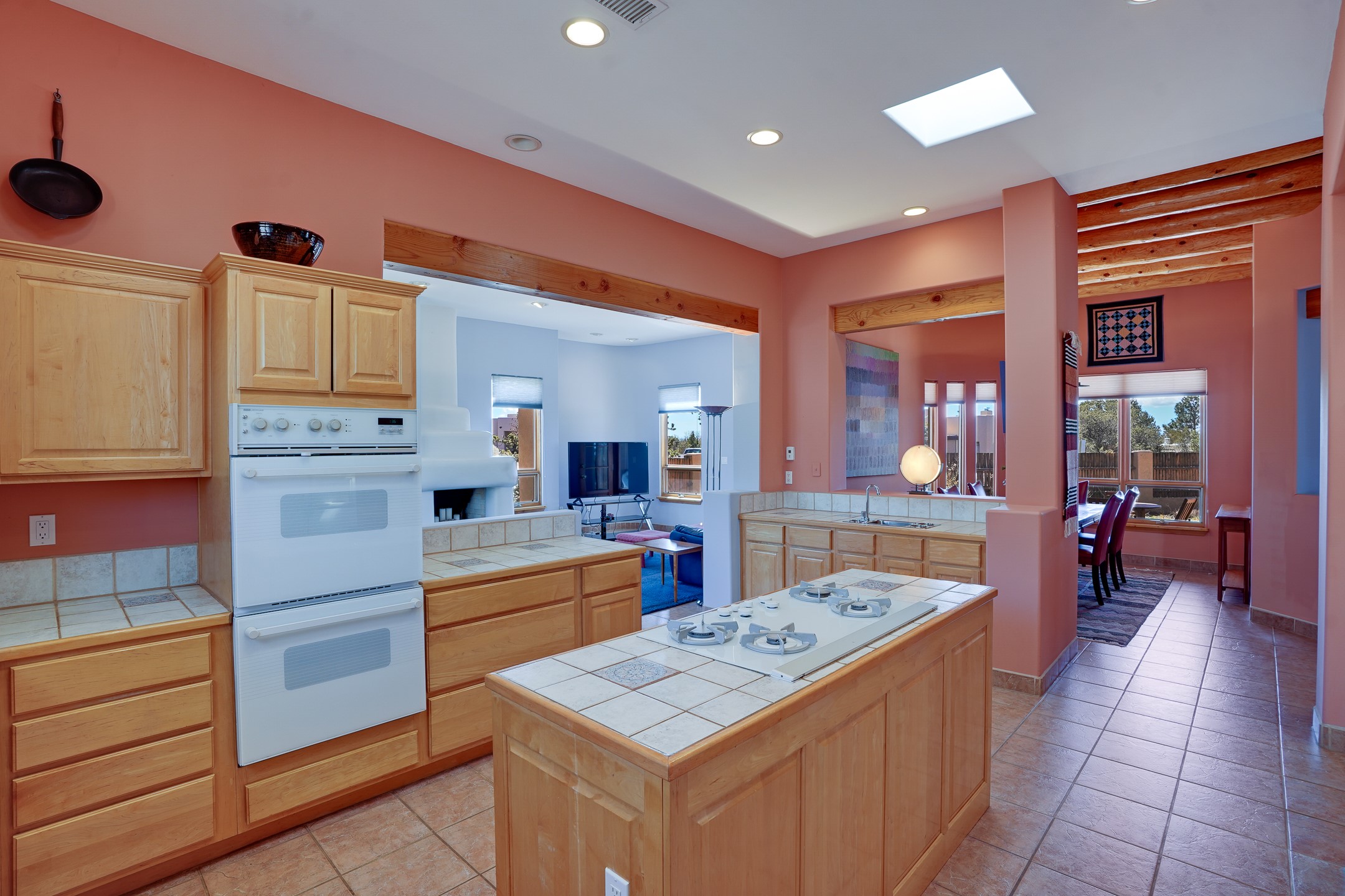 Welcome to this very gracious single level home nestled in the foothills of Santa Fe offering comfort, privacy and convenience with mountain views and spectacular sunsets. It sits on .40 acres just minutes away from museums, shopping, the local hospitals and schools on a cul-de-sac and at the end of the street. The historic plaza is within 4 miles. This home has beautiful high ceilings ( 10 ft,12 ft ,and 14 ft) with vigas in the entryway, dining room and living room. The living room, family room and primary bedroom offer sculpted fireplaces. The primary suite is very spacious and romantic with the stand alone sculpted fireplace, the bathroom has a jetted tub for relaxation, a walk-in shower with grab bars, a large walk-in closet, double sinks, a makeup vanity, tons of light and space. The open kitchen is a 'cooks kitchen' with generous space, double ovens and a center island cooktop. The kitchen and dining room open to a covered back patio with an inline gas barbecue. The patio looks out onto a beautiful garden area offering mature landscaping (with drip irrigation) with cherry and peach trees and dramatic sunset views. This home includes a newer roof (11/2021), new Navien hot water heater and boiler (12/2024), wheelchair accessibility, central air, radiant floor heat, seven skylights and an oversized garage.