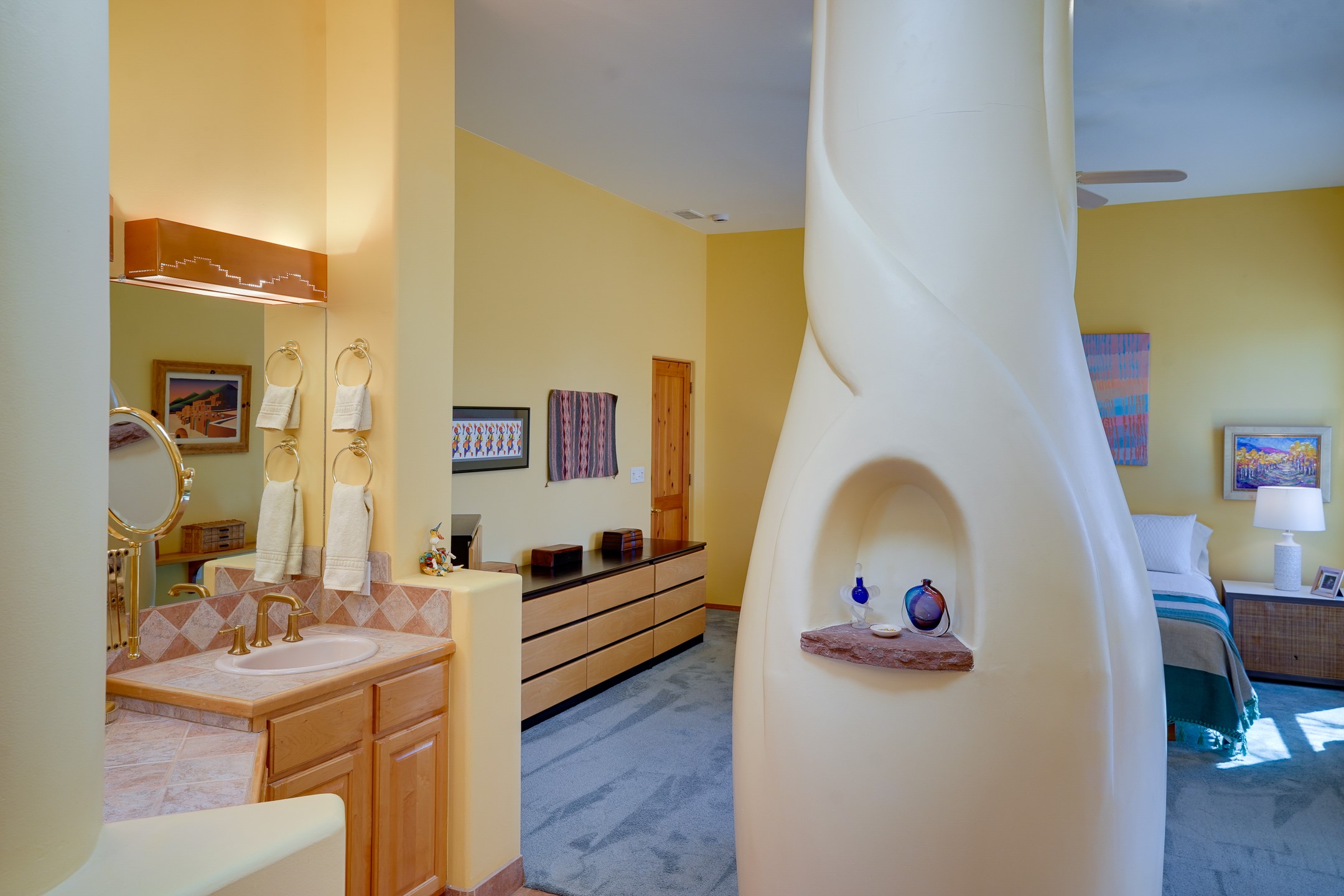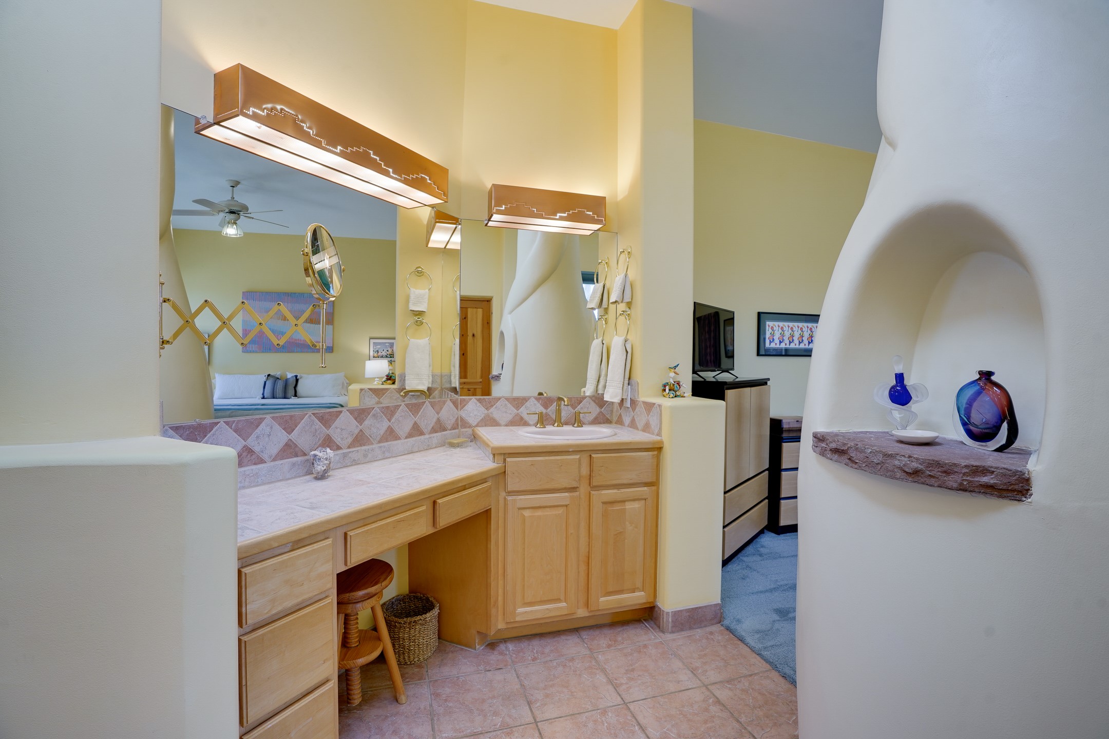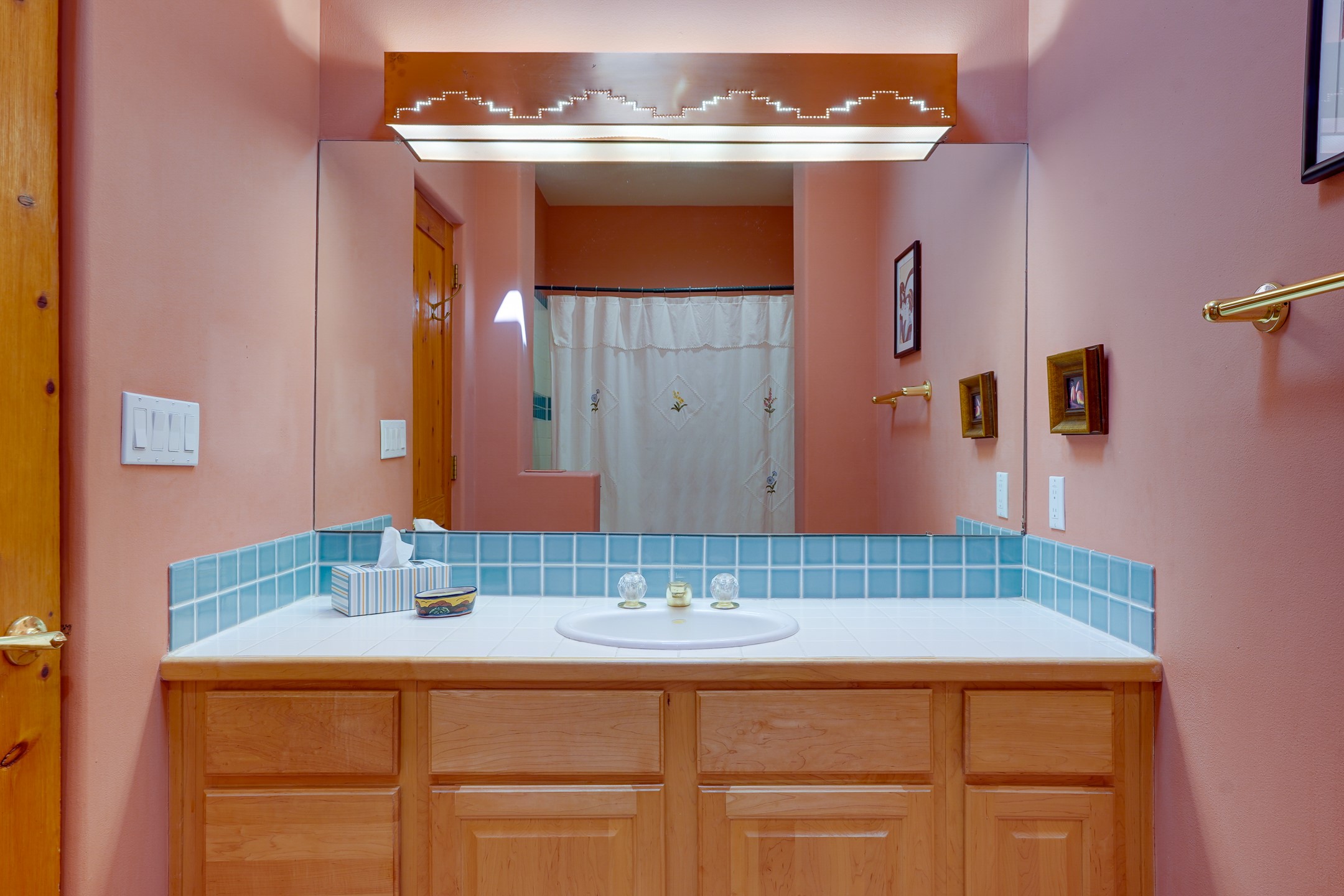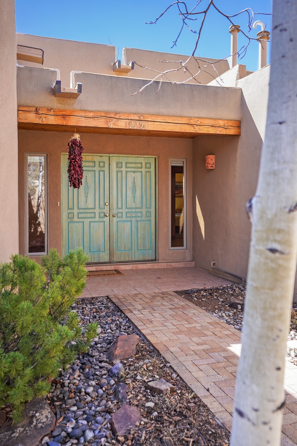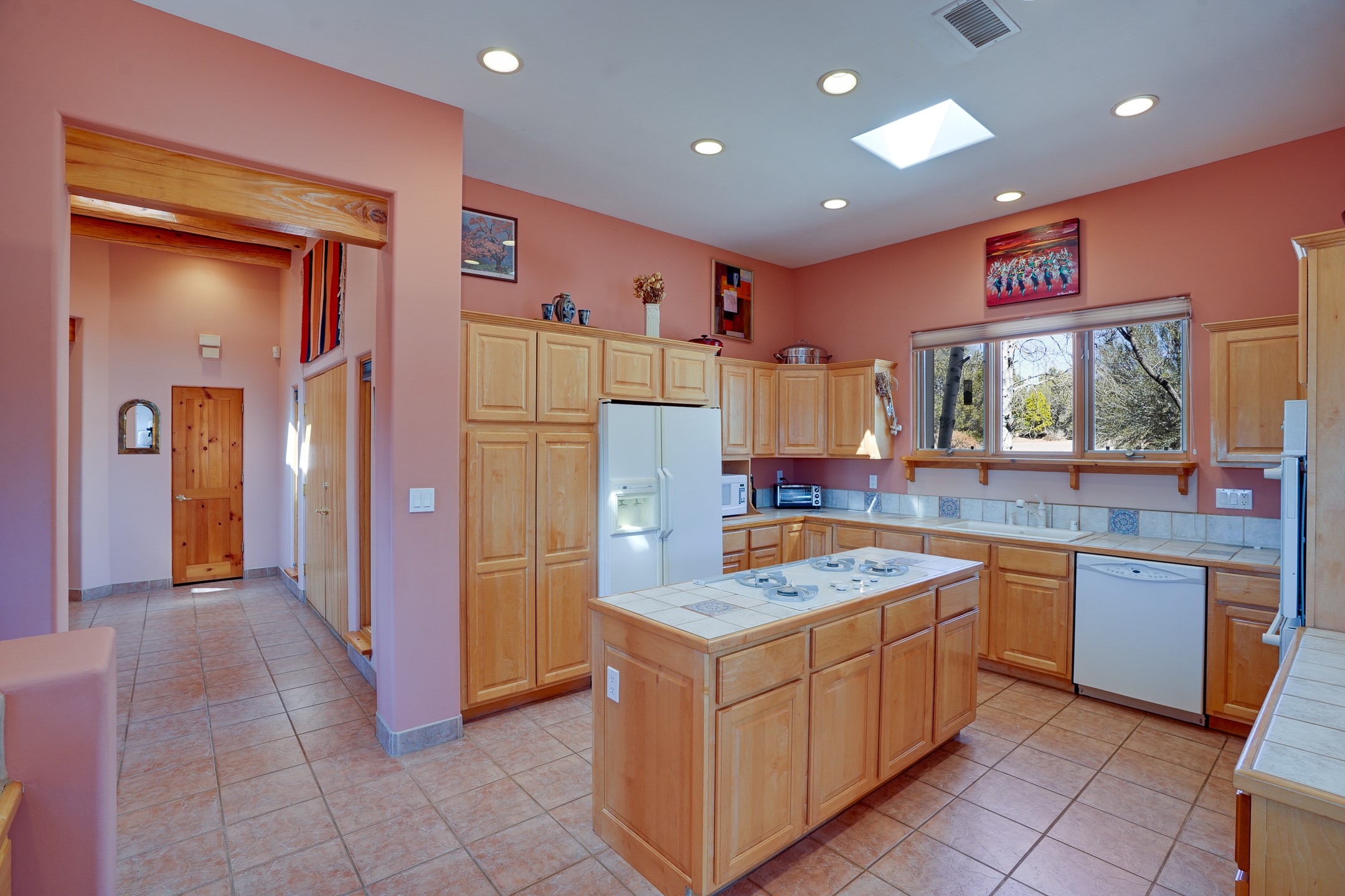 Welcome to this very gracious single level home nestled in the foothills of Santa Fe offering comfort, privacy and convenience with mountain views and spectacular sunsets. It sits on .40 acres just minutes away from museums, shopping, the local hospitals and schools on a cul-de-sac and at the end of the street. The historic plaza is within 4 miles. This home has beautiful high ceilings ( 10 ft,12 ft ,and 14 ft) with vigas in the entryway, dining room and living room. The living room, family room and primary bedroom offer sculpted fireplaces. The primary suite is very spacious and romantic with the stand alone sculpted fireplace, the bathroom has a jetted tub for relaxation, a walk-in shower with grab bars, a large walk-in closet, double sinks, a makeup vanity, tons of light and space. The open kitchen is a 'cooks kitchen' with generous space, double ovens and a center island cooktop. The kitchen and dining room open to a covered back patio with an inline gas barbecue. The patio looks out onto a beautiful garden area offering mature landscaping (with drip irrigation) with cherry and peach trees and dramatic sunset views. This home includes a newer roof (11/2021), new Navien hot water heater and boiler (12/2024), wheelchair accessibility, central air, radiant floor heat, seven skylights and an oversized garage.