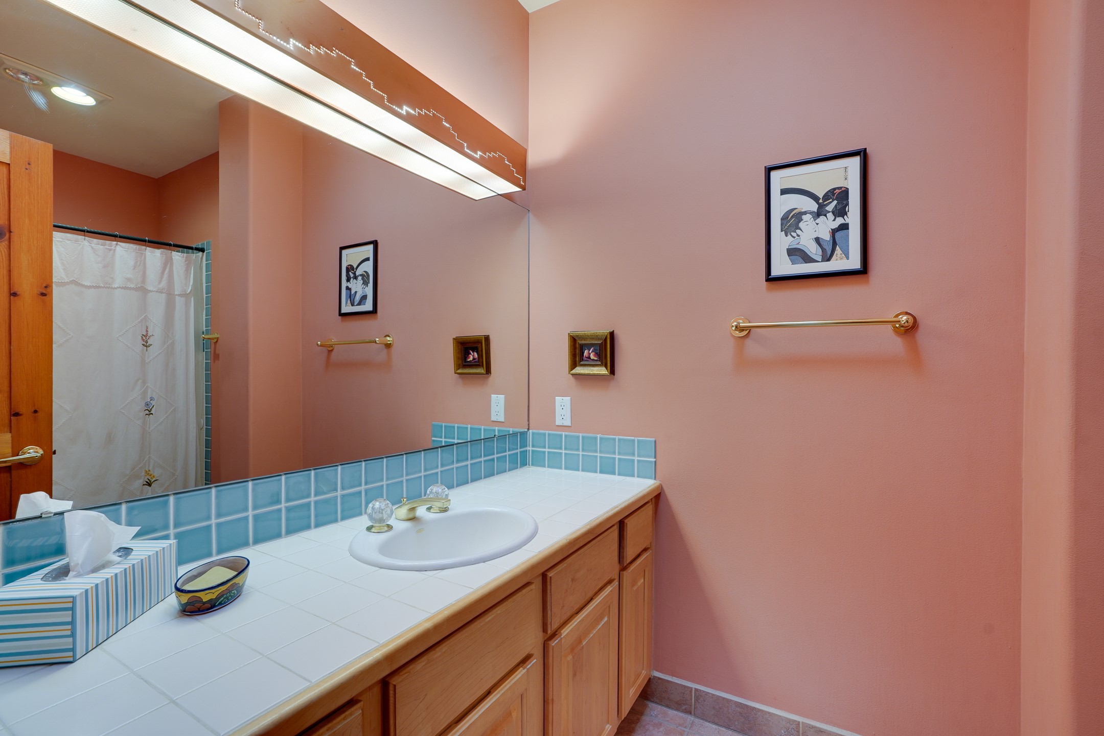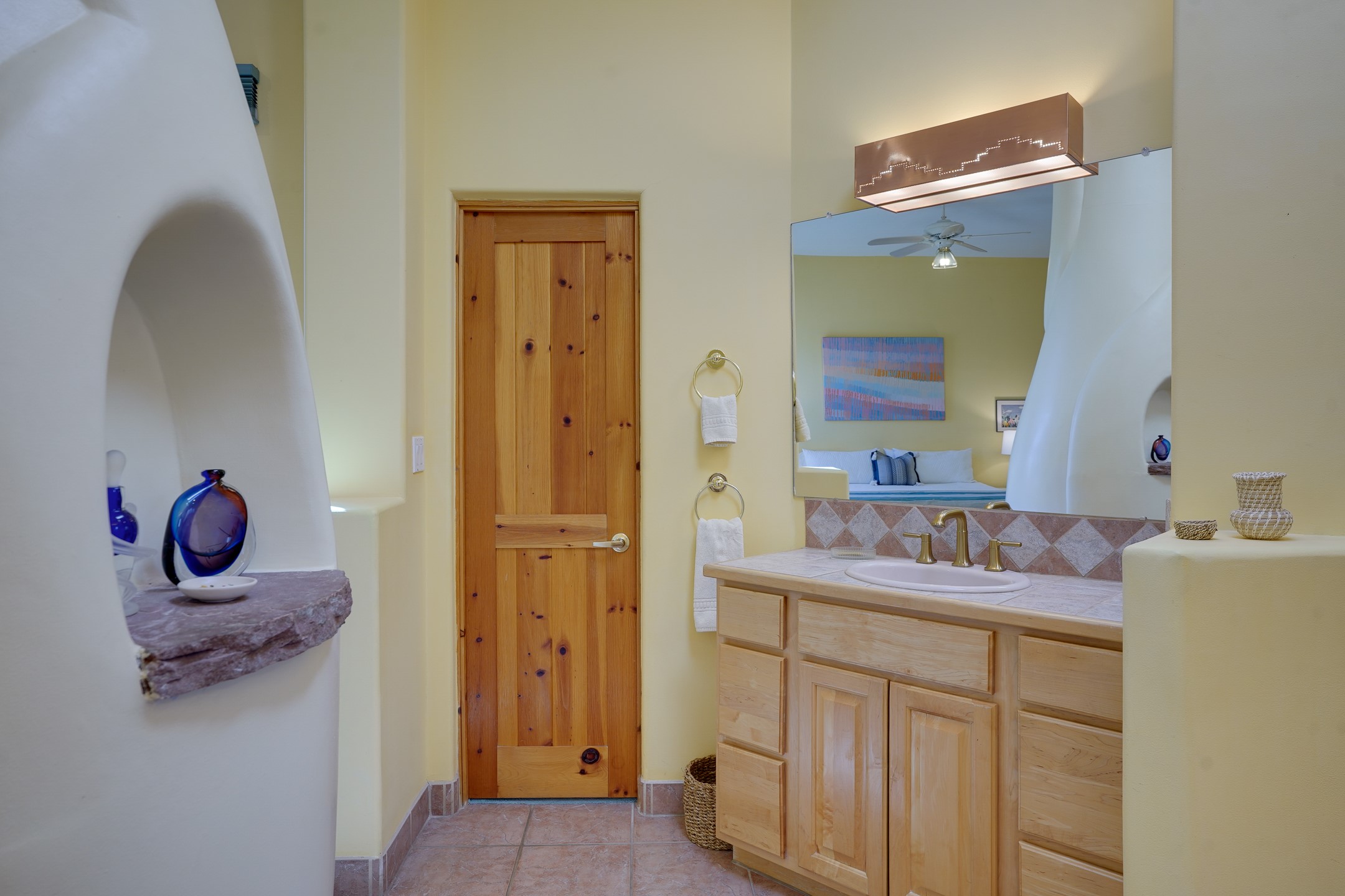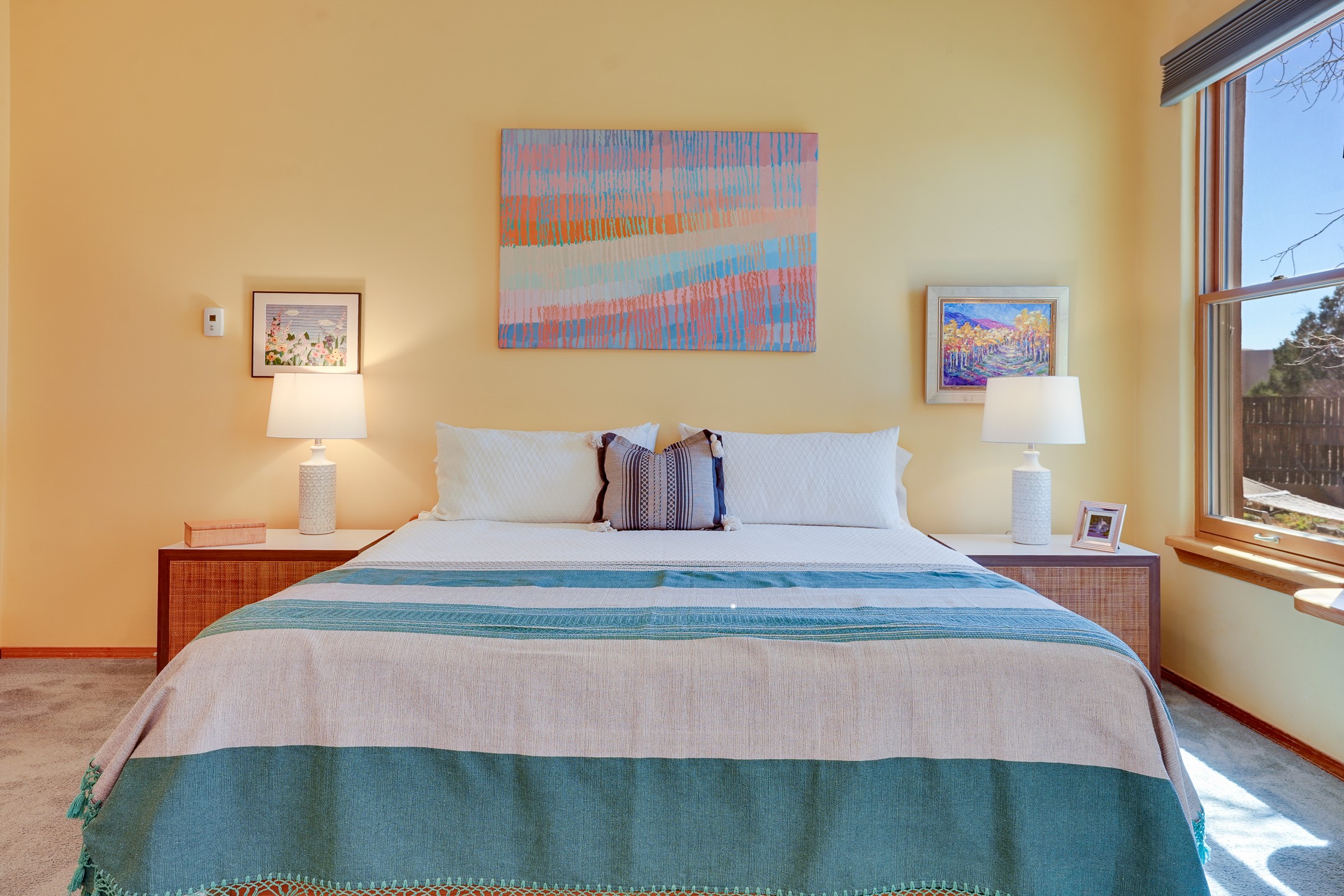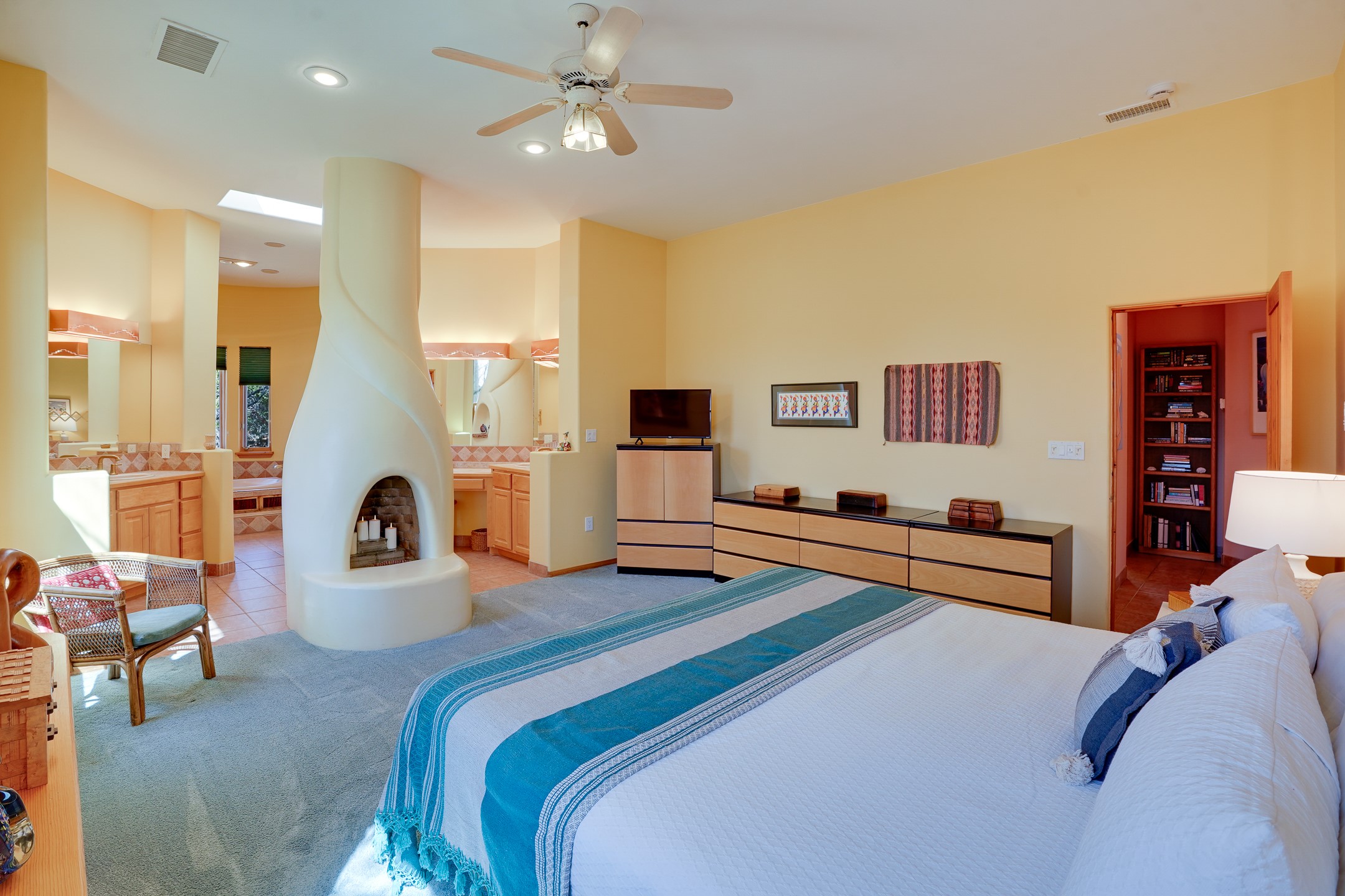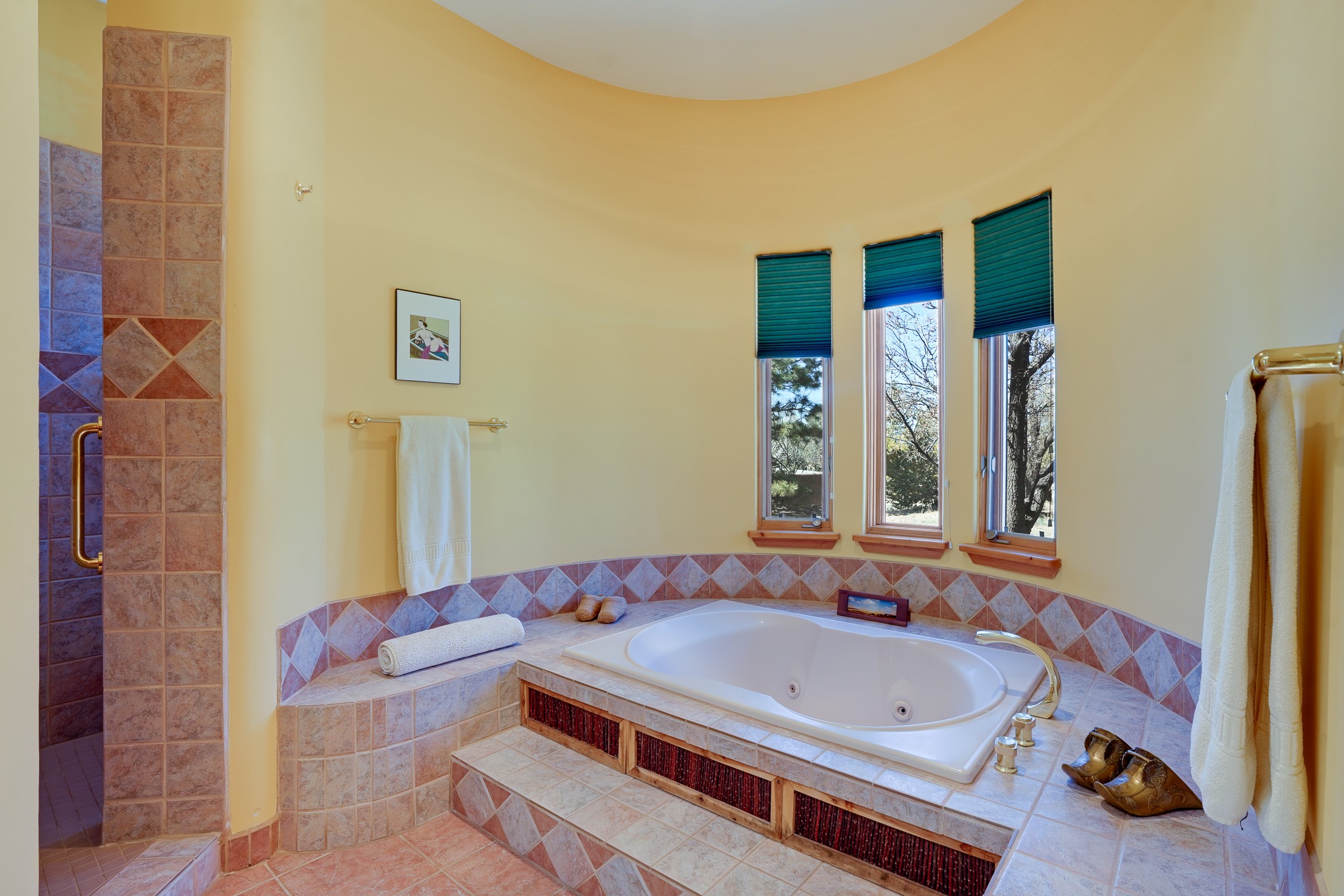 Welcome to this very gracious single level home nestled in the foothills of Santa Fe offering comfort, privacy and convenience with mountain views and spectacular sunsets. It sits on .40 acres just minutes away from museums, shopping, the local hospitals and schools on a cul-de-sac and at the end of the street. The historic plaza is within 4 miles. This home has beautiful high ceilings ( 10 ft,12 ft ,and 14 ft) with vigas in the entryway, dining room and living room. The living room, family room and primary bedroom offer sculpted fireplaces. The primary suite is very spacious and romantic with the stand alone sculpted fireplace, the bathroom has a jetted tub for relaxation, a walk-in shower with grab bars, a large walk-in closet, double sinks, a makeup vanity, tons of light and space. The open kitchen is a 'cooks kitchen' with generous space, double ovens and a center island cooktop. The kitchen and dining room open to a covered back patio with an inline gas barbecue. The patio looks out onto a beautiful garden area offering mature landscaping (with drip irrigation) with cherry and peach trees and dramatic sunset views. This home includes a newer roof (11/2021), new Navien hot water heater and boiler (12/2024), wheelchair accessibility, central air, radiant floor heat, seven skylights and an oversized garage.