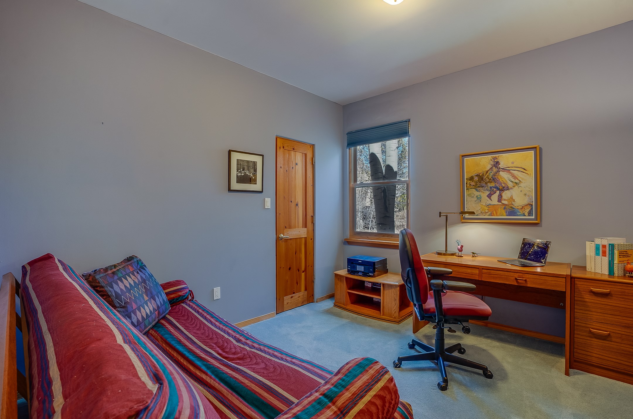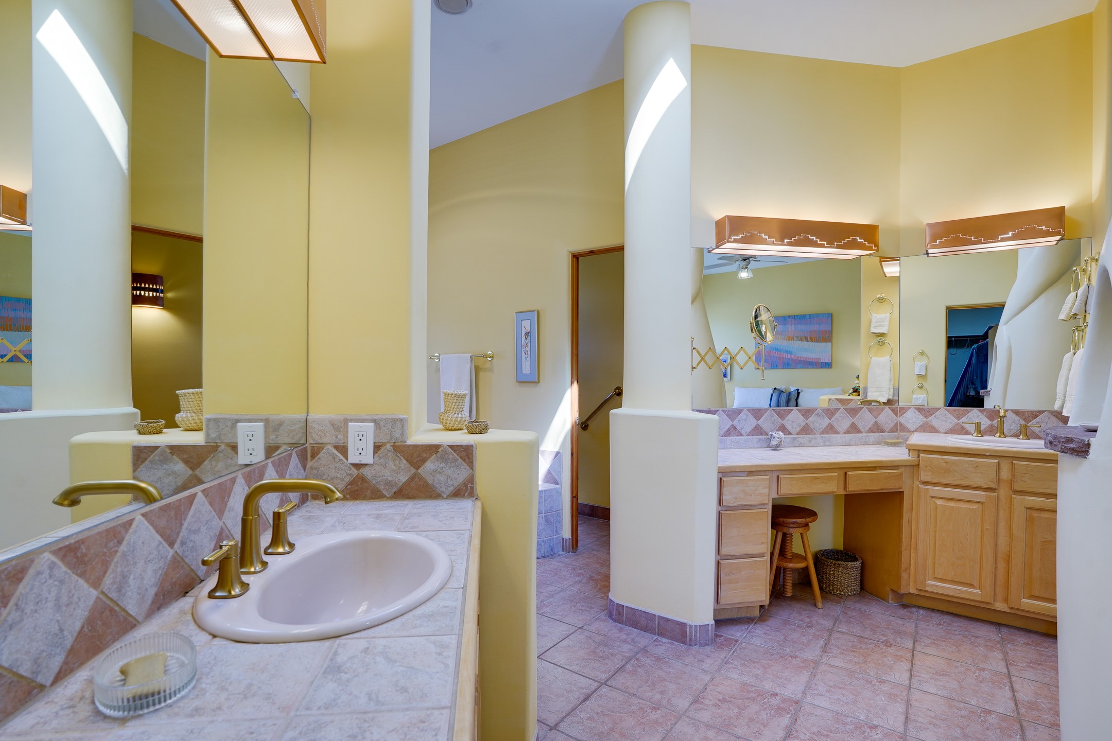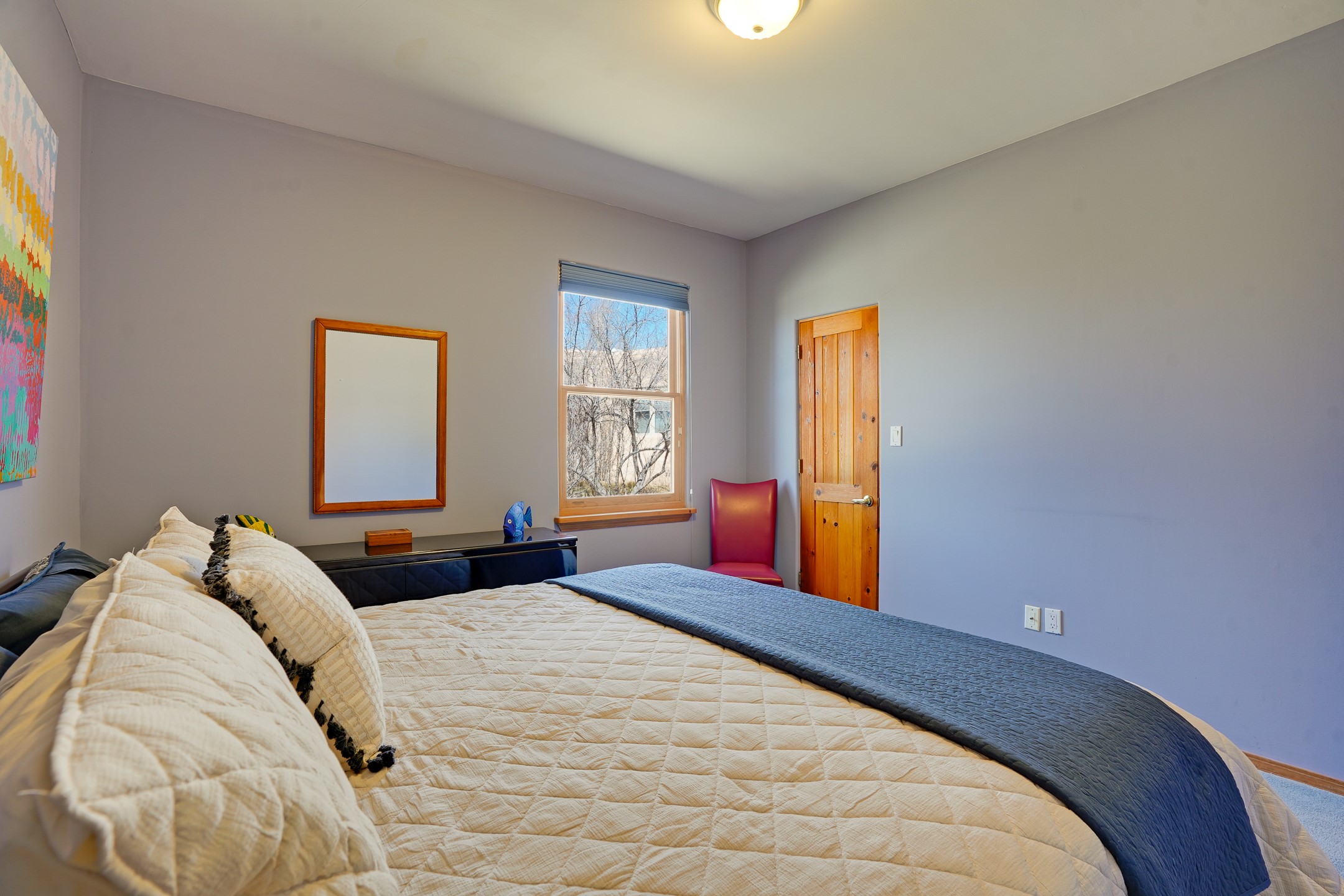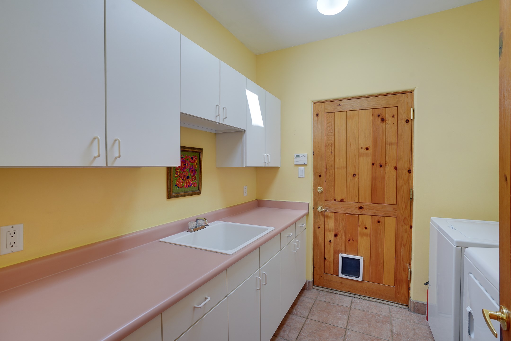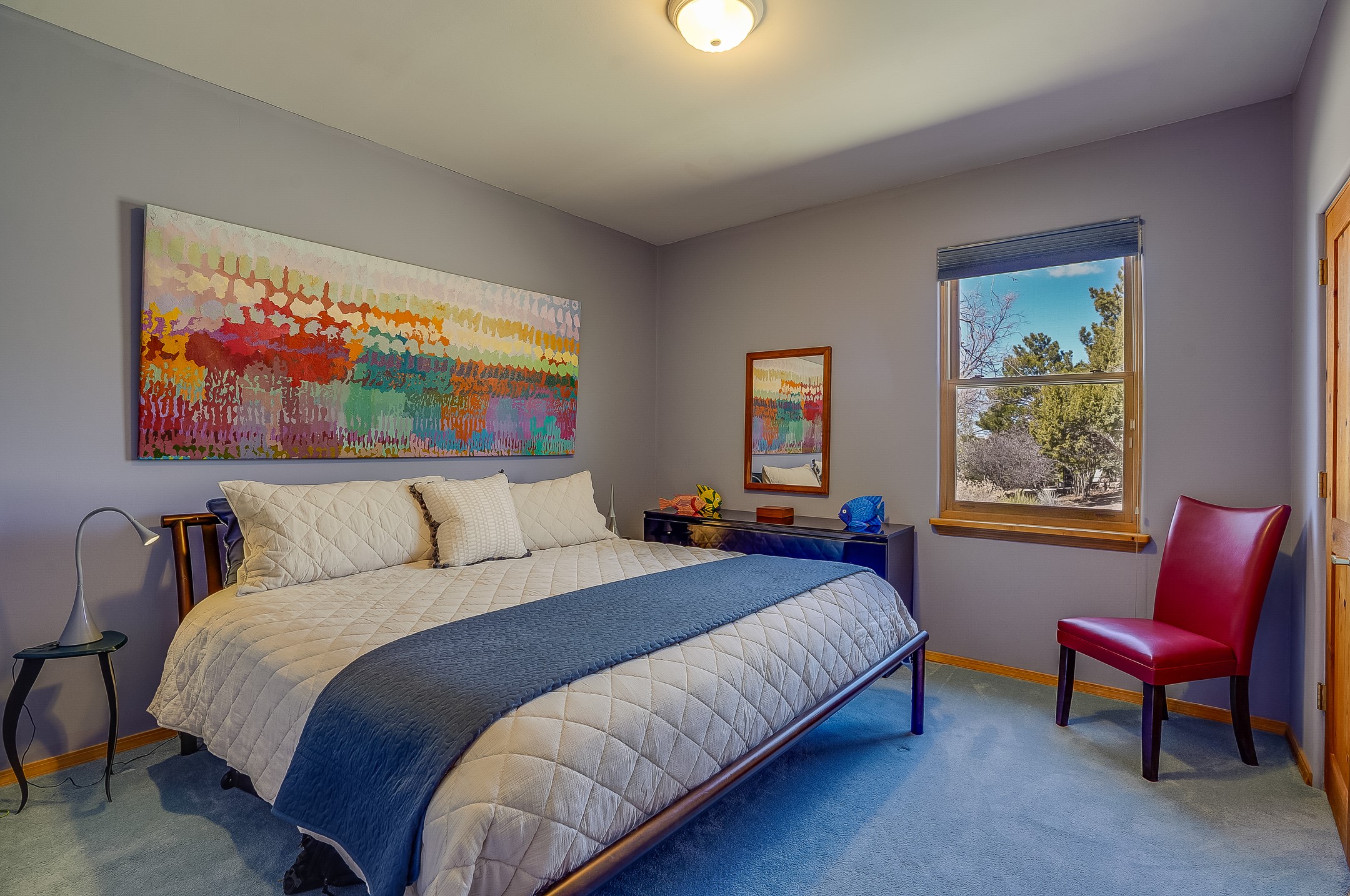 Welcome to this very gracious single level home nestled in the foothills of Santa Fe offering comfort, privacy and convenience with mountain views and spectacular sunsets. It sits on .40 acres just minutes away from museums, shopping, the local hospitals and schools on a cul-de-sac and at the end of the street. The historic plaza is within 4 miles. This home has beautiful high ceilings ( 10 ft,12 ft ,and 14 ft) with vigas in the entryway, dining room and living room. The living room, family room and primary bedroom offer sculpted fireplaces. The primary suite is very spacious and romantic with the stand alone sculpted fireplace, the bathroom has a jetted tub for relaxation, a walk-in shower with grab bars, a large walk-in closet, double sinks, a makeup vanity, tons of light and space. The open kitchen is a 'cooks kitchen' with generous space, double ovens and a center island cooktop. The kitchen and dining room open to a covered back patio with an inline gas barbecue. The patio looks out onto a beautiful garden area offering mature landscaping (with drip irrigation) with cherry and peach trees and dramatic sunset views. This home includes a newer roof (11/2021), new Navien hot water heater and boiler (12/2024), wheelchair accessibility, central air, radiant floor heat, seven skylights and an oversized garage.