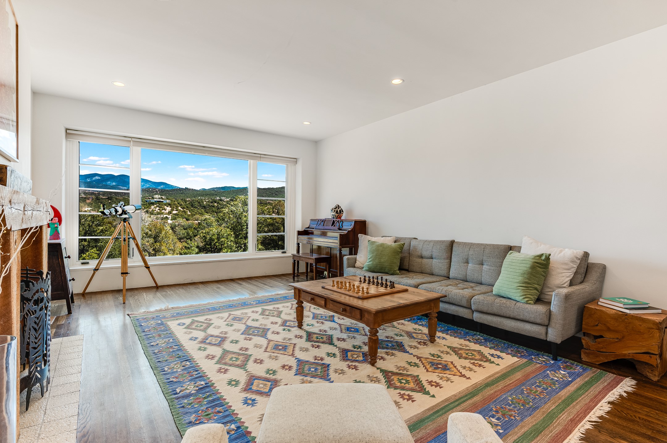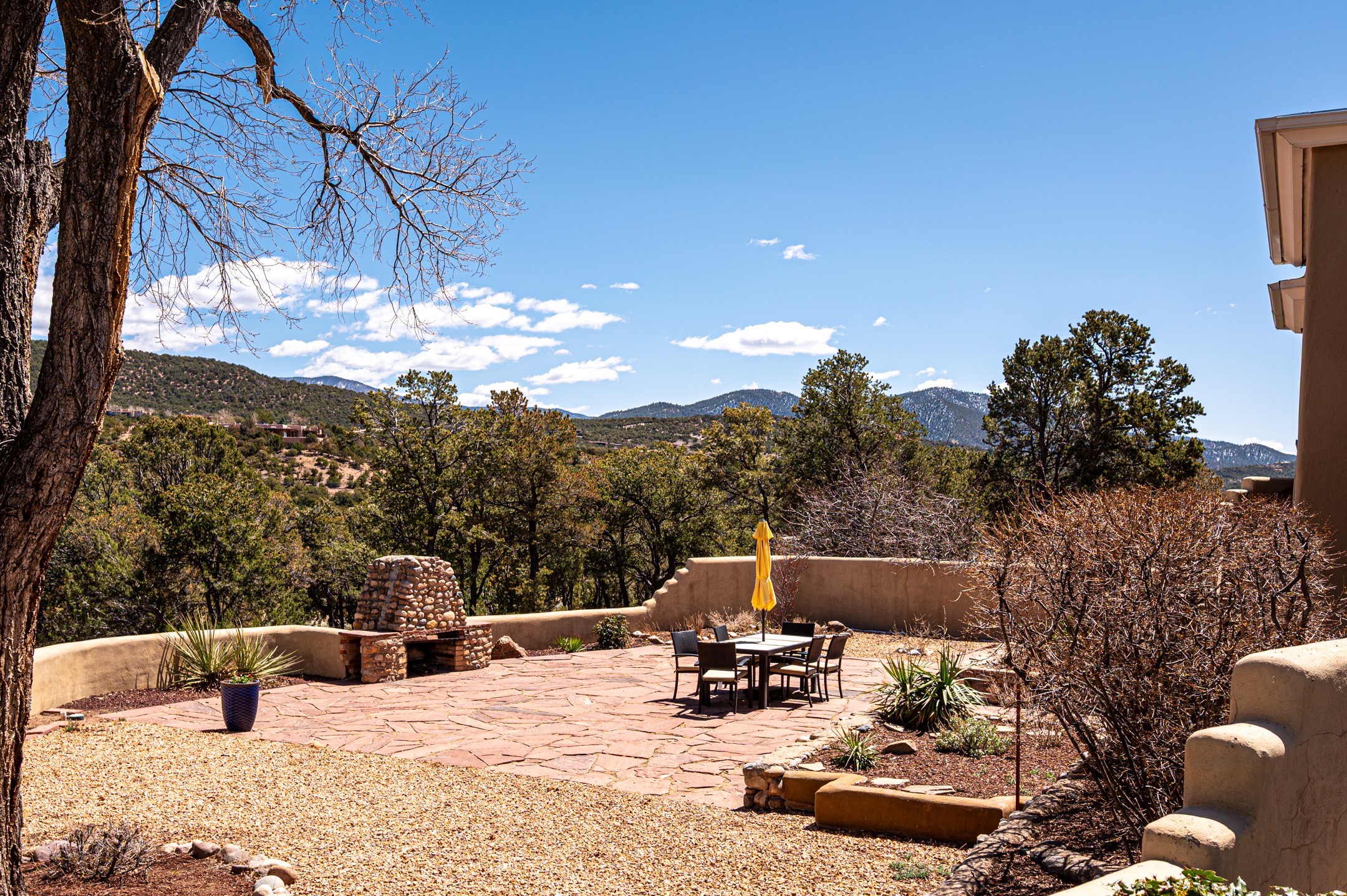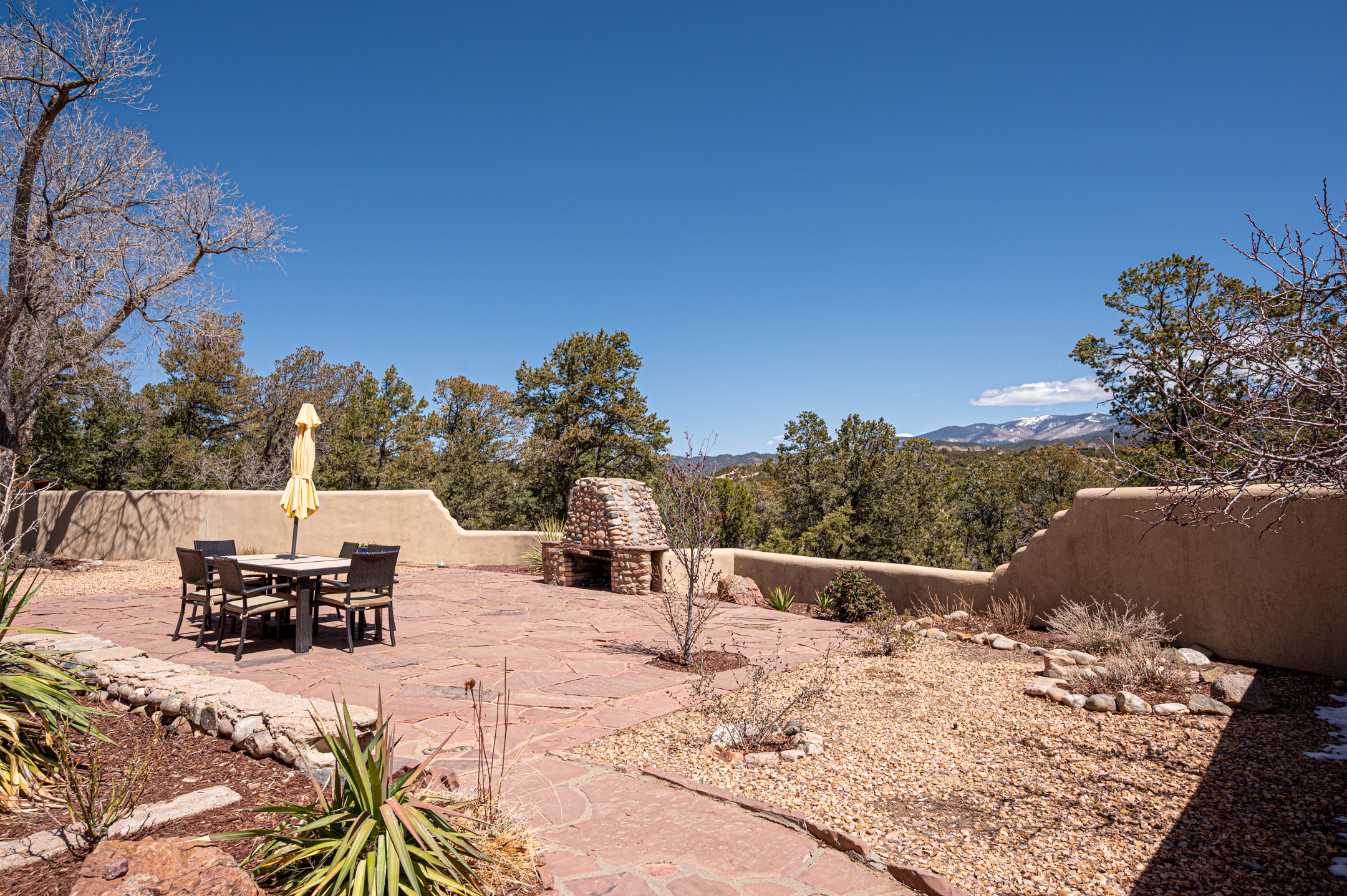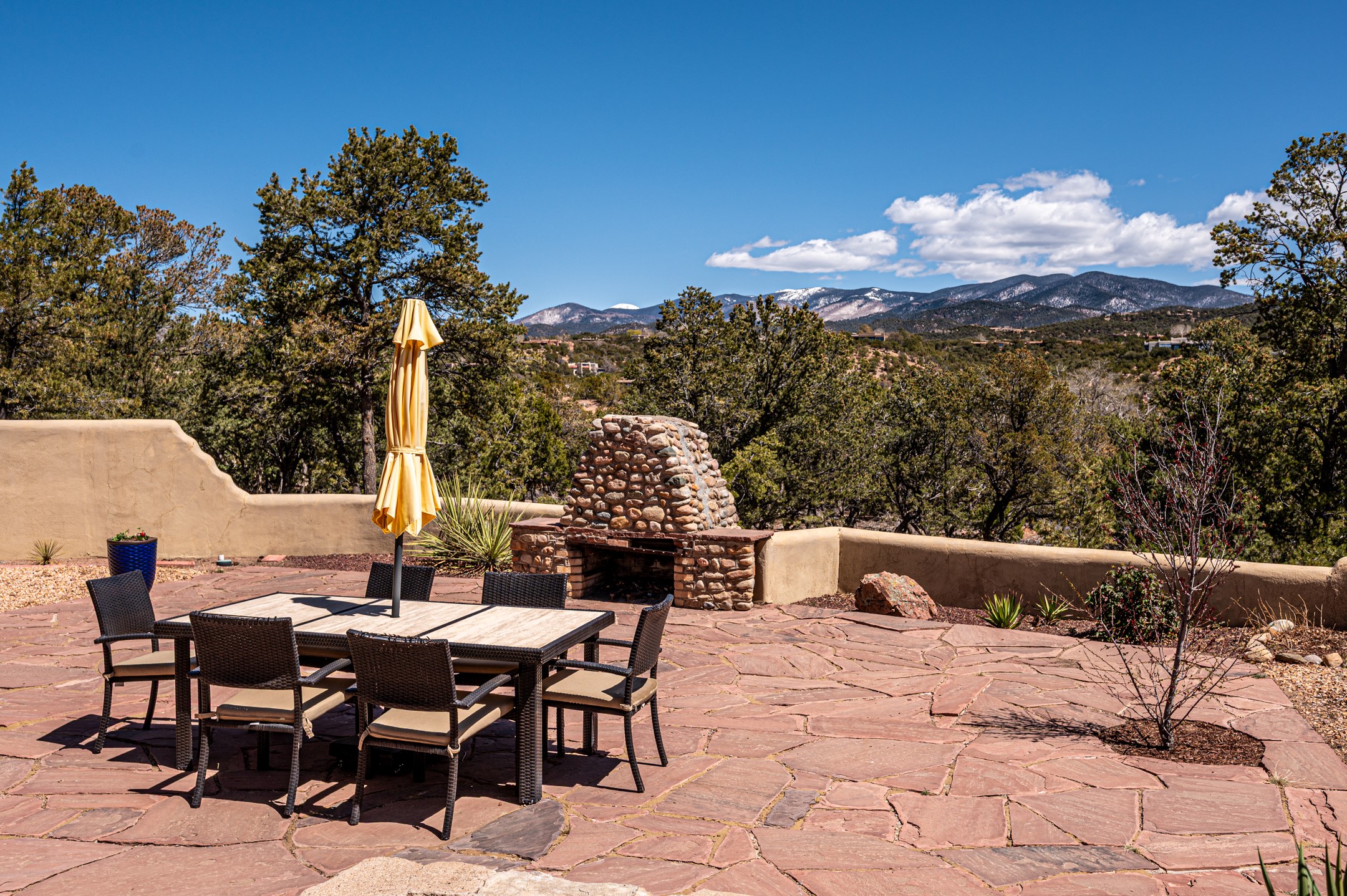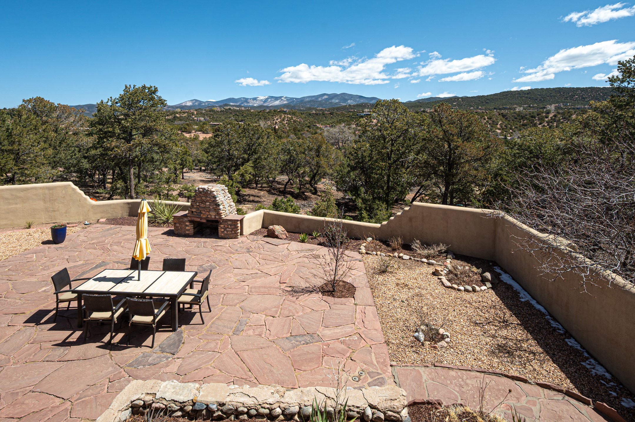 Minutes from the Historic Plaza, this home is tucked in off the street with a gracious circular drive and two coyote gates. Enter the foyer to the extraordinary Sangre de Cristo mountains views with solid oak flooring throughout. The gracious owner's bedroom has a full ensuite bath, a walk-in closet, views, and exterior access to outside spaces. The spacious guest suite has a full bath that can double as a powder room. Also, on the main floor, you will find an open floorplan including formal and informal living and dining, two fireplaces, and a well-appointed kitchen with leathered granite countertops and an attached laundry room. Downstairs, there is a flex space of 2 bedrooms, 2 full baths, each with closets and access to the outside flagstone patio living. This downstairs offers media room, office, and/or playroom possibilities. The grand outside patio has 2 large areas, each with spectacular views and custom fireplaces. The mountain view is your neighbor. Beautiful and light filled sited on 2.5 acres, including a detached 2-car garage with storage space and all this for a great price.