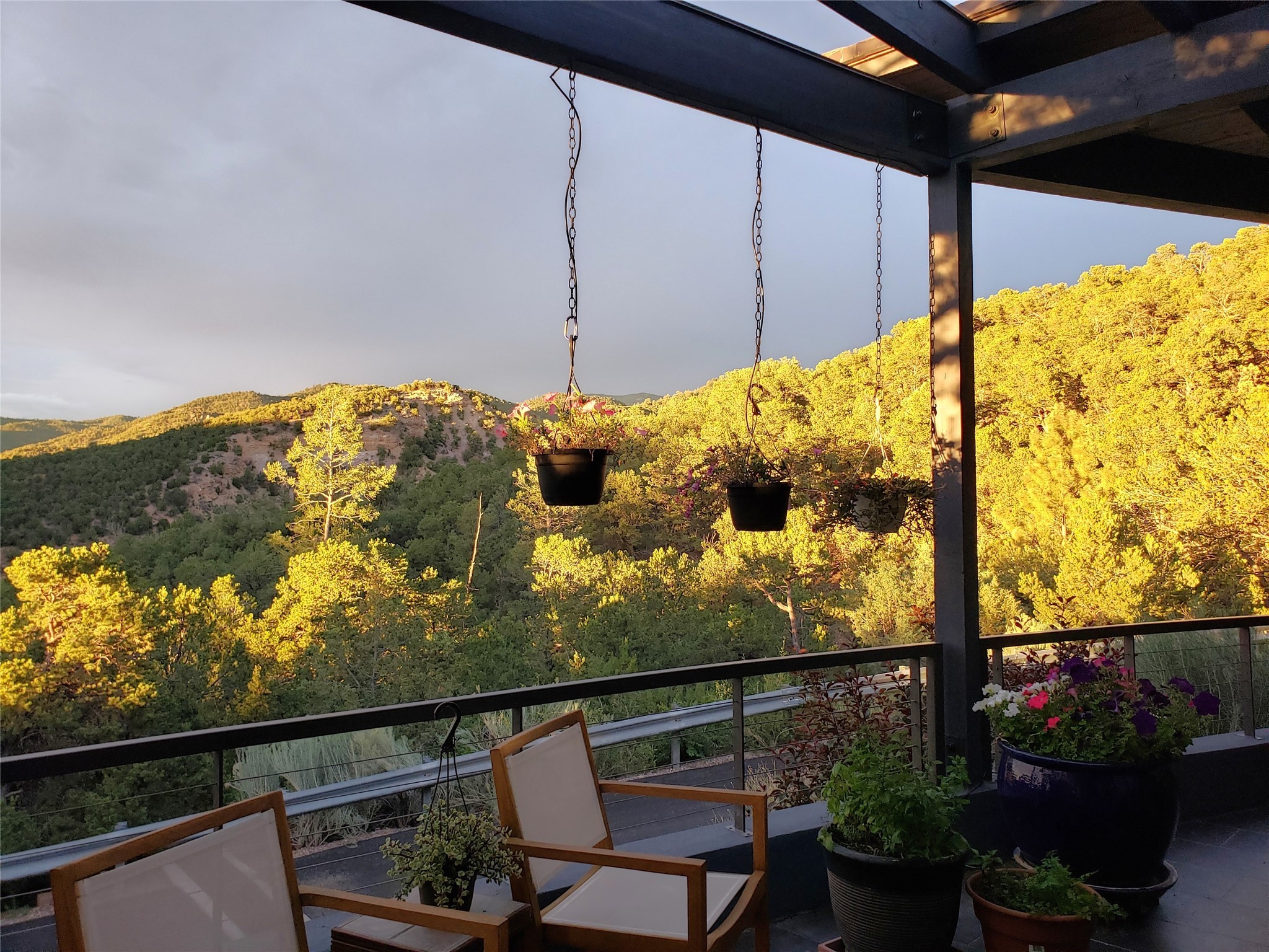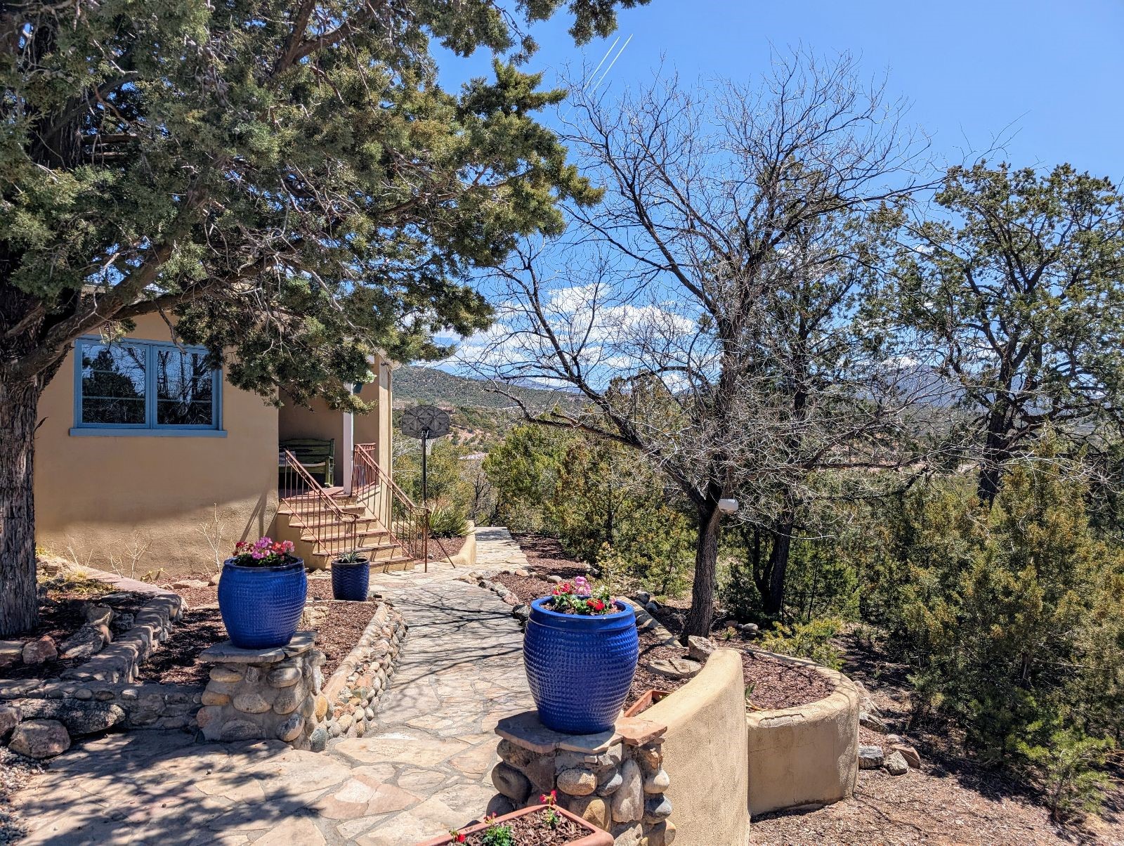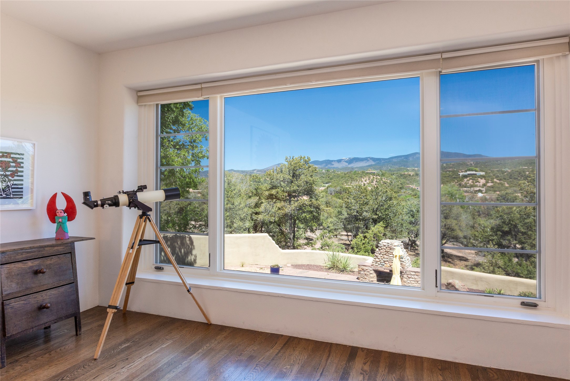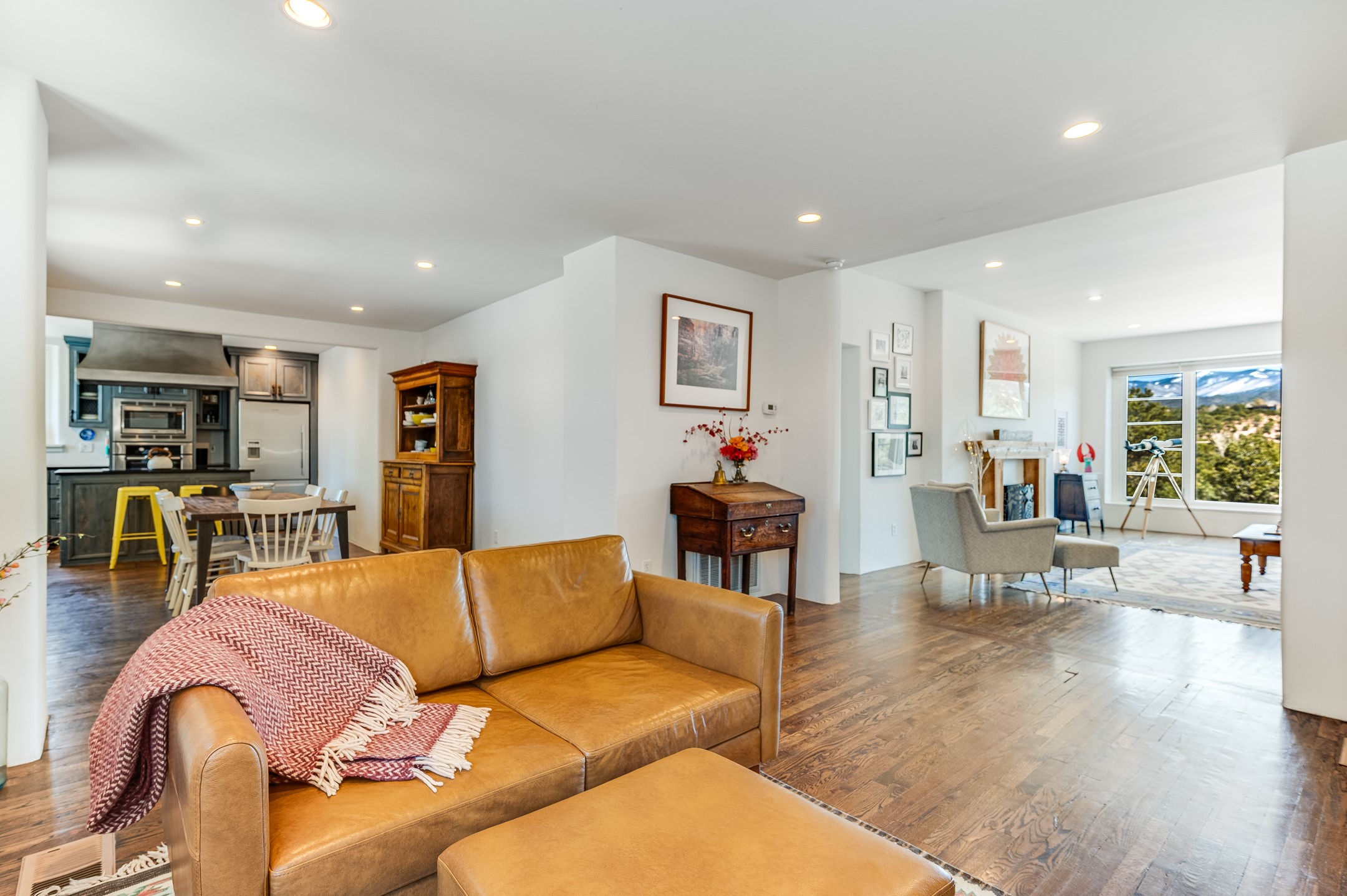 Minutes from the Historic Plaza, this home is tucked in off the street with a gracious circular drive and two coyote gates. Enter the foyer to the extraordinary Sangre de Cristo mountains views with solid oak flooring throughout. The gracious owner's bedroom has a full ensuite bath, a walk-in closet, views, and exterior access to outside spaces. The spacious guest suite has a full bath that can double as a powder room. Also, on the main floor, you will find an open floorplan including formal and informal living and dining, two fireplaces, and a well-appointed kitchen with leathered granite countertops and an attached laundry room. Downstairs, there is a flex space of 2 bedrooms, 2 full baths, each with closets and access to the outside flagstone patio living. This downstairs offers media room, office, and/or playroom possibilities. The grand outside patio has 2 large areas, each with spectacular views and custom fireplaces. The mountain view is your neighbor. Beautiful and light filled sited on 2.5 acres, including a detached 2-car garage with storage space and all this for a great price.