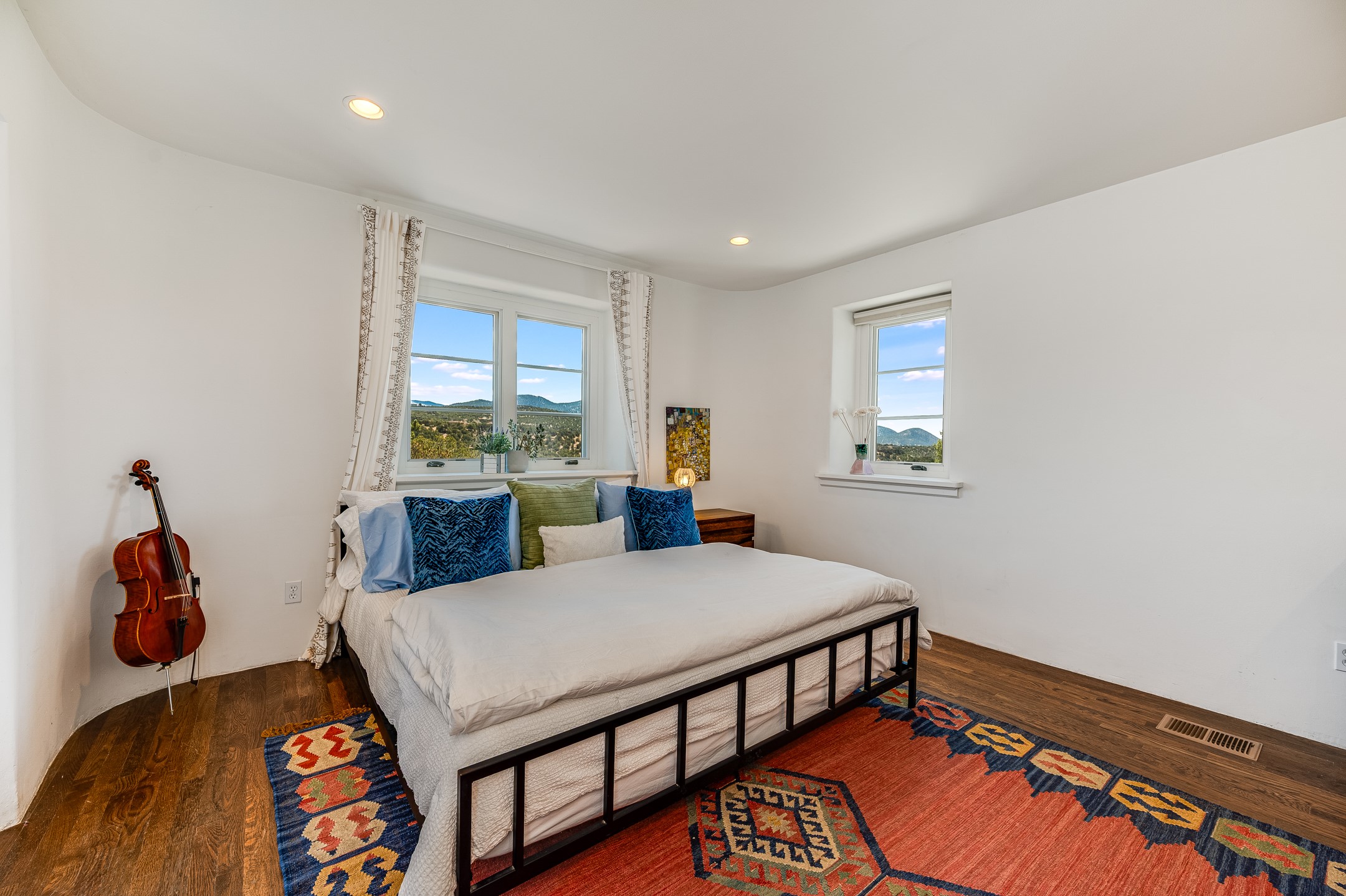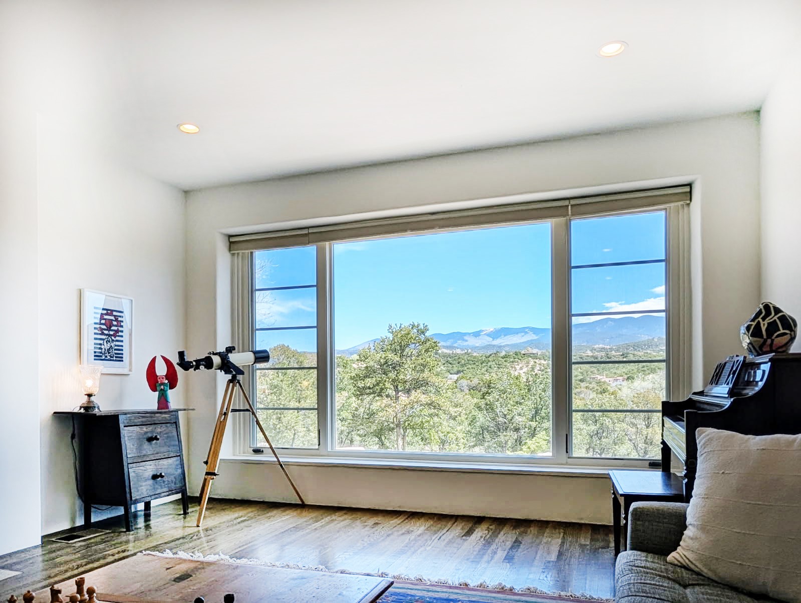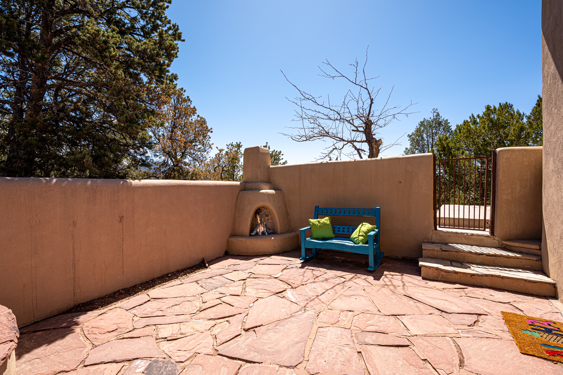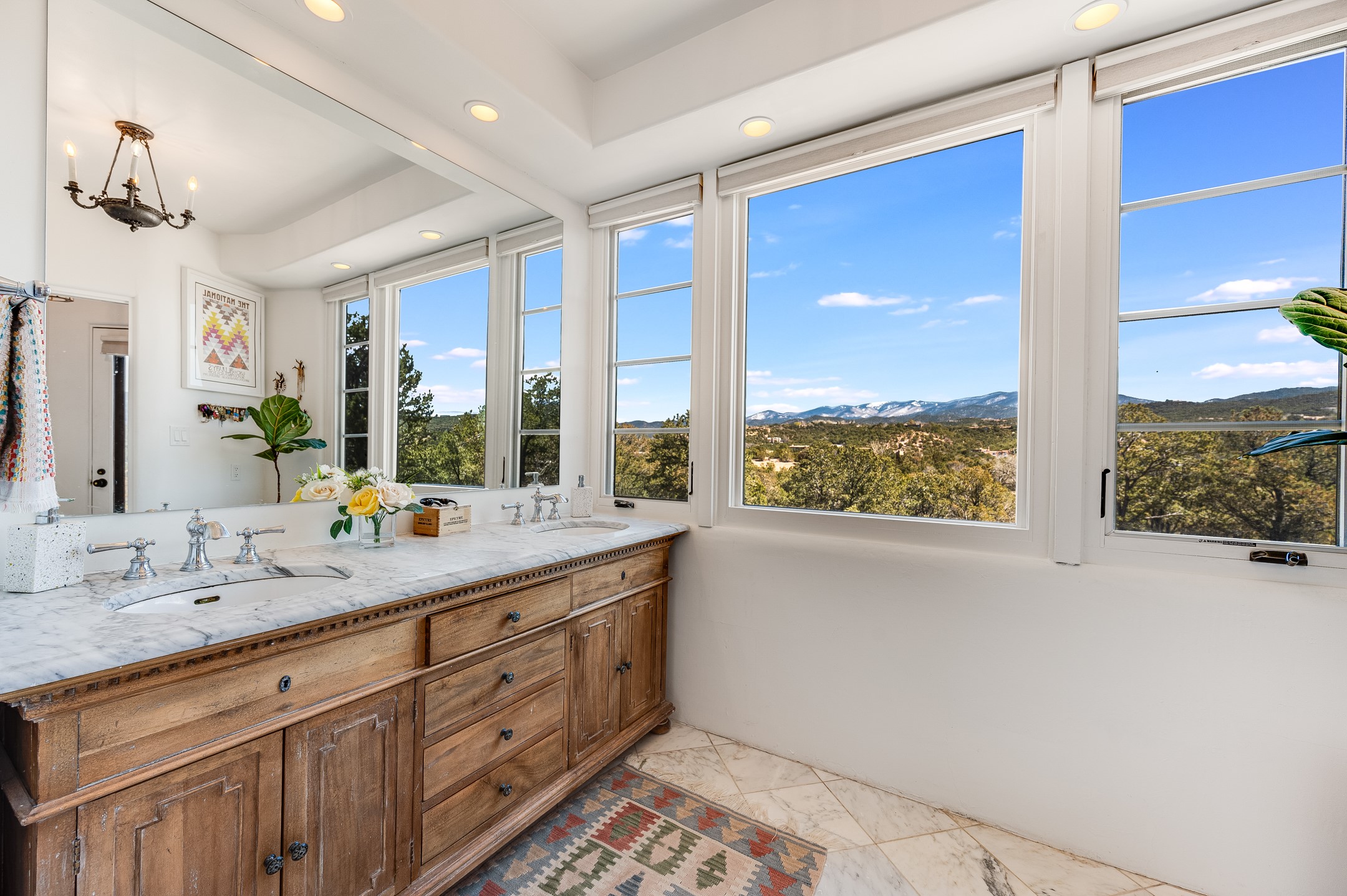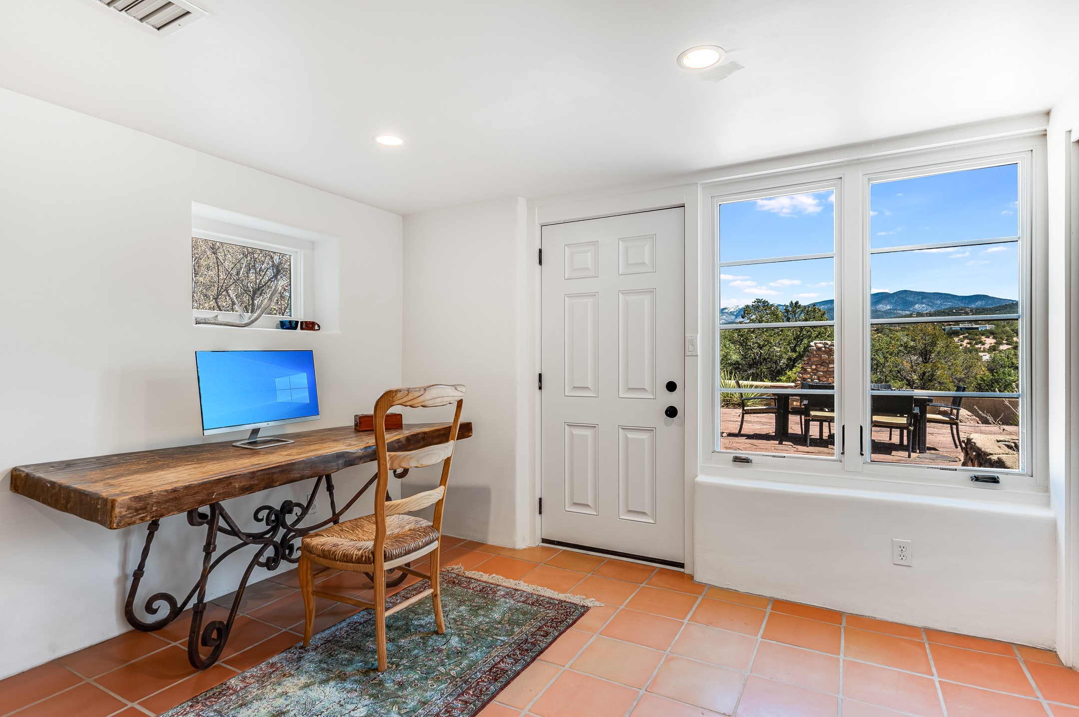 Minutes from the Historic Plaza, this home is tucked in off the street with a gracious circular drive and two coyote gates. Enter the foyer to the extraordinary Sangre de Cristo mountains views with solid oak flooring throughout. The gracious owner's bedroom has a full ensuite bath, a walk-in closet, views, and exterior access to outside spaces. The spacious guest suite has a full bath that can double as a powder room. Also, on the main floor, you will find an open floorplan including formal and informal living and dining, two fireplaces, and a well-appointed kitchen with leathered granite countertops and an attached laundry room. Downstairs, there is a flex space of 2 bedrooms, 2 full baths, each with closets and access to the outside flagstone patio living. This downstairs offers media room, office, and/or playroom possibilities. The grand outside patio has 2 large areas, each with spectacular views and custom fireplaces. The mountain view is your neighbor. Beautiful and light filled sited on 2.5 acres, including a detached 2-car garage with storage space and all this for a great price.