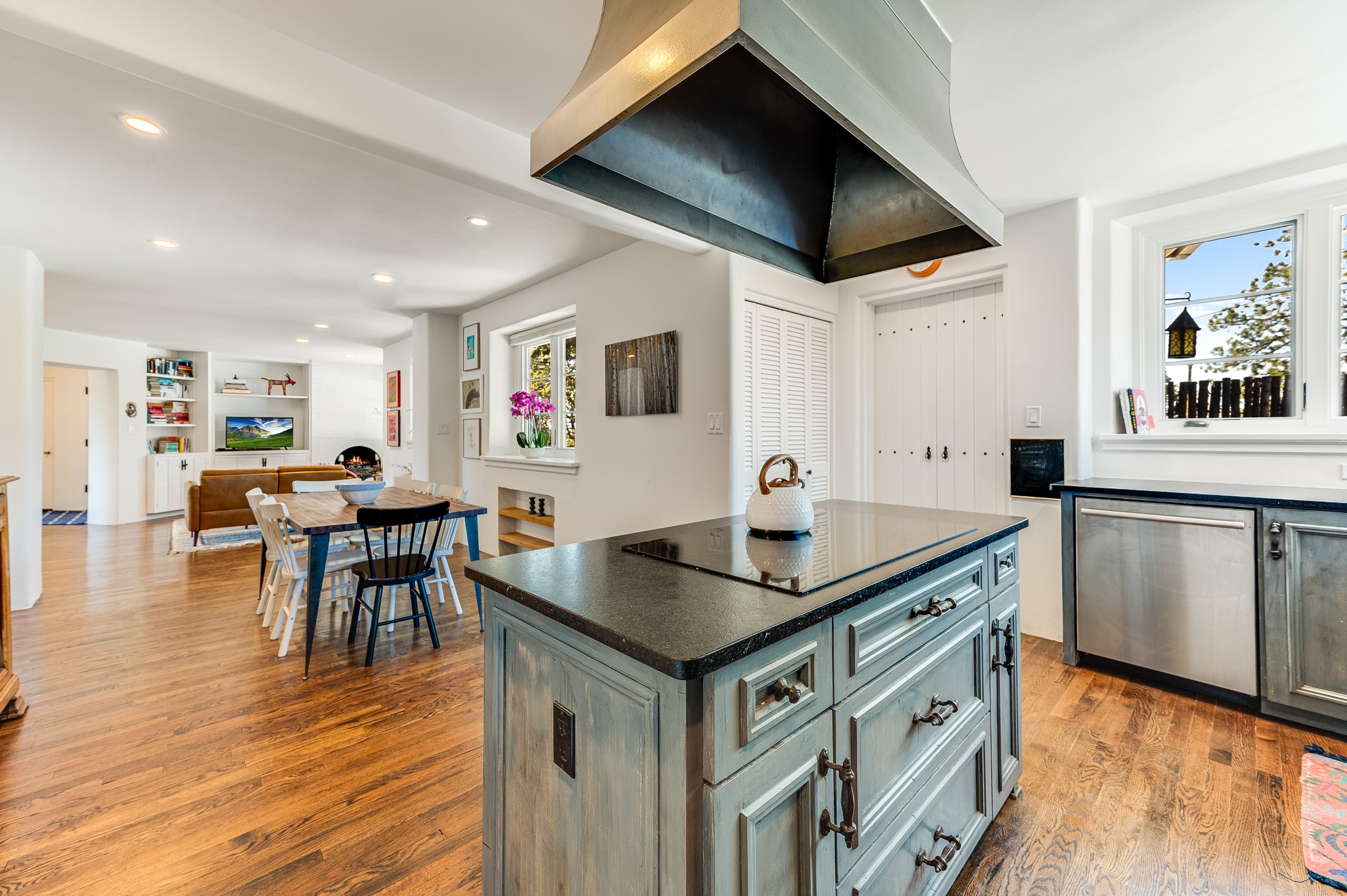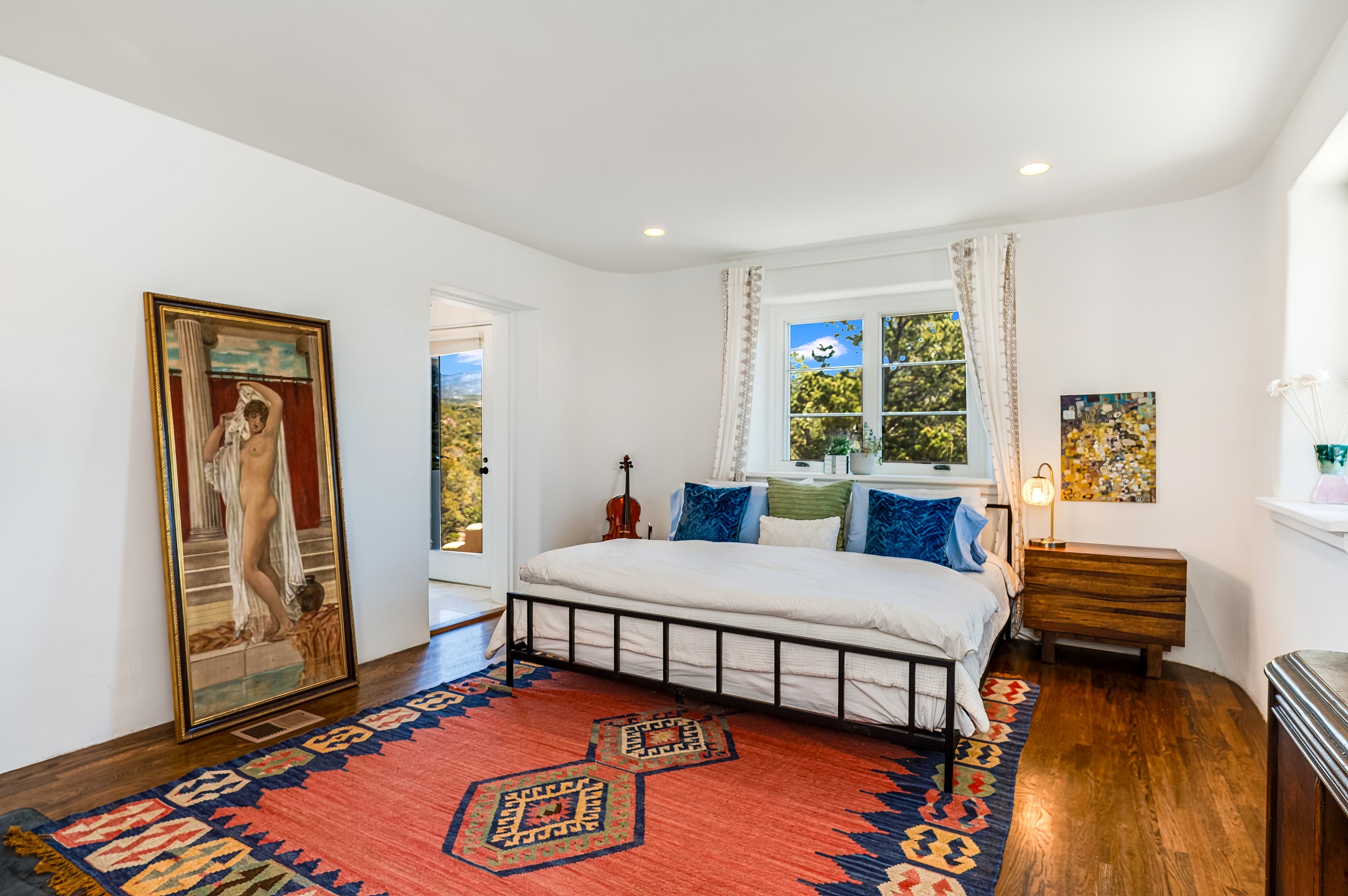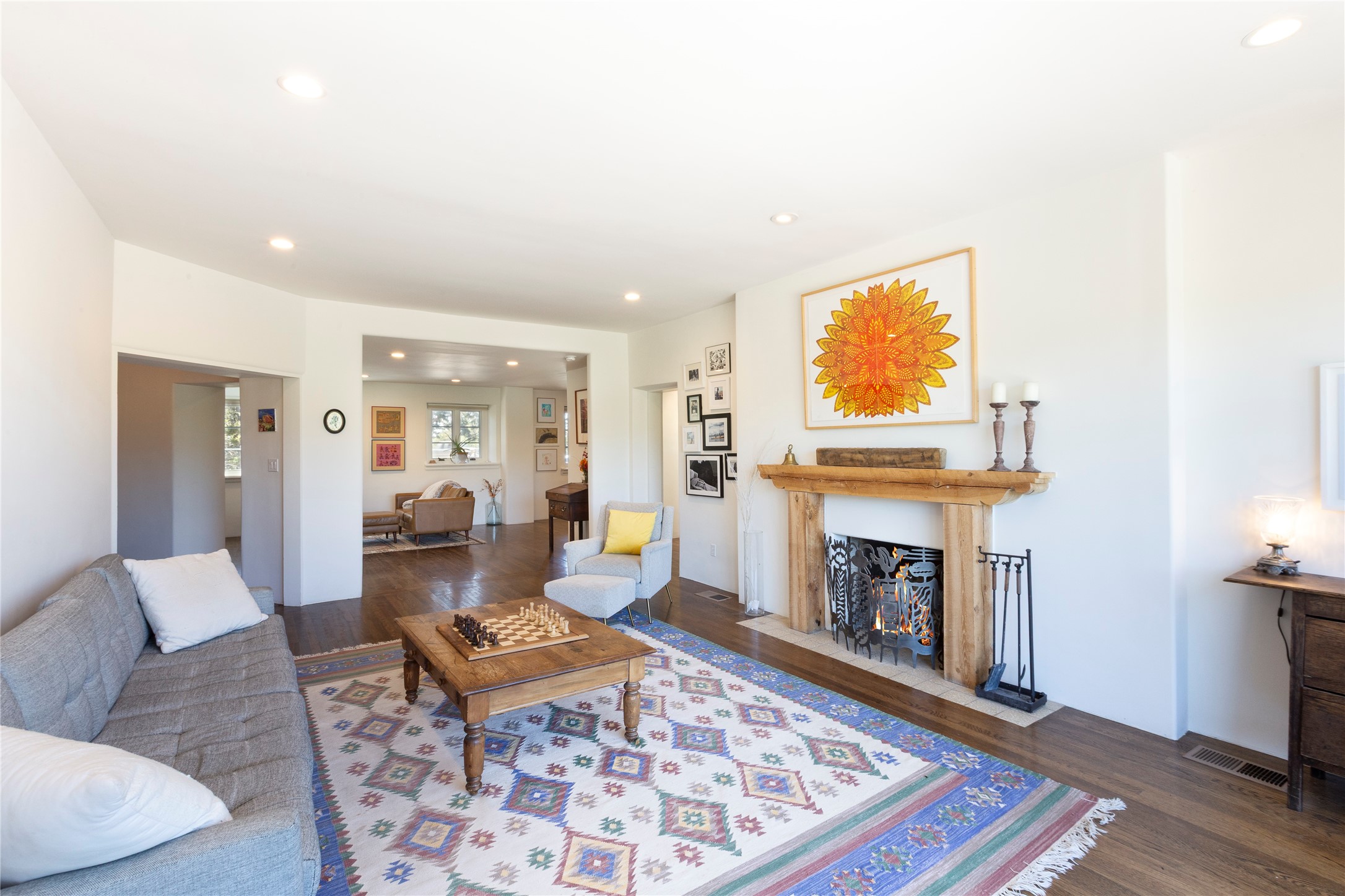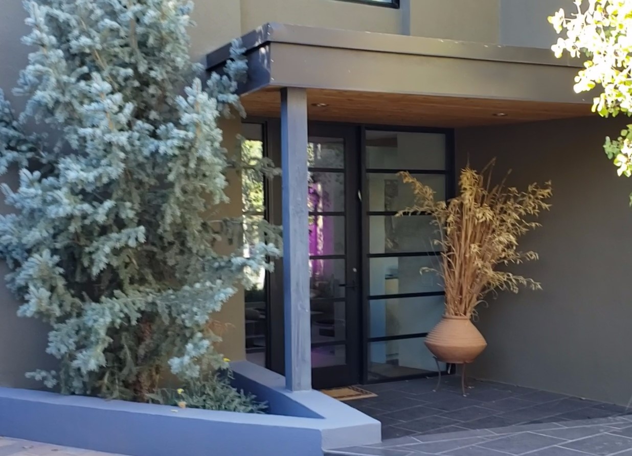 Minutes from the Historic Plaza, this home is tucked in off the street with a gracious circular drive and two coyote gates. Enter the foyer to the extraordinary Sangre de Cristo mountains views with solid oak flooring throughout. The gracious owner's bedroom has a full ensuite bath, a walk-in closet, views, and exterior access to outside spaces. The spacious guest suite has a full bath that can double as a powder room. Also, on the main floor, you will find an open floorplan including formal and informal living and dining, two fireplaces, and a well-appointed kitchen with leathered granite countertops and an attached laundry room. Downstairs, there is a flex space of 2 bedrooms, 2 full baths, each with closets and access to the outside flagstone patio living. This downstairs offers media room, office, and/or playroom possibilities. The grand outside patio has 2 large areas, each with spectacular views and custom fireplaces. The mountain view is your neighbor. Beautiful and light filled sited on 2.5 acres, including a detached 2-car garage with storage space and all this for a great price.