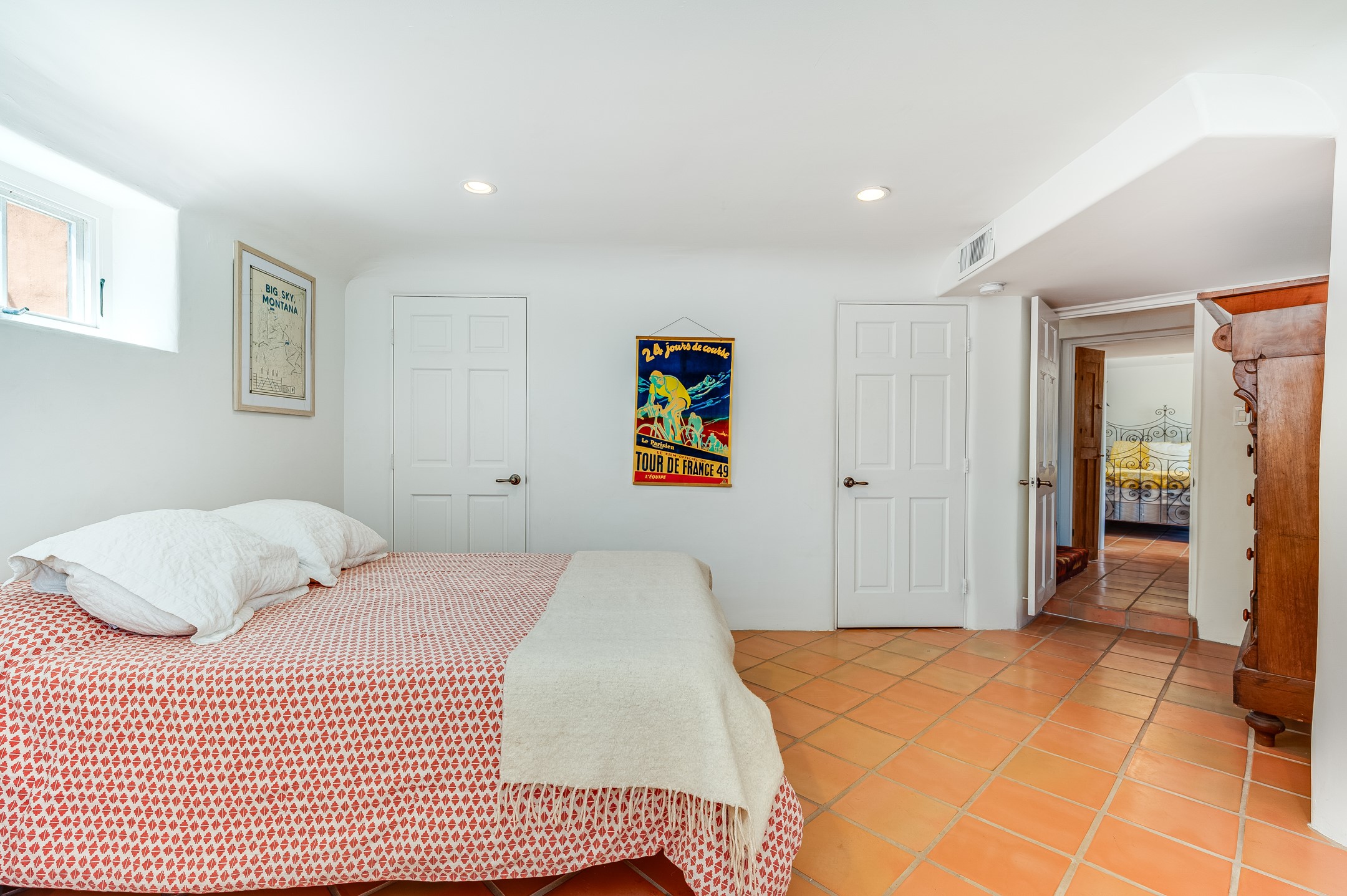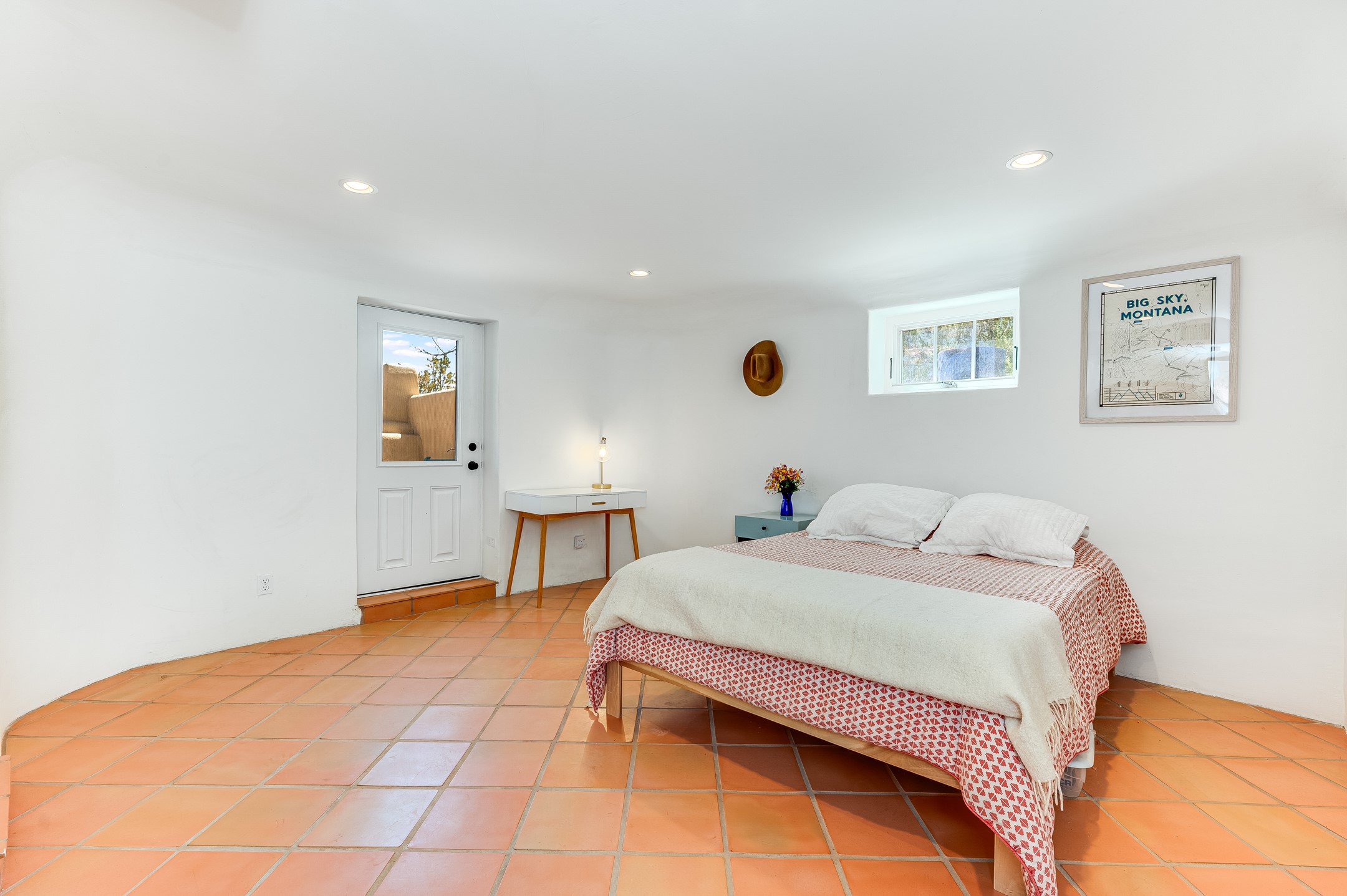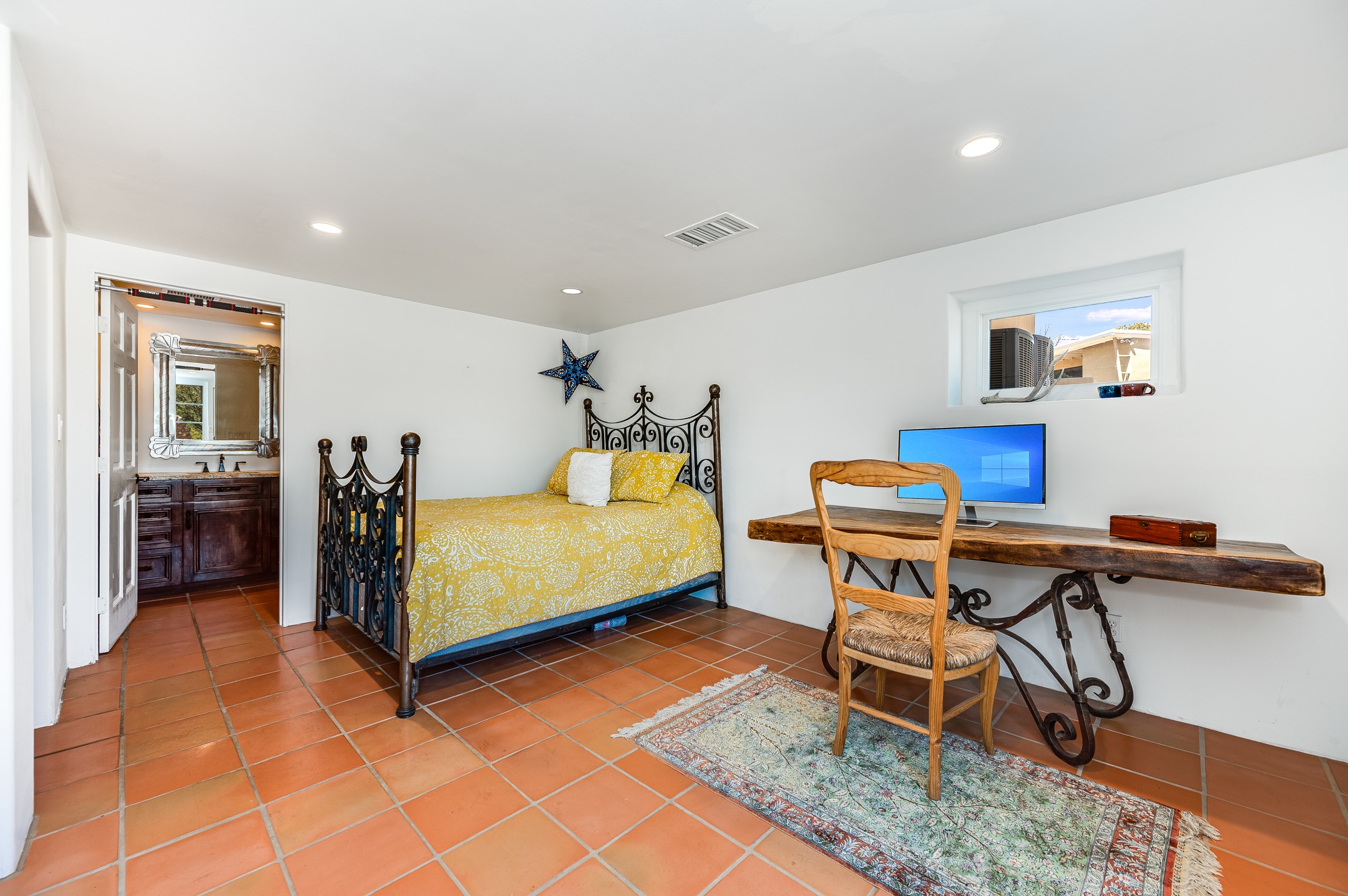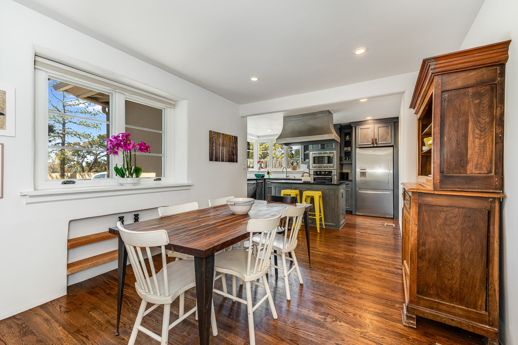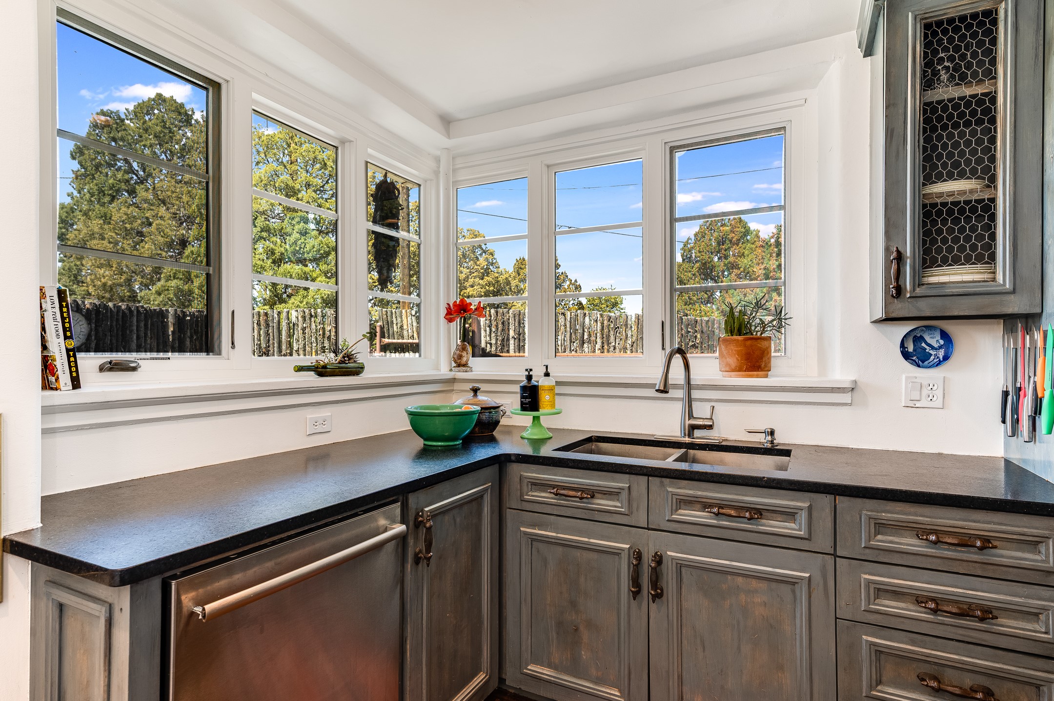 Minutes from the Historic Plaza, this home is tucked in off the street with a gracious circular drive and two coyote gates. Enter the foyer to the extraordinary Sangre de Cristo mountains views with solid oak flooring throughout. The gracious owner's bedroom has a full ensuite bath, a walk-in closet, views, and exterior access to outside spaces. The spacious guest suite has a full bath that can double as a powder room. Also, on the main floor, you will find an open floorplan including formal and informal living and dining, two fireplaces, and a well-appointed kitchen with leathered granite countertops and an attached laundry room. Downstairs, there is a flex space of 2 bedrooms, 2 full baths, each with closets and access to the outside flagstone patio living. This downstairs offers media room, office, and/or playroom possibilities. The grand outside patio has 2 large areas, each with spectacular views and custom fireplaces. The mountain view is your neighbor. Beautiful and light filled sited on 2.5 acres, including a detached 2-car garage with storage space and all this for a great price.