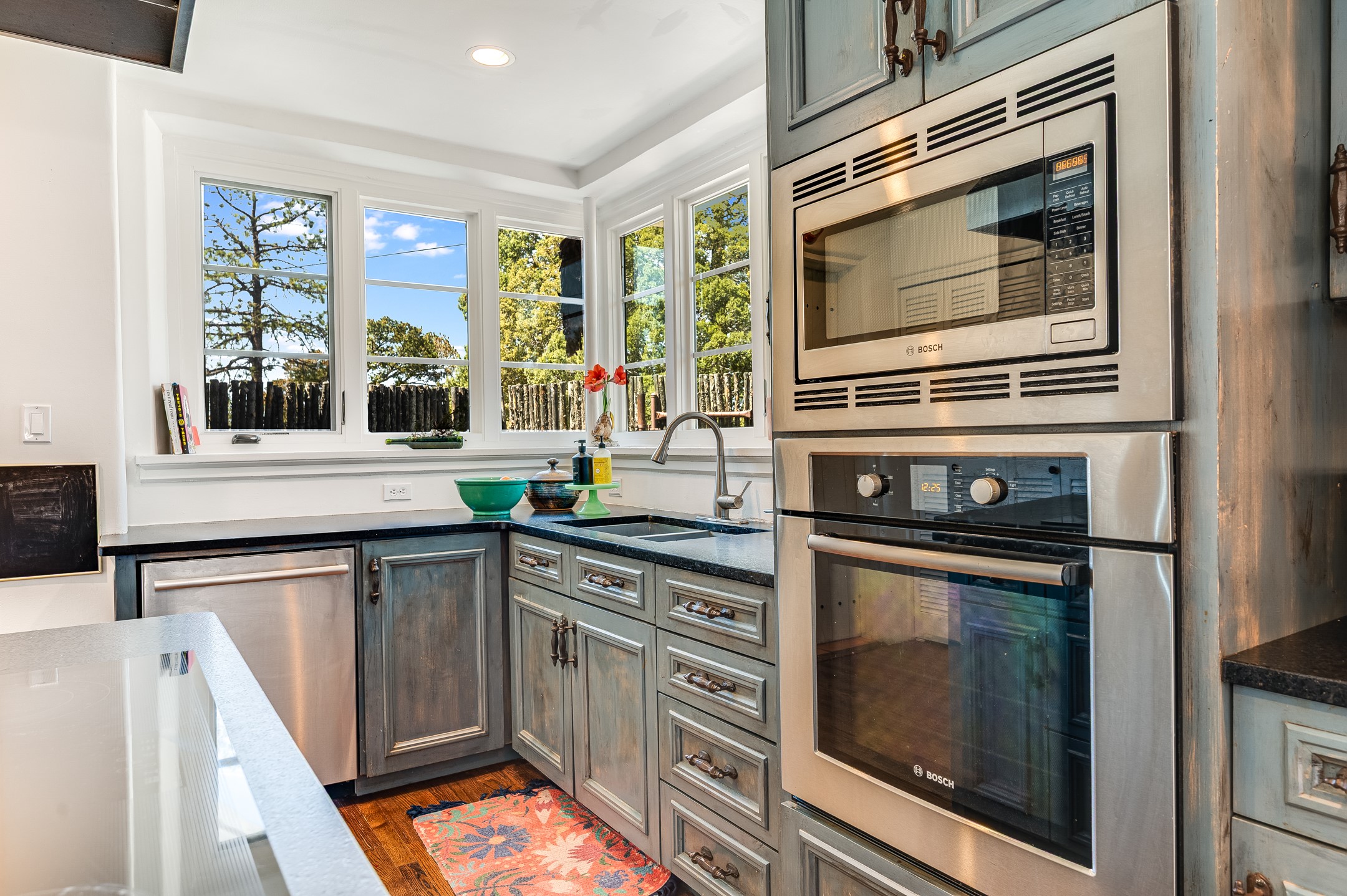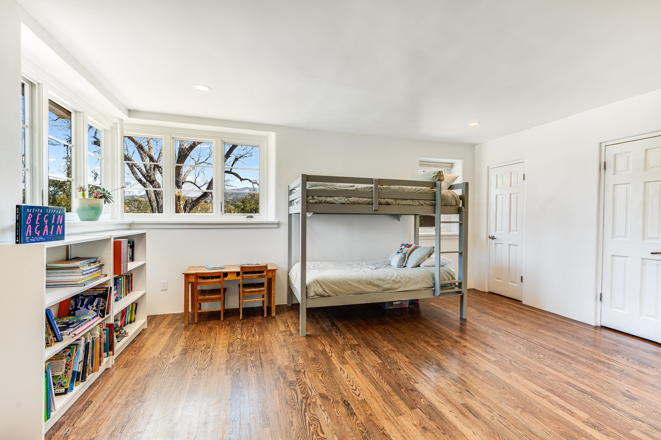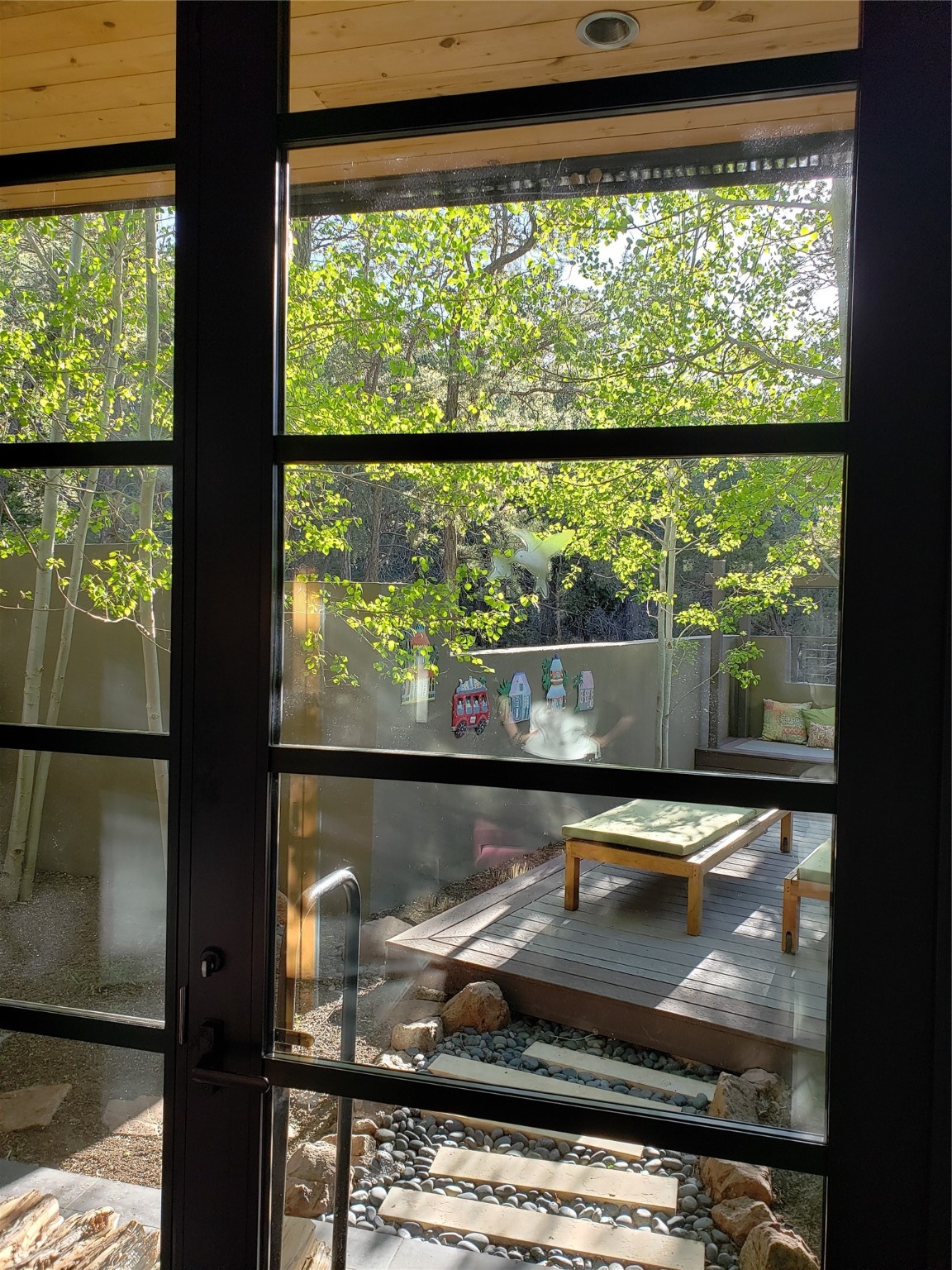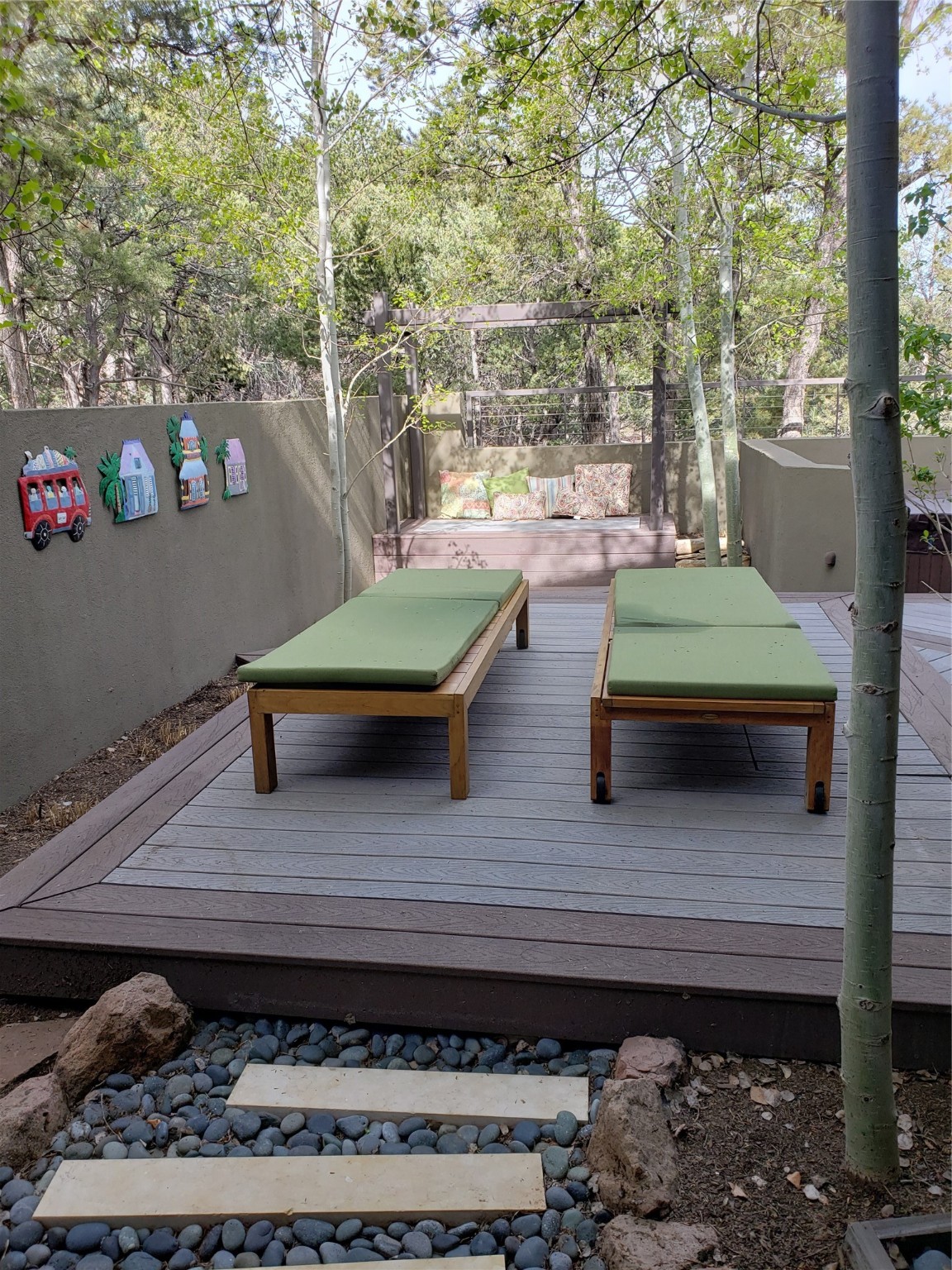 Minutes from the Historic Plaza, this home is tucked in off the street with a gracious circular drive and two coyote gates. Enter the foyer to the extraordinary Sangre de Cristo mountains views with solid oak flooring throughout. The gracious owner's bedroom has a full ensuite bath, a walk-in closet, views, and exterior access to outside spaces. The spacious guest suite has a full bath that can double as a powder room. Also, on the main floor, you will find an open floorplan including formal and informal living and dining, two fireplaces, and a well-appointed kitchen with leathered granite countertops and an attached laundry room. Downstairs, there is a flex space of 2 bedrooms, 2 full baths, each with closets and access to the outside flagstone patio living. This downstairs offers media room, office, and/or playroom possibilities. The grand outside patio has 2 large areas, each with spectacular views and custom fireplaces. The mountain view is your neighbor. Beautiful and light filled sited on 2.5 acres, including a detached 2-car garage with storage space and all this for a great price.