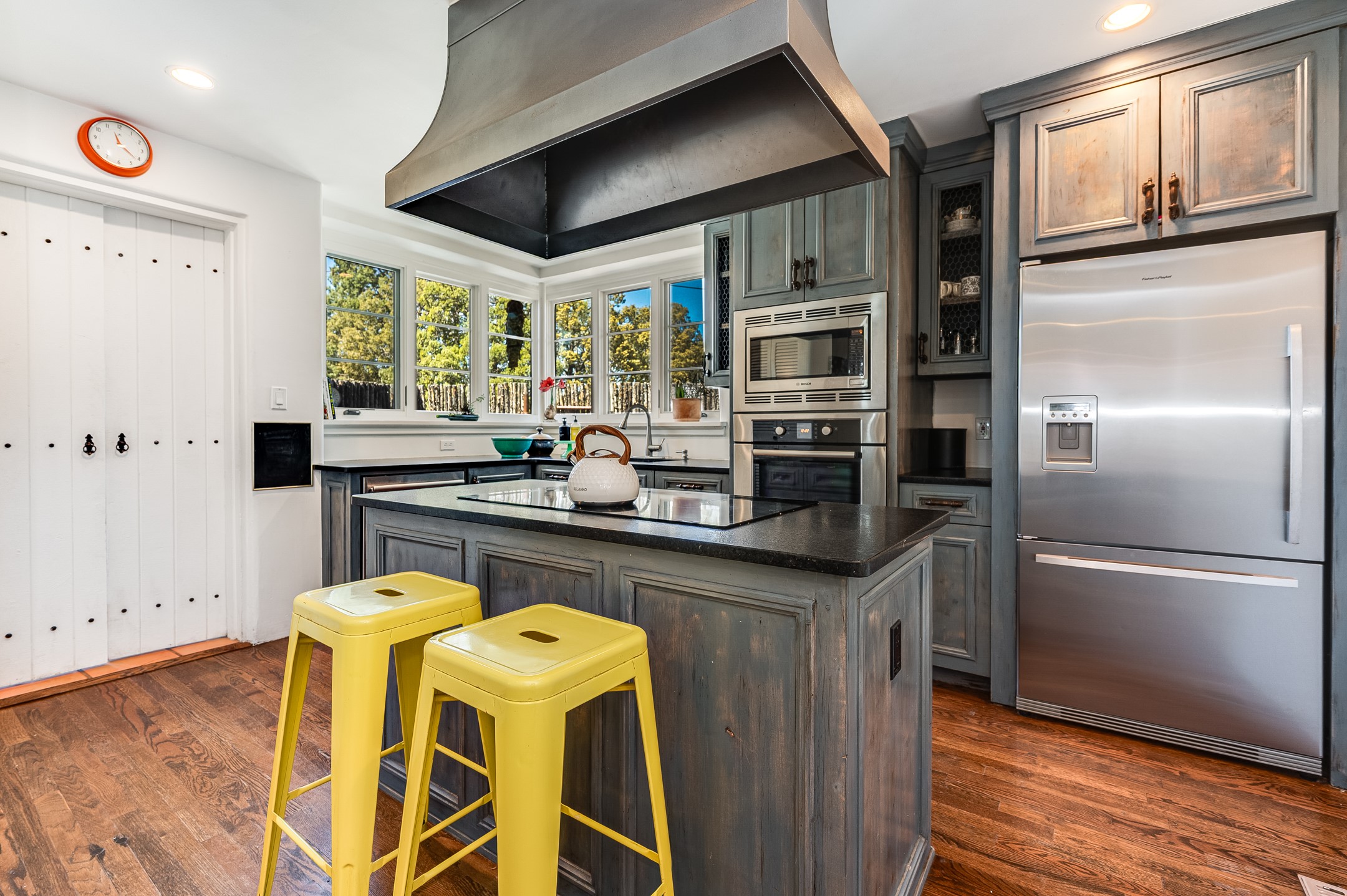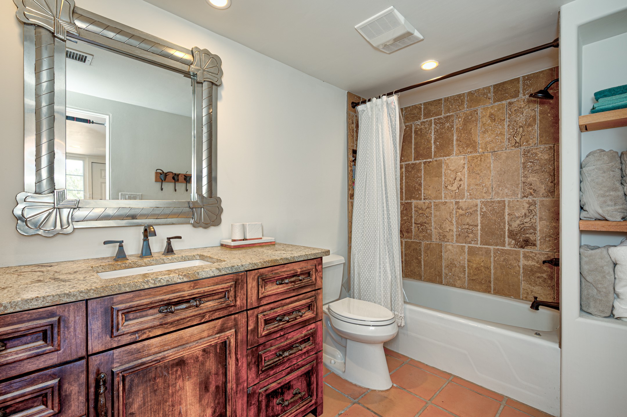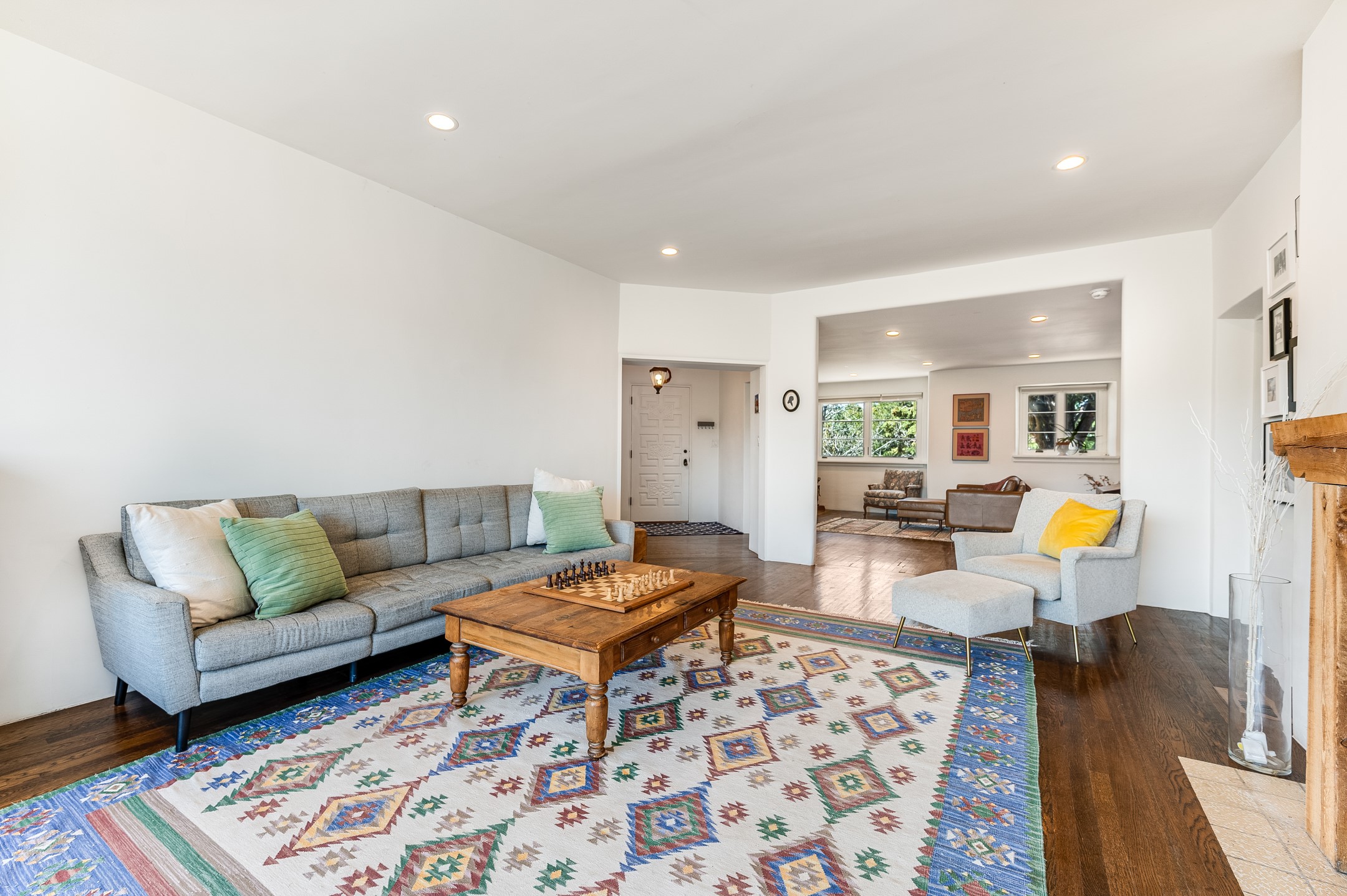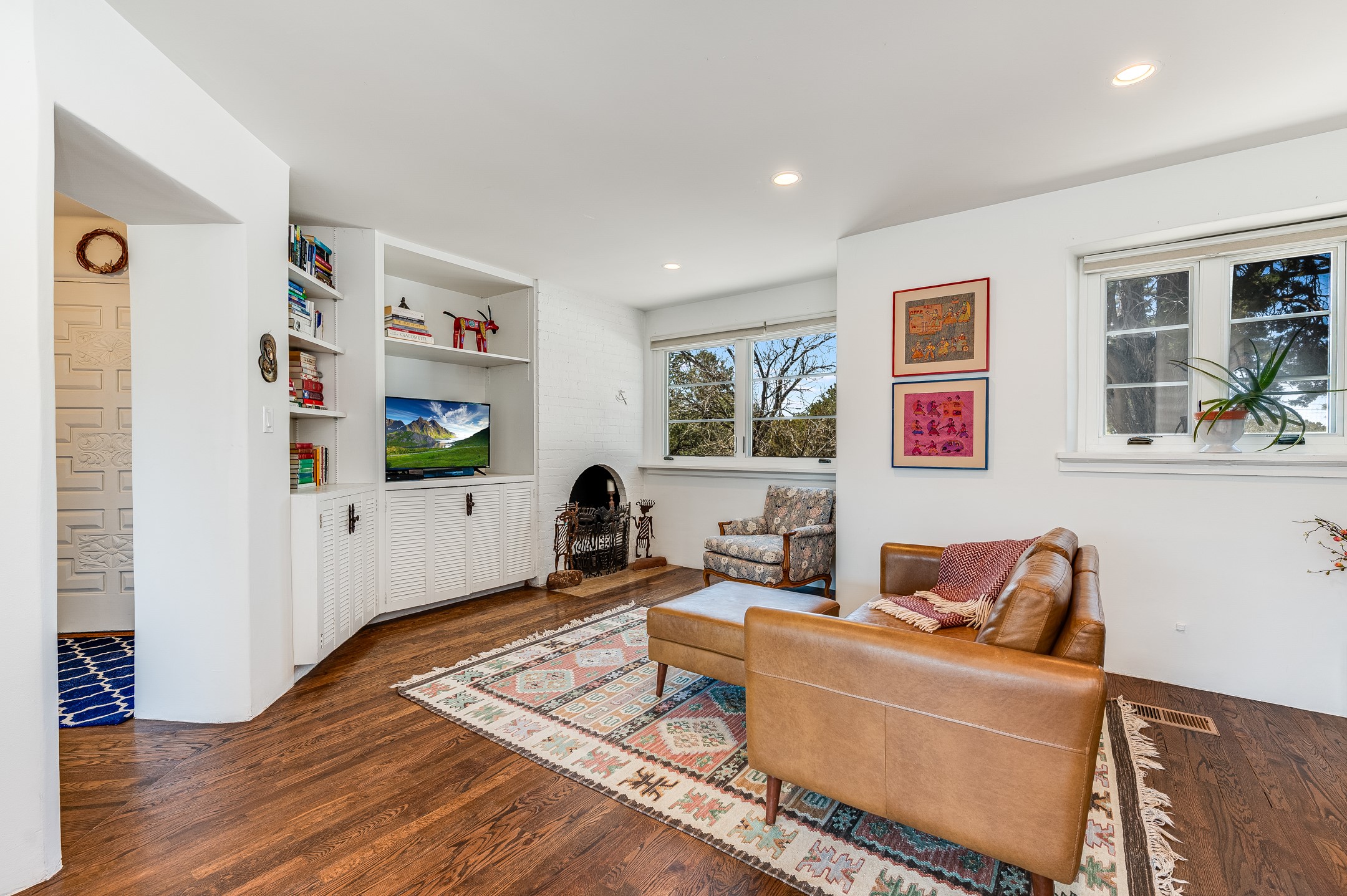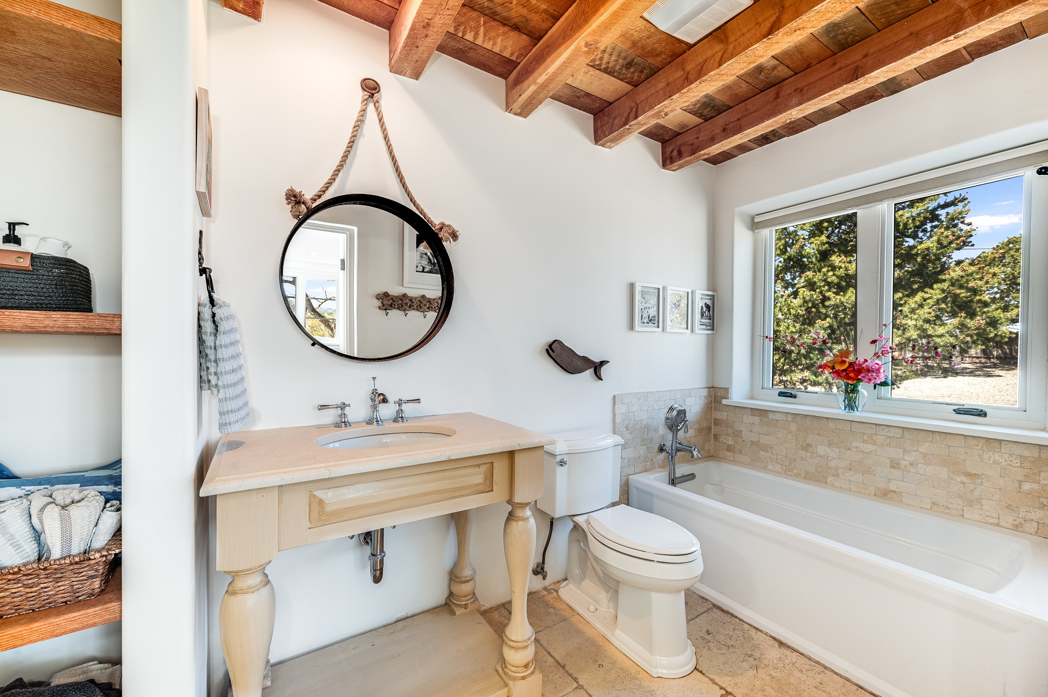 Minutes from the Historic Plaza, this home is tucked in off the street with a gracious circular drive and two coyote gates. Enter the foyer to the extraordinary Sangre de Cristo mountains views with solid oak flooring throughout. The gracious owner's bedroom has a full ensuite bath, a walk-in closet, views, and exterior access to outside spaces. The spacious guest suite has a full bath that can double as a powder room. Also, on the main floor, you will find an open floorplan including formal and informal living and dining, two fireplaces, and a well-appointed kitchen with leathered granite countertops and an attached laundry room. Downstairs, there is a flex space of 2 bedrooms, 2 full baths, each with closets and access to the outside flagstone patio living. This downstairs offers media room, office, and/or playroom possibilities. The grand outside patio has 2 large areas, each with spectacular views and custom fireplaces. The mountain view is your neighbor. Beautiful and light filled sited on 2.5 acres, including a detached 2-car garage with storage space and all this for a great price.