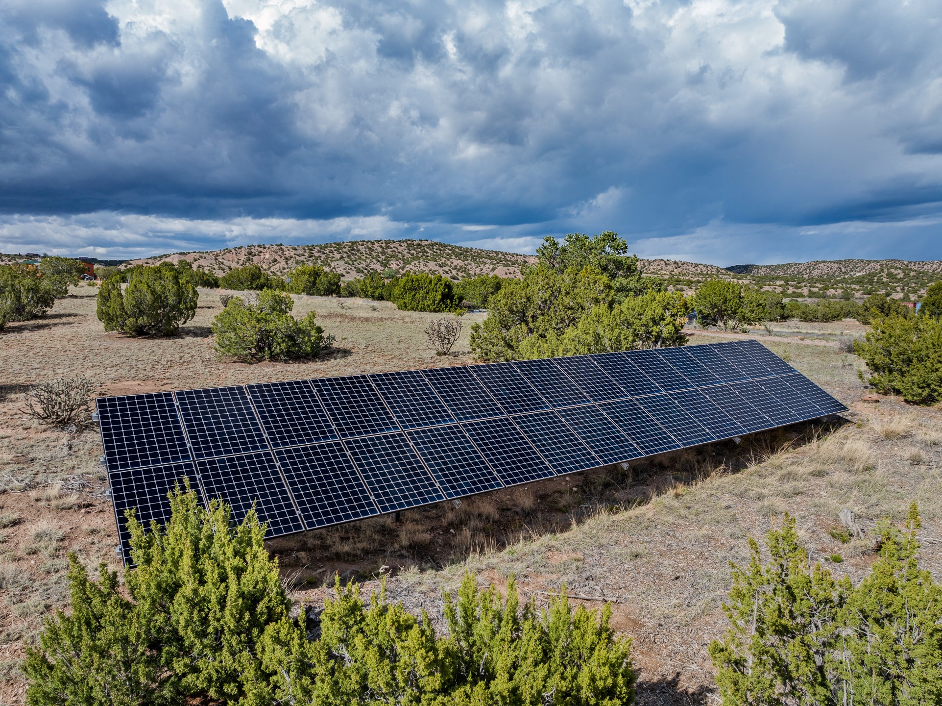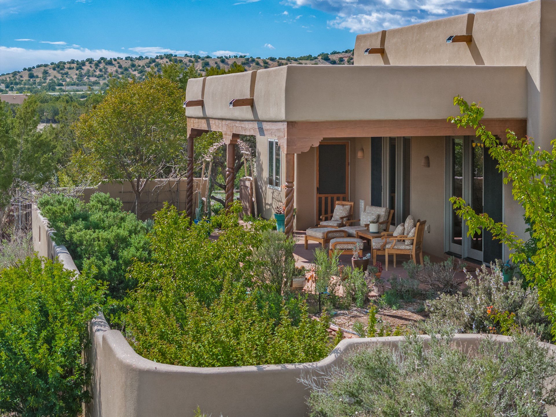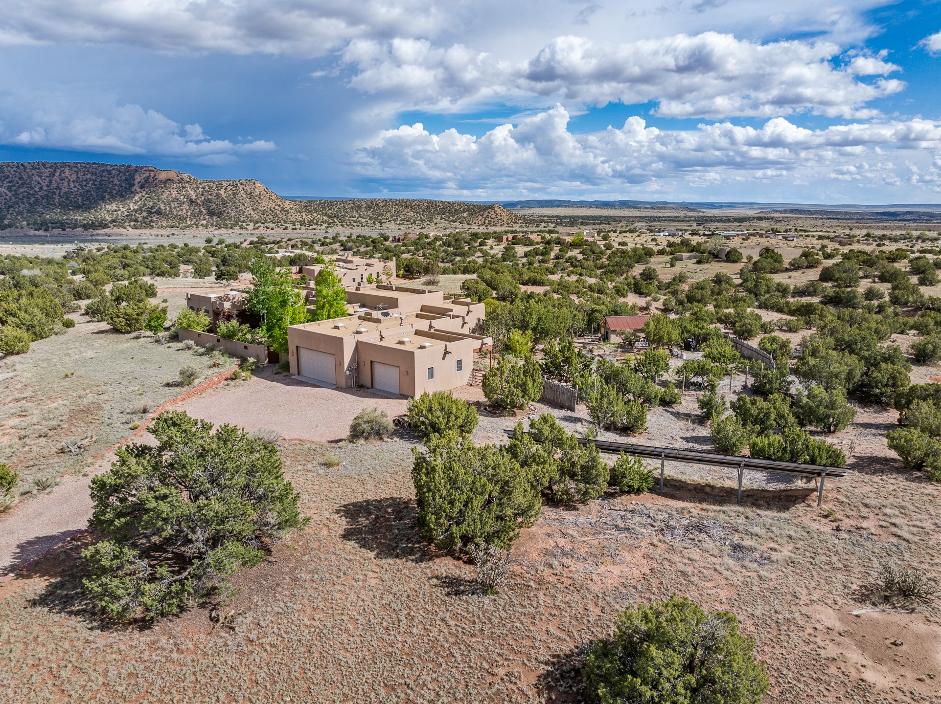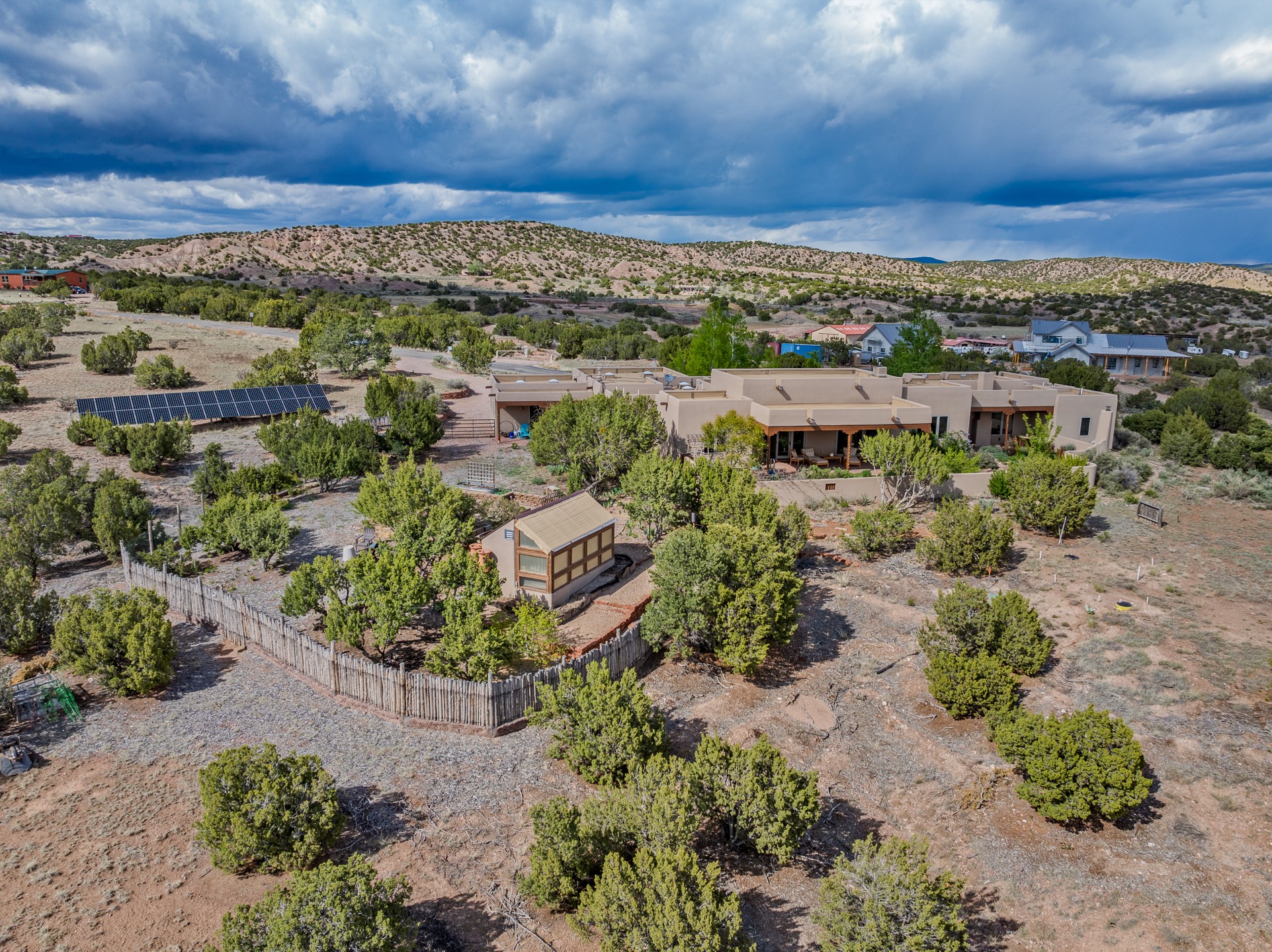 Nestled atop a quiet 3.79-acre ridge in the exclusive Spirit Wind Ranch, 45 Cerro Alto is more than a home--it's a way of life. With 3,600 square feet of beautifully crafted Santa Fe-style architecture and sweeping views of the Galisteo Basin, this private haven blends sustainability, self-sufficiency, and serene luxury in perfect harmony. From the moment you enter the aspen-lined courtyard, you're greeted by nature's quiet abundance. Mature, fruit-bearing trees--apple, jujube, and peach--offer seasonal bounty, while young apricot, pear, and plum trees promise years of harvests. For the passionate gardener, an adobe-walled greenhouse sits beside raised beds with drip irrigation, all nurtured organically for nearly a decade. A 3,000-gallon underground rainwater collection system supports irrigation, ensuring both sustainability and simplicity. This is a retreat designed for mindful living. A 10 kW ground-mounted solar array (installed in 2017) powers the home, eliminating electric bills. A Regency Hearth Heater wood stove offers cozy, efficient warmth, reducing reliance on the propane-powered radiant floor system. Enjoy filtered instant hot water throughout, thanks to a whole-house circulation and RO system. Inside, Santa Fe's timeless character shines through hand-hewn vigas, tile and hardwood floors, and three fireplaces that warm both heart and home. The main residence features three bedrooms, a sun-filled library, and a generous primary suite with its own fireplace. A detached casita offers flexibility for guests, a studio, or a private retreat. Deep portals invite you outdoors--to relax in the shade, dine al fresco, or simply lose yourself in the golden light dancing across the landscape. Every corner of this property invites reflection, creation, and connection to the land. A spacious three-car garage with an attached workshop completes this remarkable offering--ready for your tools, hobbies, or dreams, with paved access, total privacy, and unmatched natural beauty.